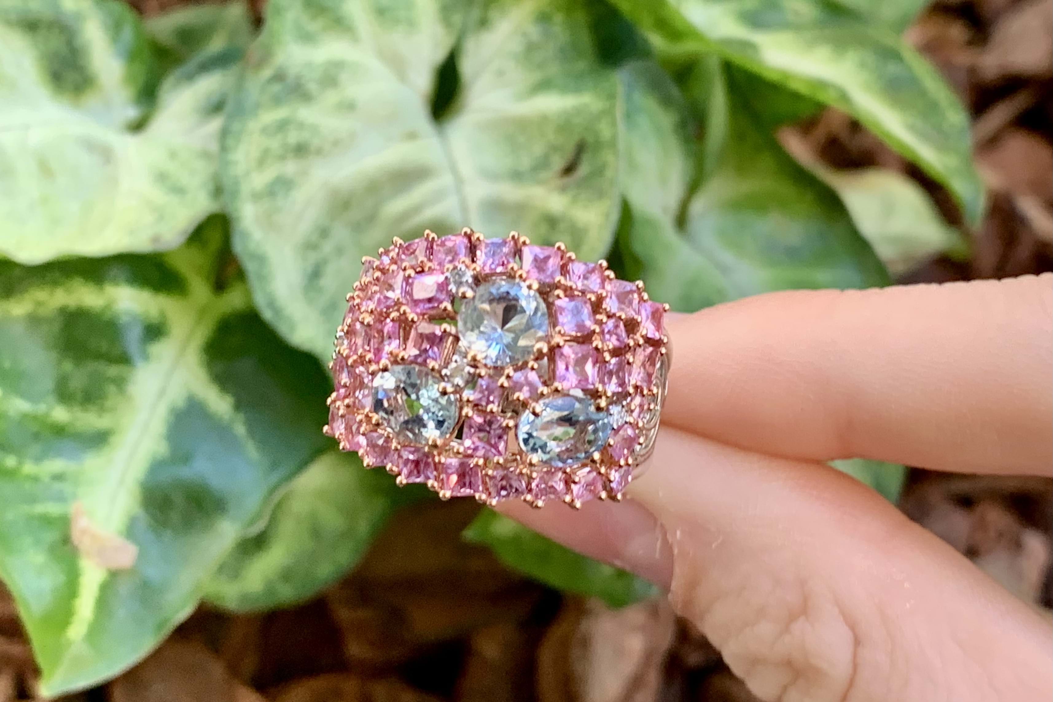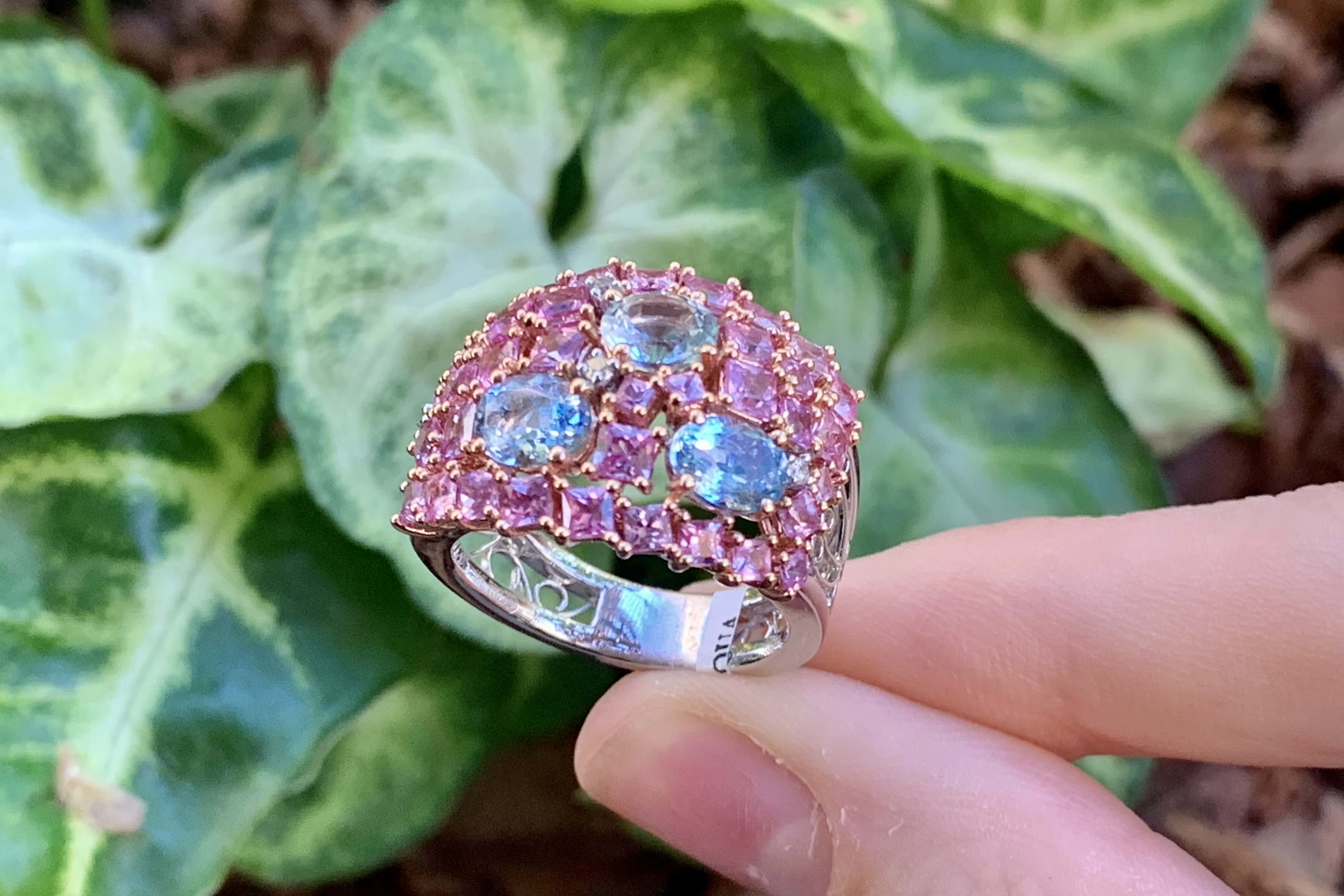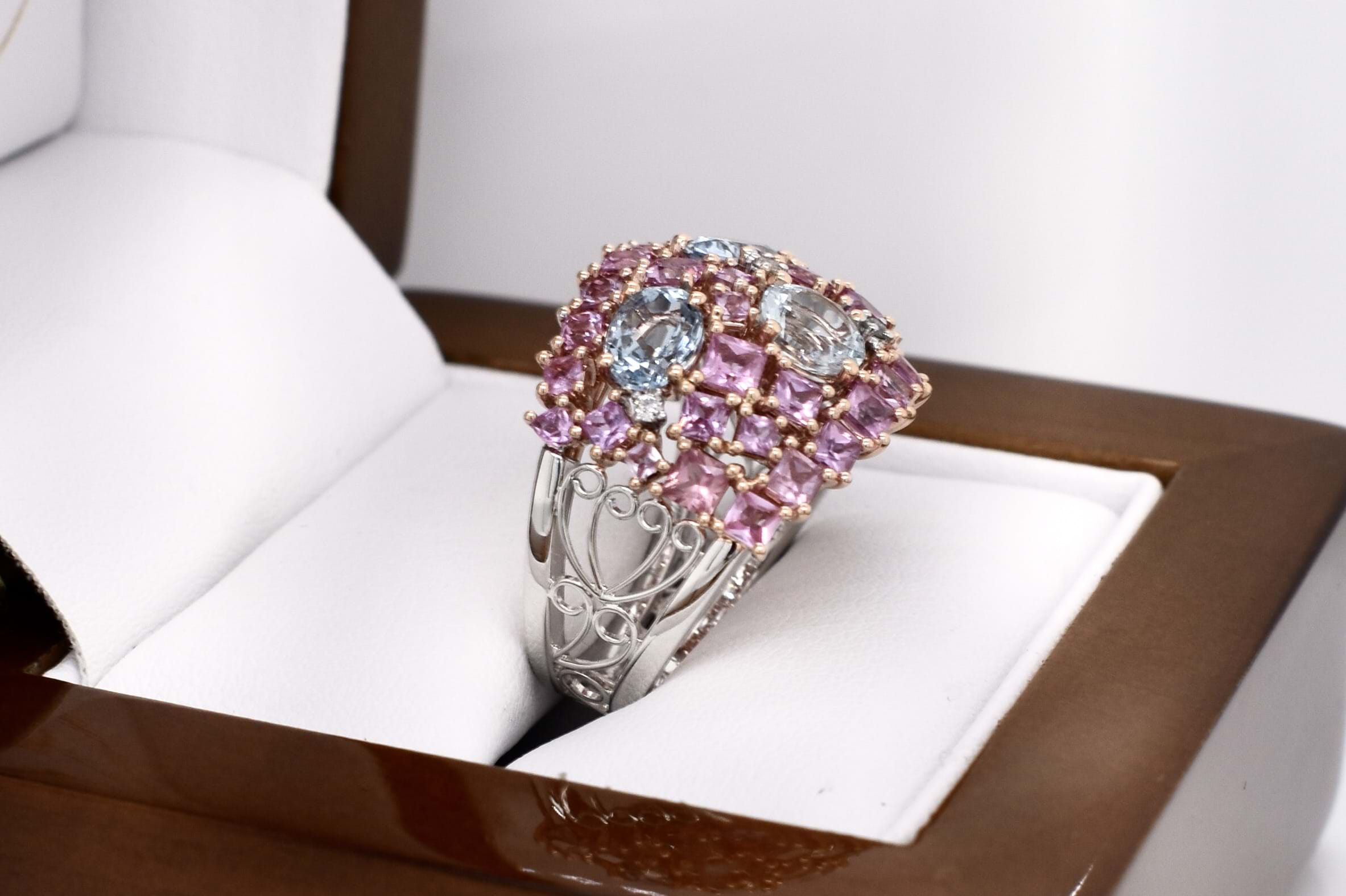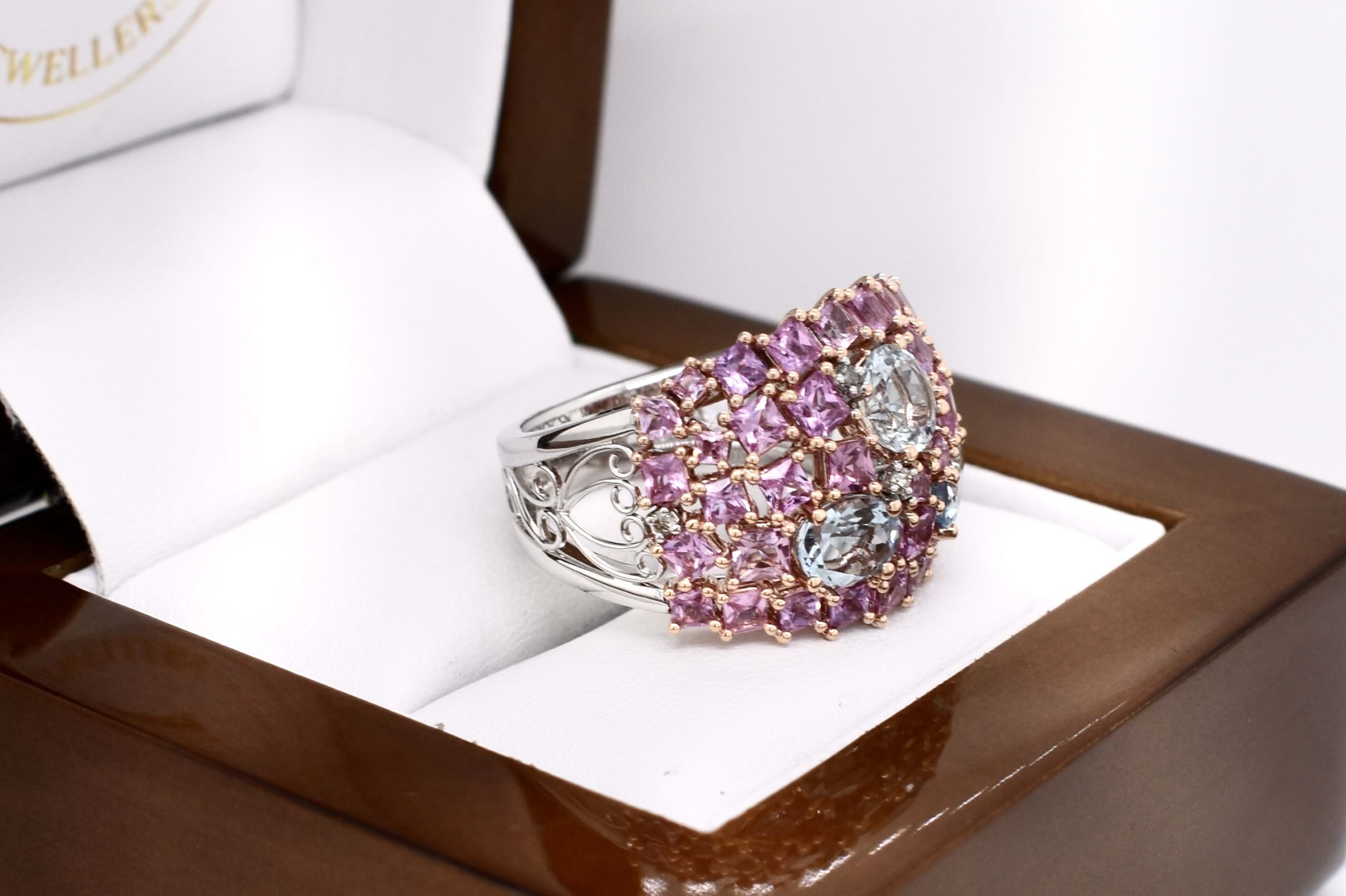 An extravagant multi-stone domed cluster ring, set in 18ct white and rose gold, featuring 3 aquamarine (2 round & 1 oval) equalling 1.57ct, surrounded by 37 mid pink sapphires, in princess cut and modified ear shape cuts. The sapphires totalling 2.92ct. For extra sparkle, 4 round brilliant cut diamonds are scattered throughout, totalling 0.04ct FG VS-SI. All stones are claw set. The top dome of this ring measures 17.1mm wide, with a half round band that tapers down to 5mm, featuring scroll motifs in an open back/band. Finger size M. Independent Valuation Supplied.