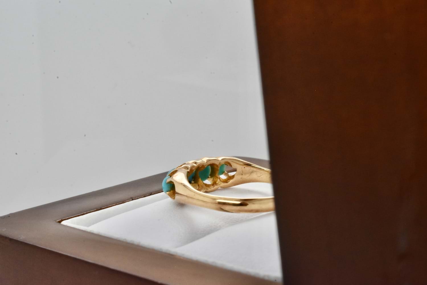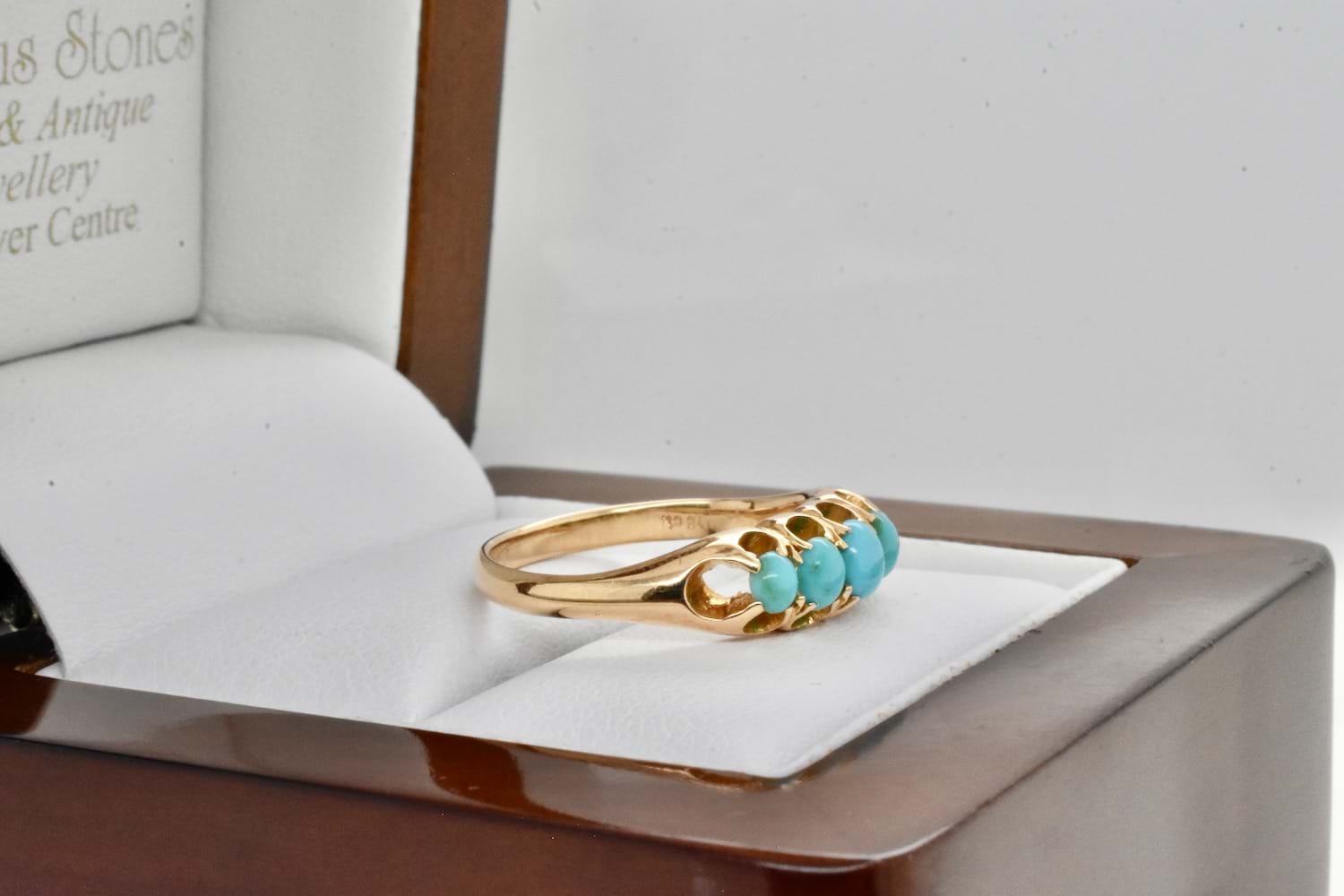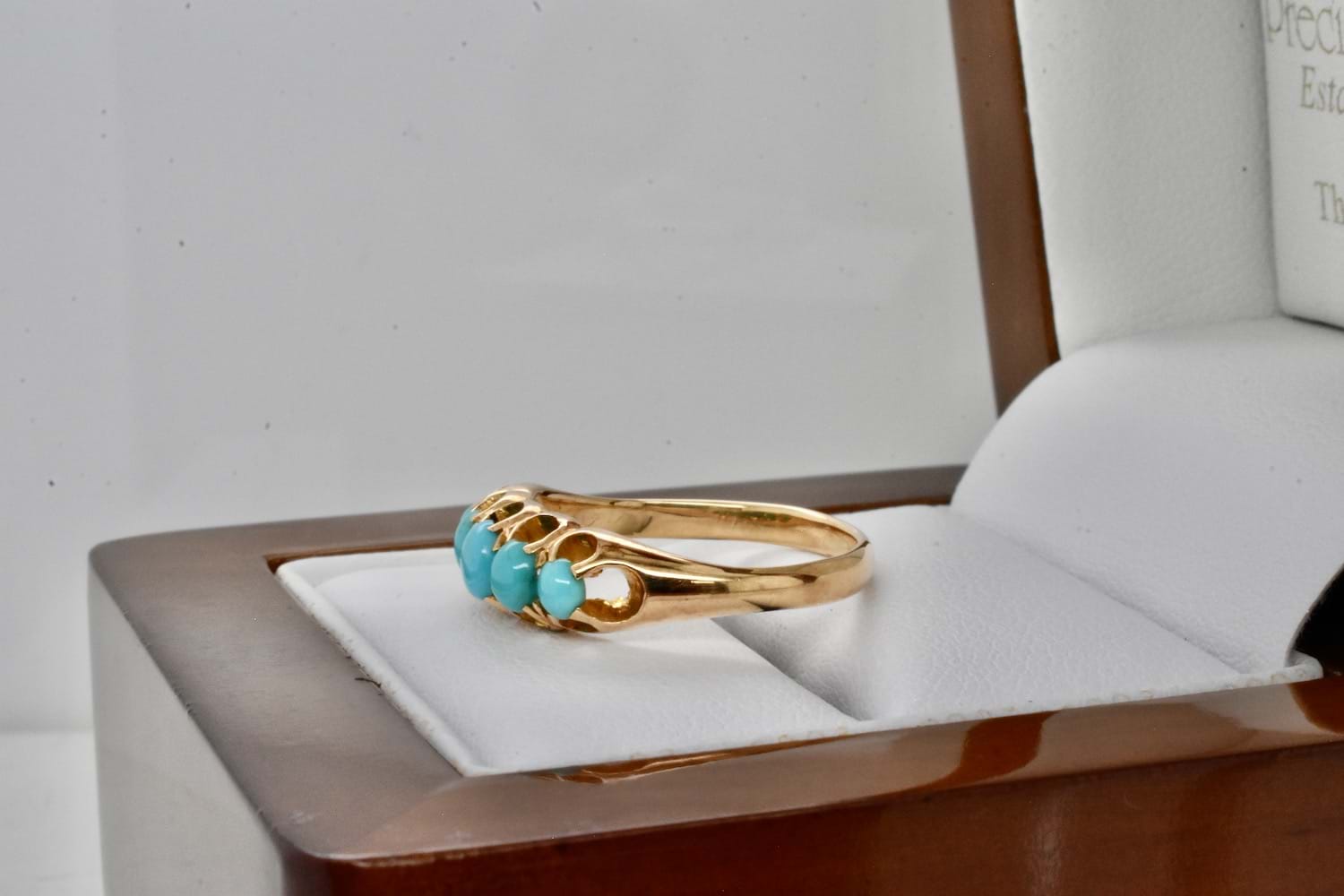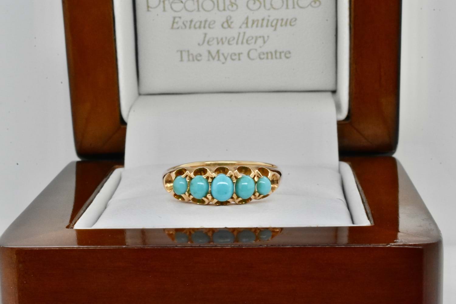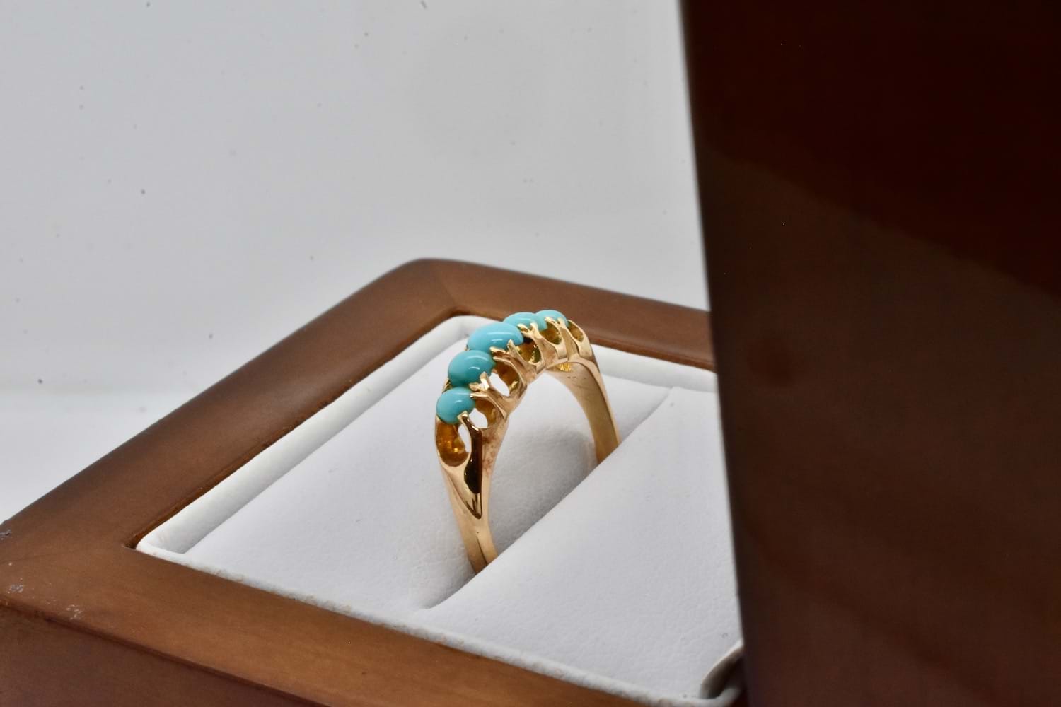 Beautiful and vibrant antique bridge ring crafted in 18ct yellow gold and set with five round, bright cabochon turquoise in dainty raised claw settings on a gently tapered fine band. Circa 1900. Finger size L+