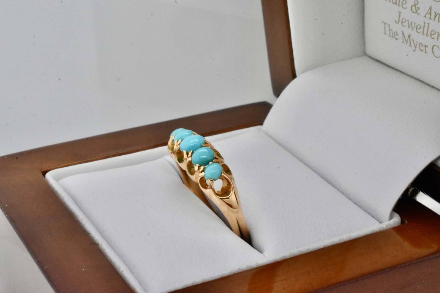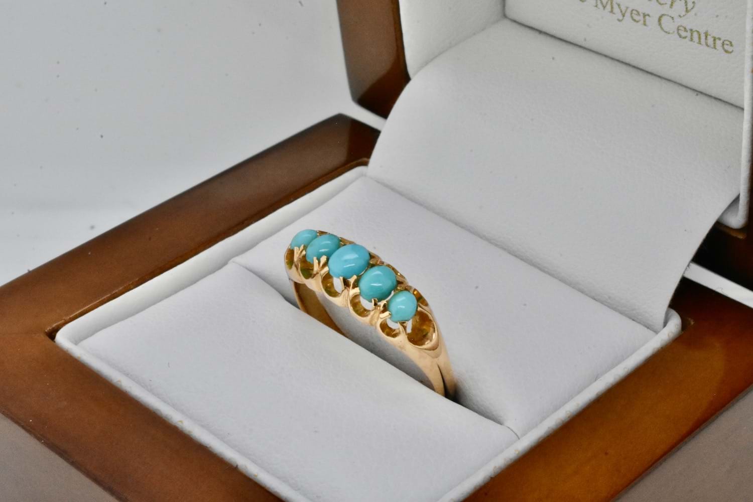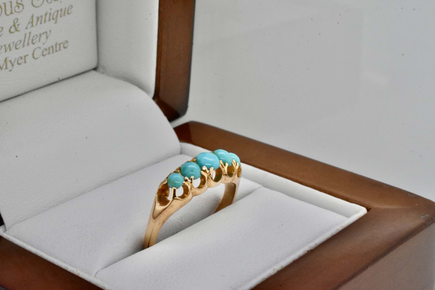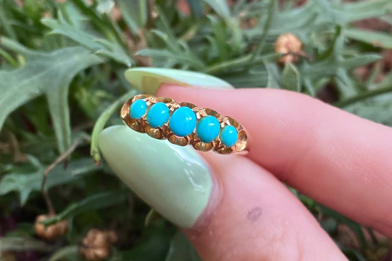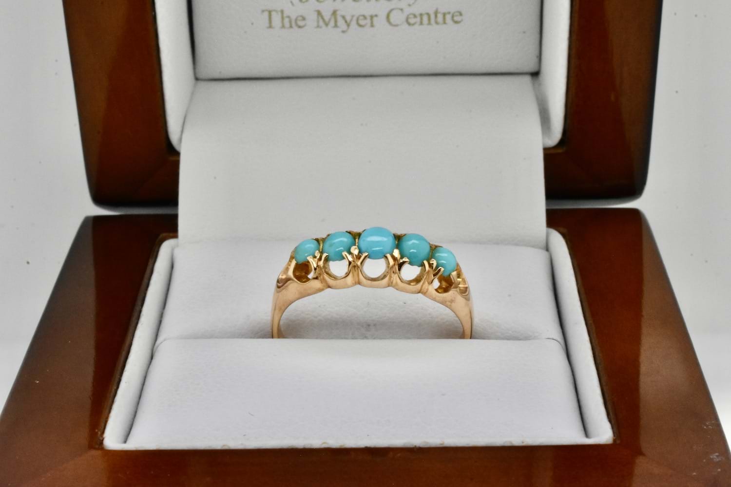 Beautiful and vibrant antique bridge ring crafted in 18ct yellow gold and set with five round, bright cabochon turquoise in dainty raised claw settings on a gently tapered fine band. Circa 1900. Finger size L+