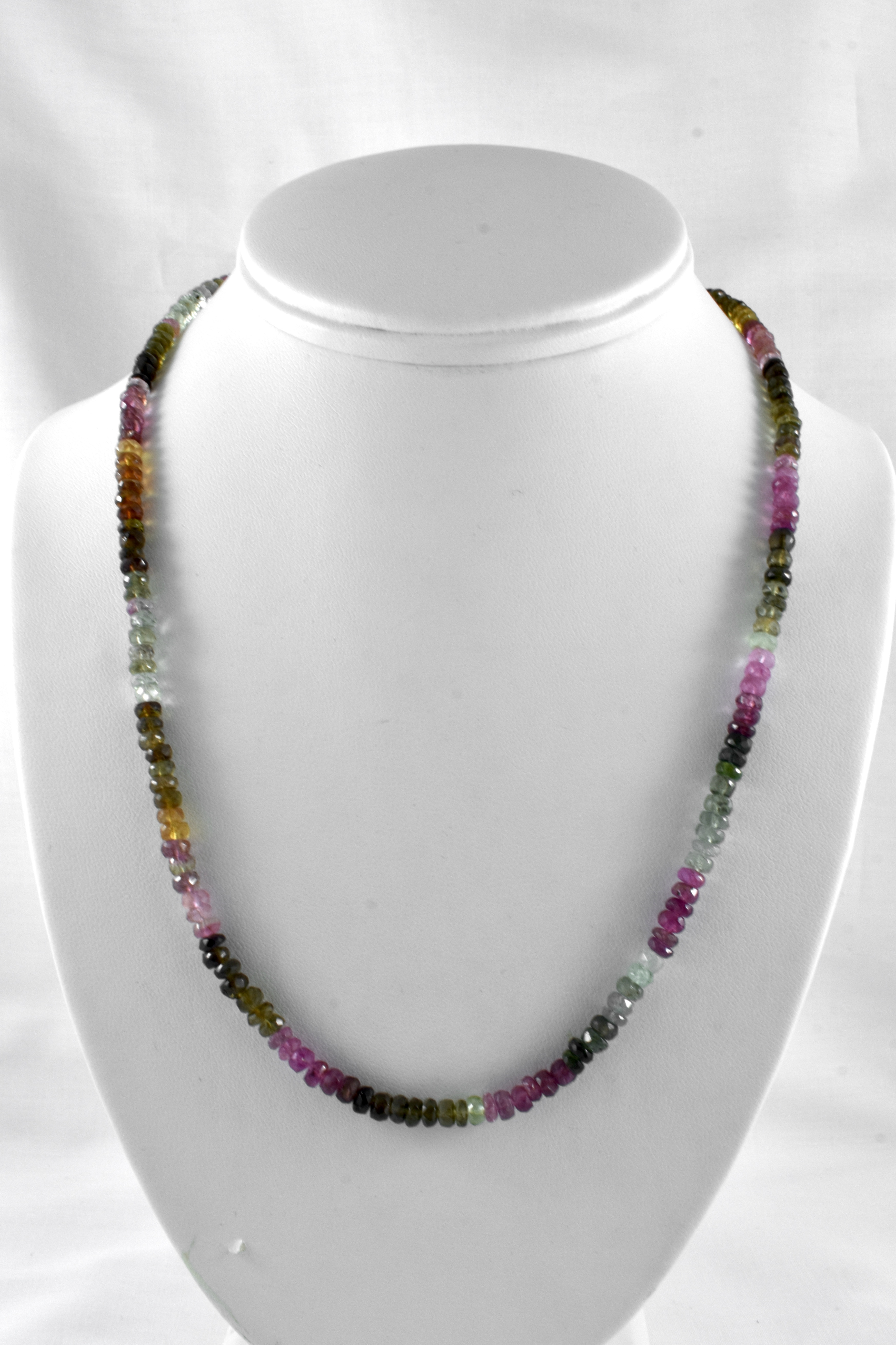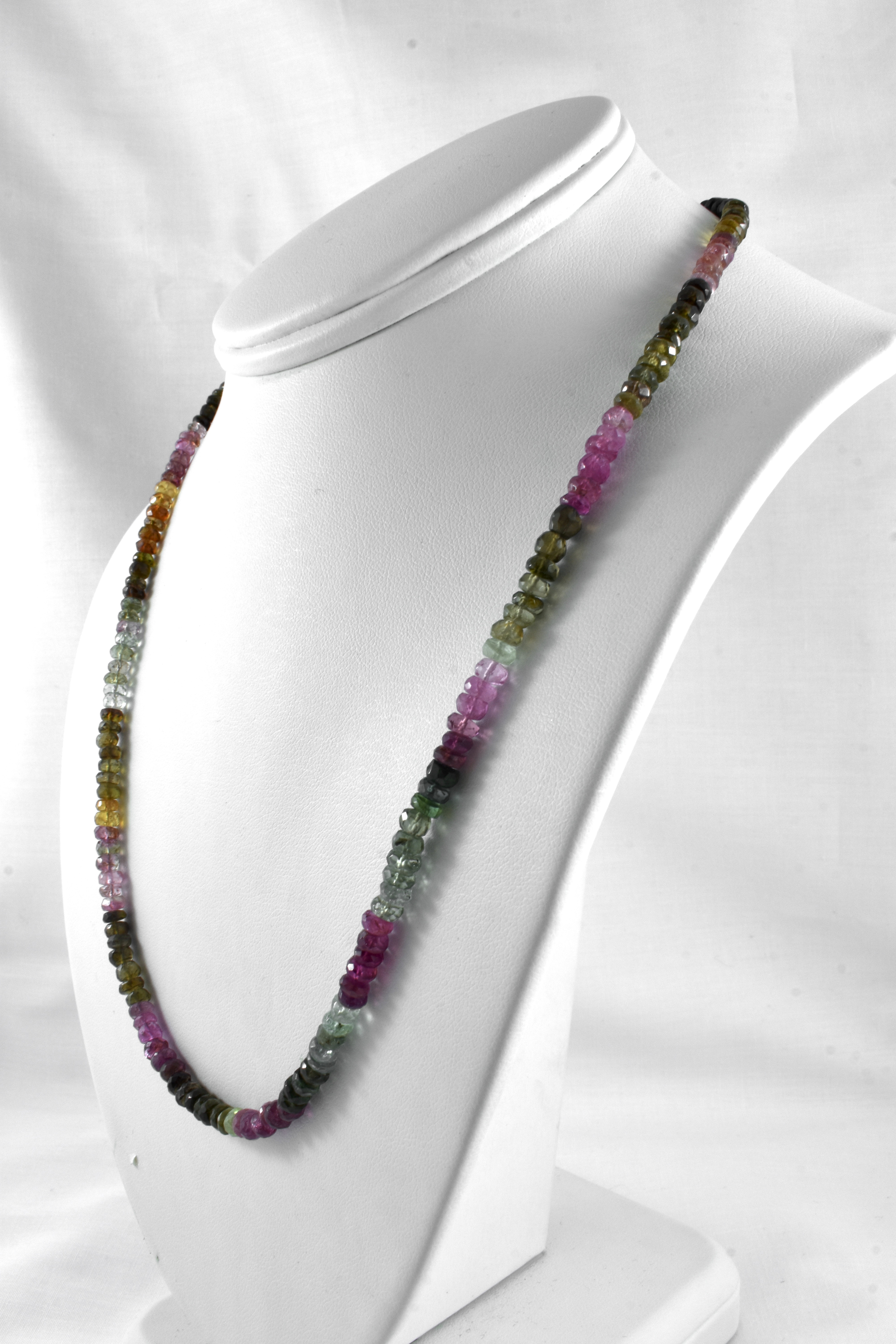 A gorgeous multicoloured strand of faceted Afghan tourmalines measuring 4.3-4.5mm in rainbow tones of yellow, green, blue, pink and dark brown, white, grey and black. Strand is 48cm long with a sterling silver ball clasp