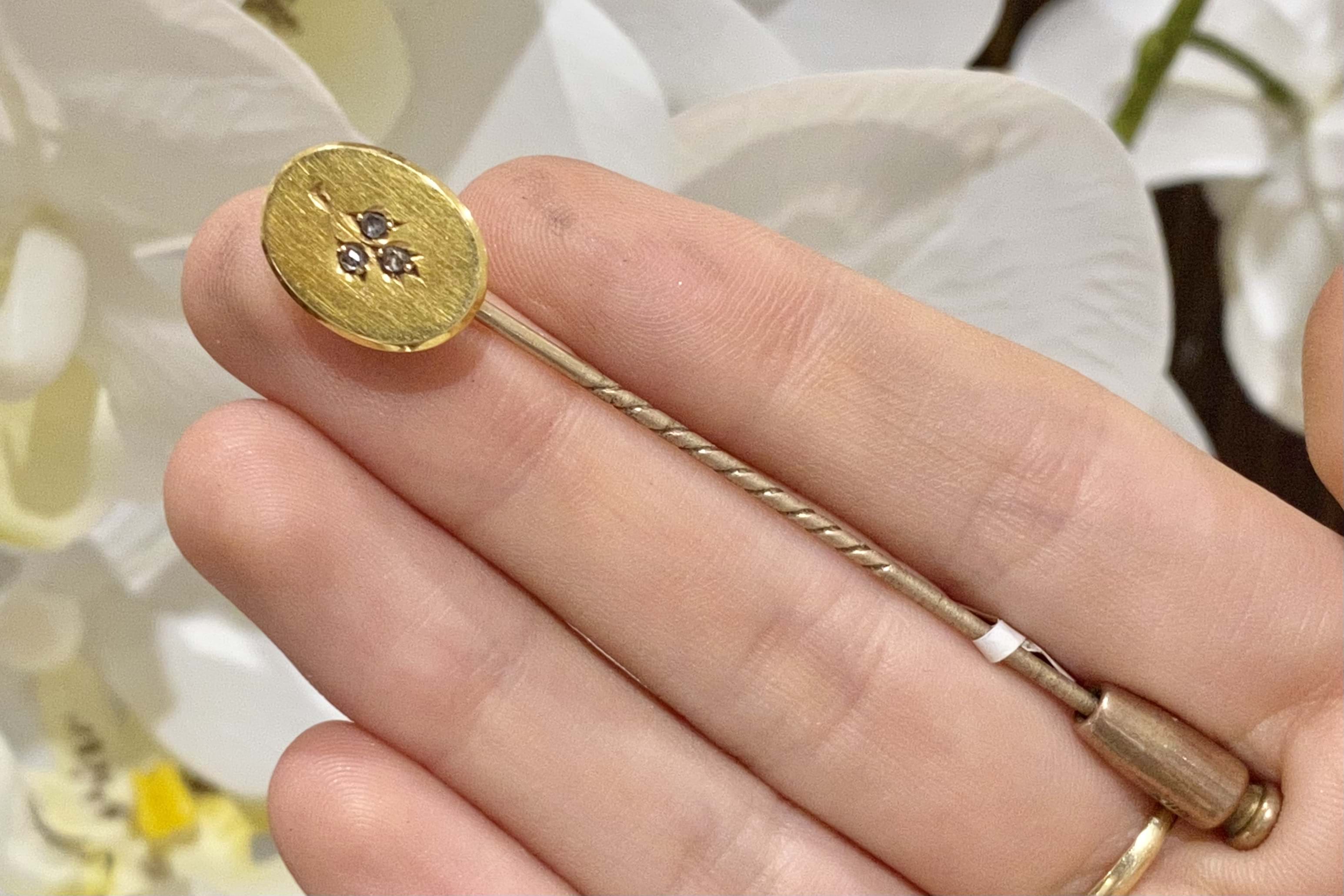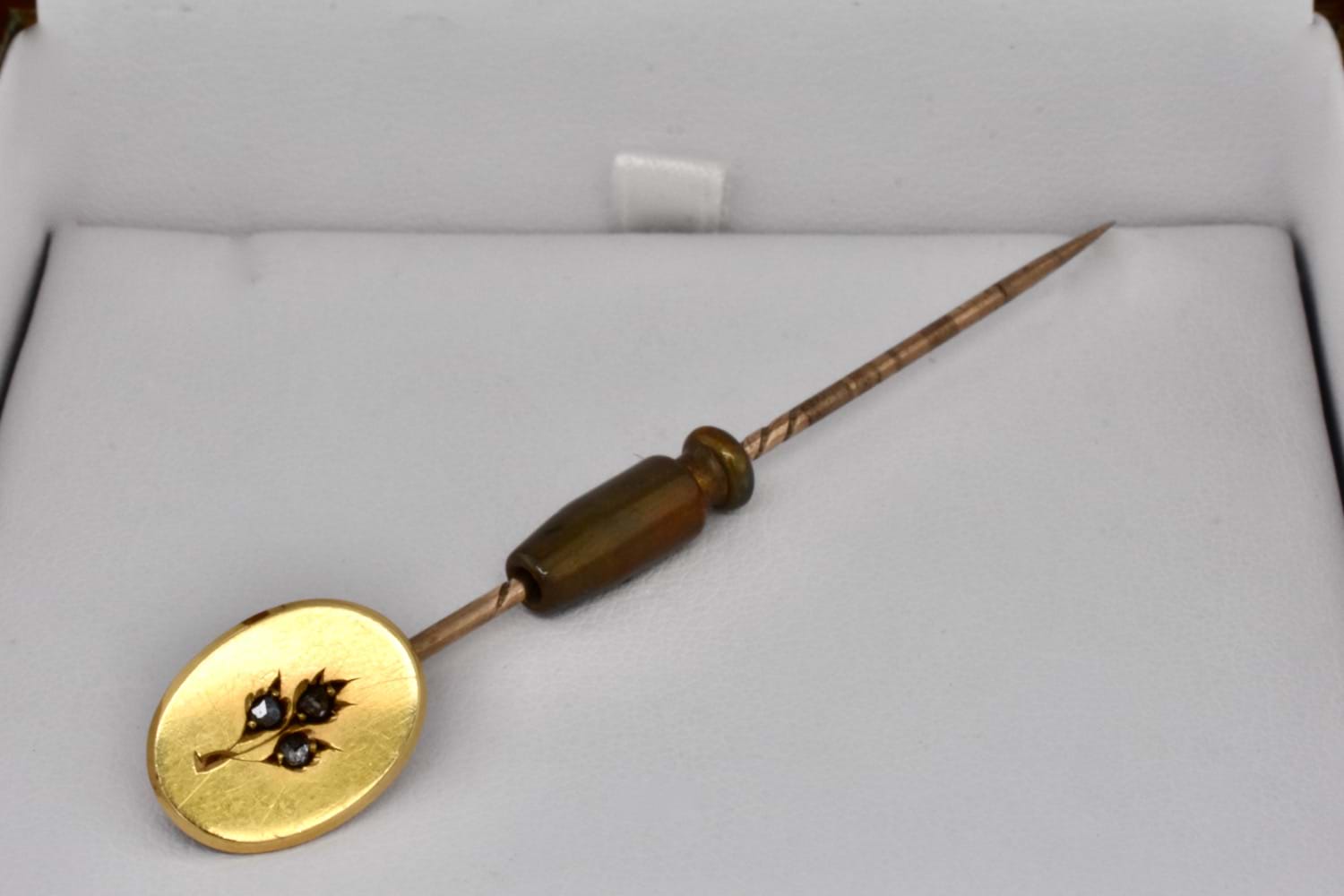 Simple and beautiful 18ct yellow gold antique diamond stick pin with an oval panel and a rose design