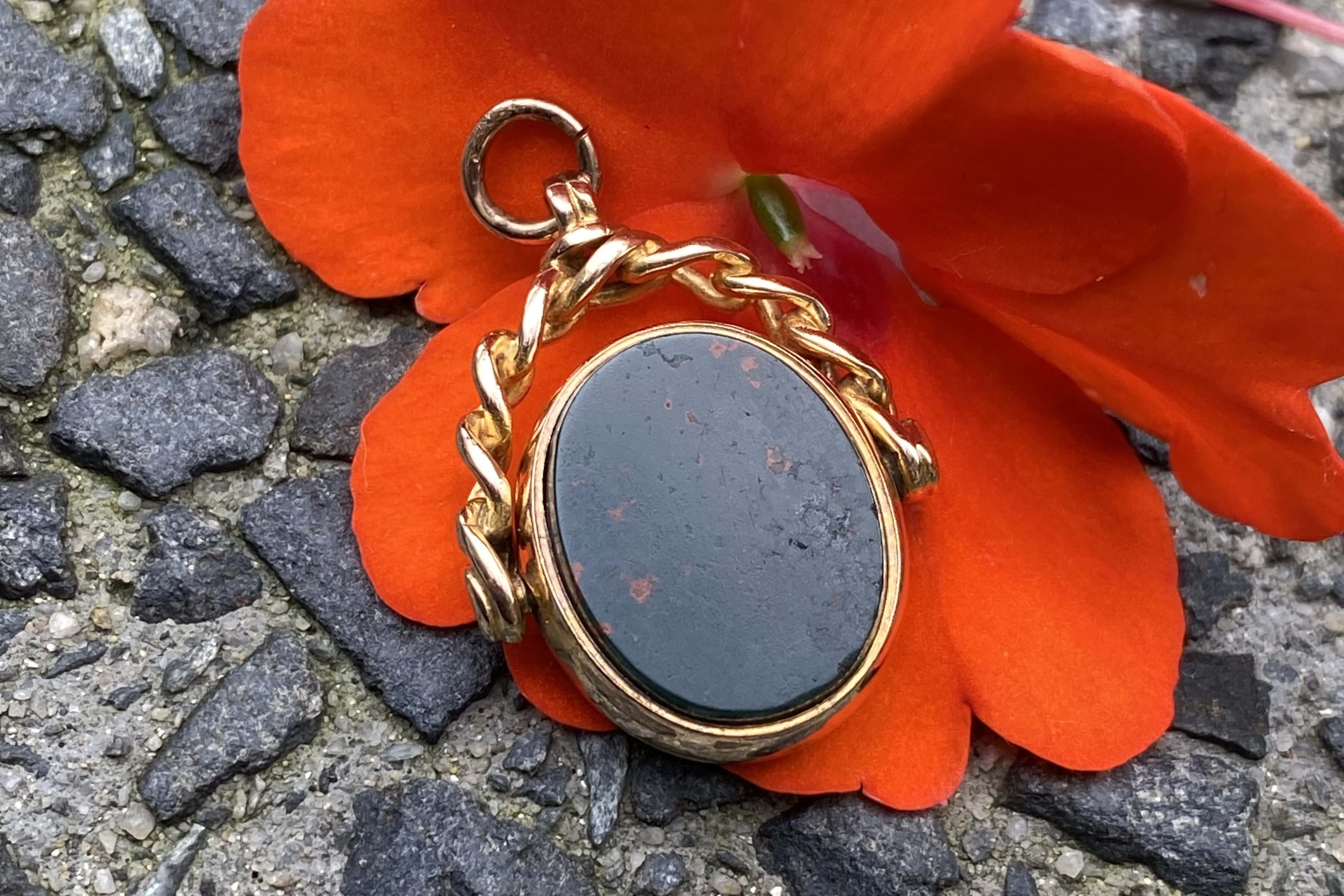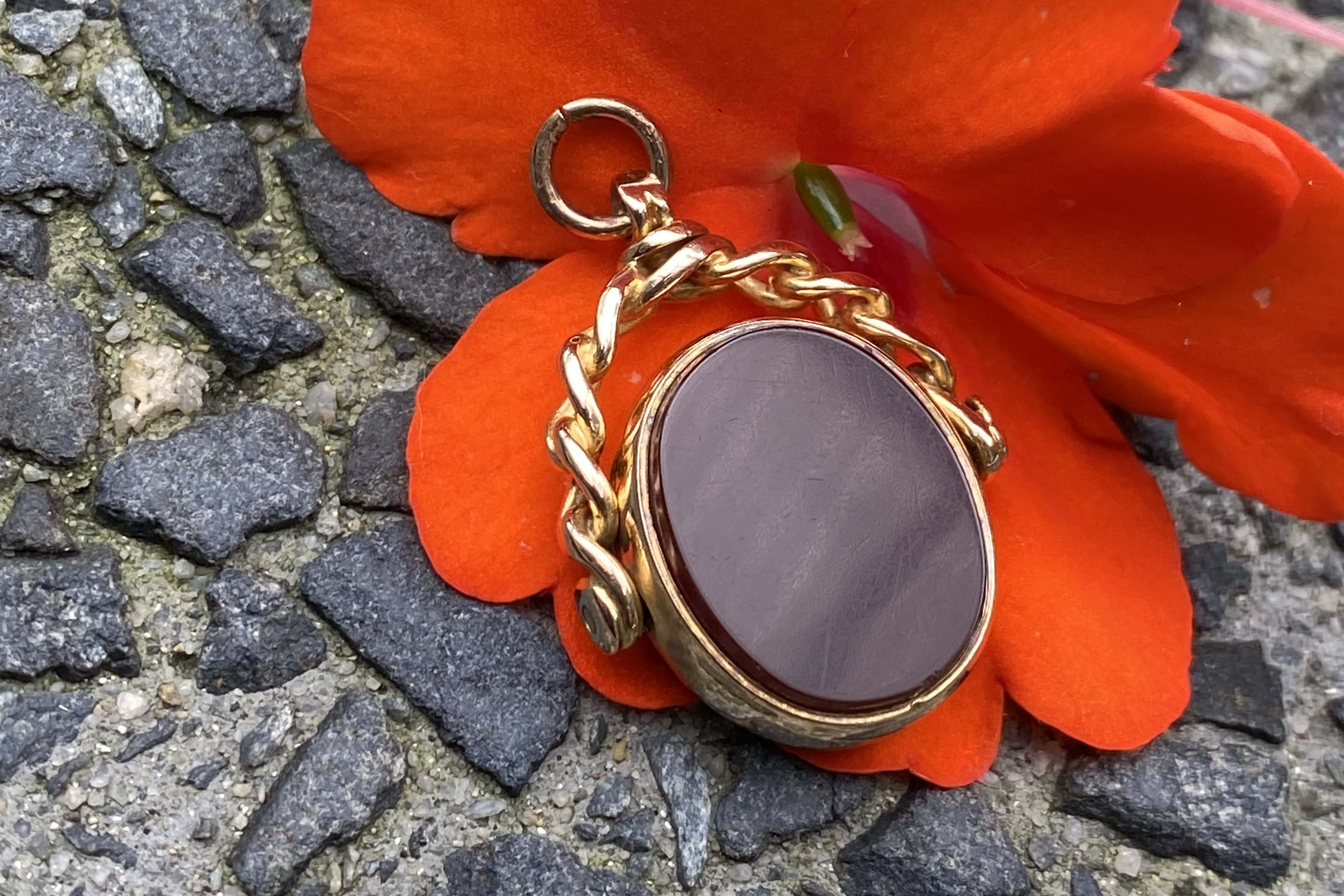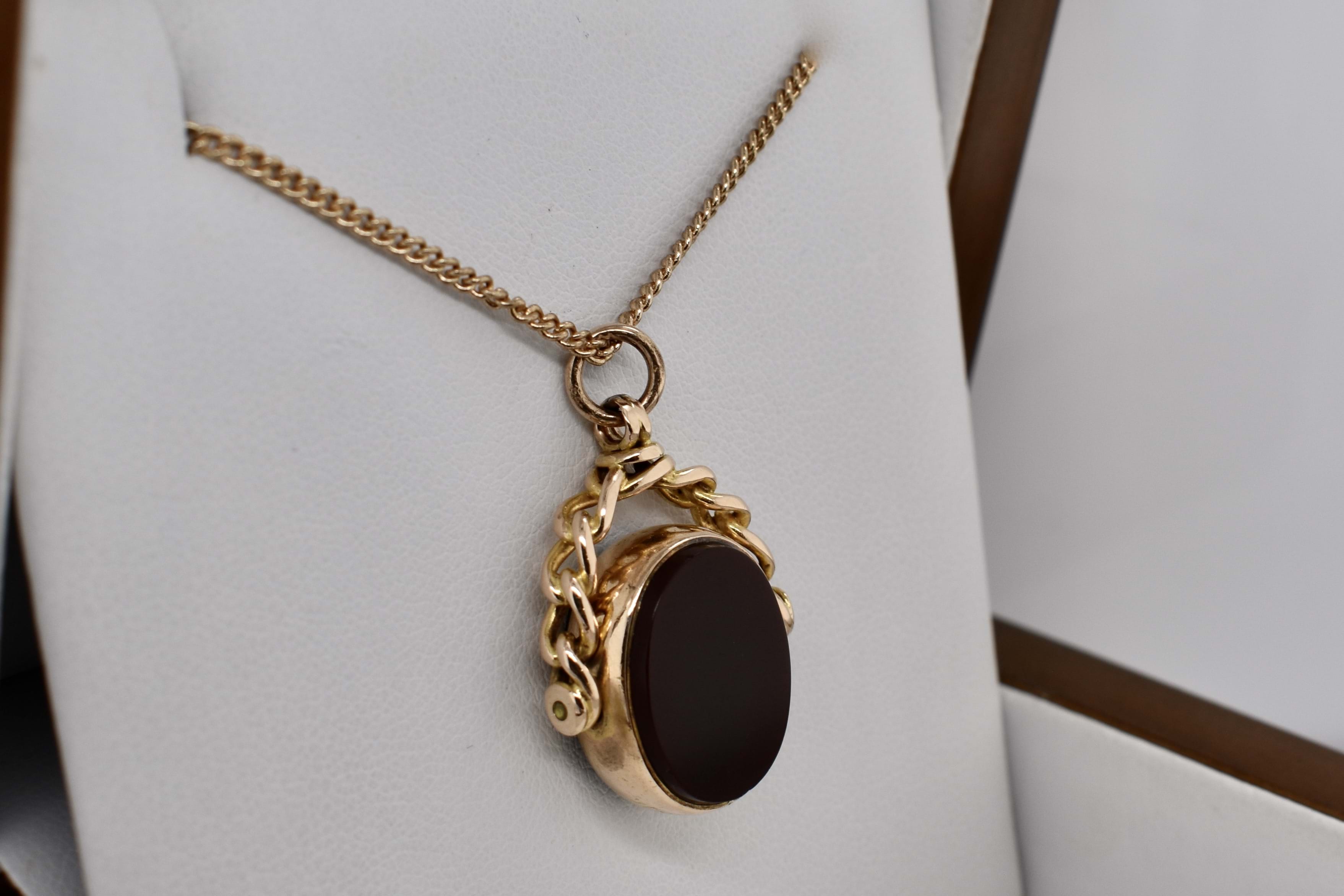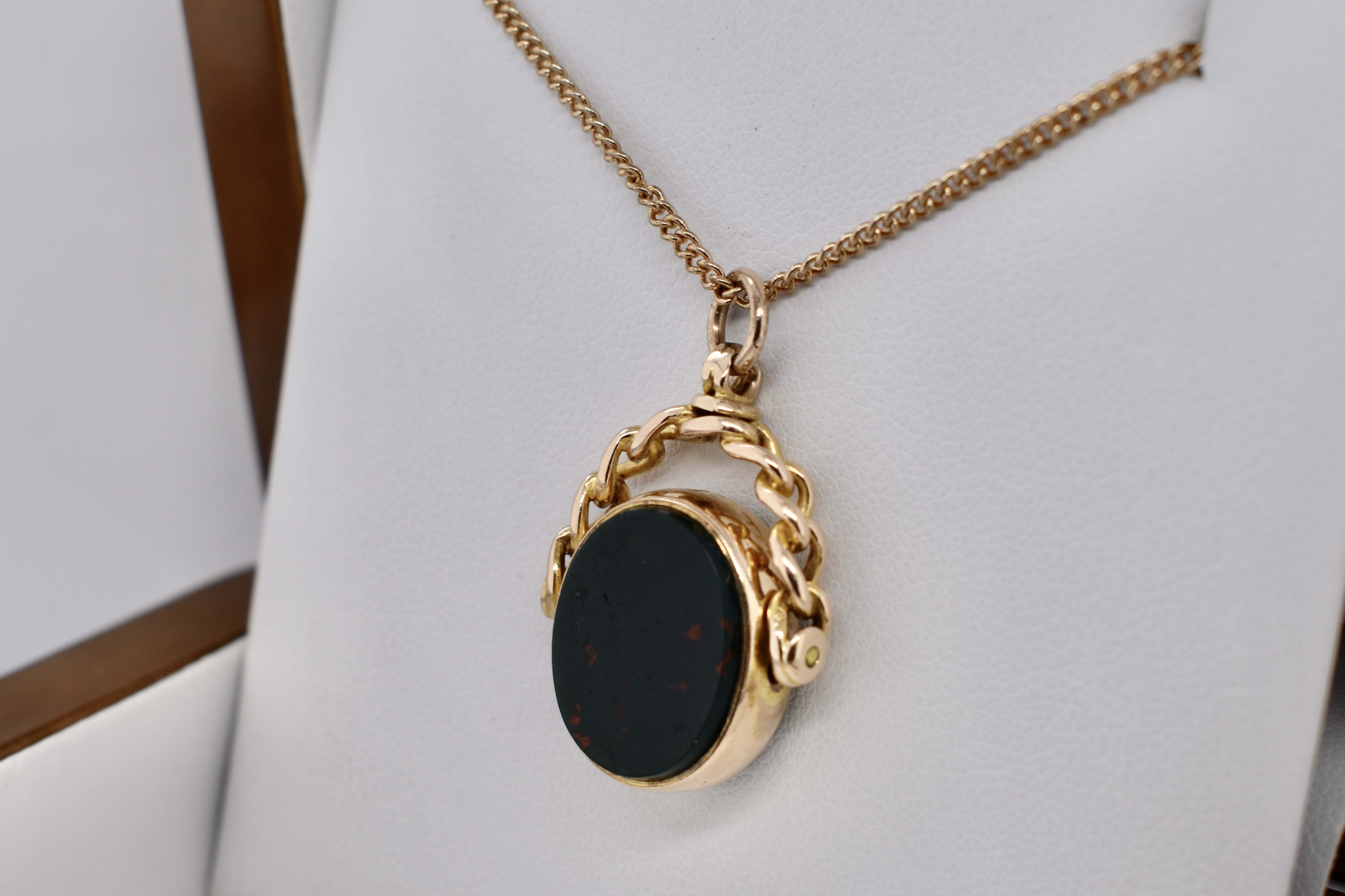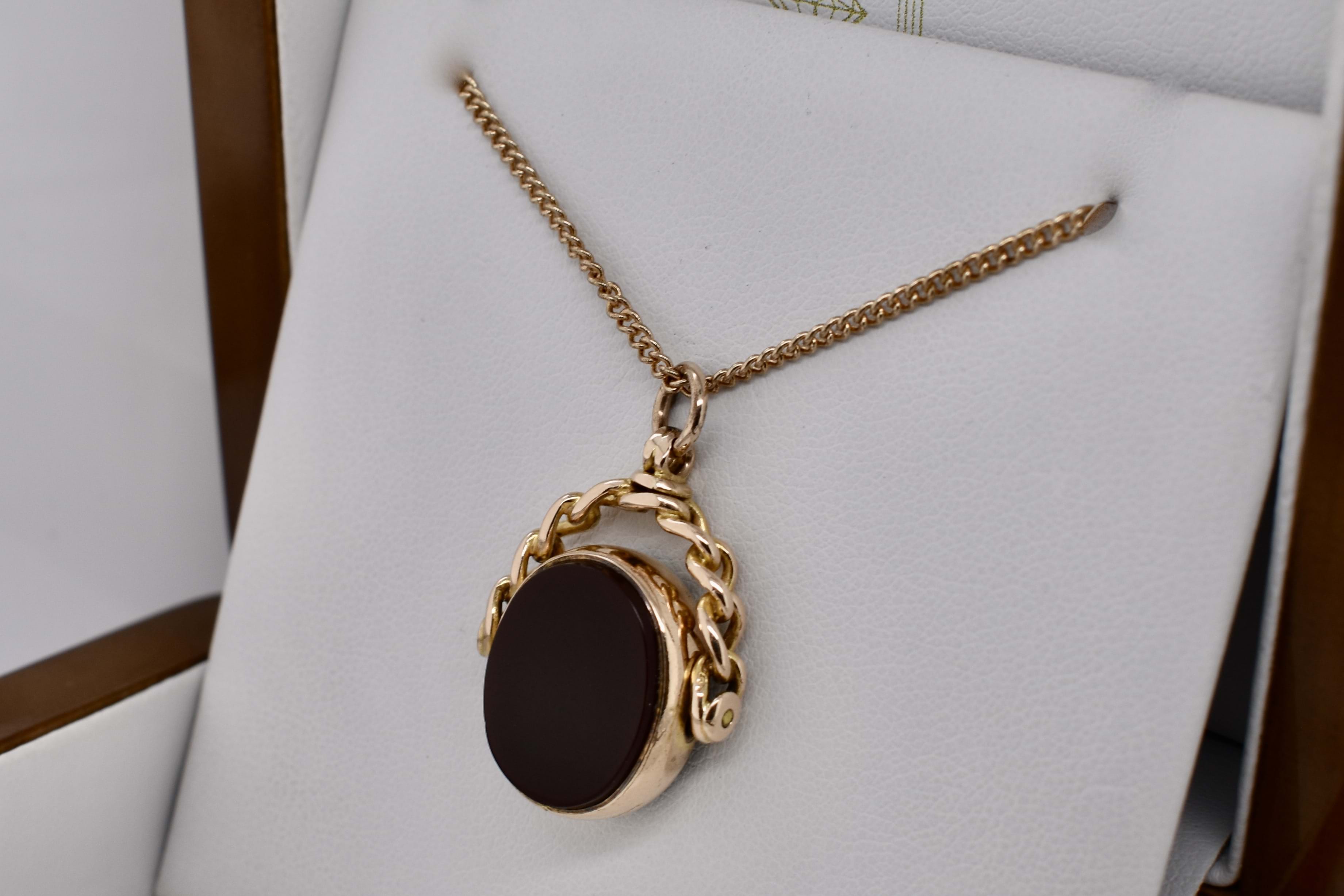Lovely 15ct yellow gold spinner containing an oval carnelian and bloodstone rim set with a curb link chain top. The stones measure 16.5x14mm. Dated circa 1900, stamped Birmingham. Chains are available for separate purchase. Independent Valuation Supplied