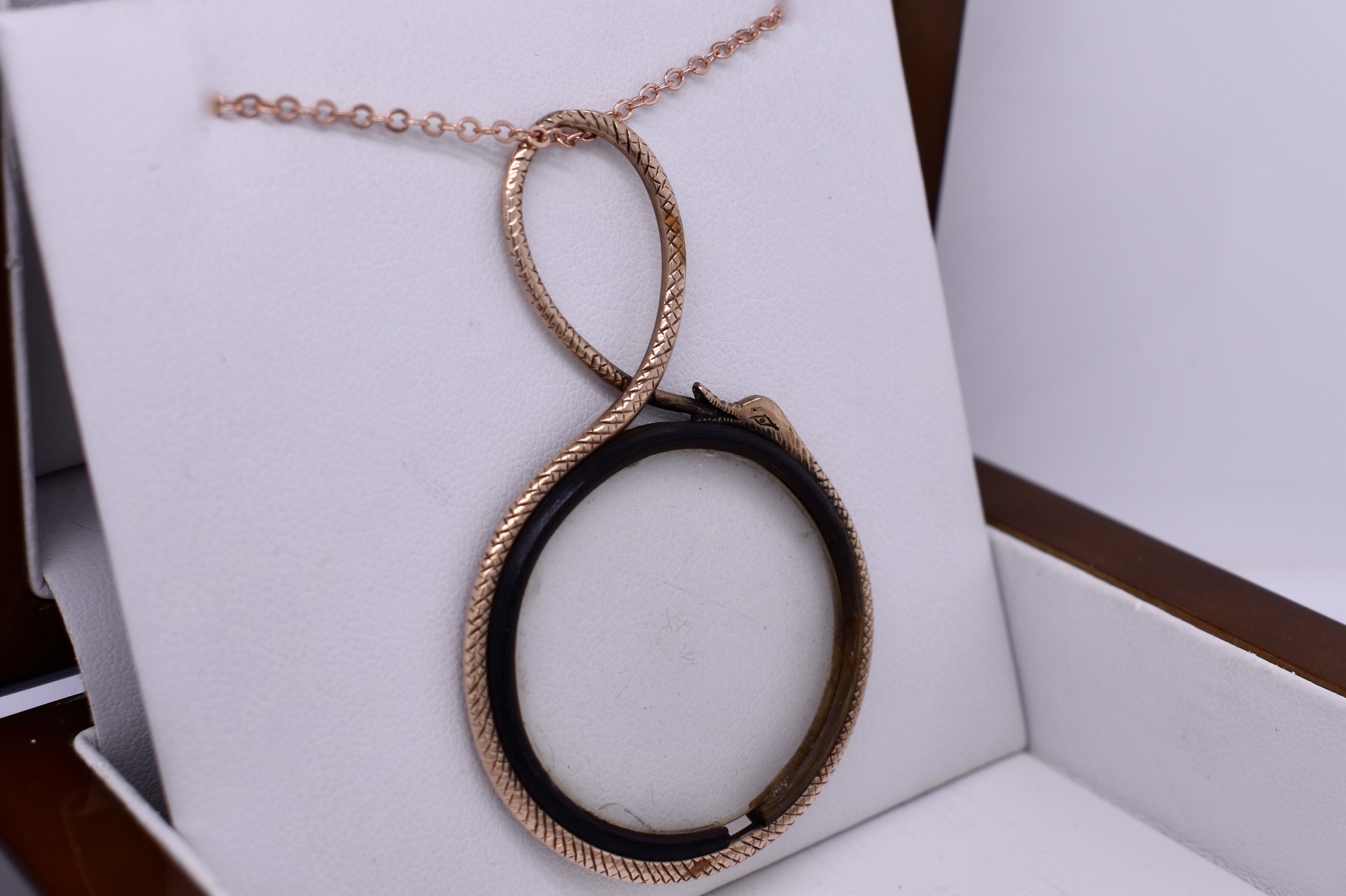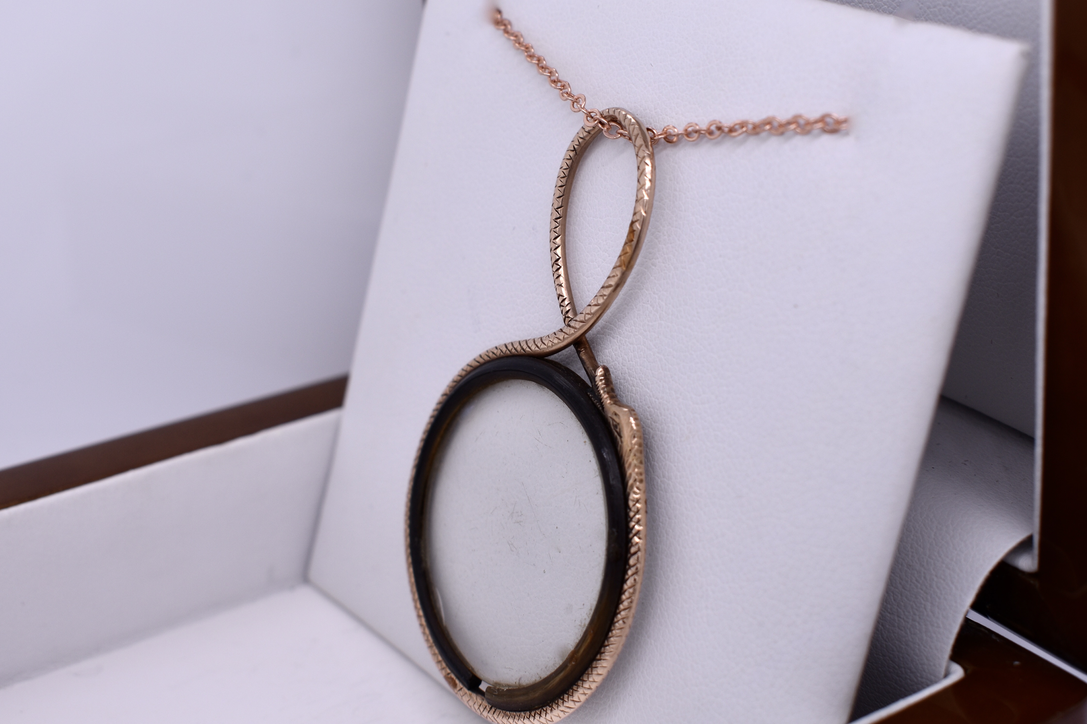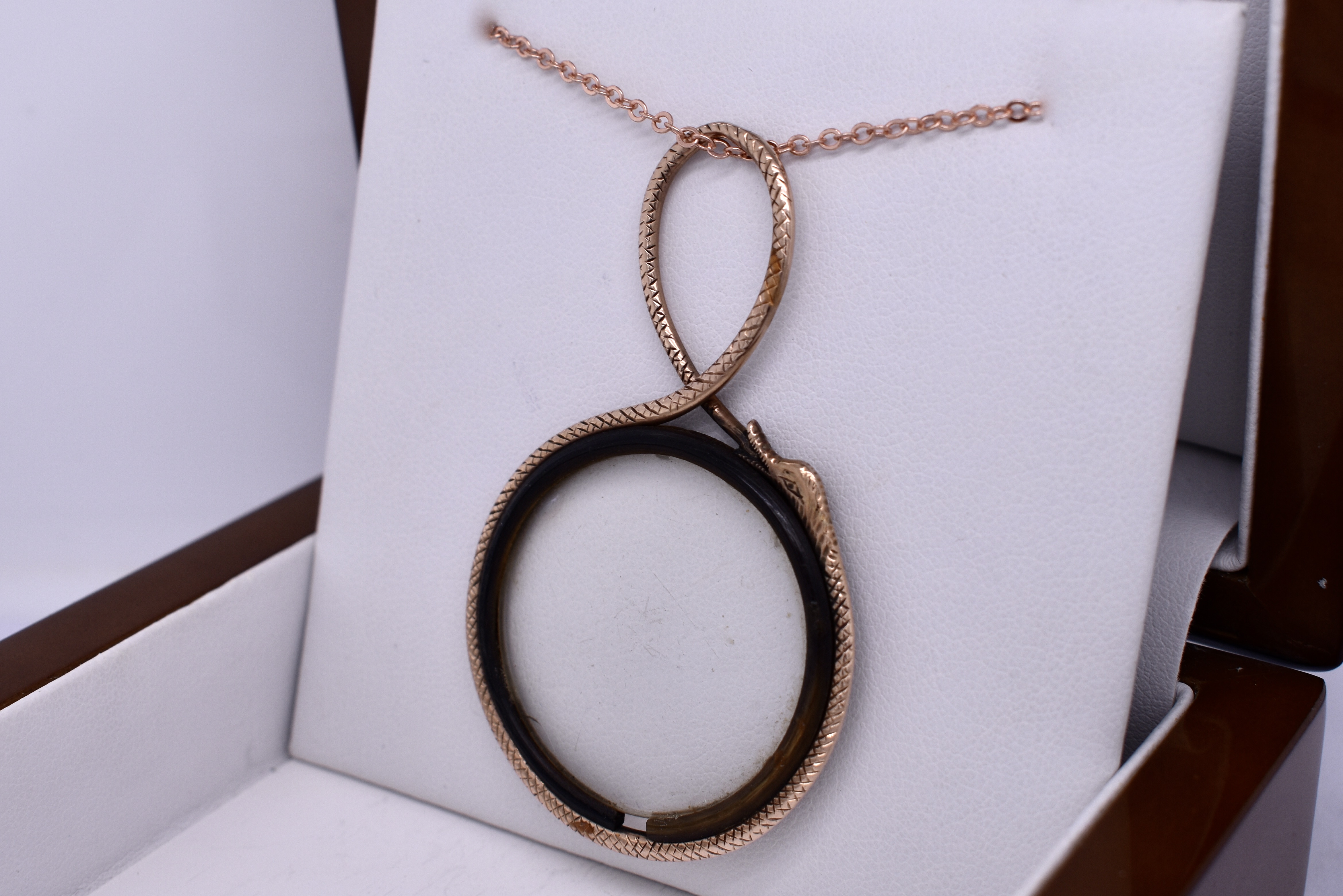 One of a kind 9ct rose gold eternal snake magnifying glass, dated circa 1880s, with a fine horn rim detailing. Measures 30mm with glass centre. Chains available for separate purchase.