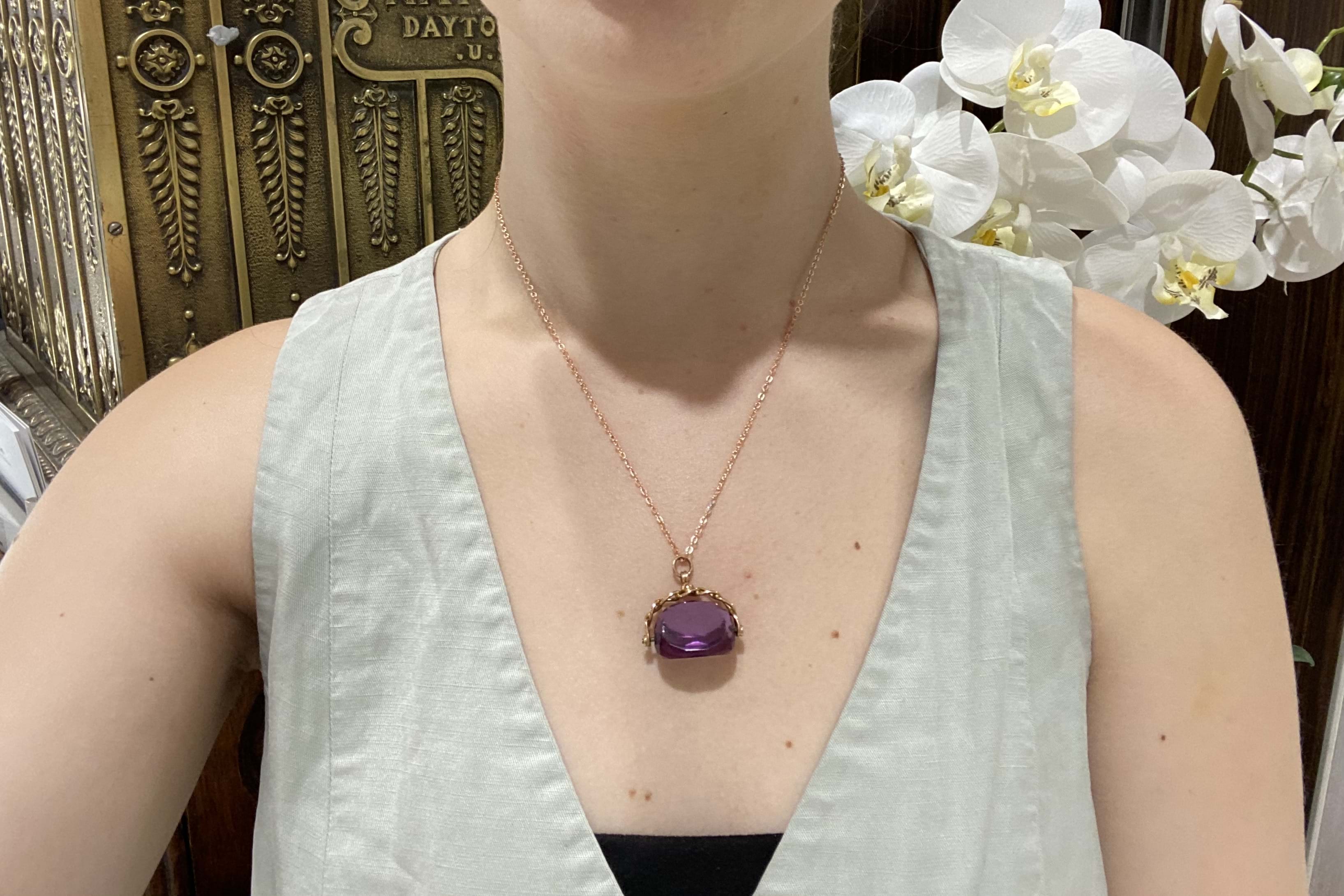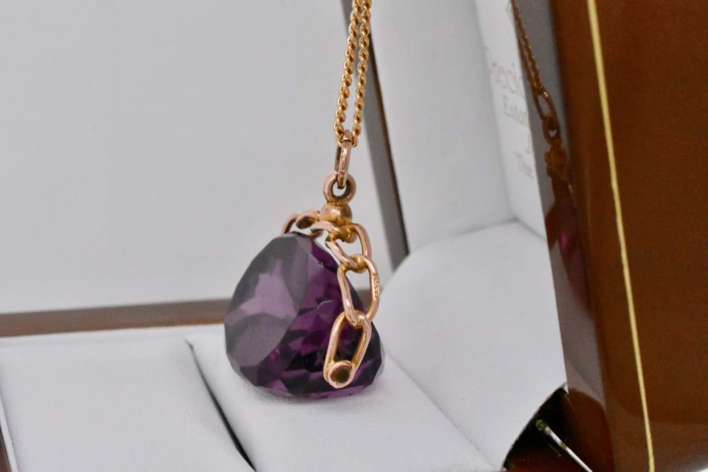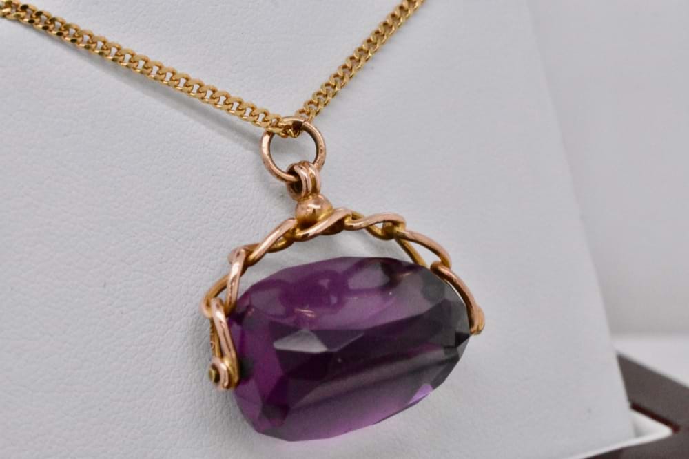 A 9ct rose gold spinner with a chain style top typical of it's 1910 origin with a faceted piece of purple paste (glass) suspended in the centre. Independent Valuation Supplied