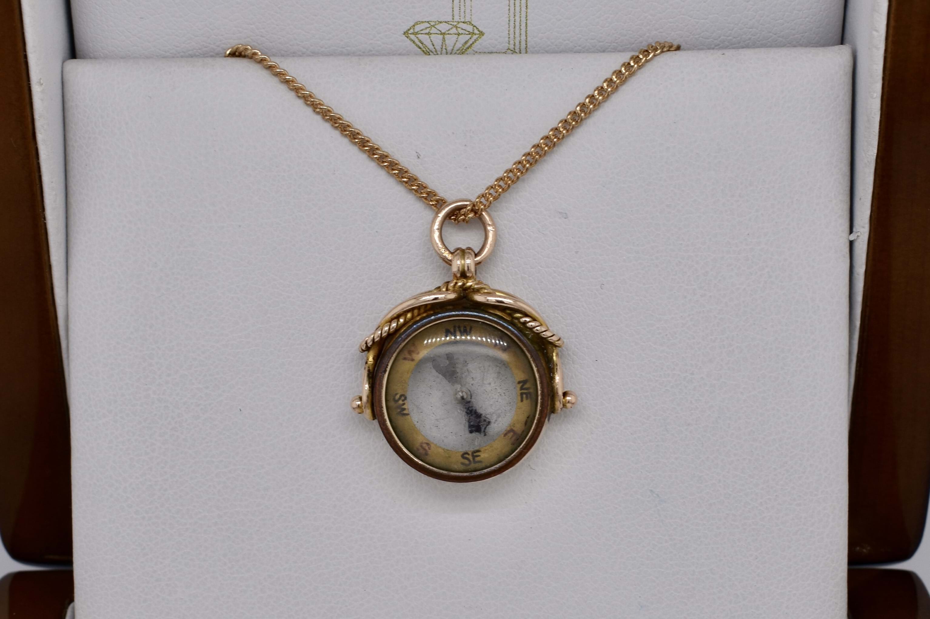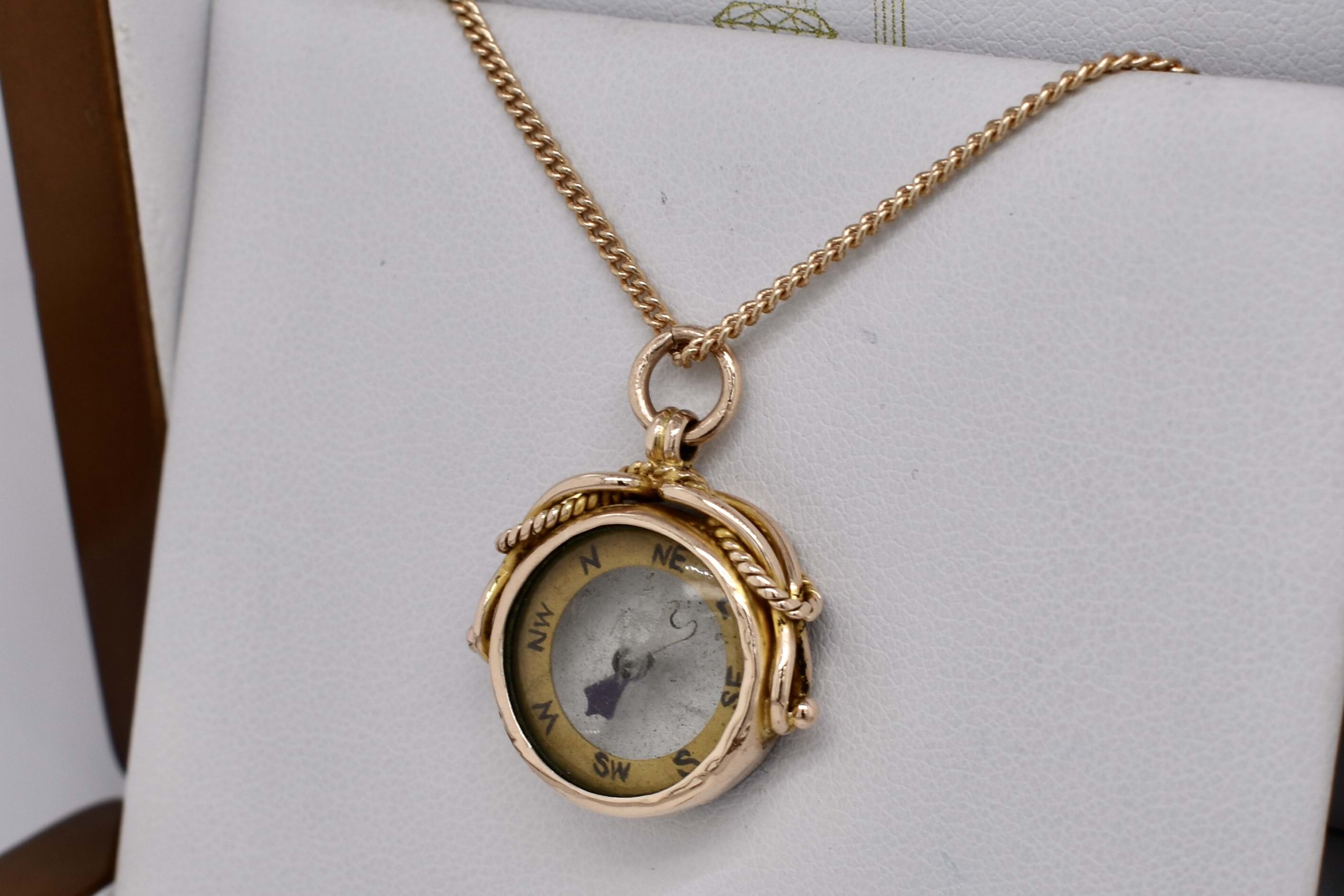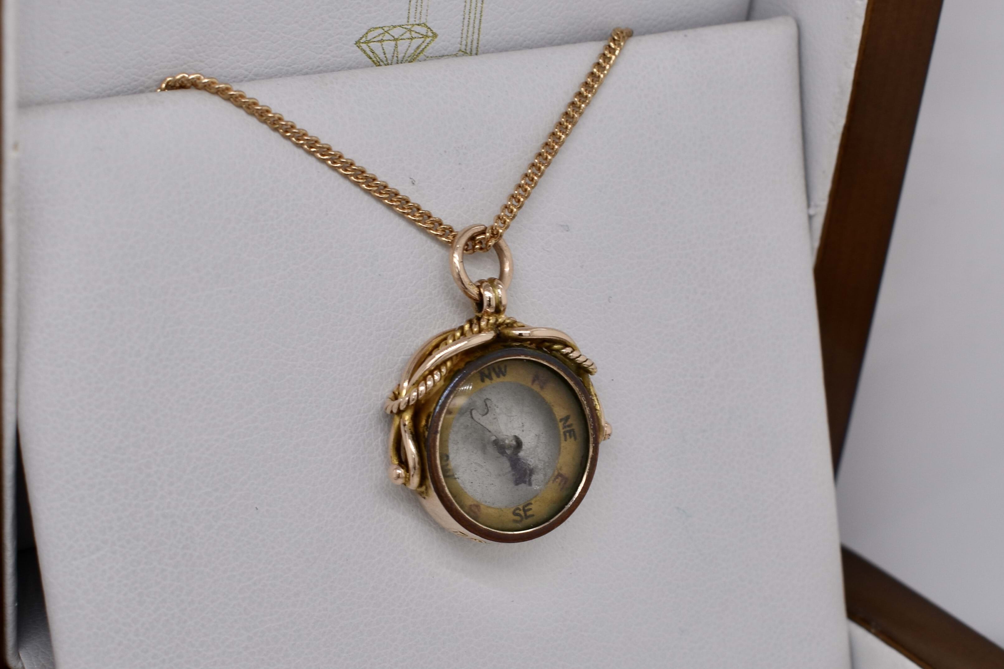 Stunning antique glass front and back compass, crafted in 9ct yellow gold, measuring 20mm round. Surrounded by nautical styled rope framing with a jump ring loop and dated Birmingham 1910. Note: glass scratched. Chains available for separate purchase.
