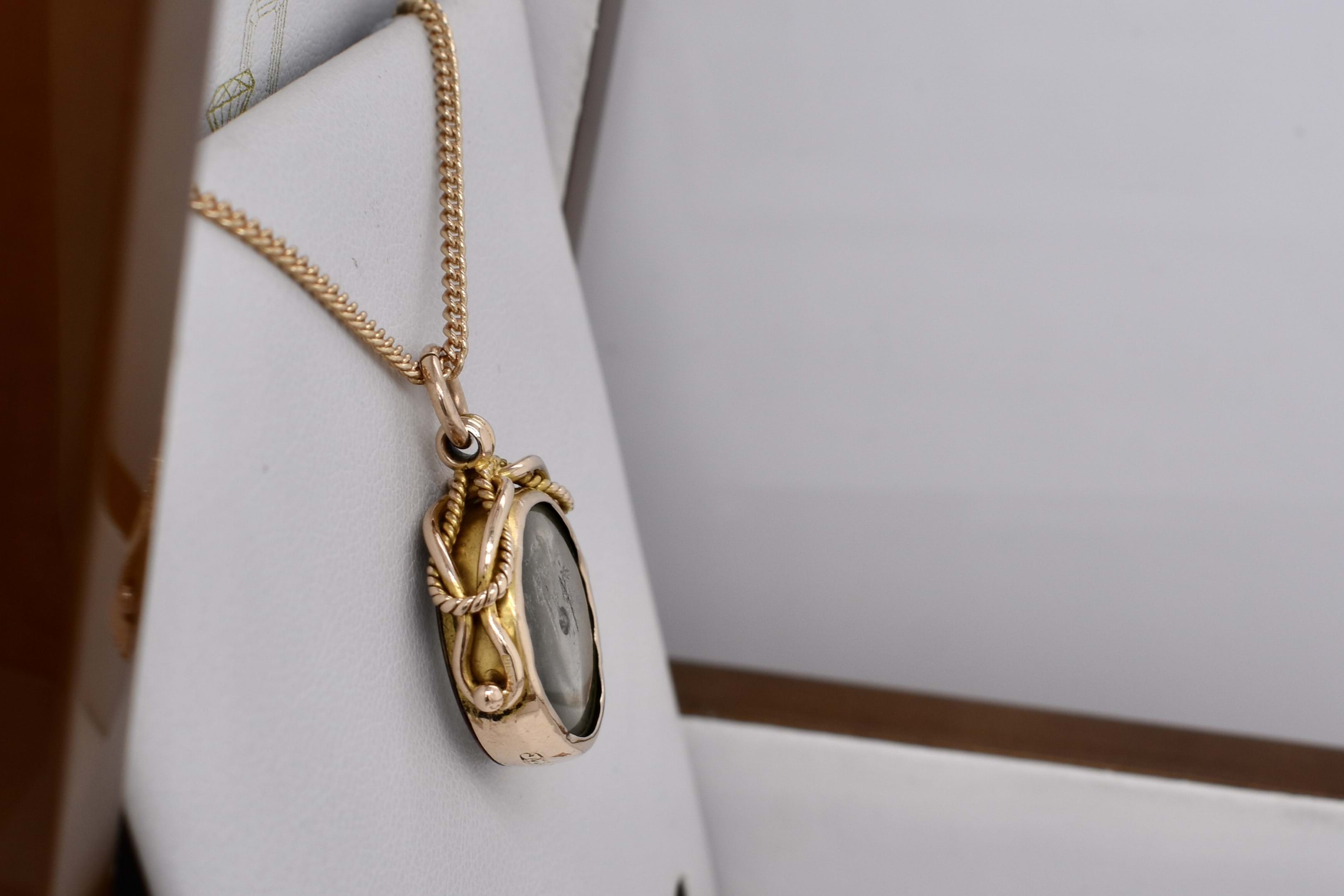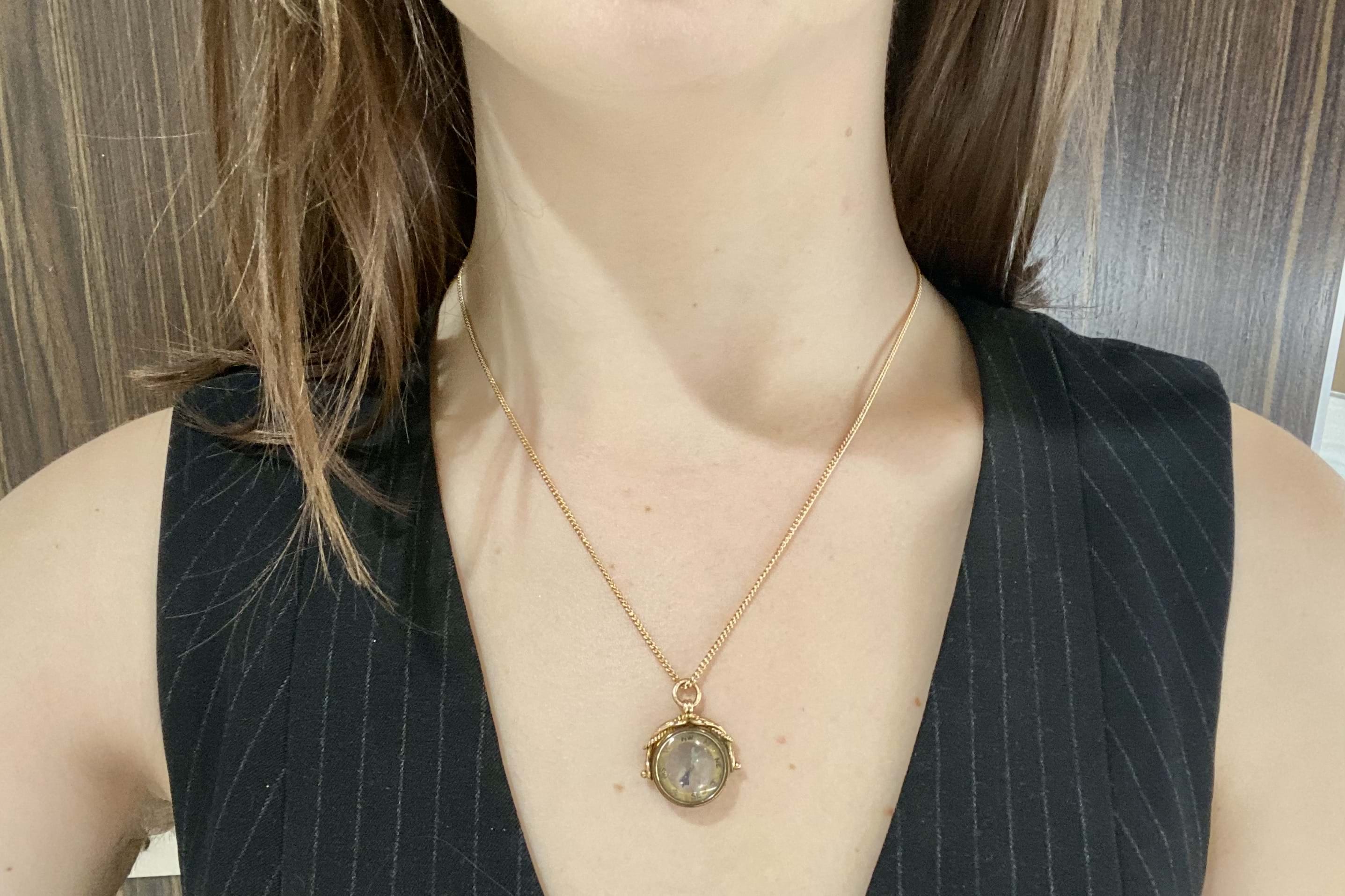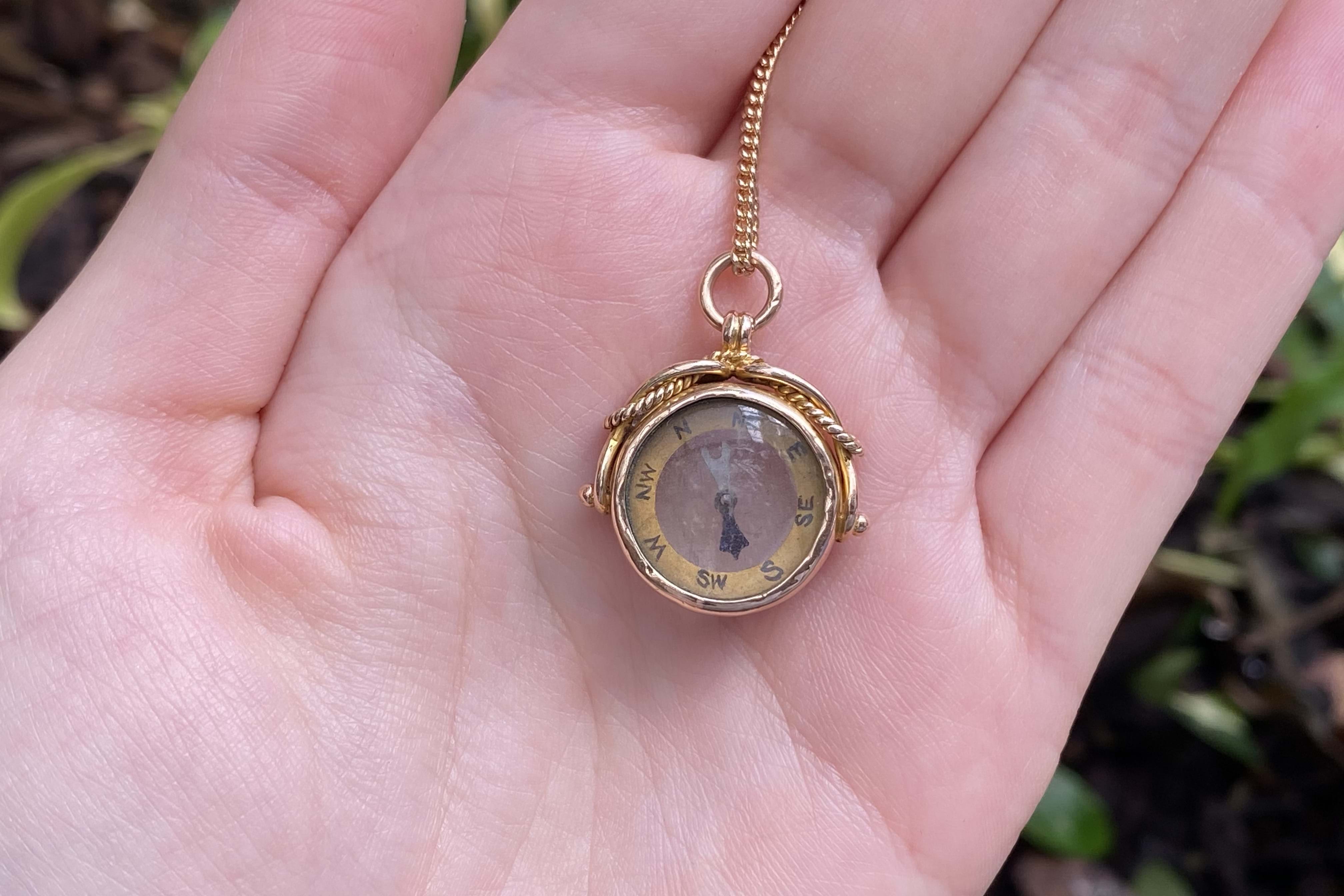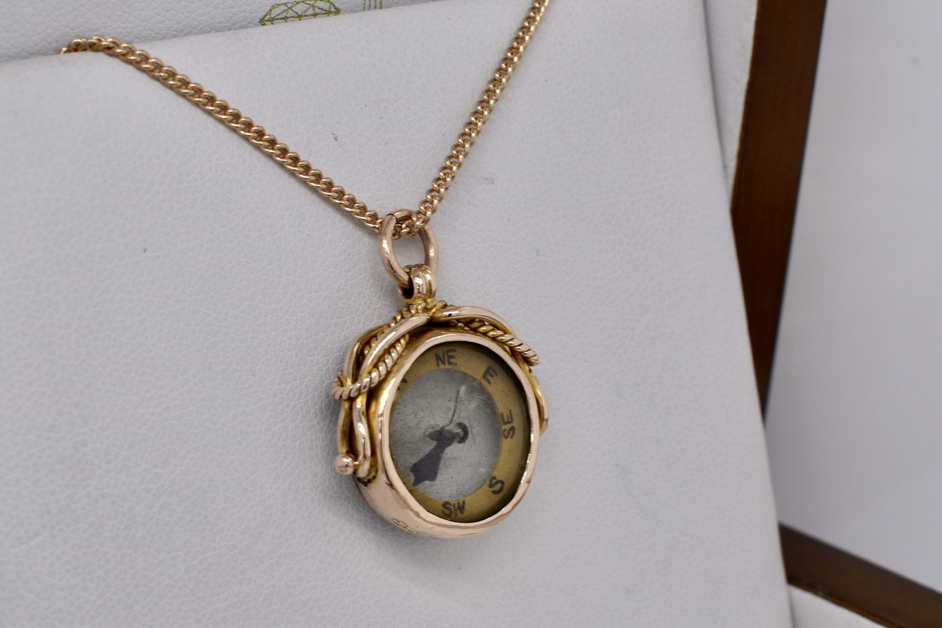 Stunning antique glass front and back compass, crafted in 9ct yellow gold, measuring 20mm round. Surrounded by nautical styled rope framing with a jump ring loop and dated Birmingham 1910. Note: glass scratched. Chains available for separate purchase.