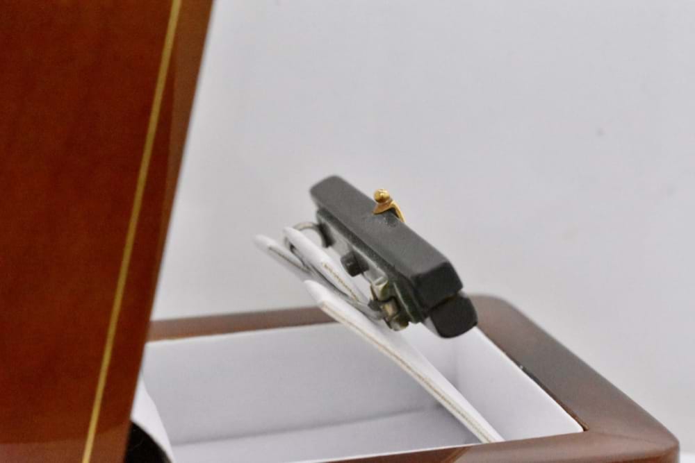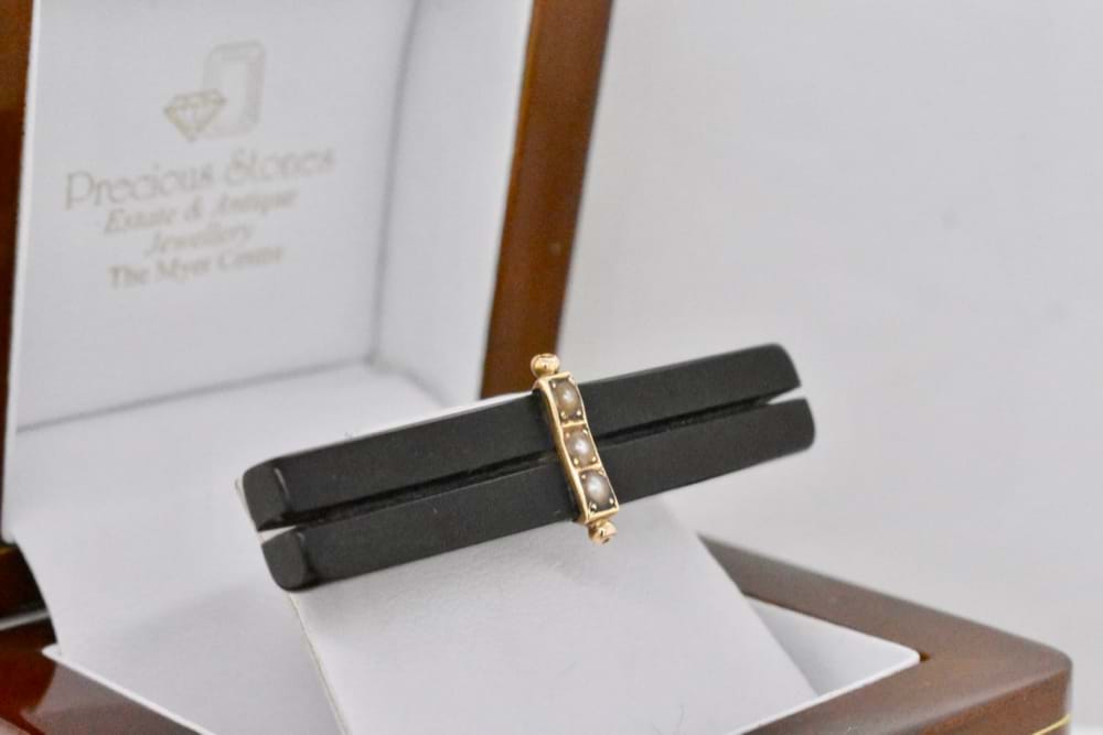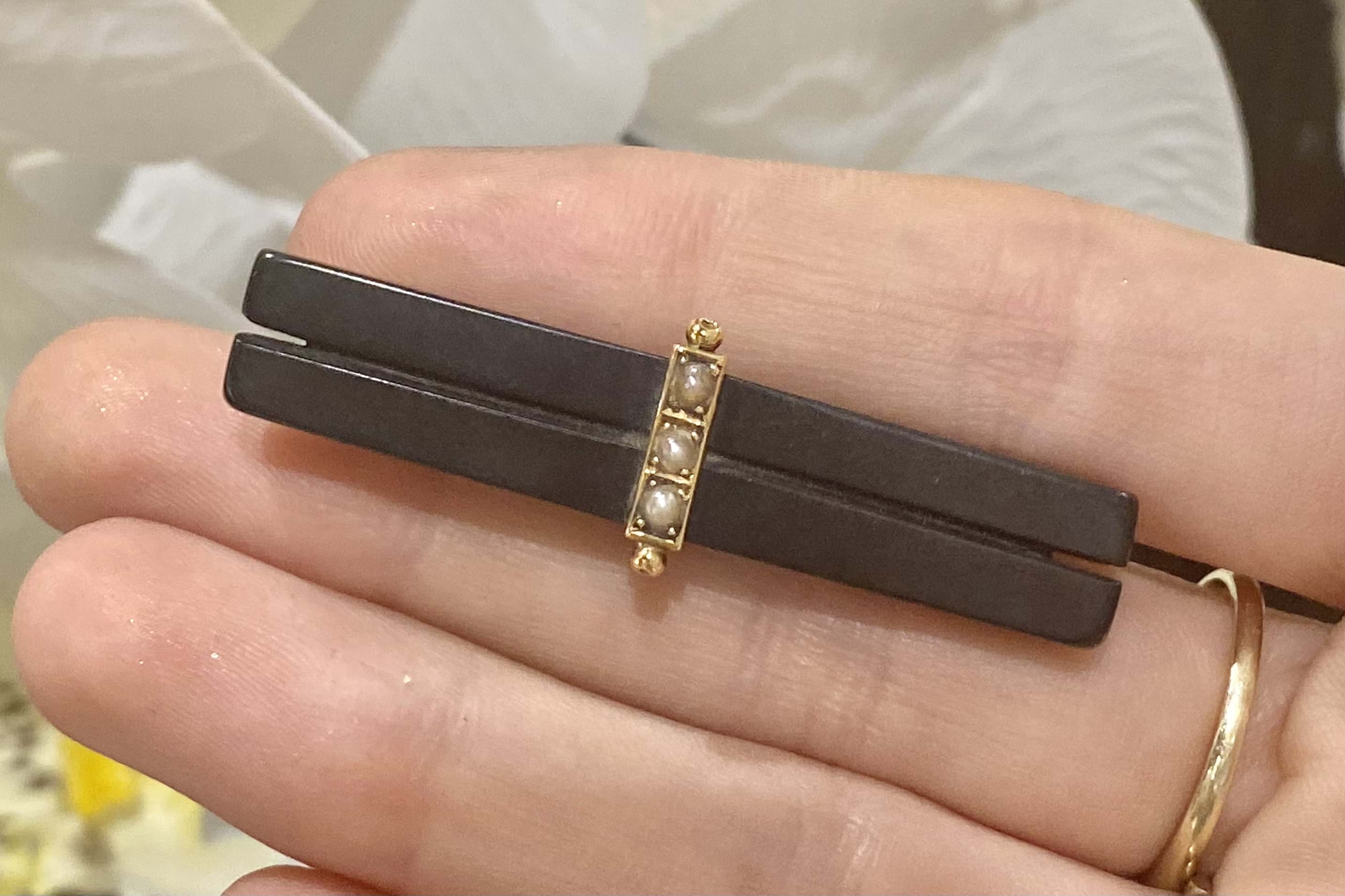 This rectangular tablet of onyx with a 9ct central vertical strip with seed pearls set into it