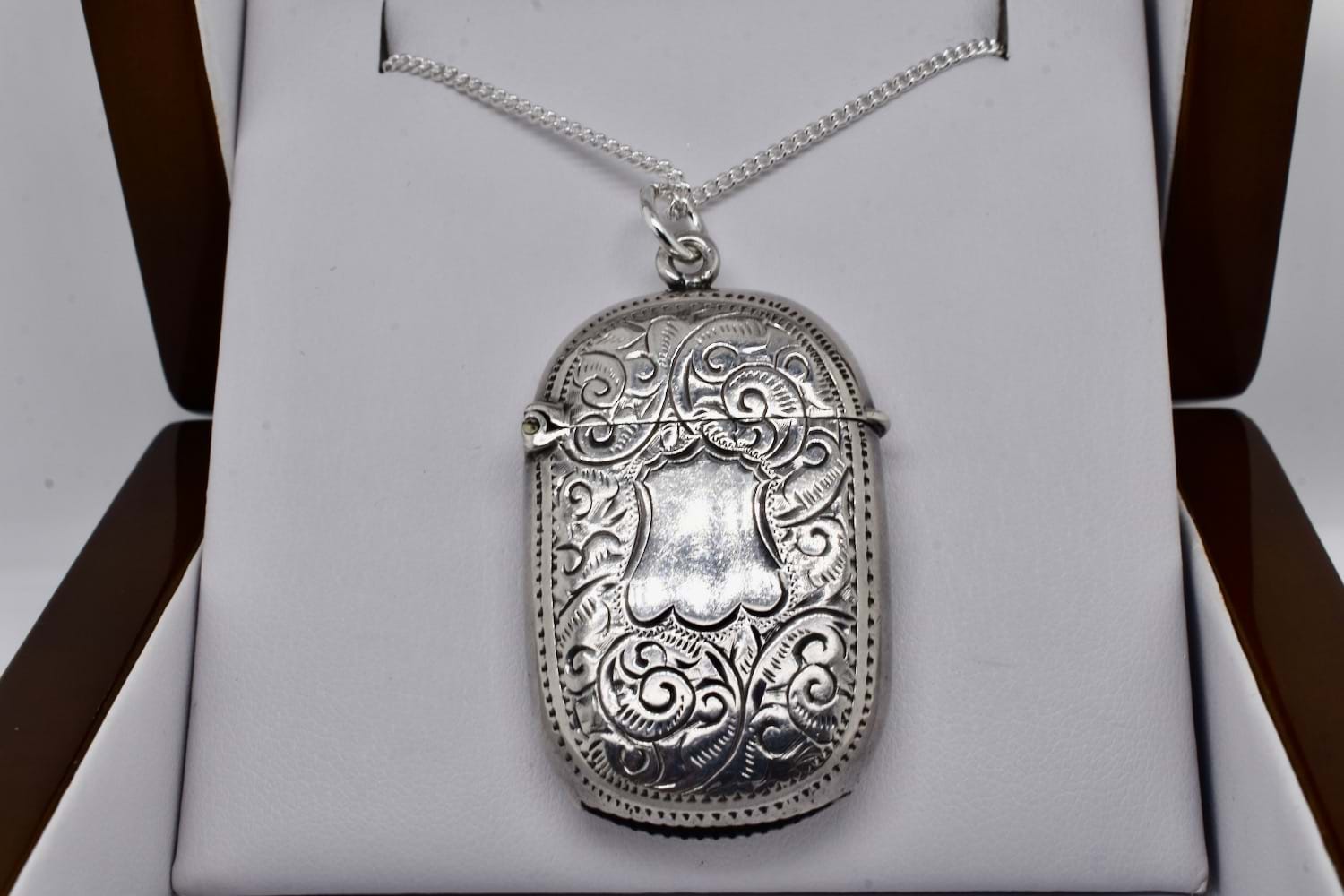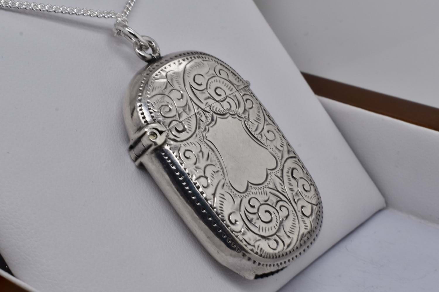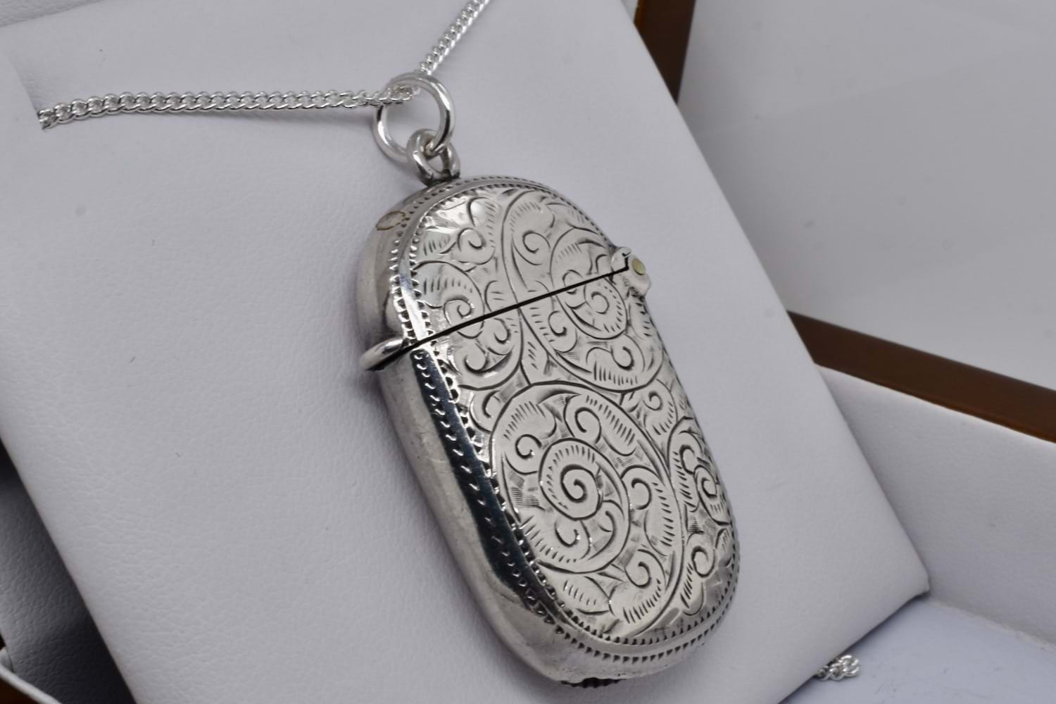 A lovely antique sterling silver vesta in a rounded rectangle shape, engraved with pretty floral and swirl details with a plain section in the middle which could be further engraved, hinged with a top loop and jump ring. Vesta measures approx. 43 x 28mm, hallmarked Birmingham 1898. Chains available for separate purchase
