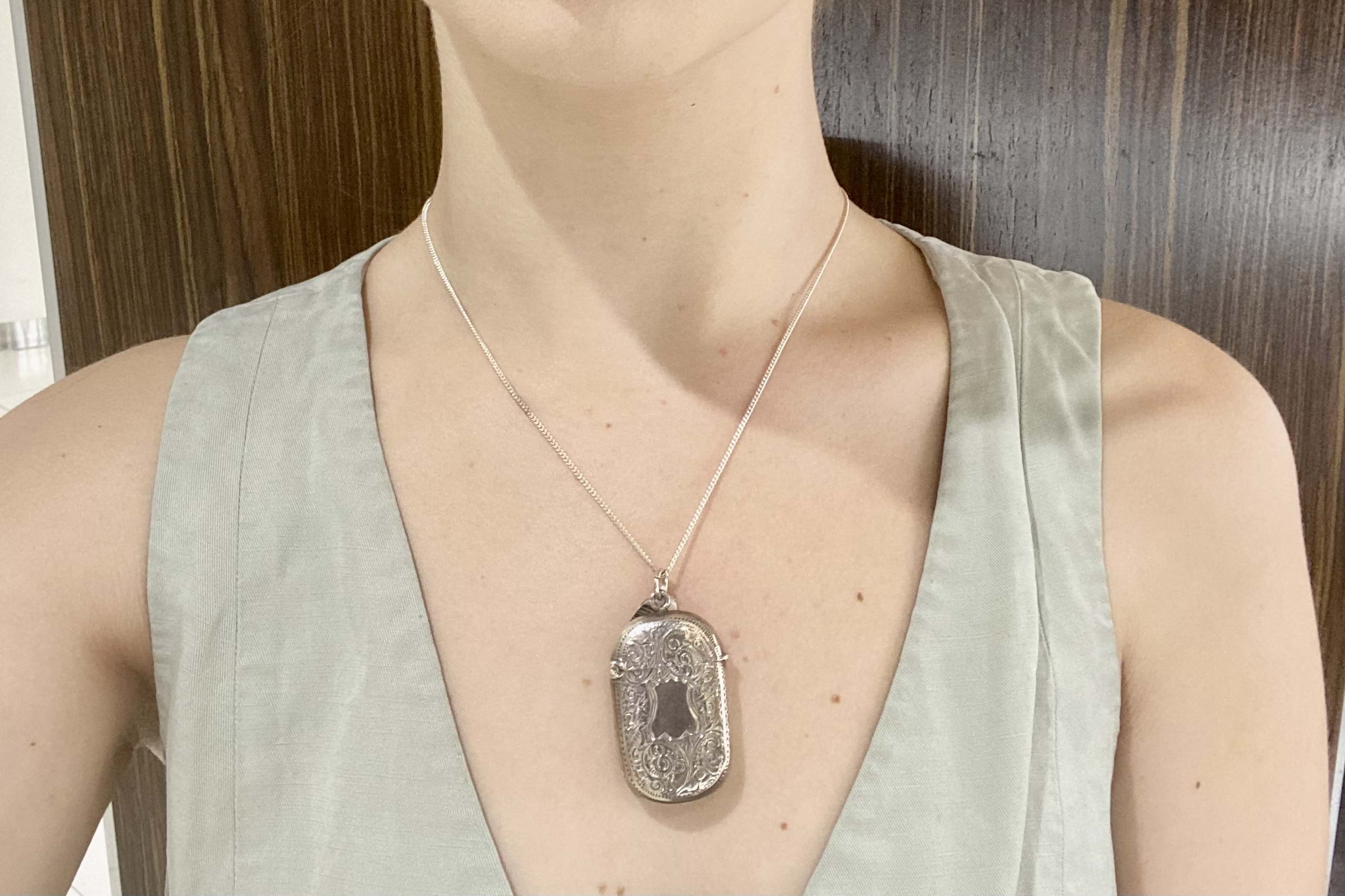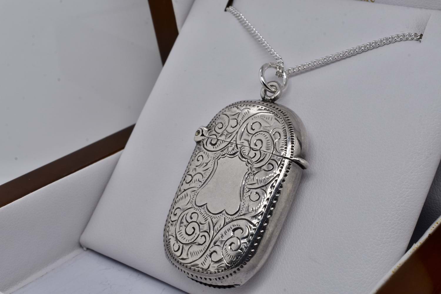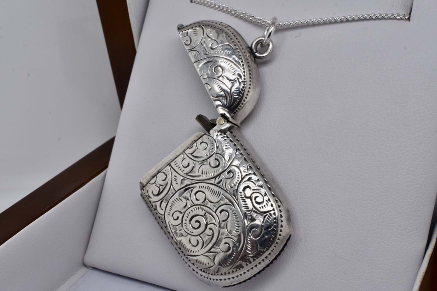 A lovely antique sterling silver vesta in a rounded rectangle shape, engraved with pretty floral and swirl details with a plain section in the middle which could be further engraved, hinged with a top loop and jump ring. Vesta measures approx. 43 x 28mm, hallmarked Birmingham 1898. Chains available for separate purchase