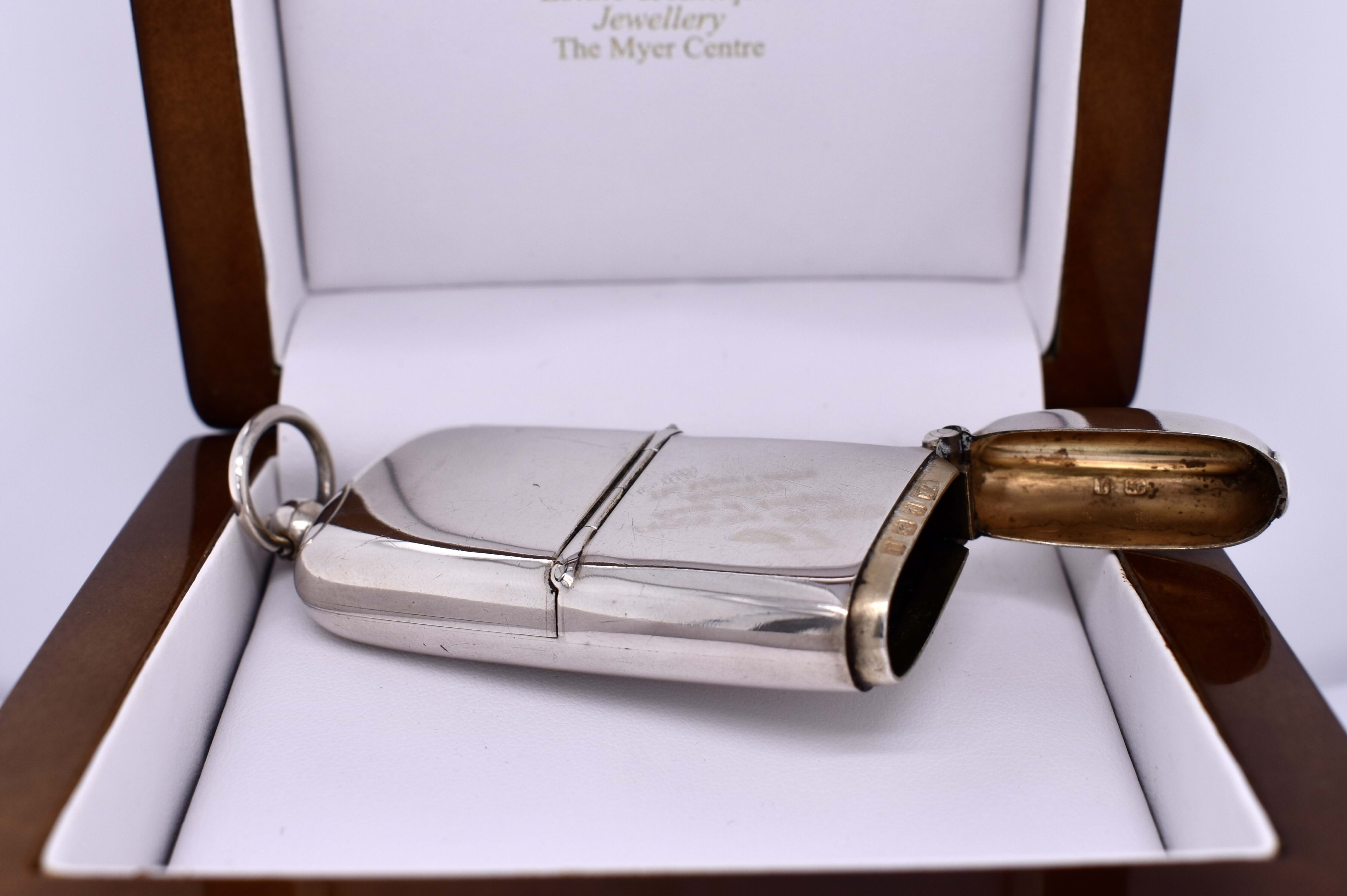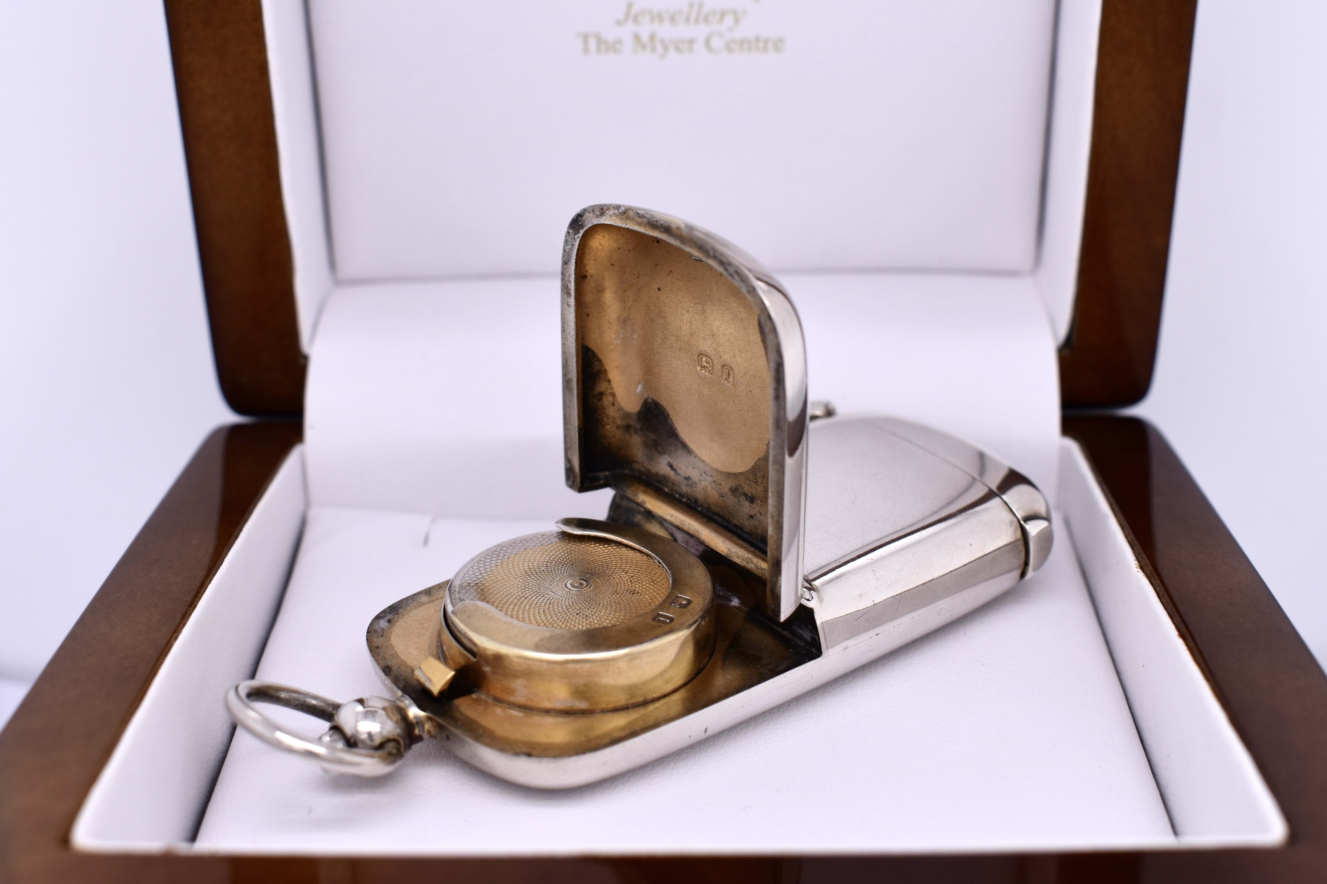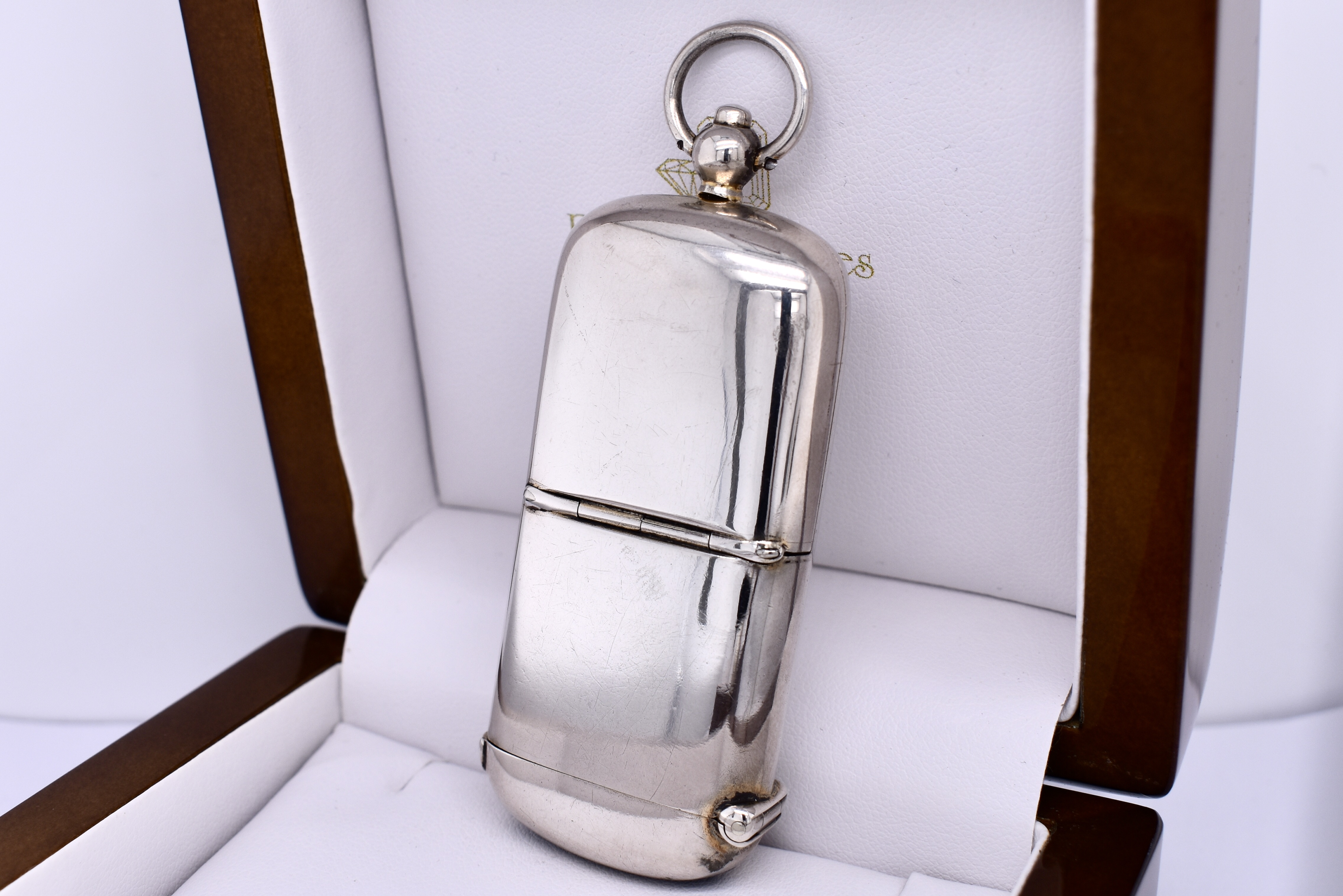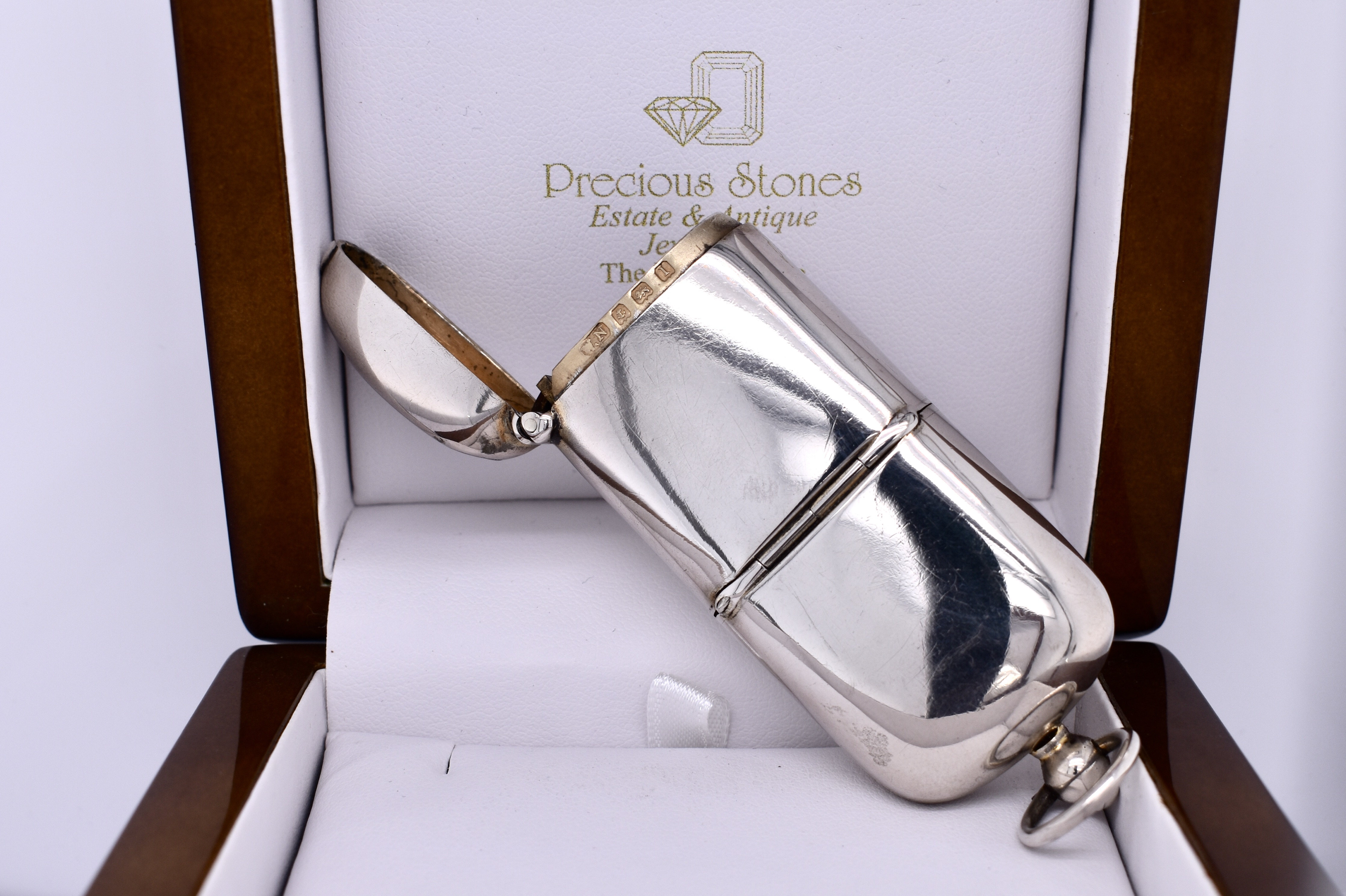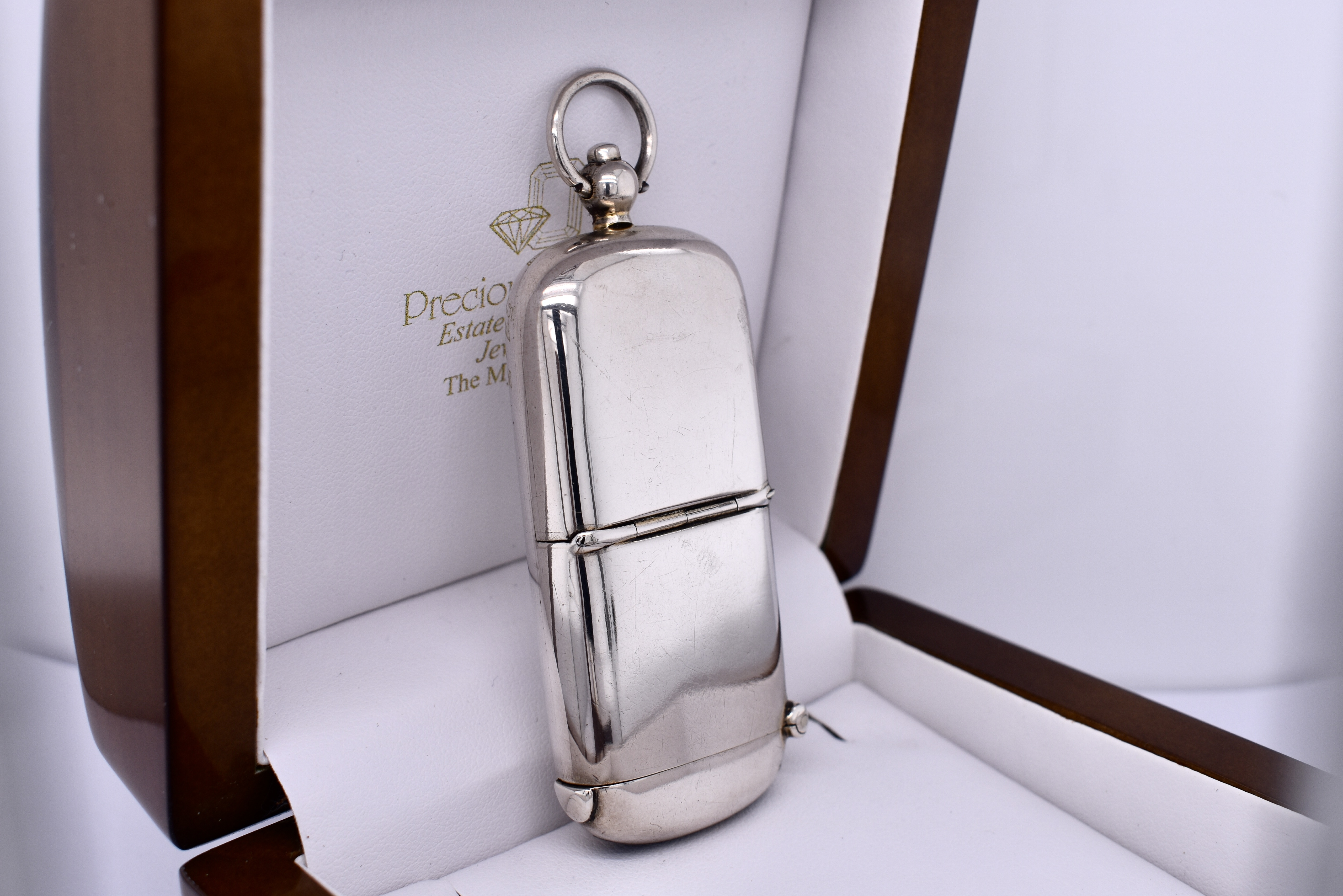 Versatile and striking, this two in one vesta and sovereign case is dated Birmingham 1910 and crafted in sterling silver. The plain polished case measures 65x30mm and is complete with a jump ring loop, enabling it to be worn on multiple chains.