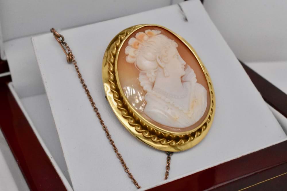Featuring an imaculate cameo carving of a lady this stunning shell cameo is set into an 18ct yellow gold brooch casing with a swirl boarder, and safety chain. This piece would make a striking addition to any outfit or as the next piece in your antique collection. Independent Valuation Supplied.