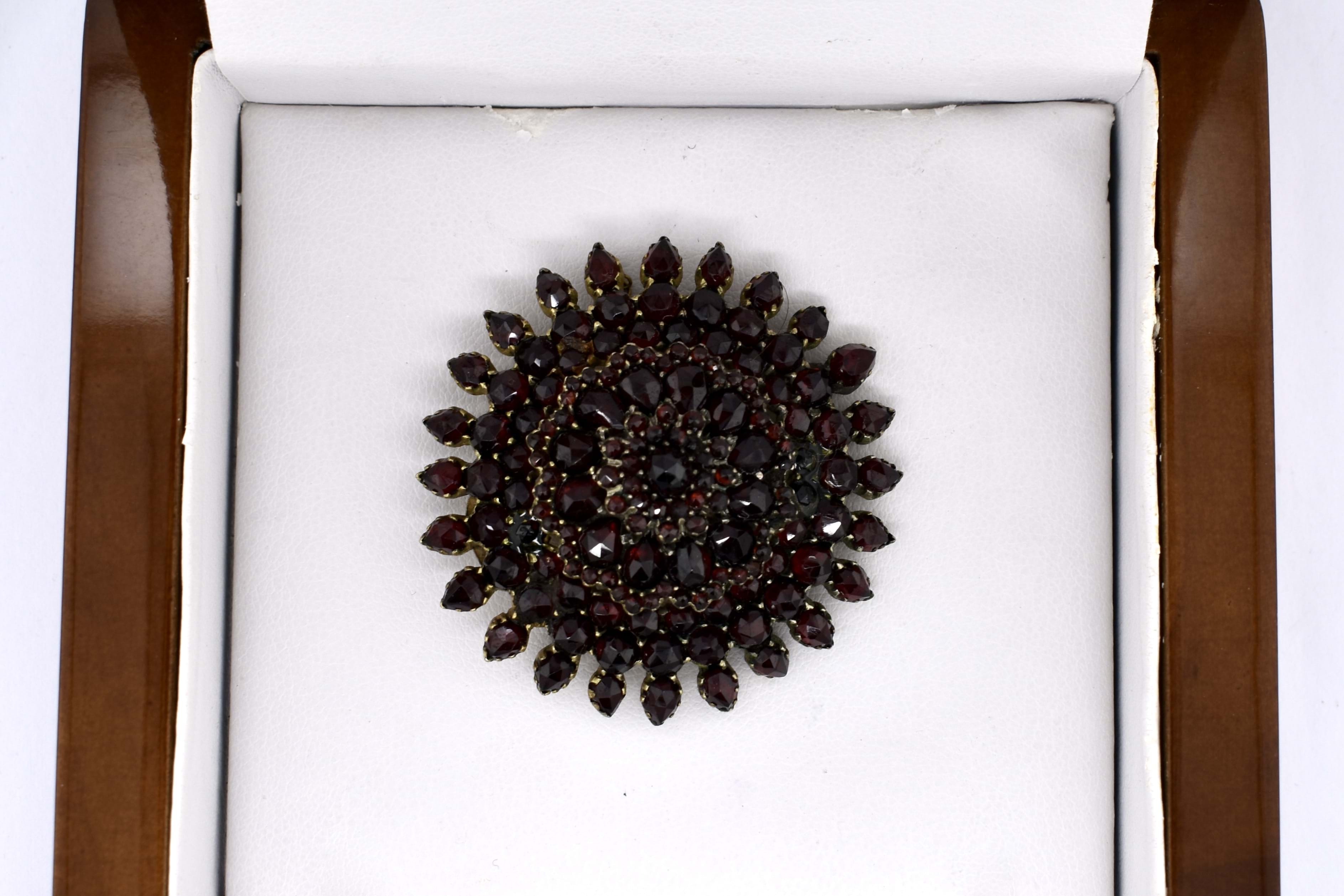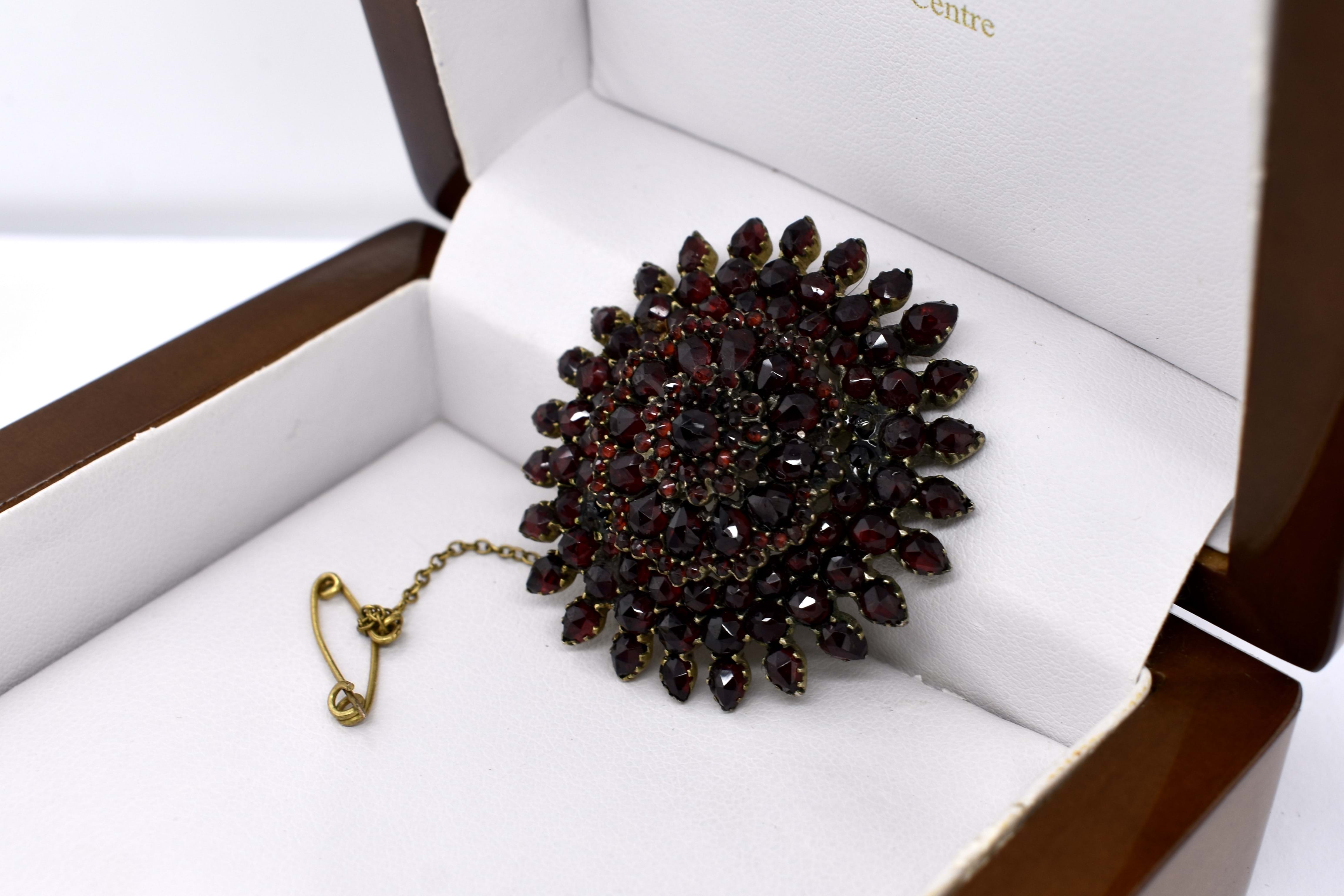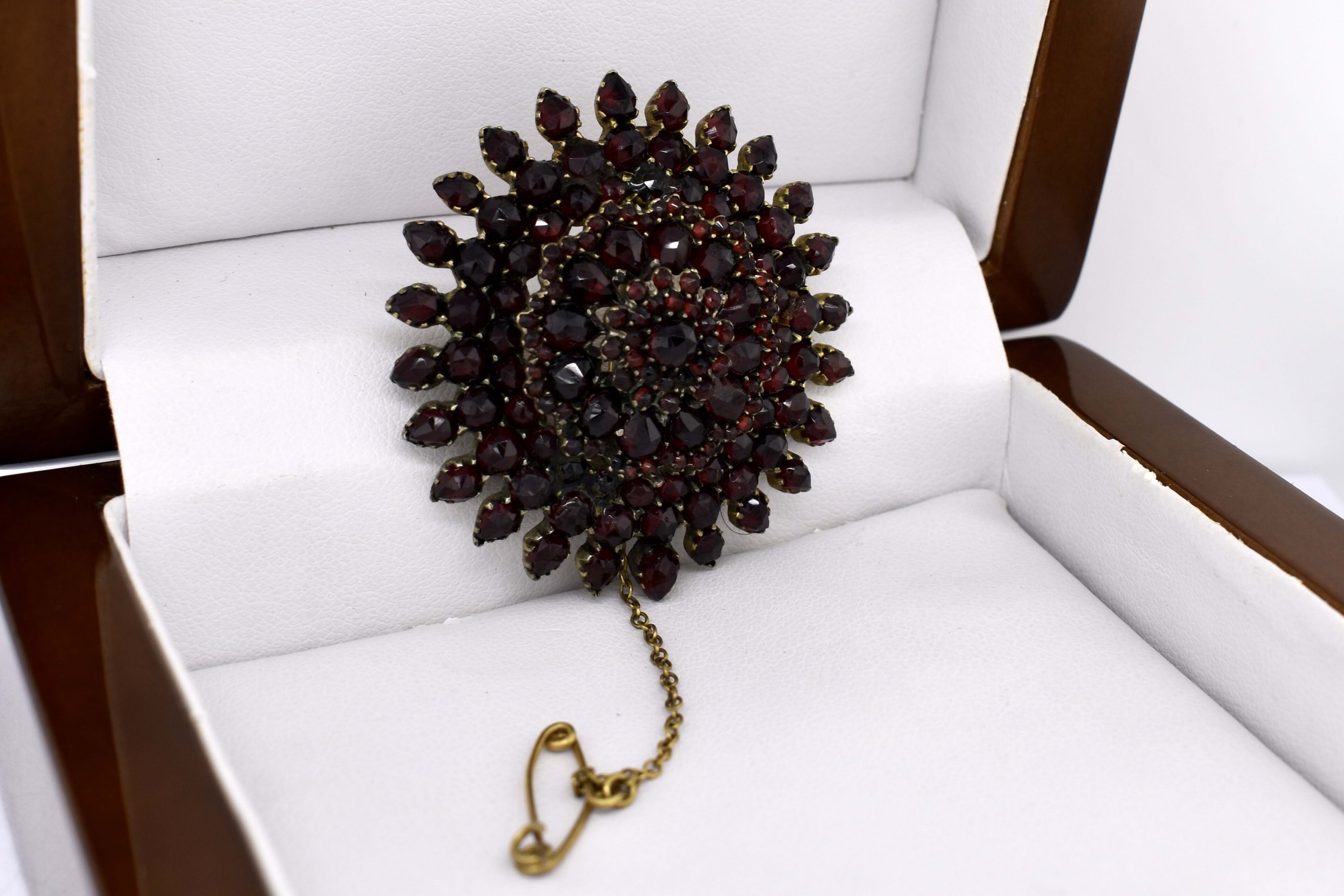 Amazing cluster brooch, crafted in gold gilt, featuring a cluster of bohemian garnets. Brooch measures 16mm spread and is completed with a safety chain. Dated circa 1870s.