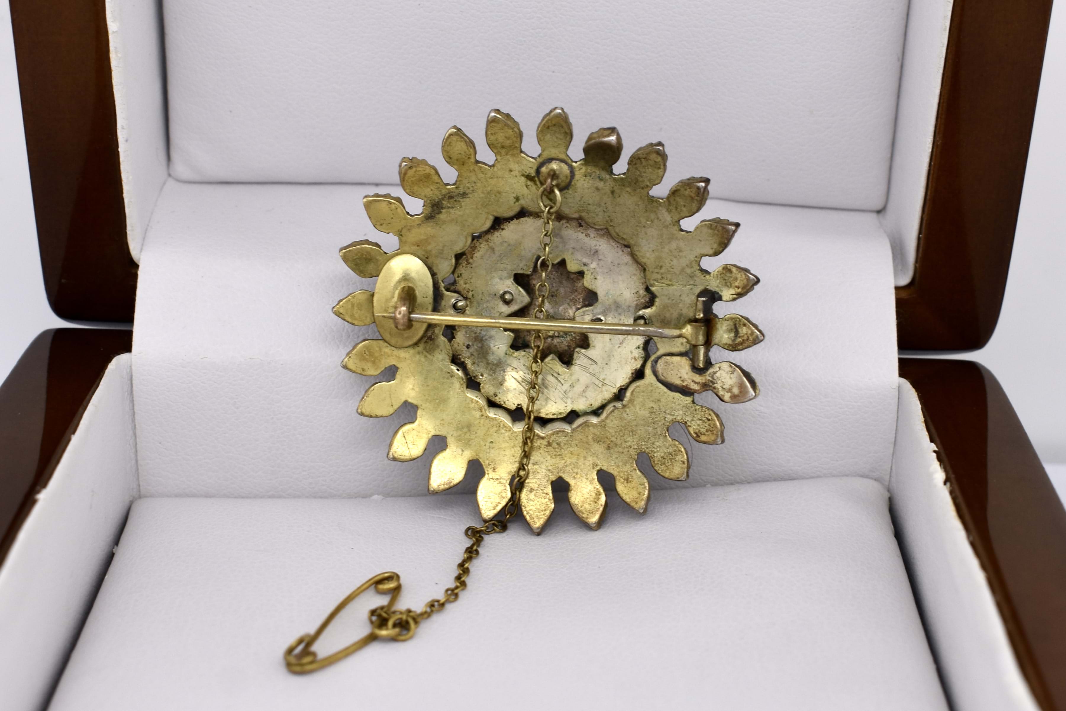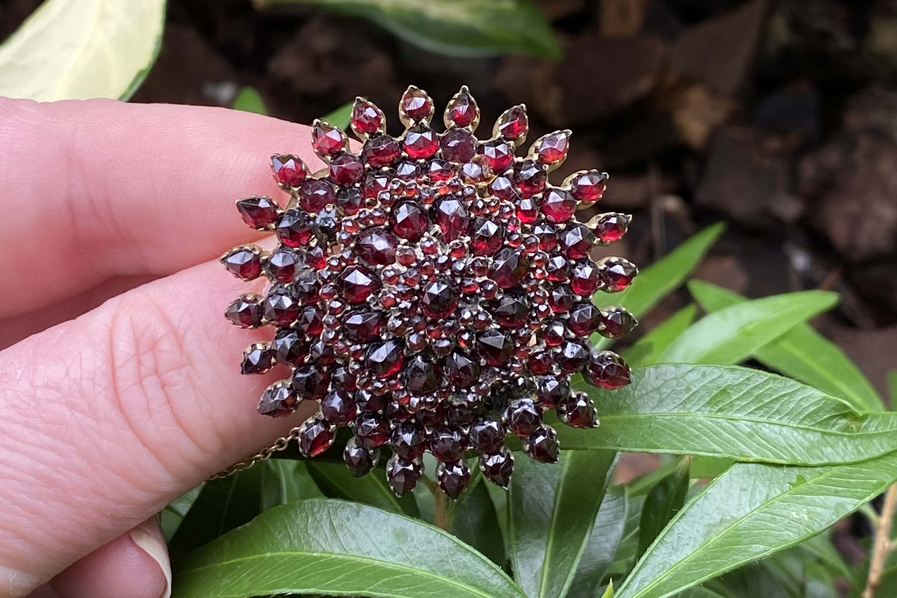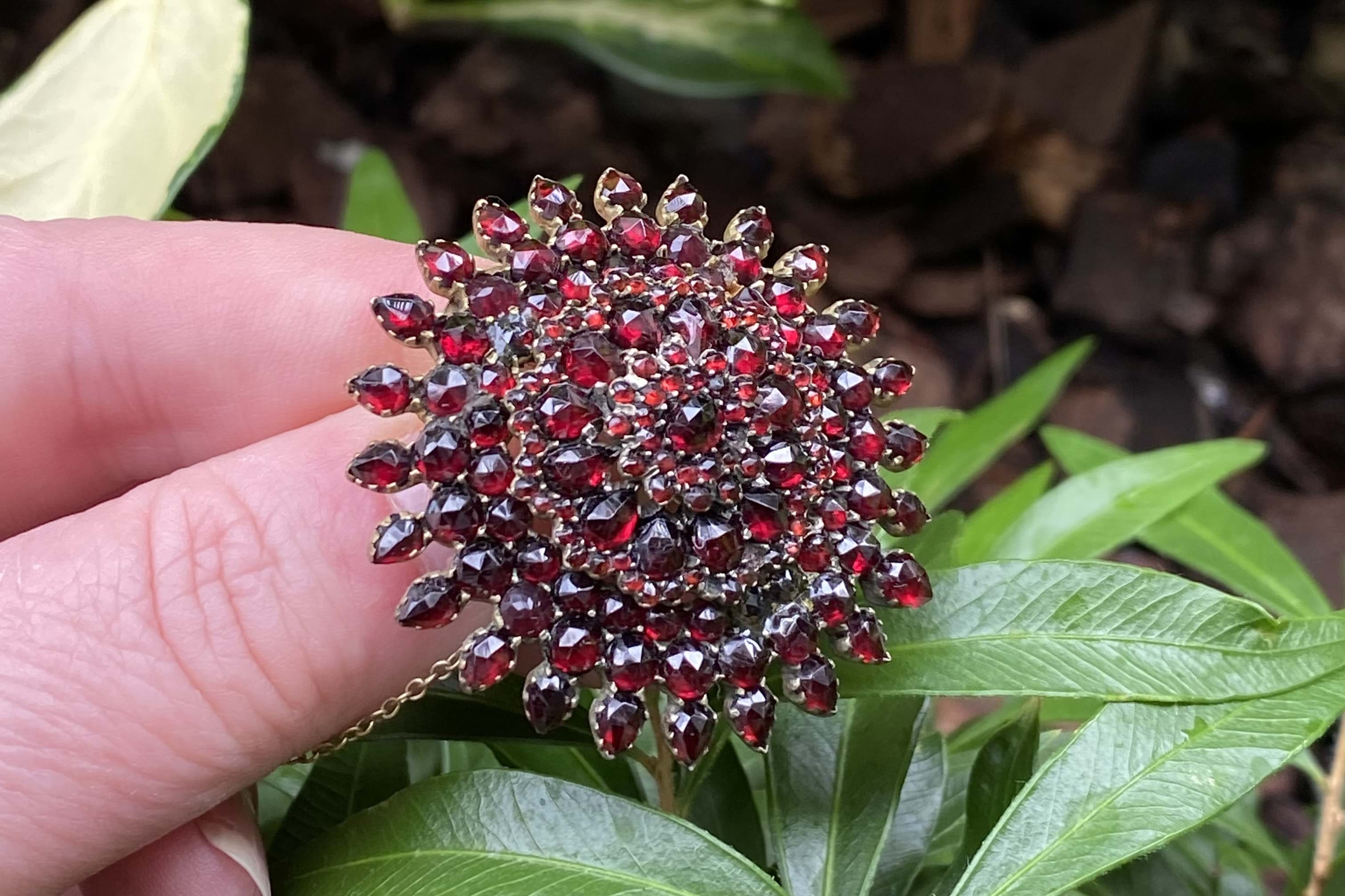 Amazing cluster brooch, crafted in gold gilt, featuring a cluster of bohemian garnets. Brooch measures 16mm spread and is completed with a safety chain. Dated circa 1870s.