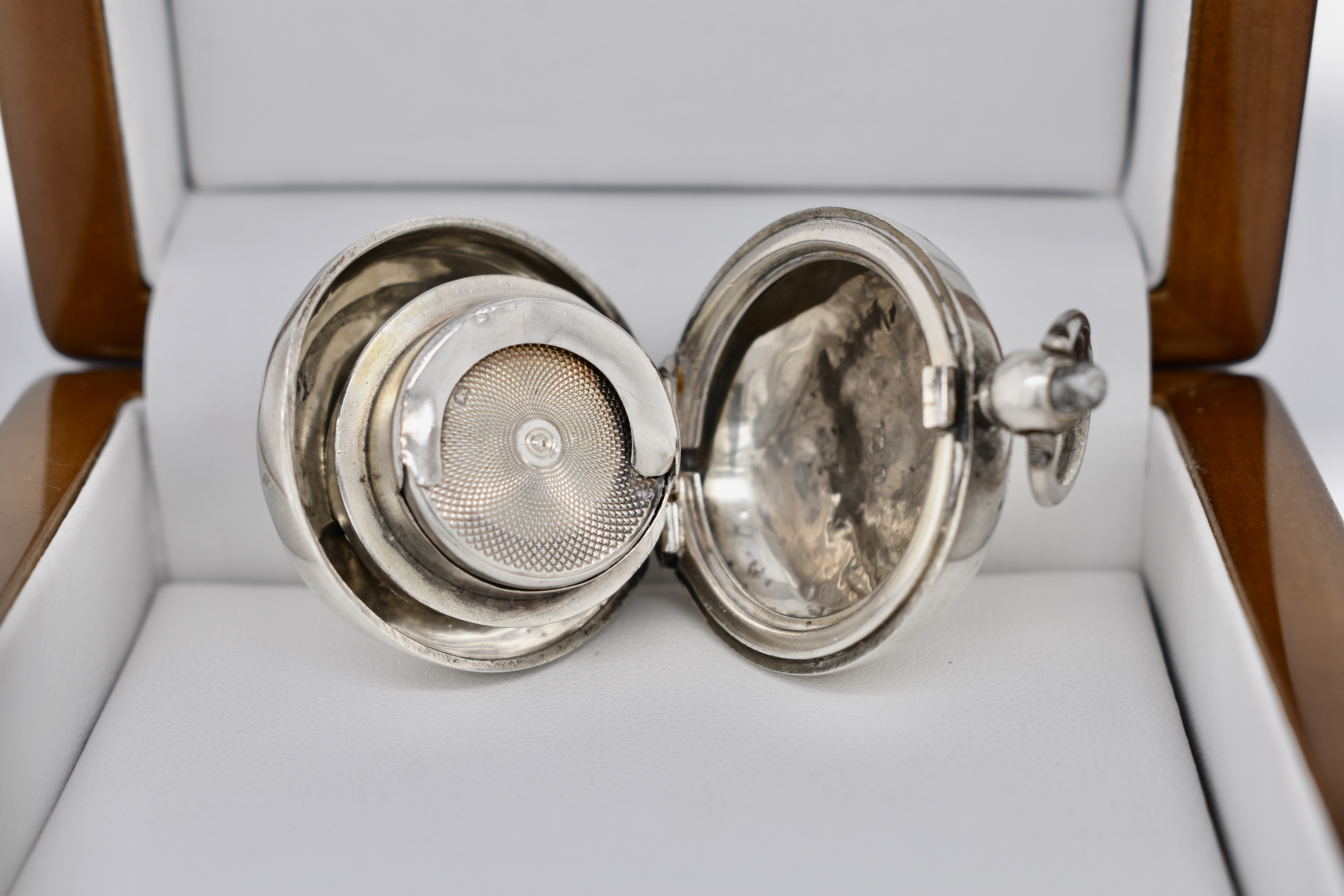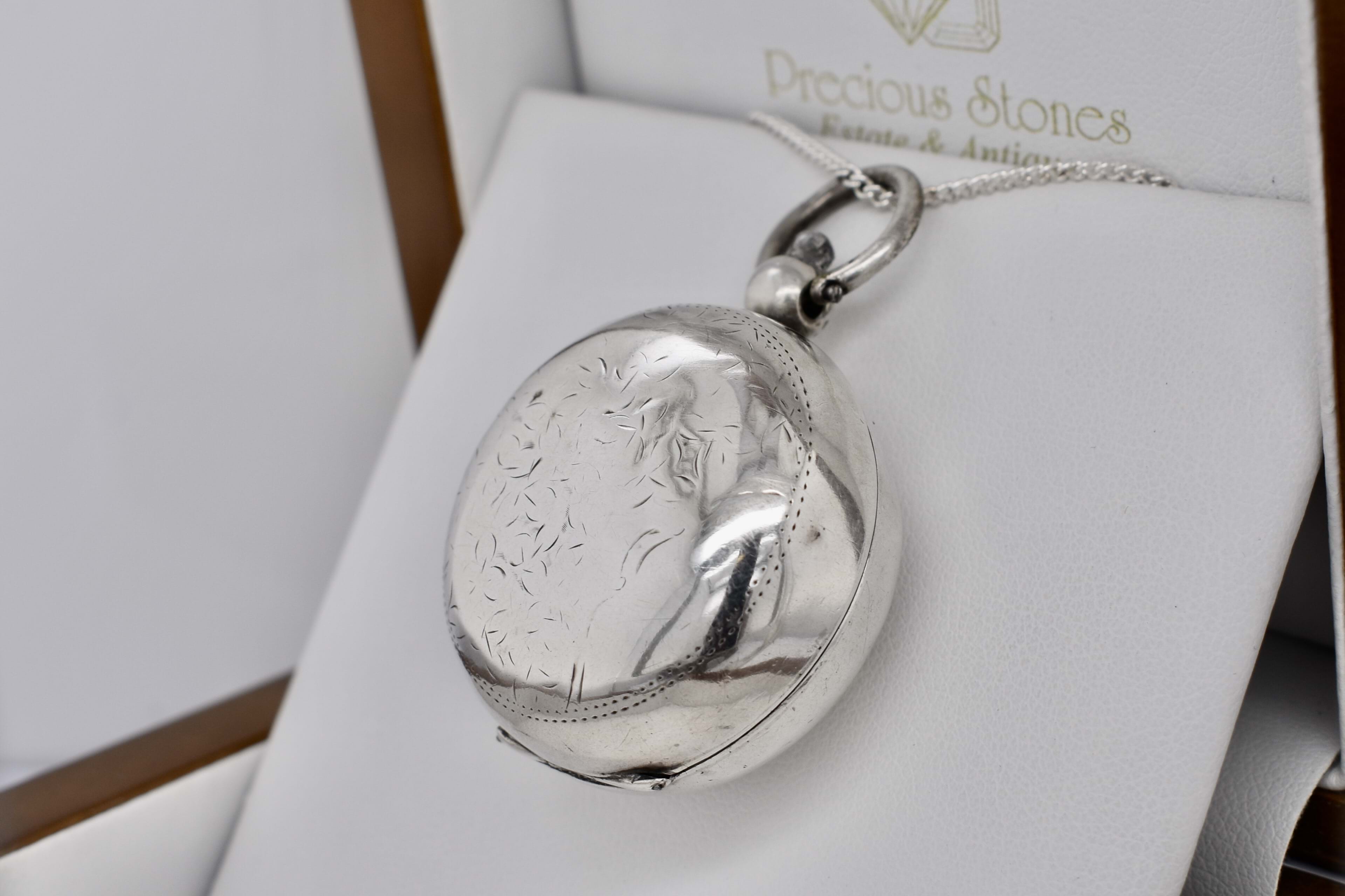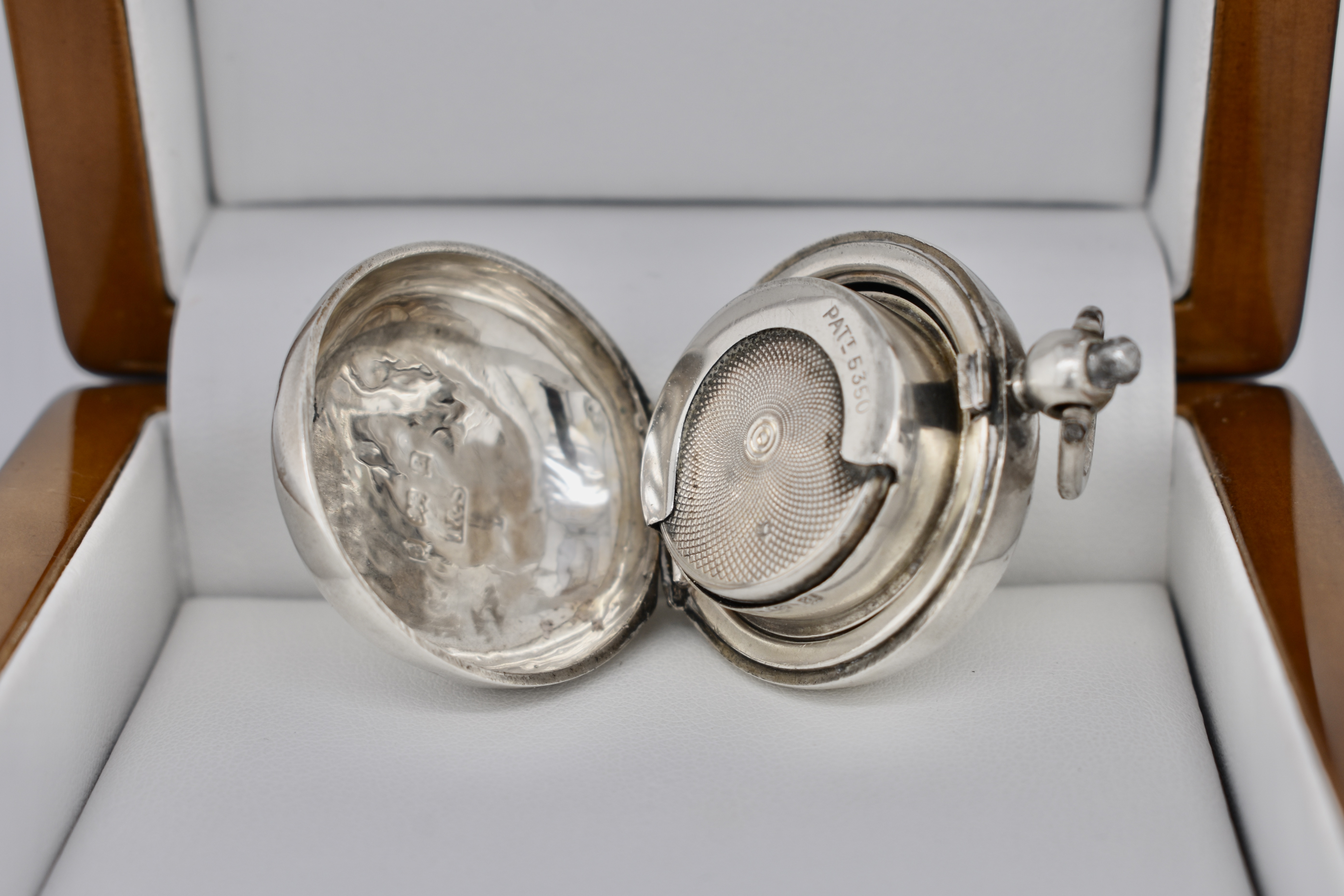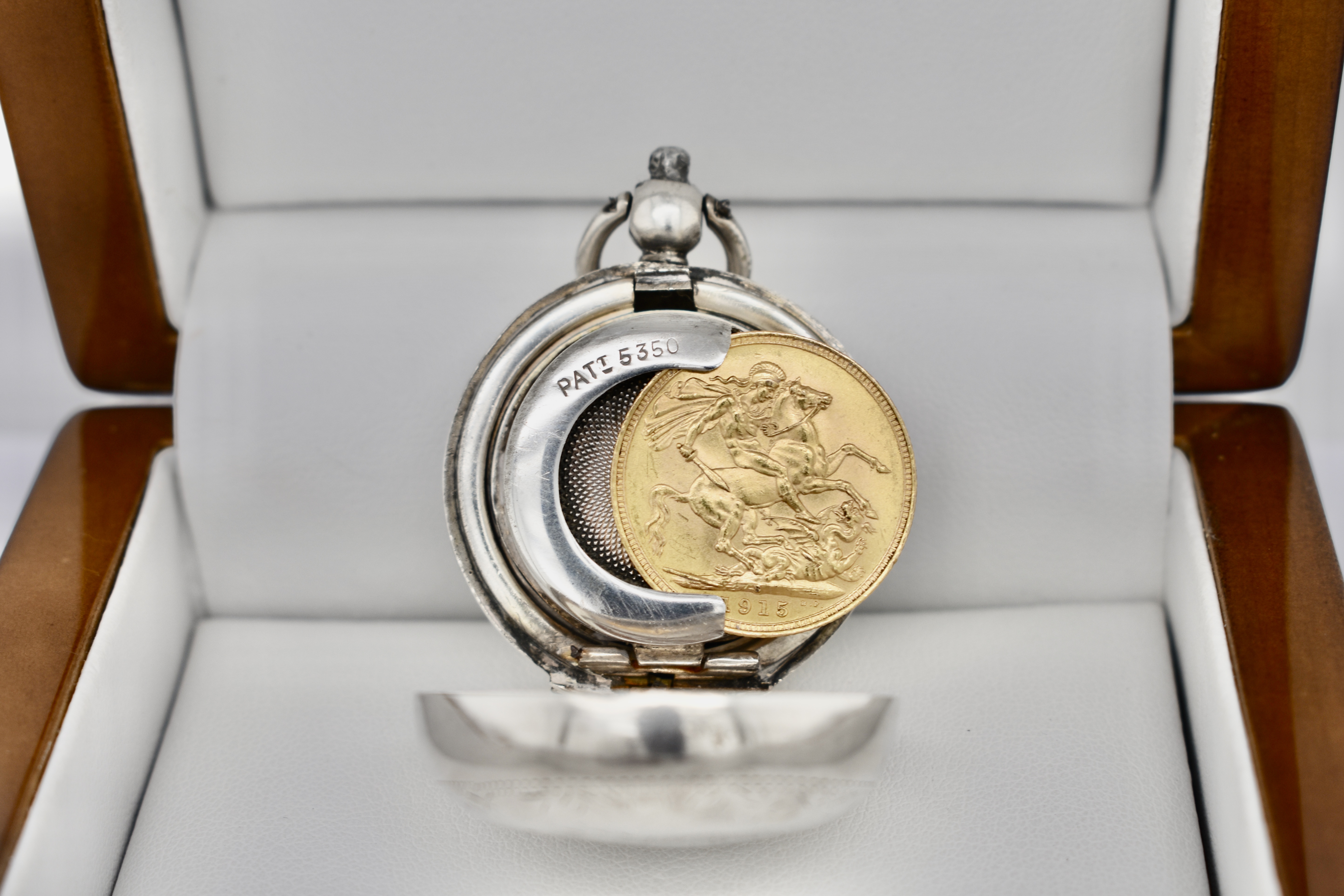 A beautiful antique silver sovereign coin case which is hallmarked 'Birmingham 1925'. The double case is round and holds both full and half sovereign coins inside. Finished with a ring styled loop and push button.