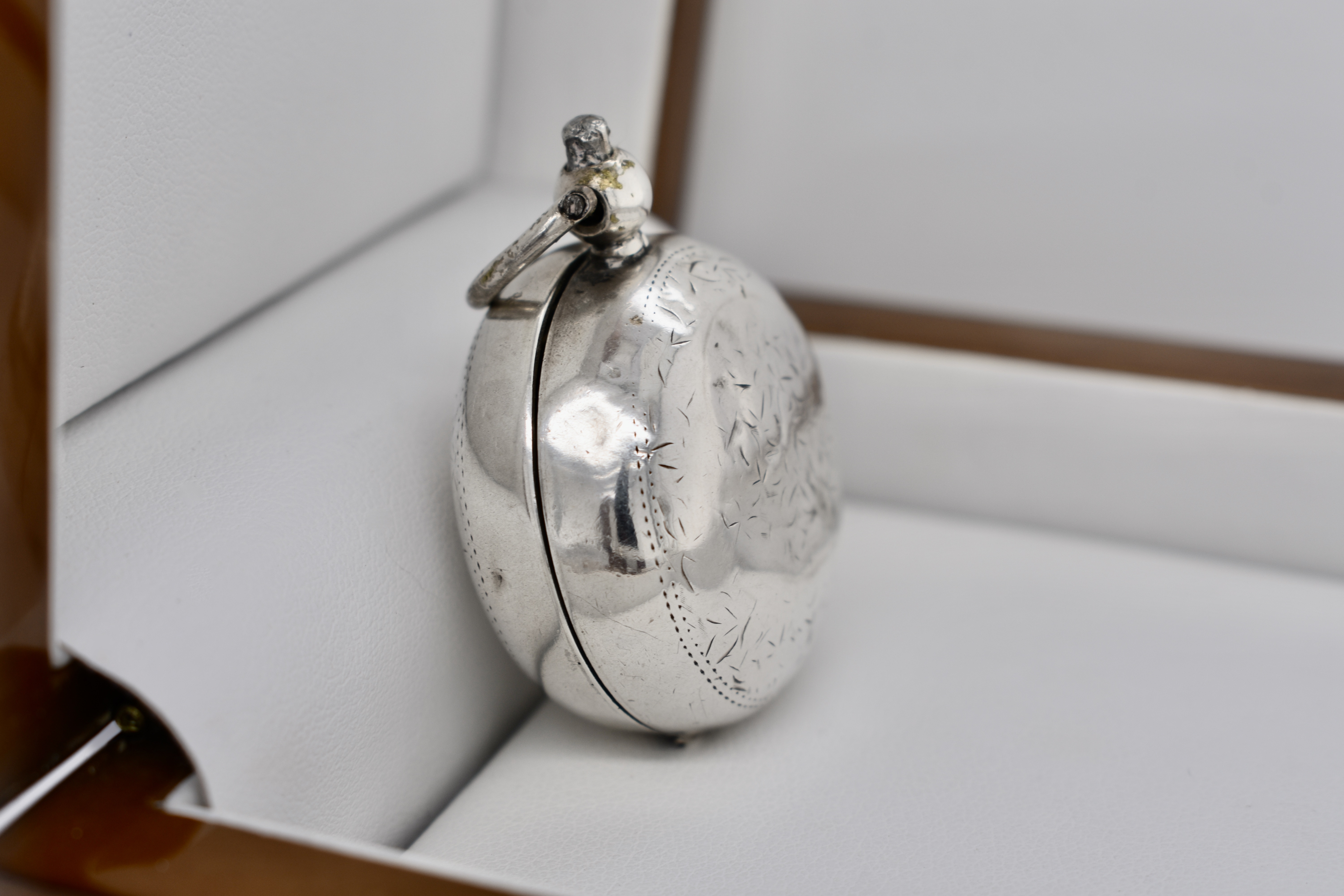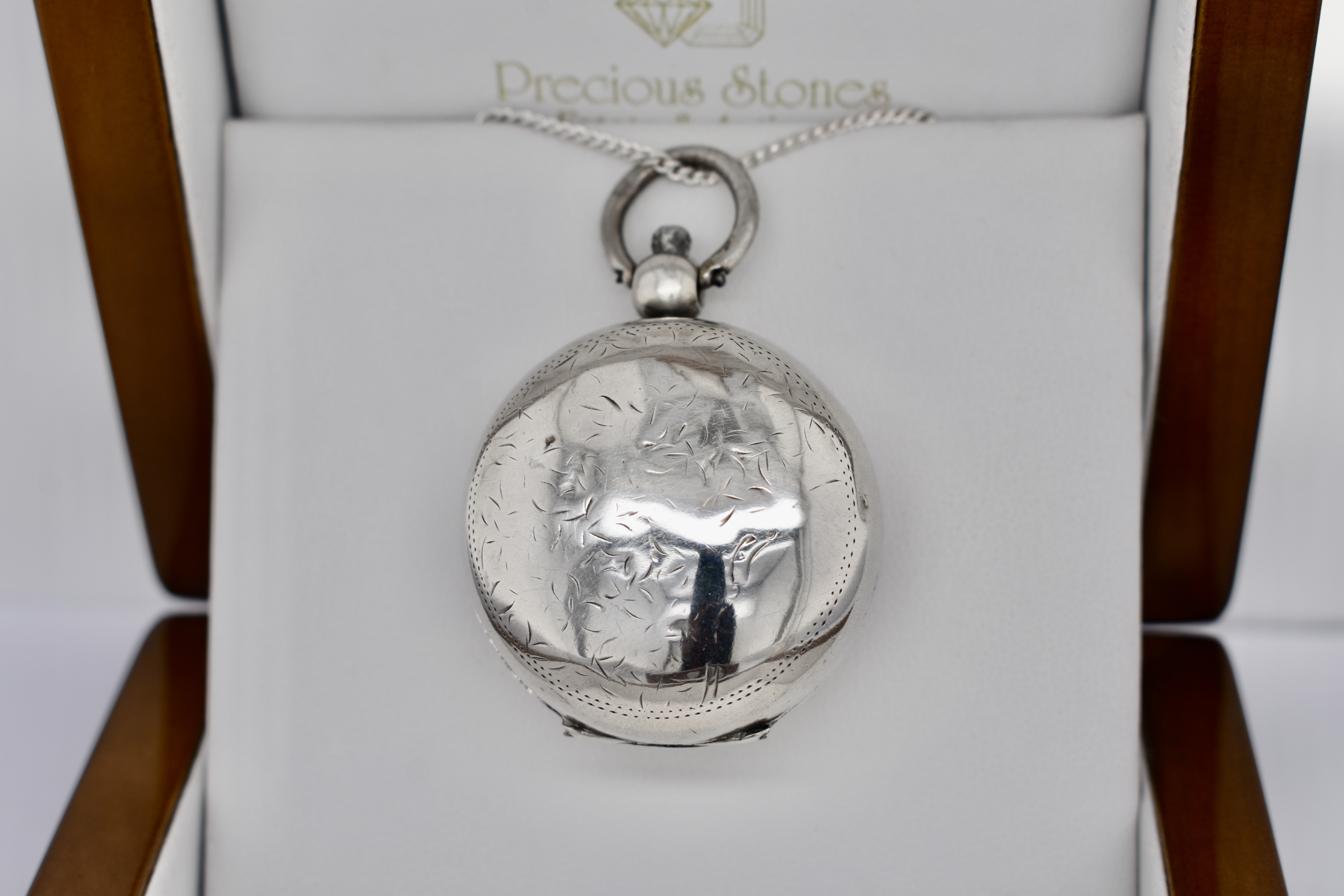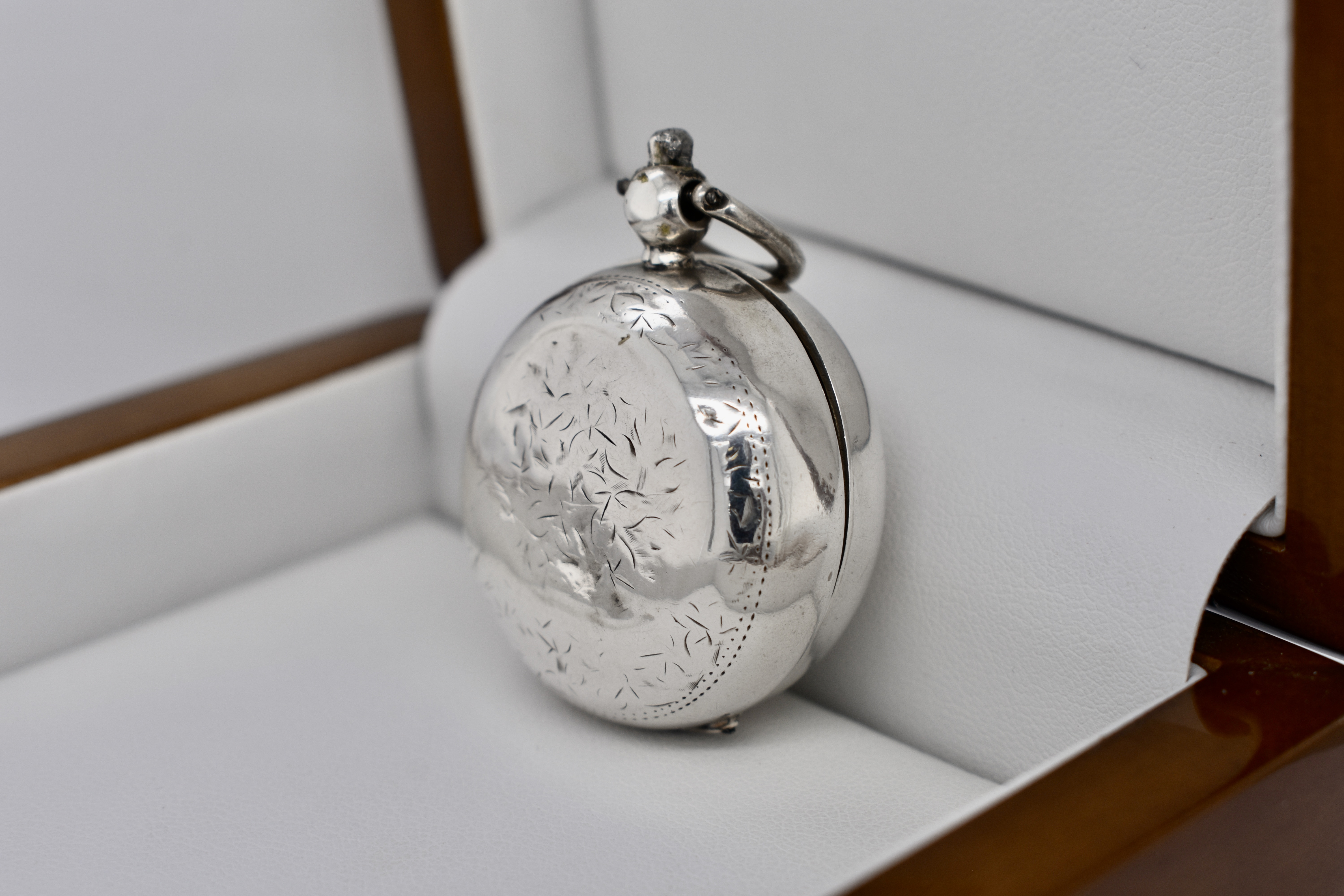 A beautiful antique silver sovereign coin case which is hallmarked 'Birmingham 1925'. The double case is round and holds both full and half sovereign coins inside. Finished with a ring styled loop and push button.