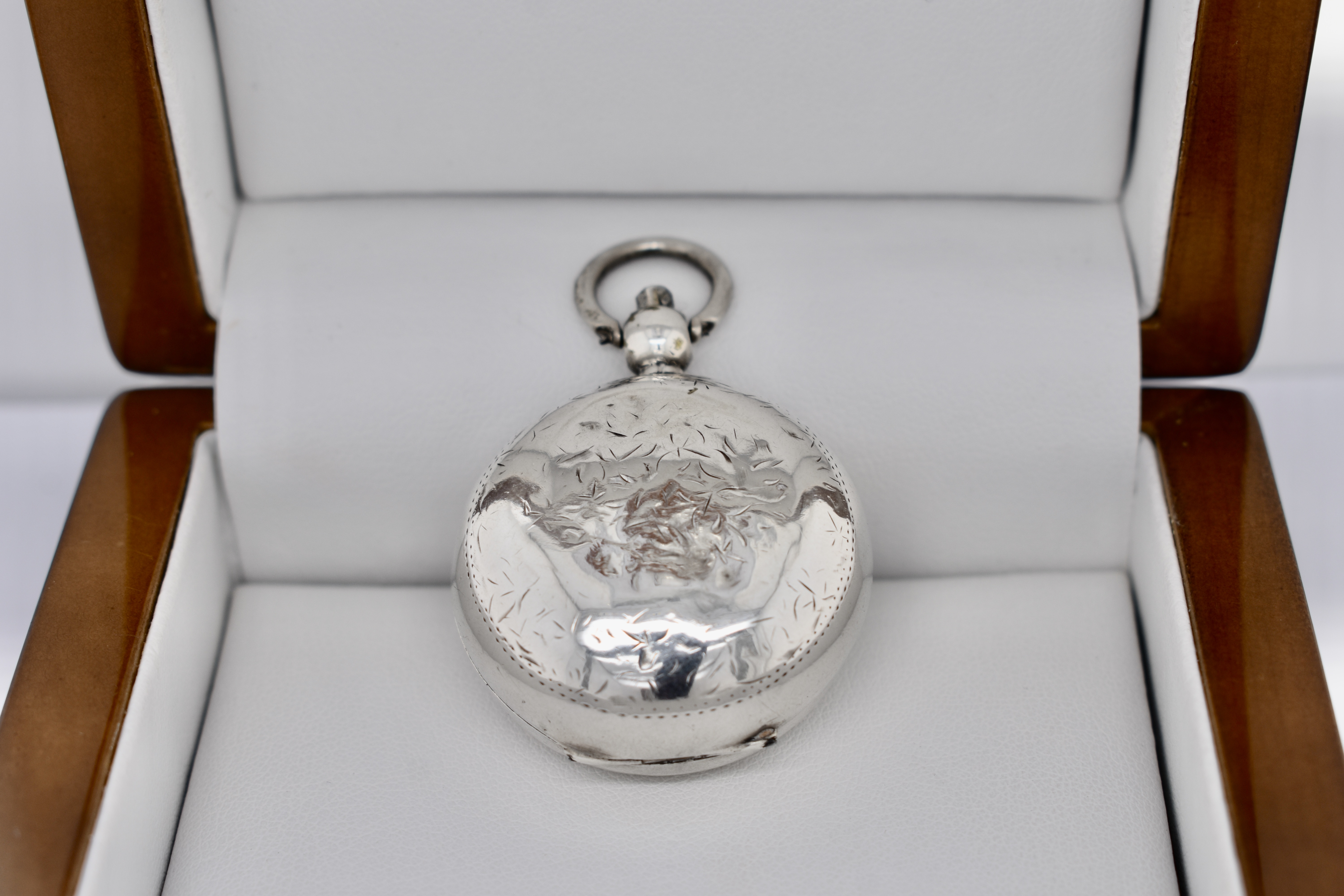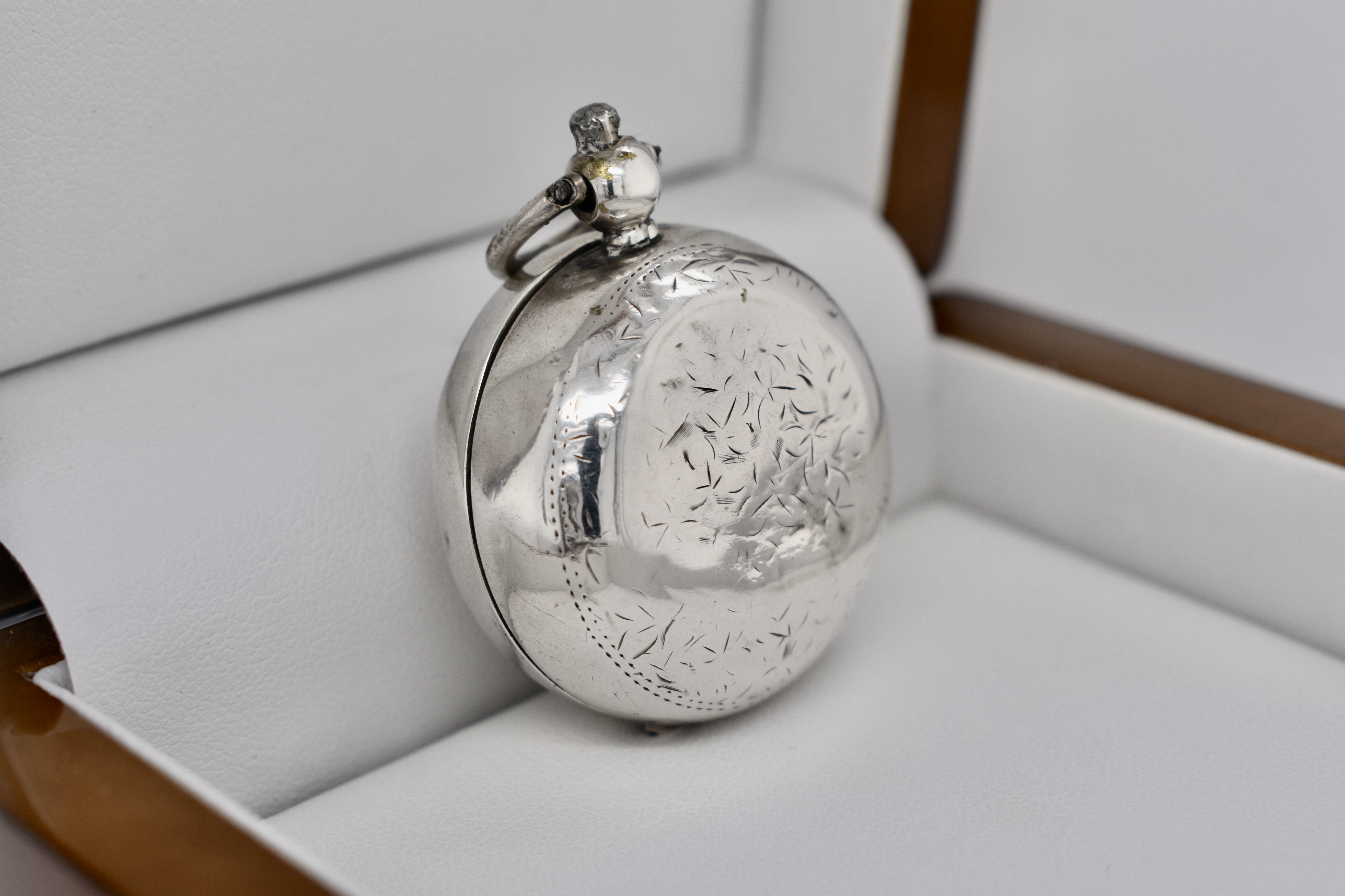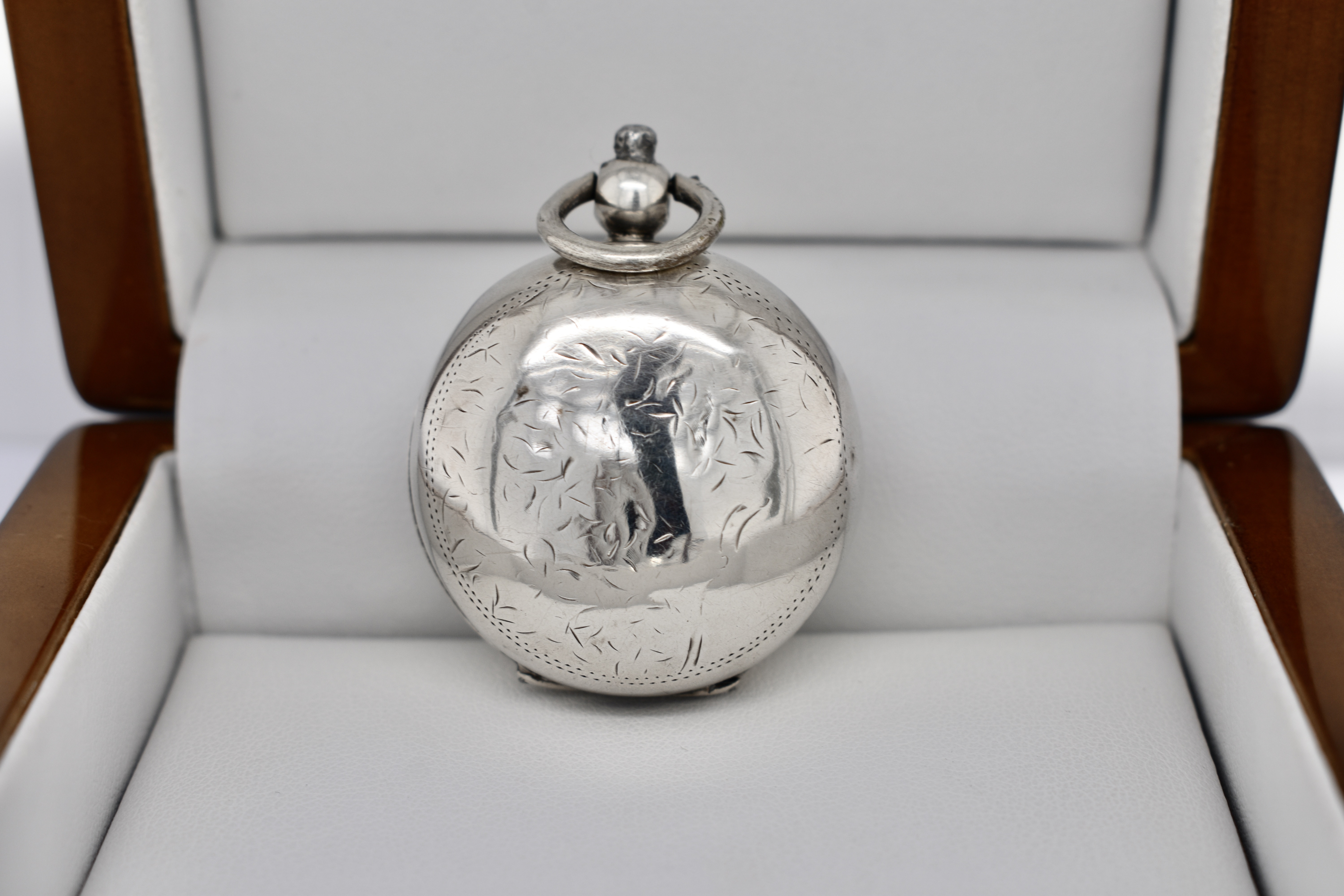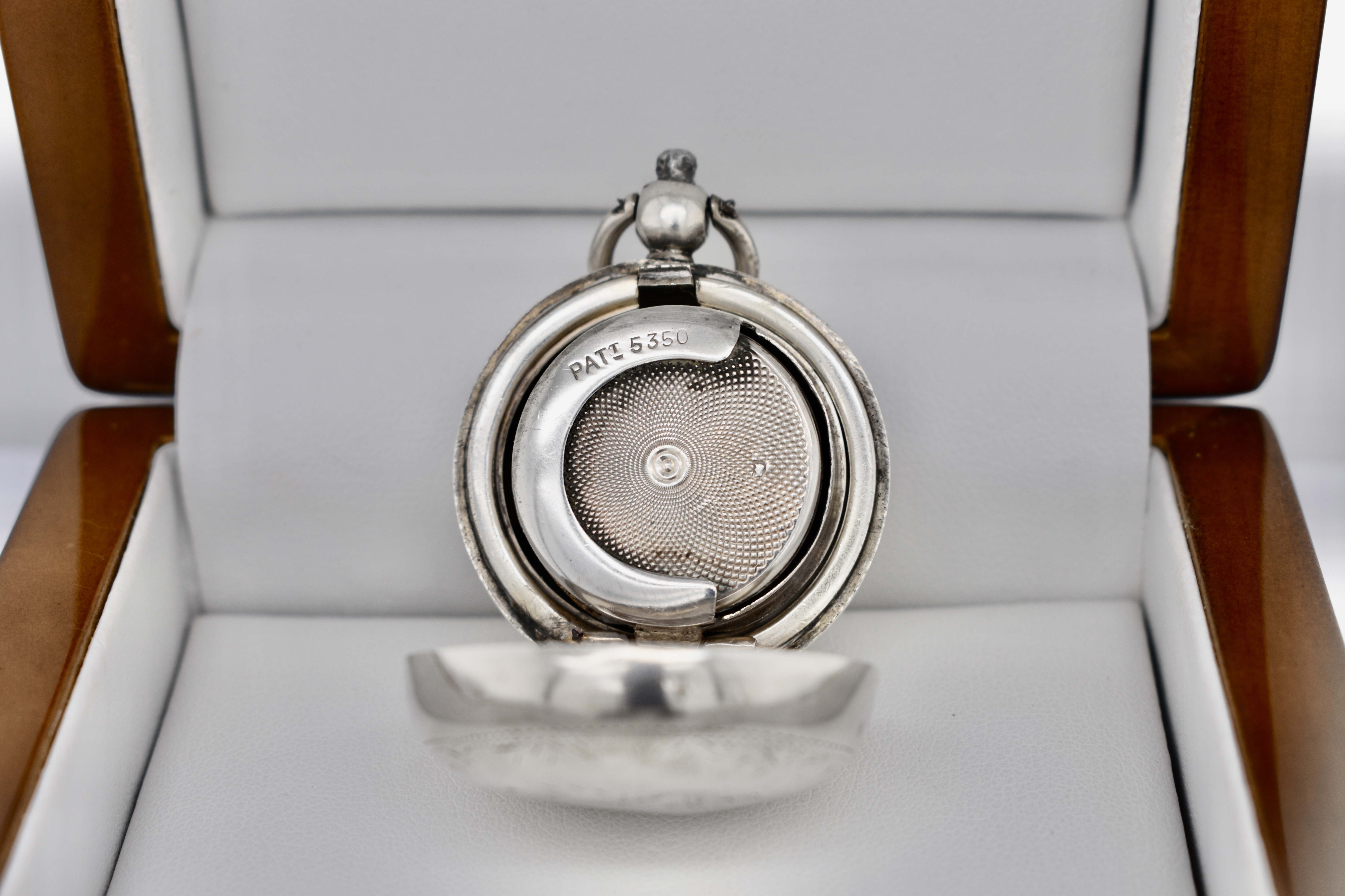 A beautiful antique silver sovereign coin case which is hallmarked 'Birmingham 1925'. The double case is round and holds both full and half sovereign coins inside. Finished with a ring styled loop and push button.