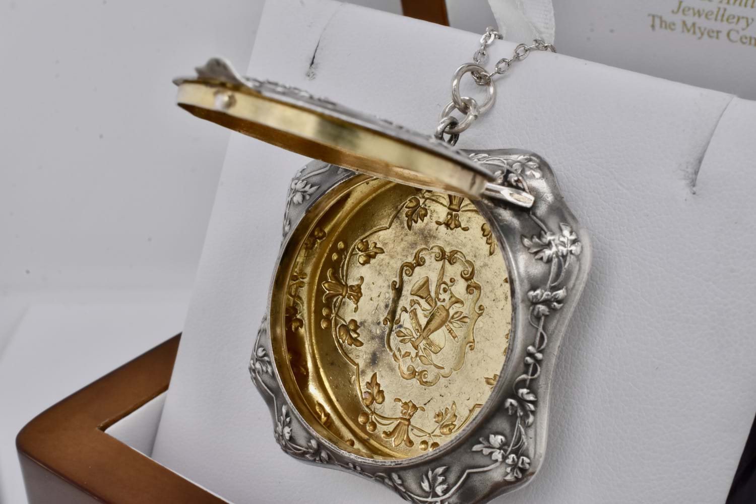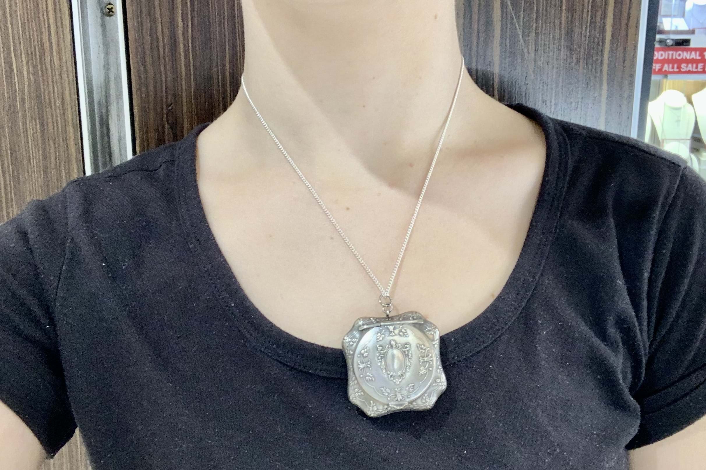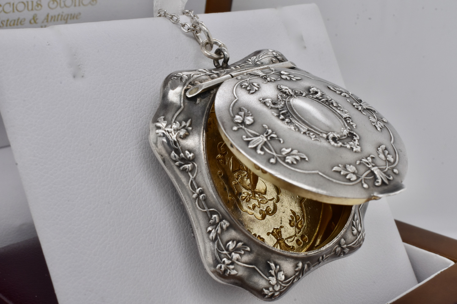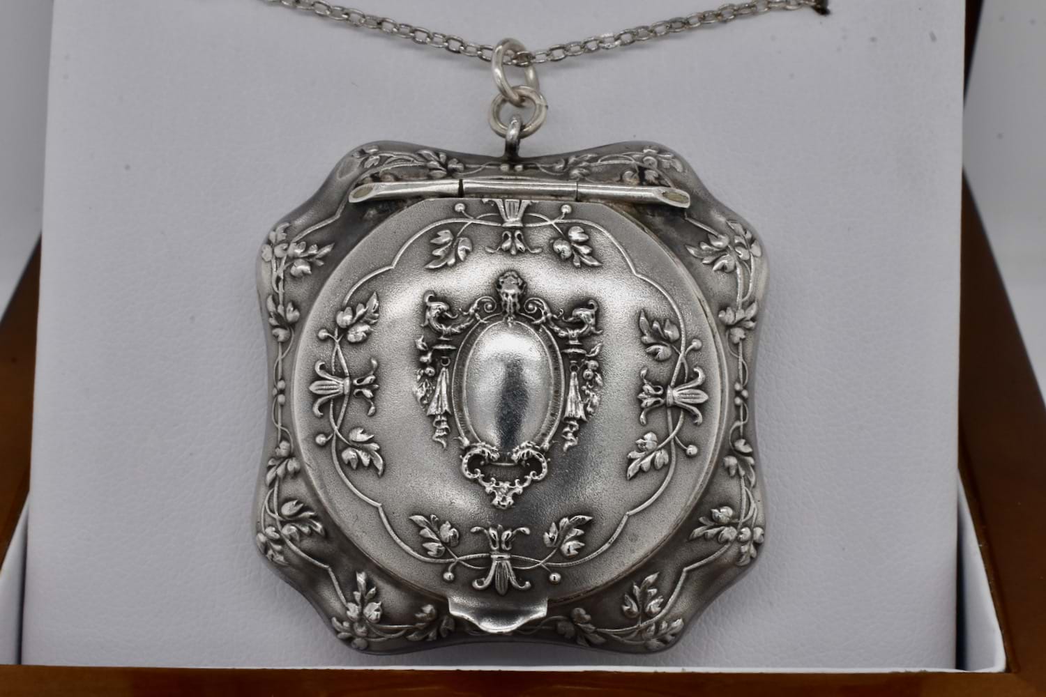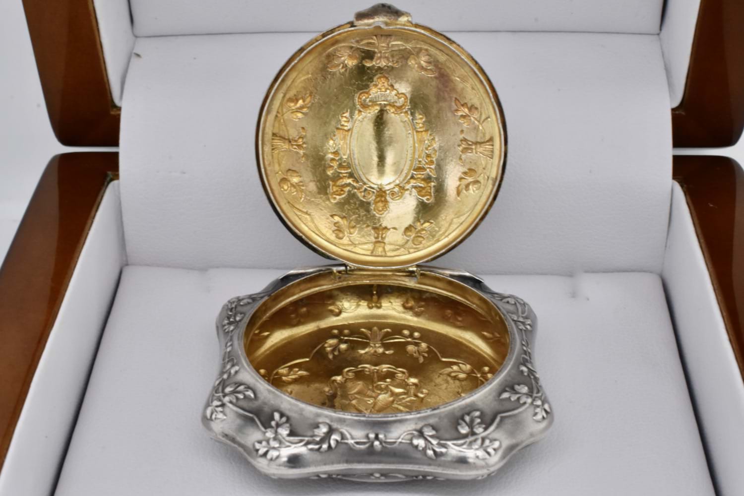 This beautiful silver and gilt Edwardian compact measures 4cm in diameter and is a scalloped edge square shape with a circular hinged lid and stunning repousse leaf and floral pattern. Dated circa 1915. Independent Valuation Supplied