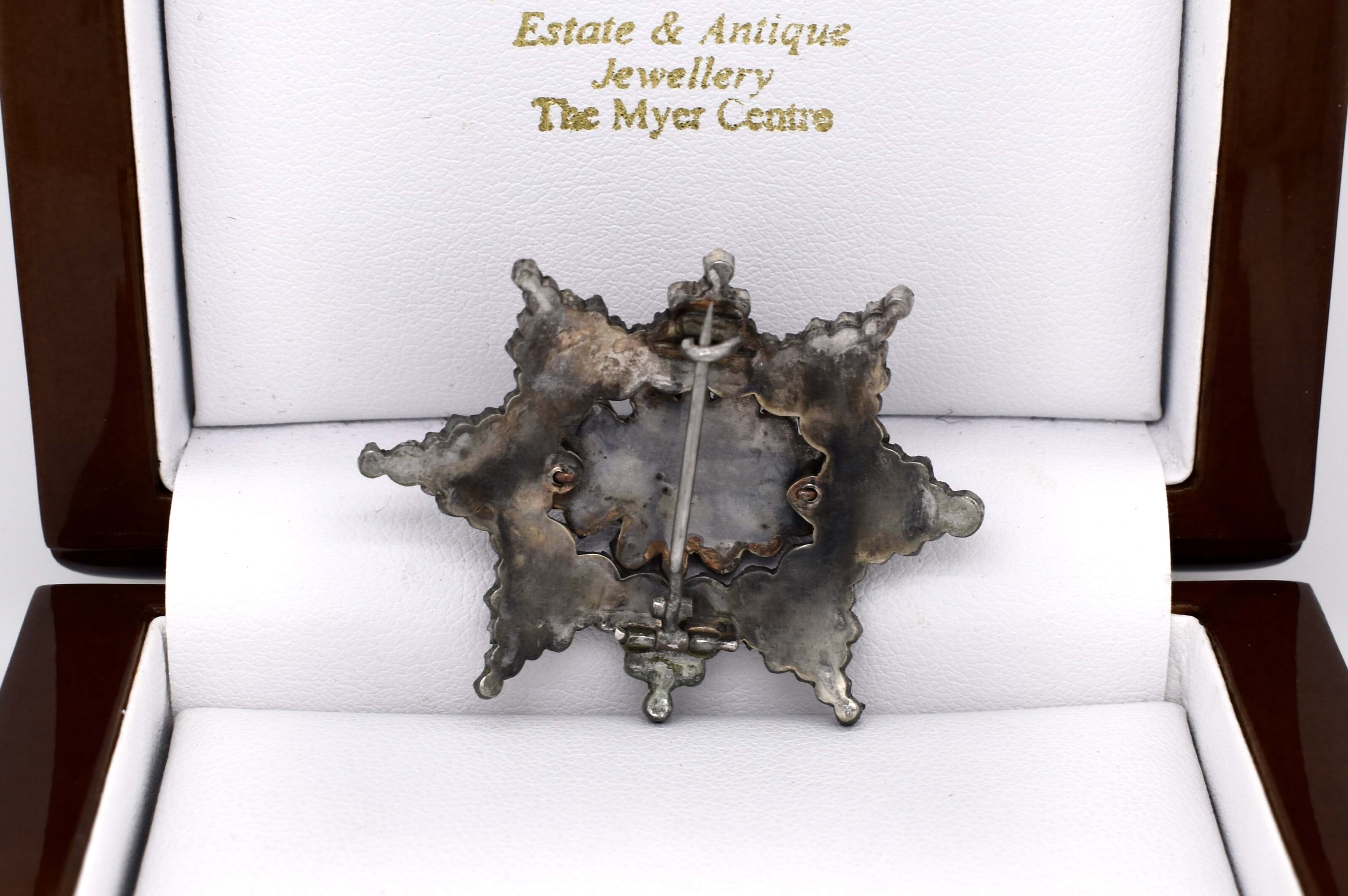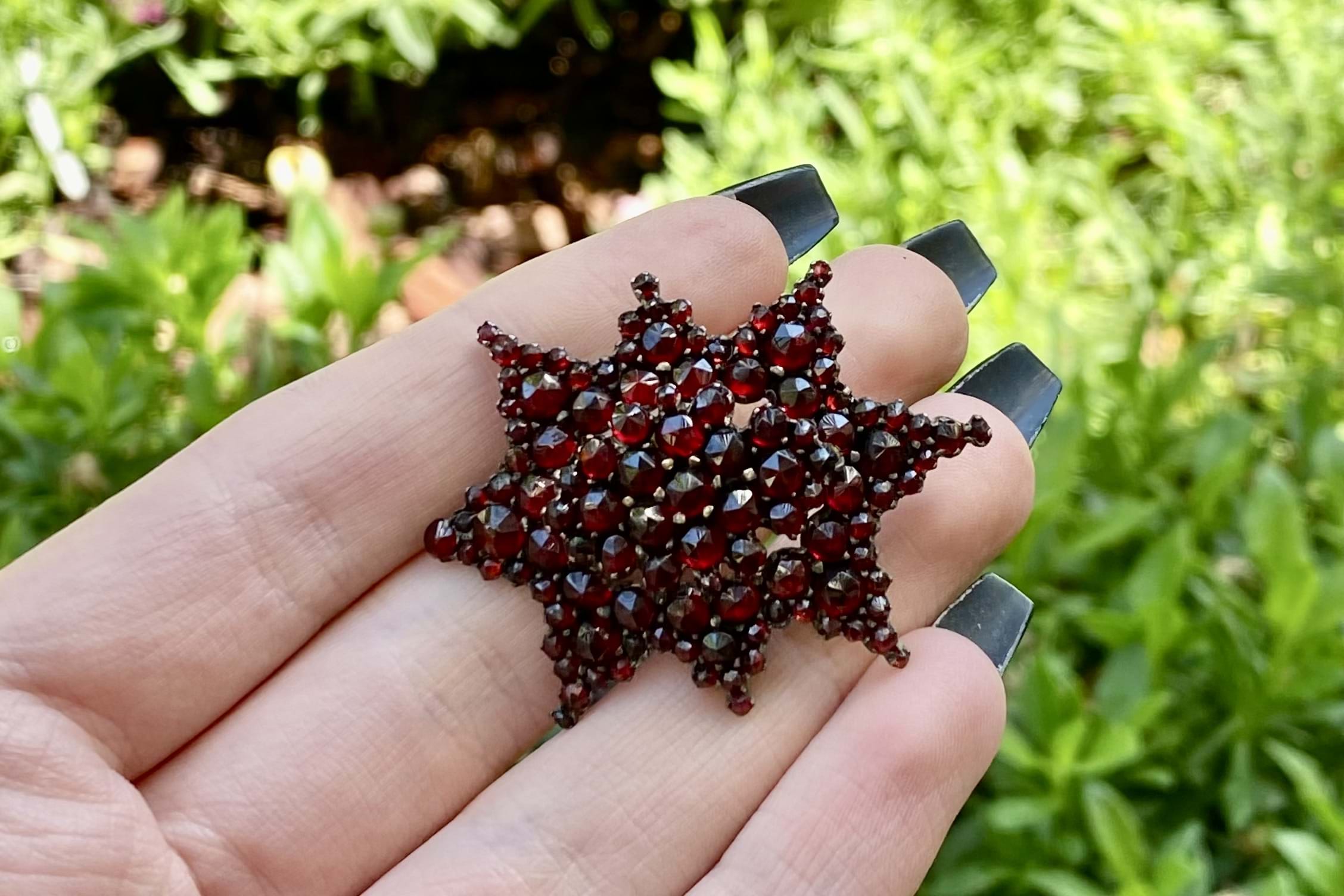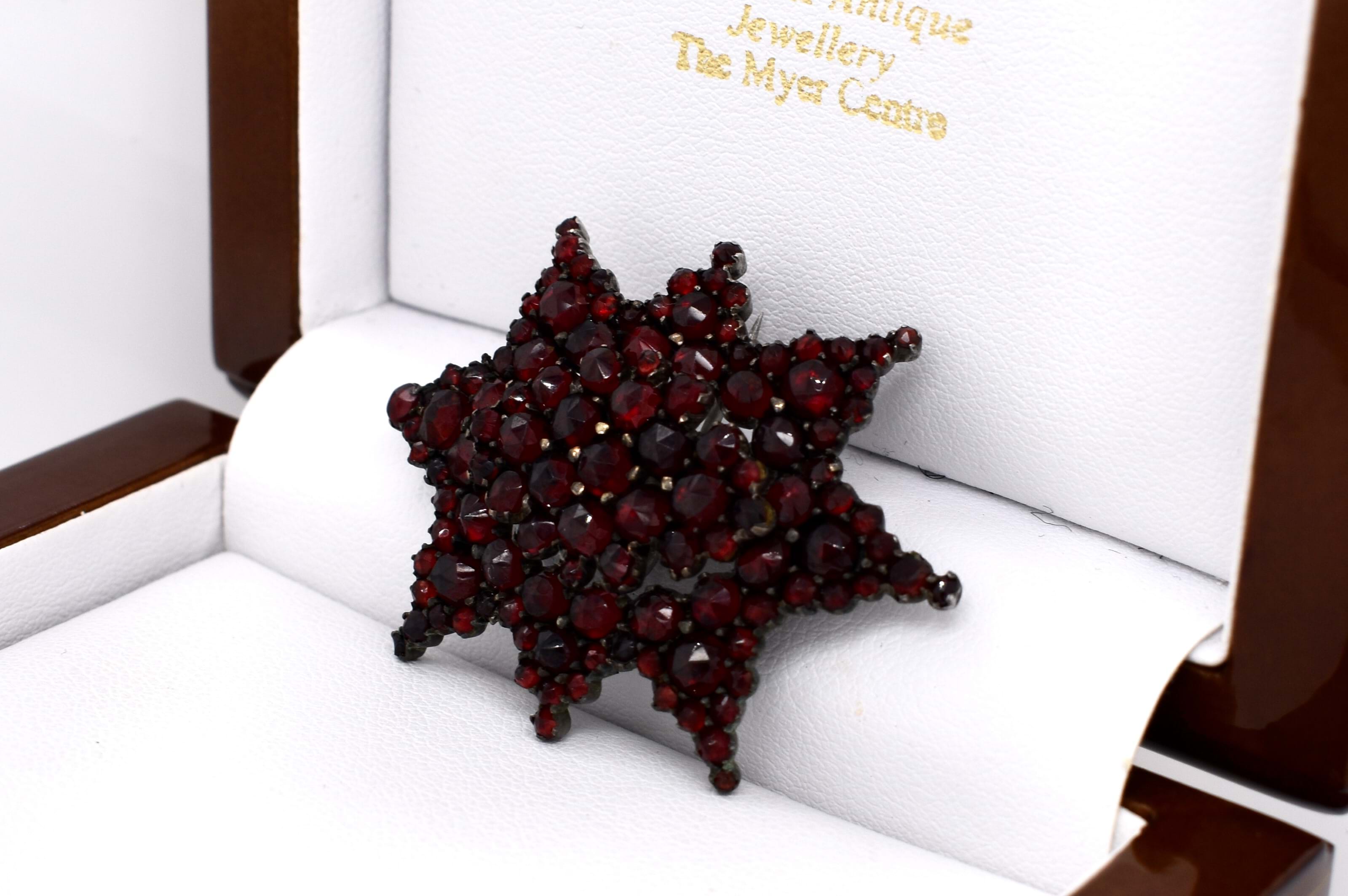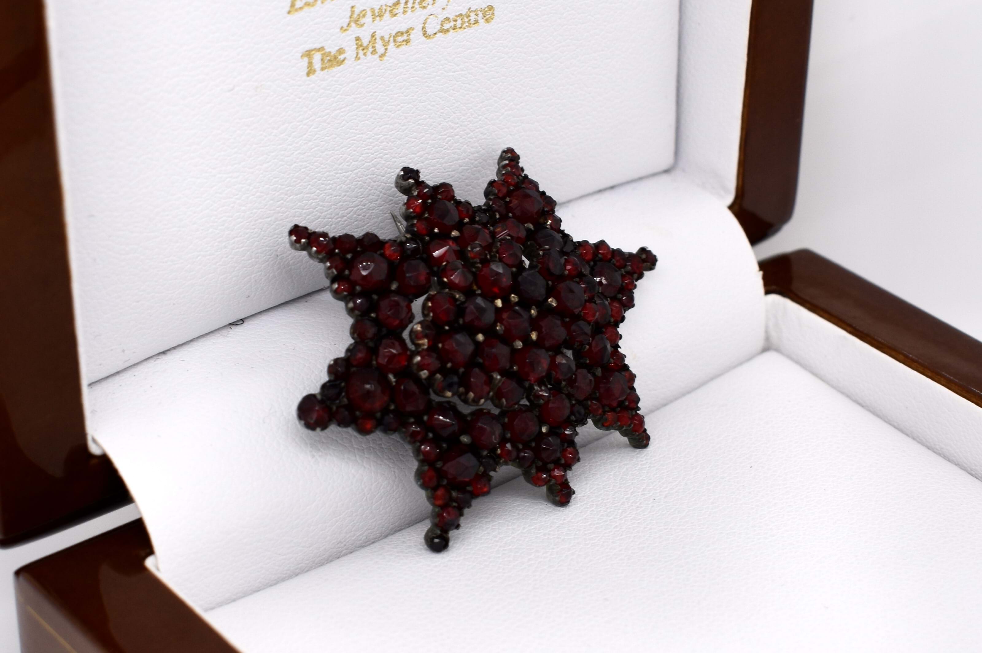 This fascinating brooch from the 1900s, consists of a large cluster of dark red bohemian garnets in a star shape. Finished with a simple brooch pin.