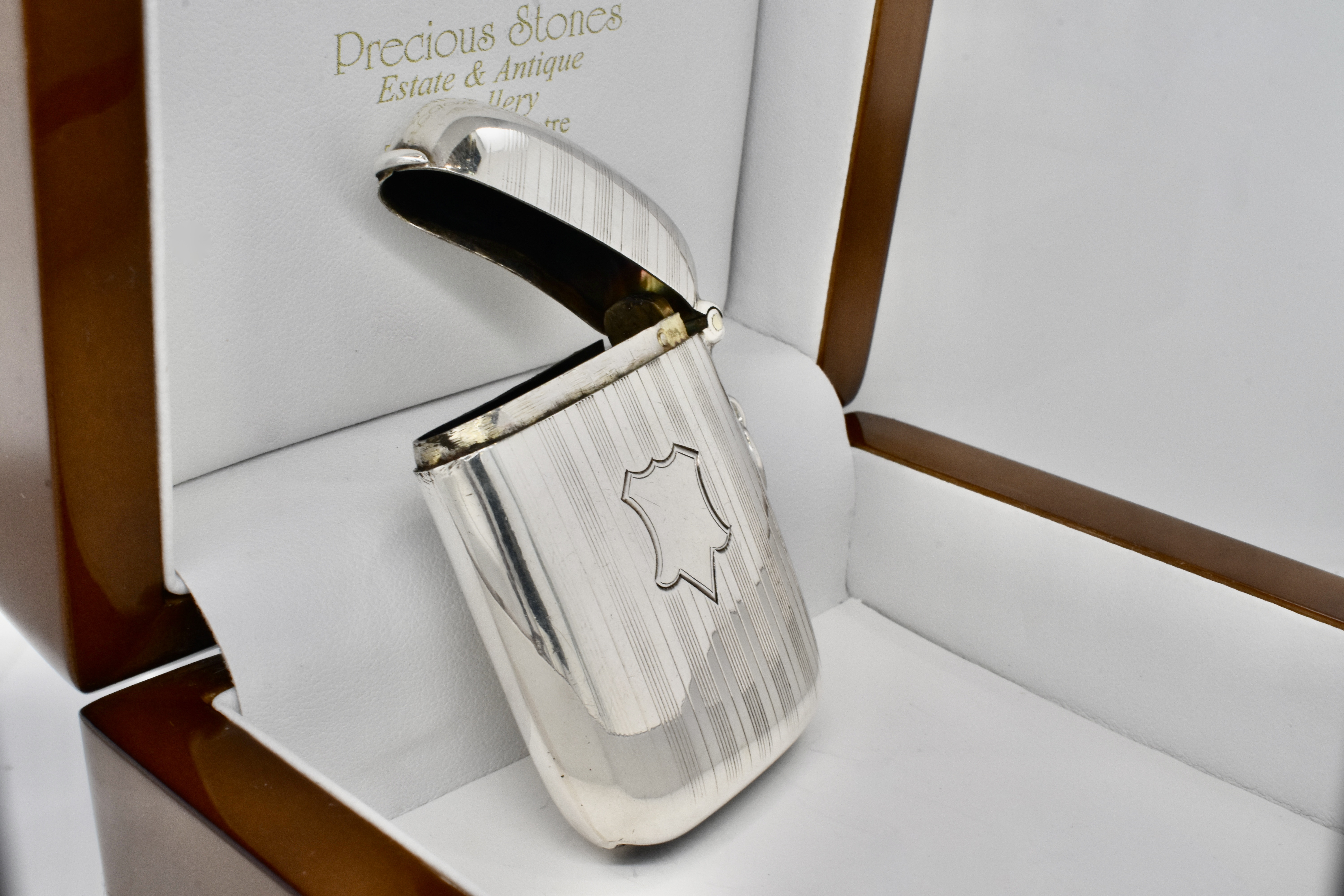 Classic and timeless sterling silver antique vesta case with pin stripe engraving a shield design on the front. The vesta is hallmarked Birmingham 1913 and measures approx. 51x38mm