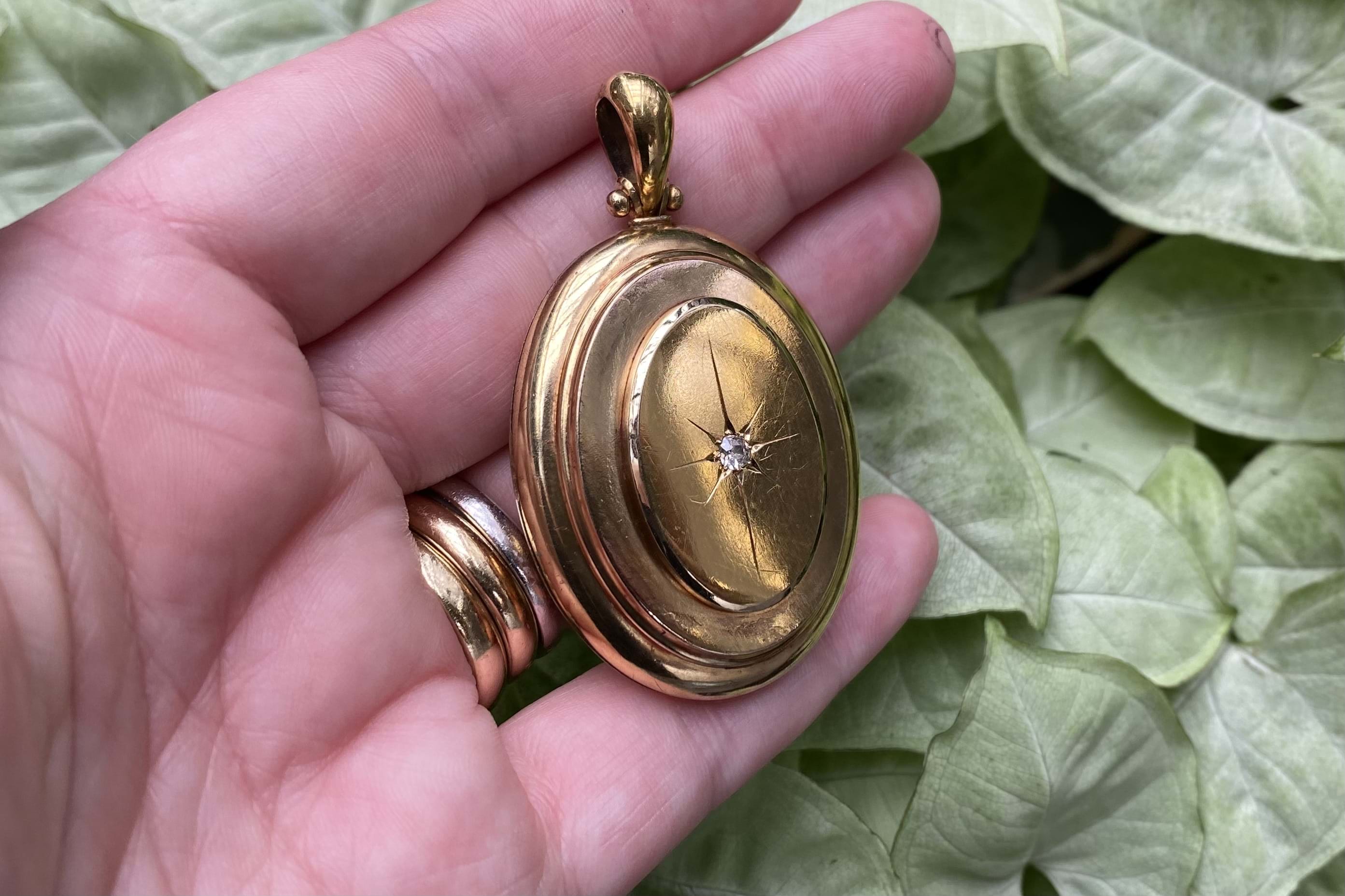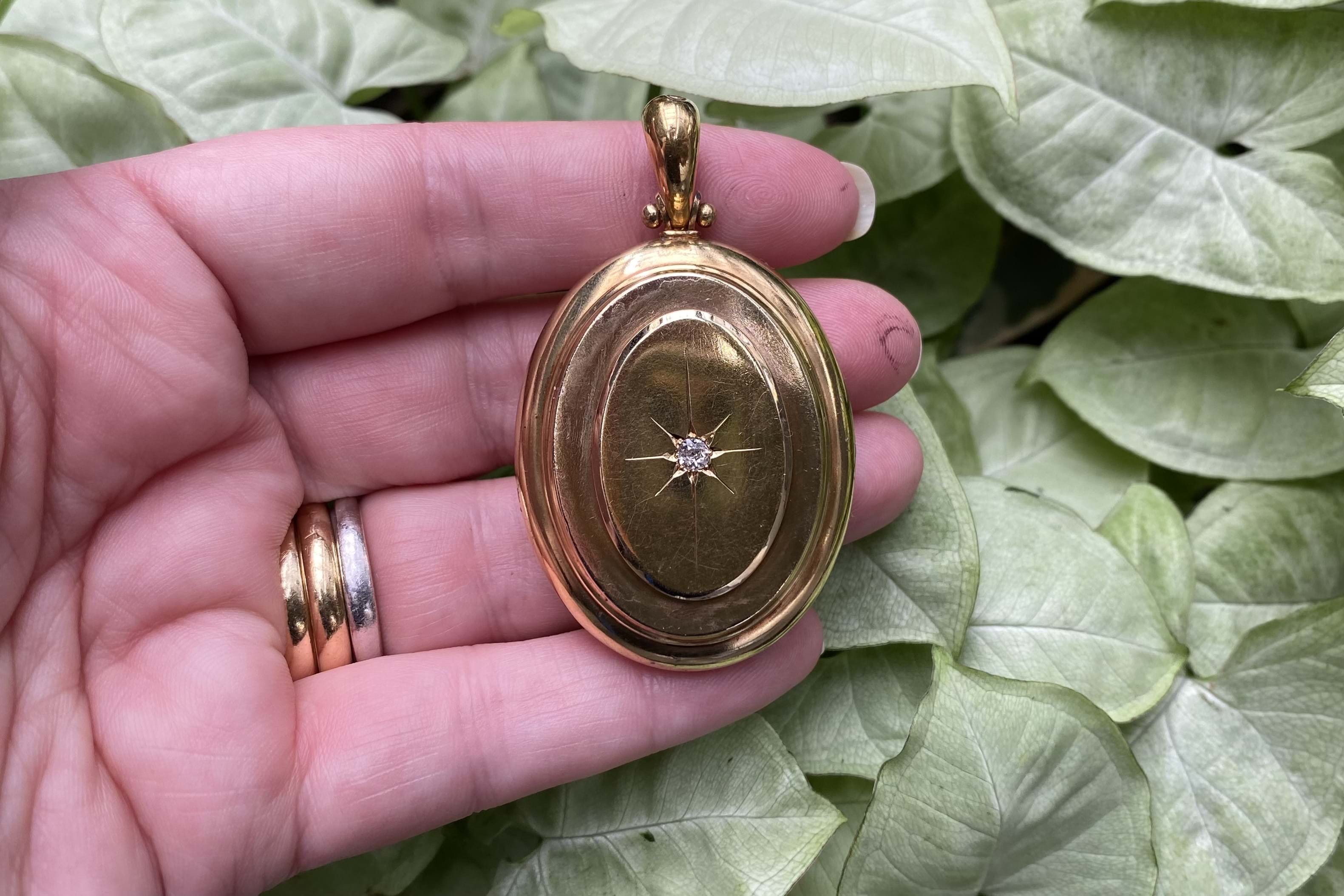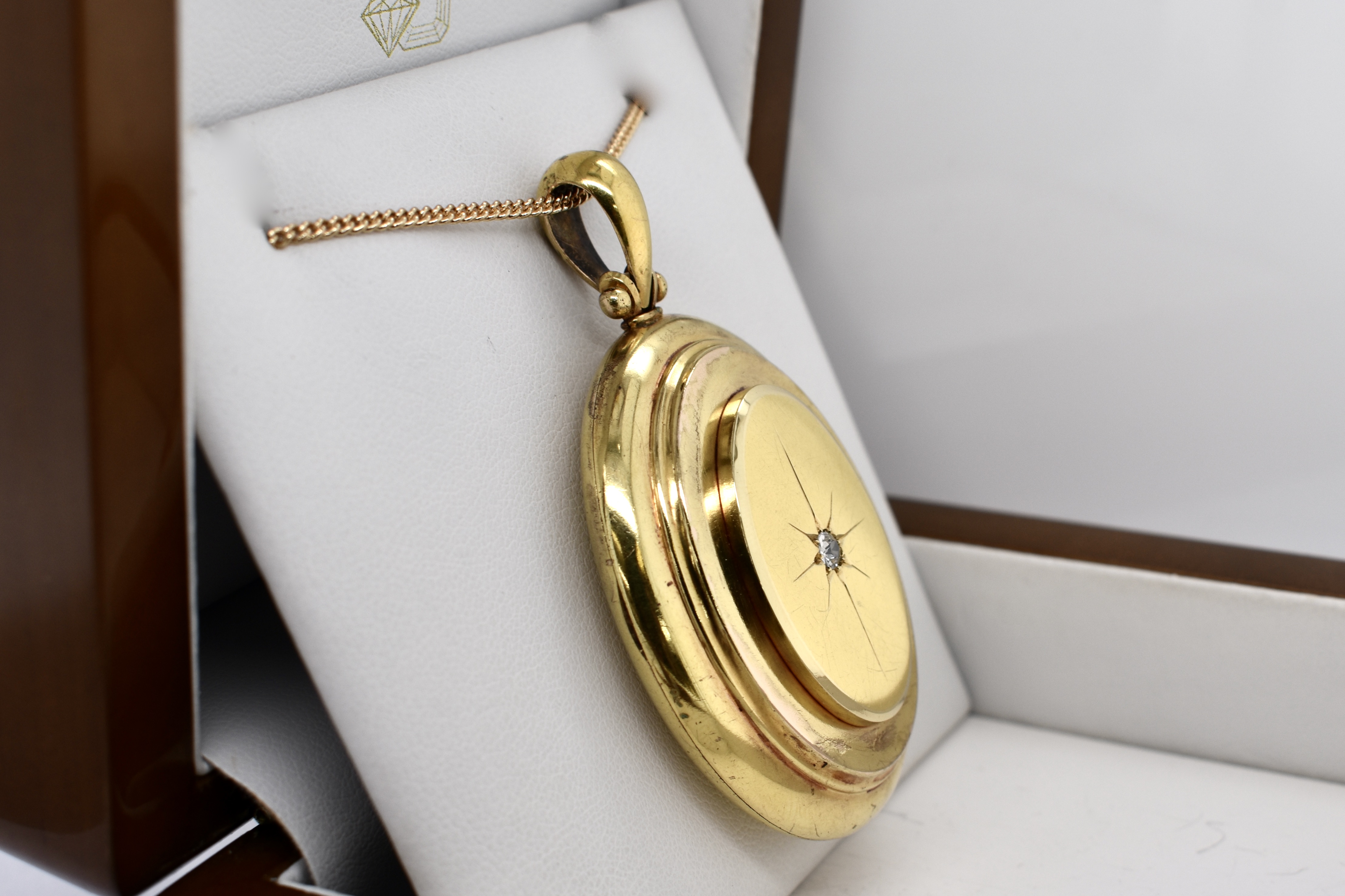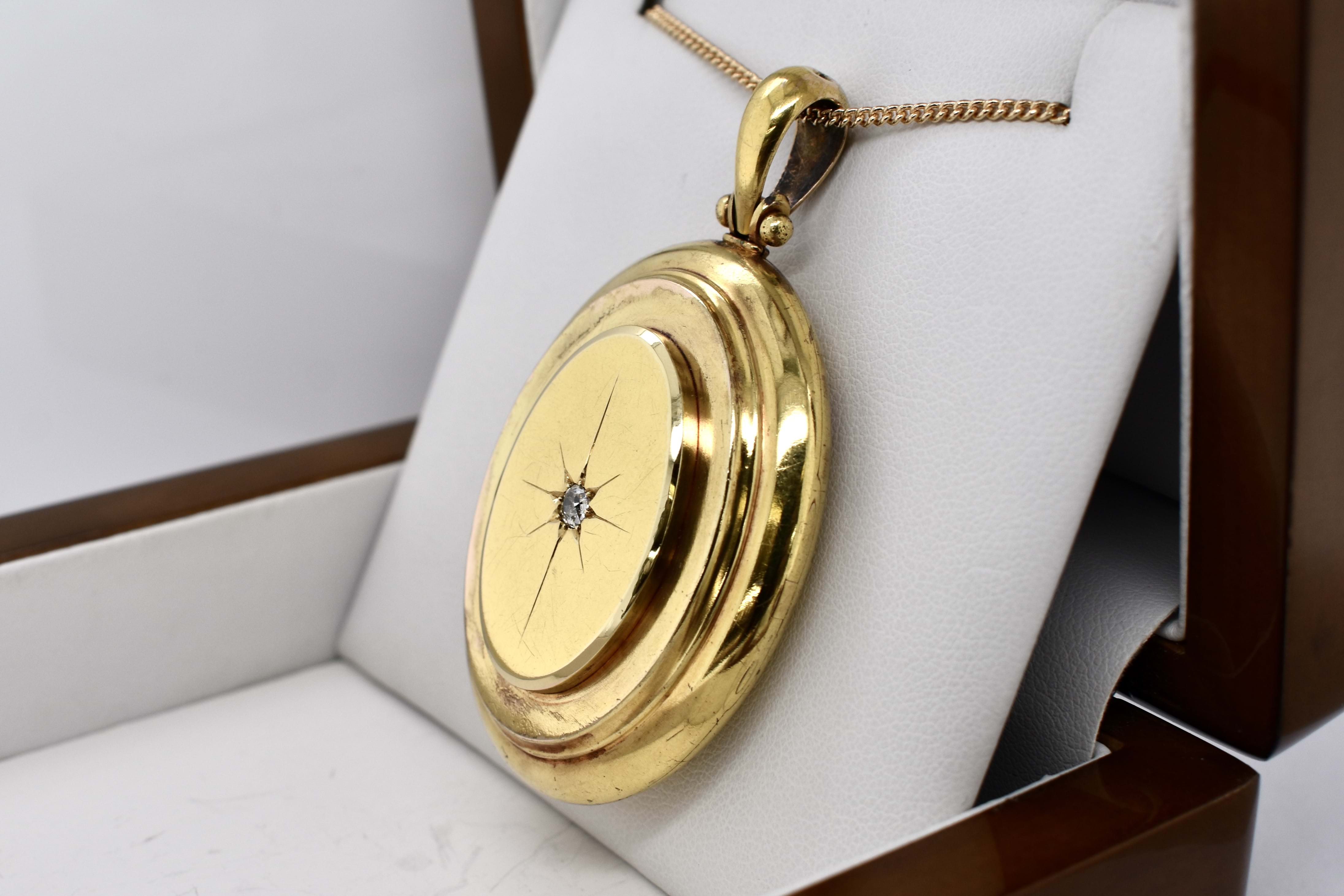 Spectacular oval hinged locket, crafted beautifully in 18ct yellow gold. Star set in with one 3.40-3.25mm old mine cut diamond in the centre, totalling 0.16ct H SI. Locket measuring 47.0x39.0mm and dated circa 1900s. Finished with a plain tapered bale. Chains available for separate purchase. Independent Valuation Supplied.