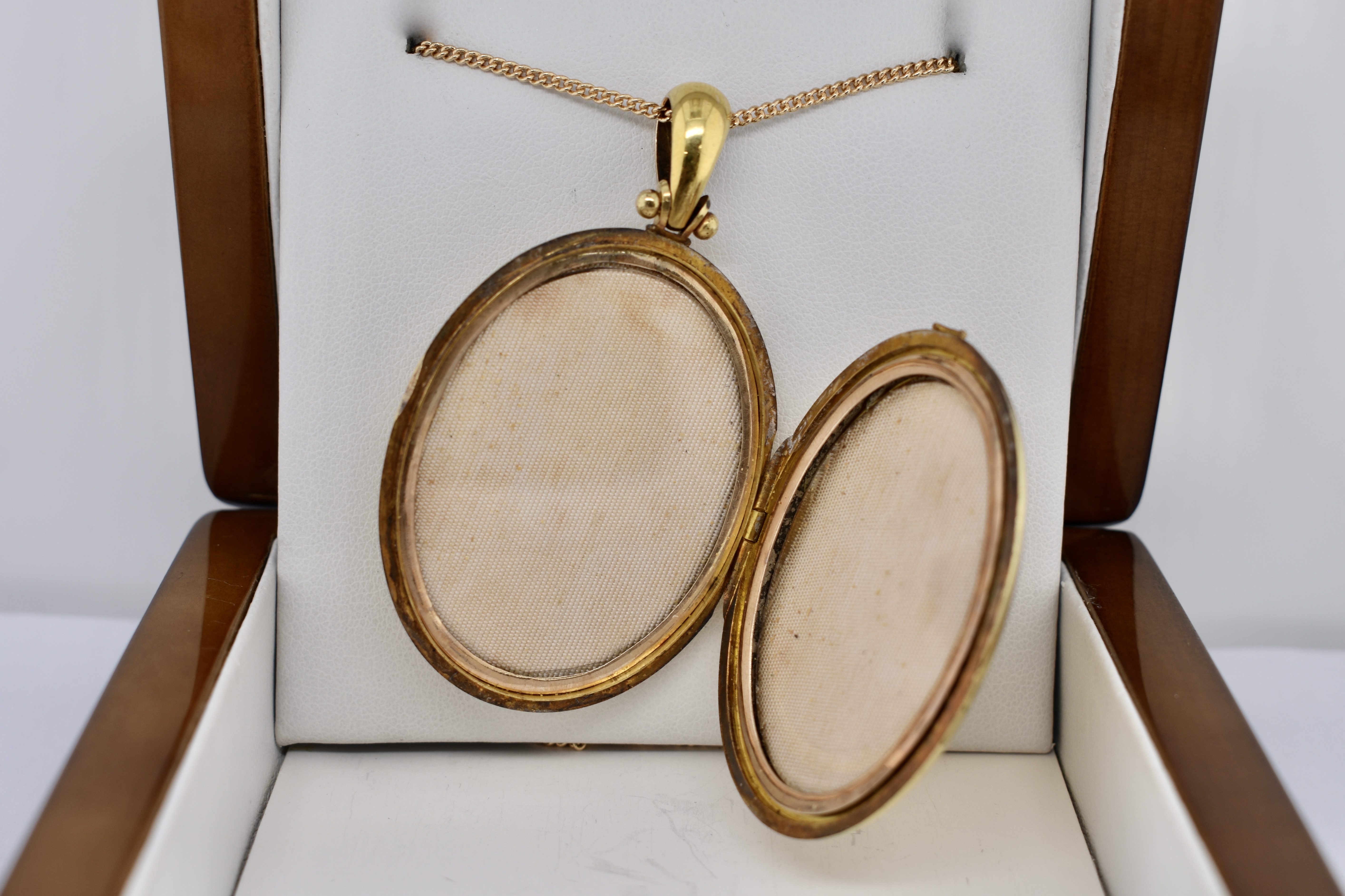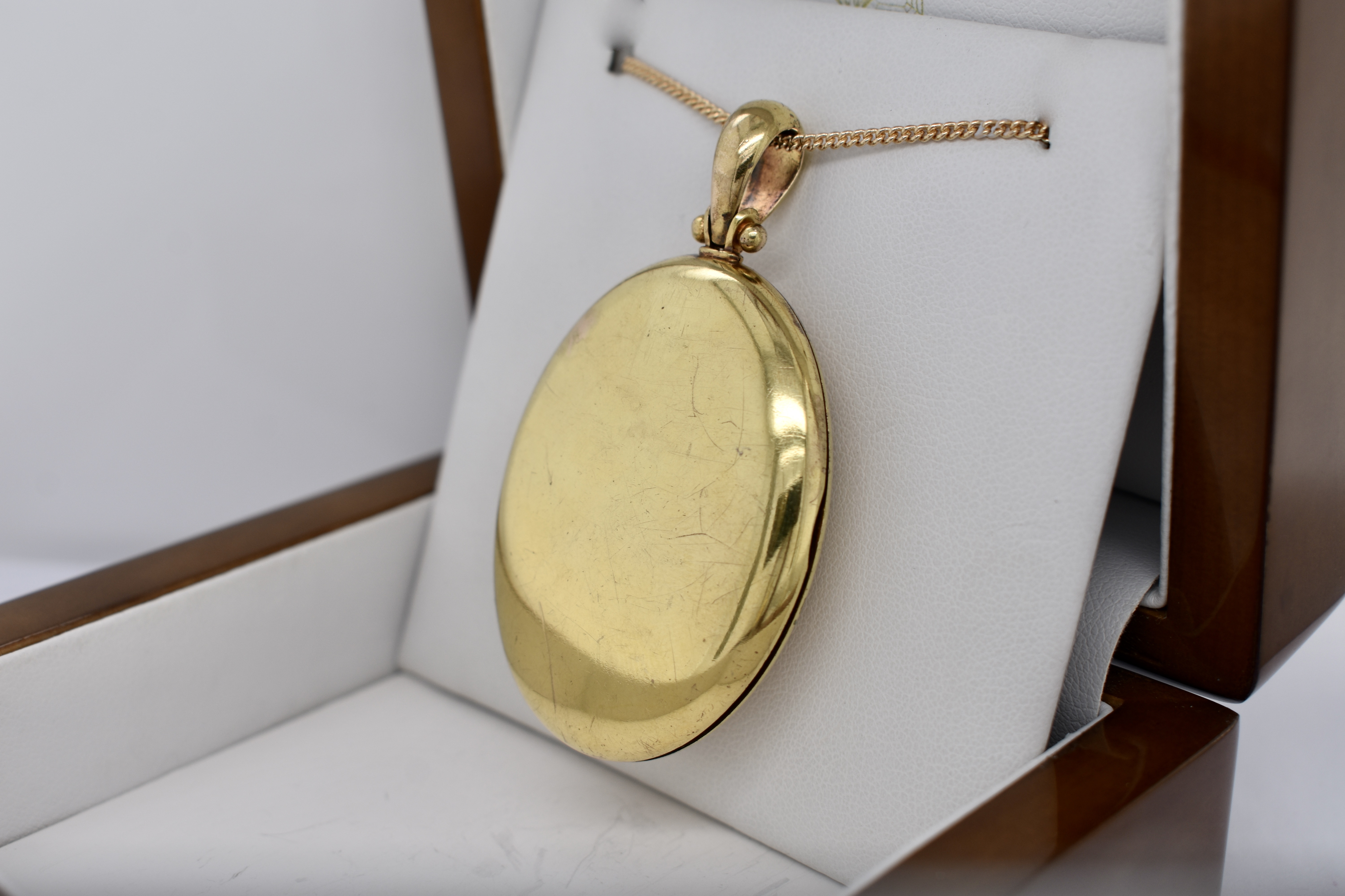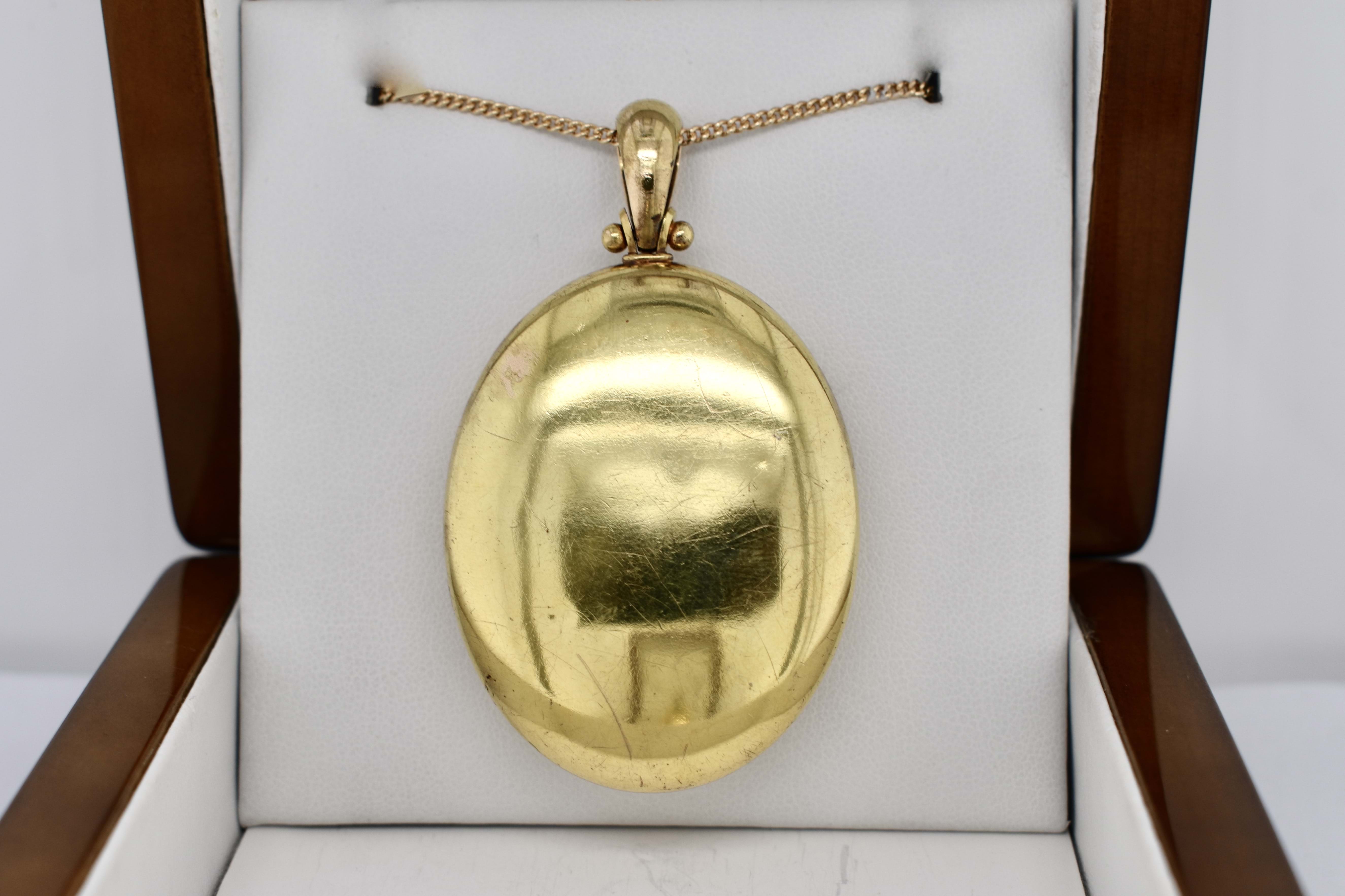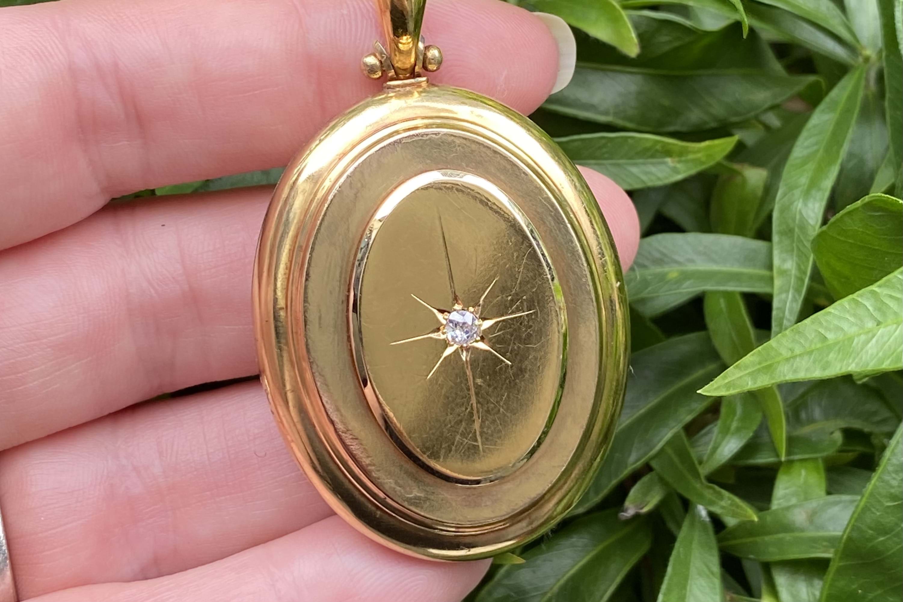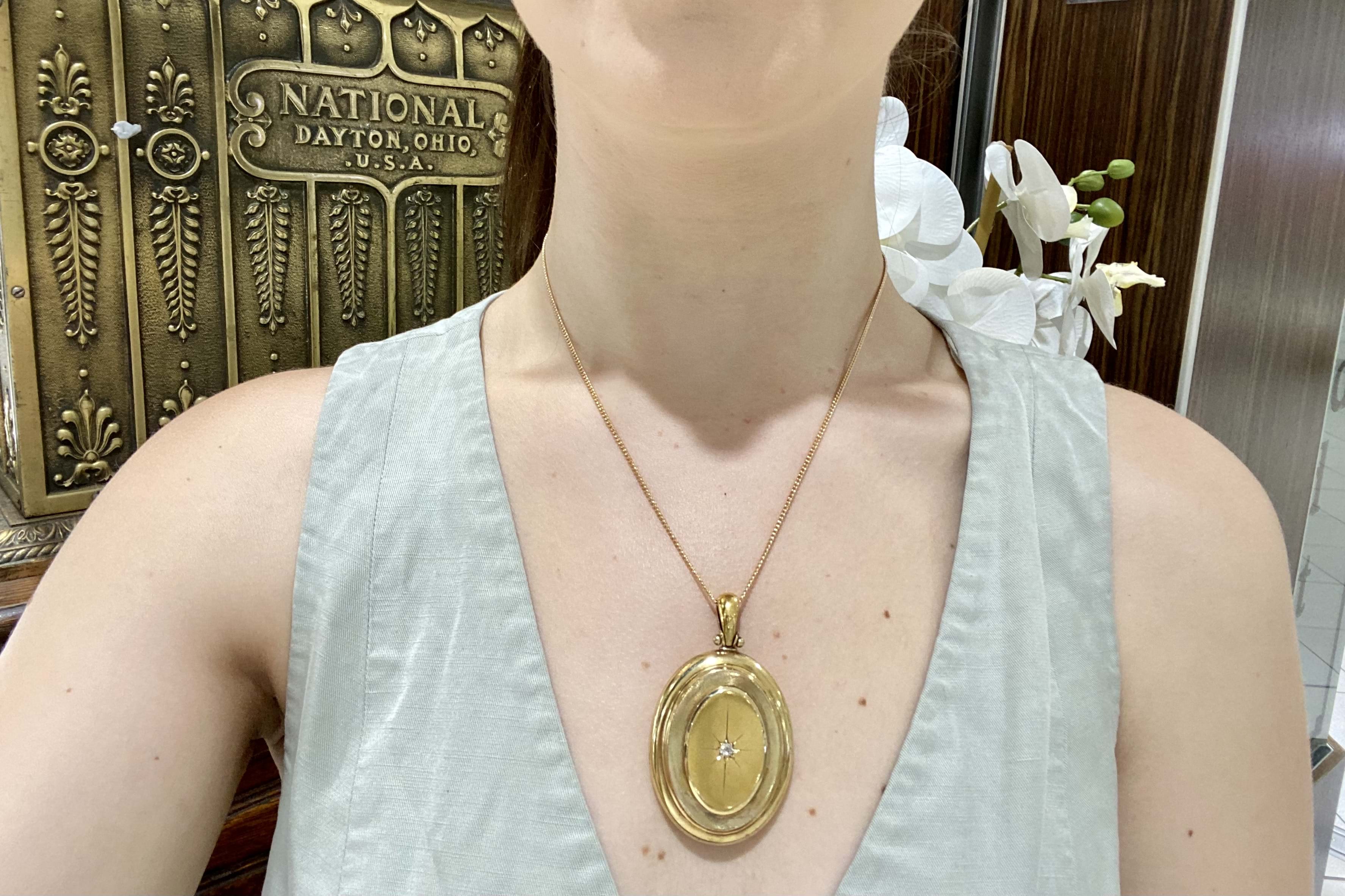 Spectacular oval hinged locket, crafted beautifully in 18ct yellow gold. Star set in with one 3.40-3.25mm old mine cut diamond in the centre, totalling 0.16ct H SI. Locket measuring 47.0x39.0mm and dated circa 1900s. Finished with a plain tapered bale. Chains available for separate purchase. Independent Valuation Supplied.