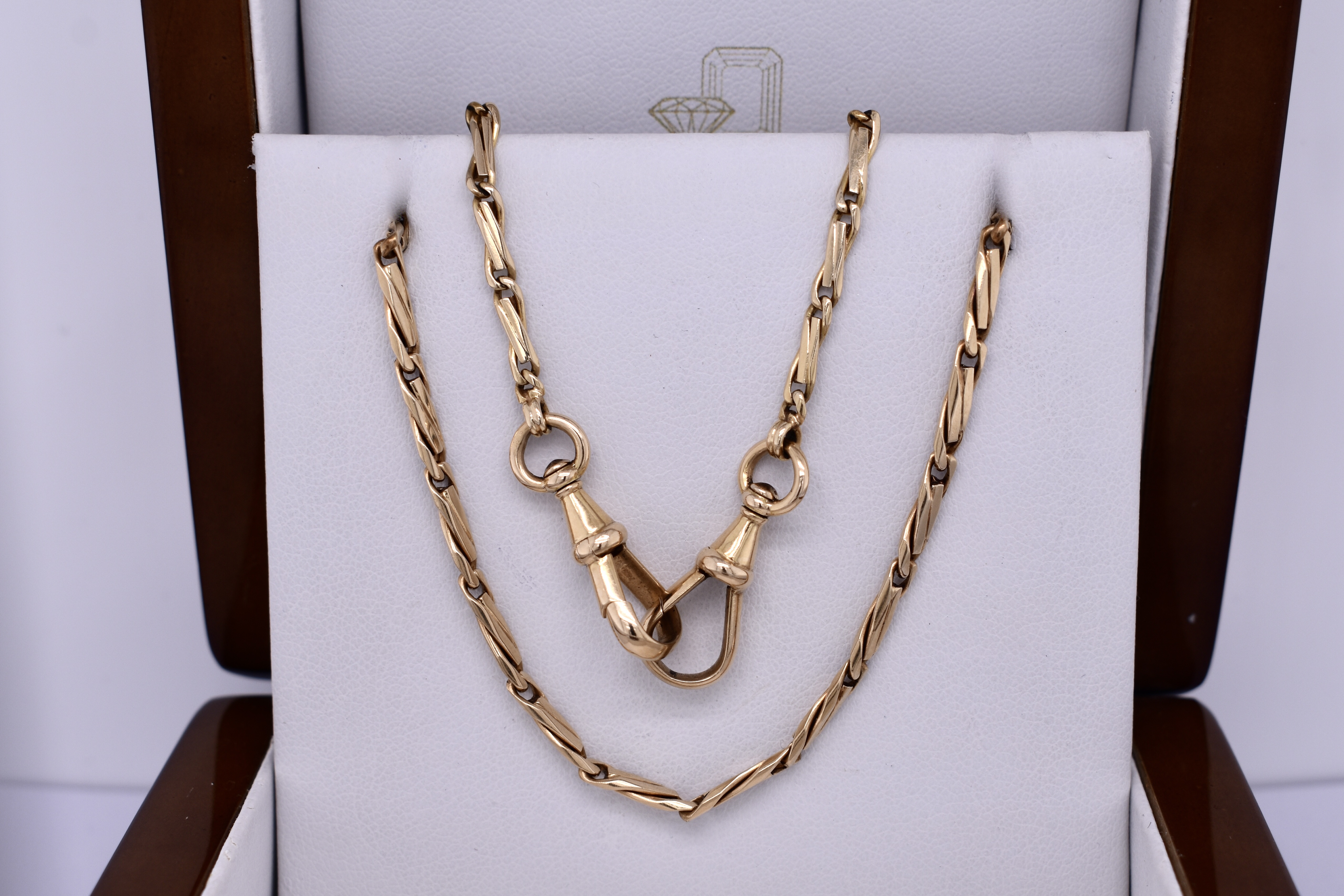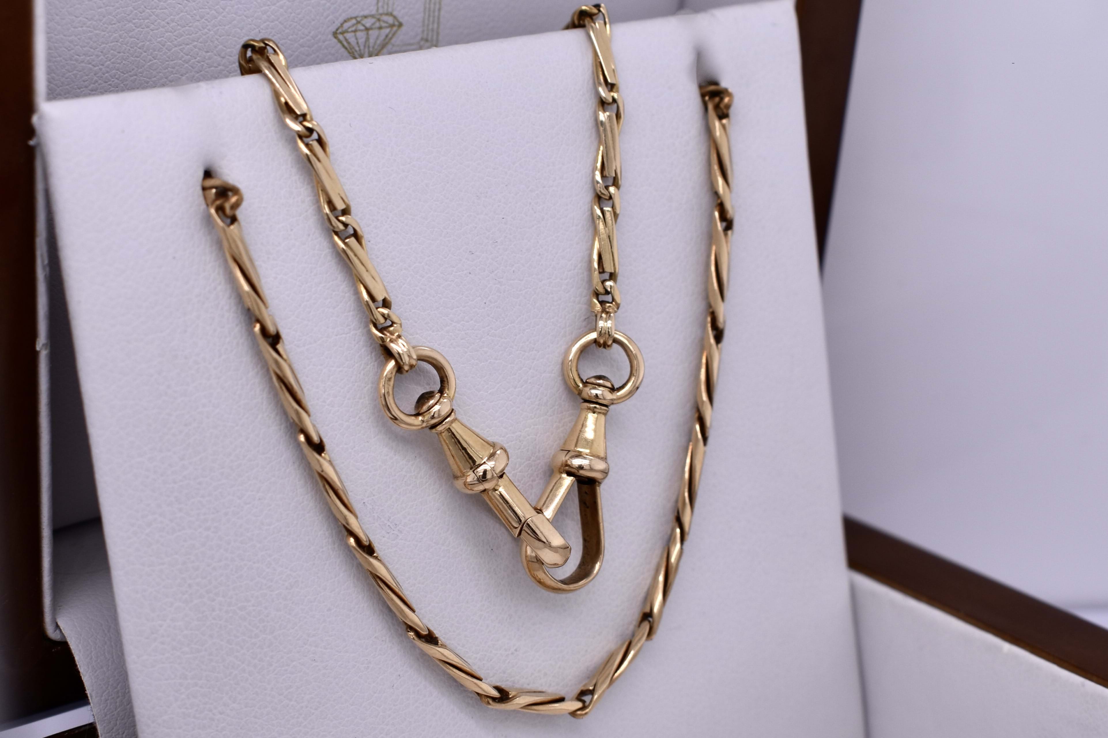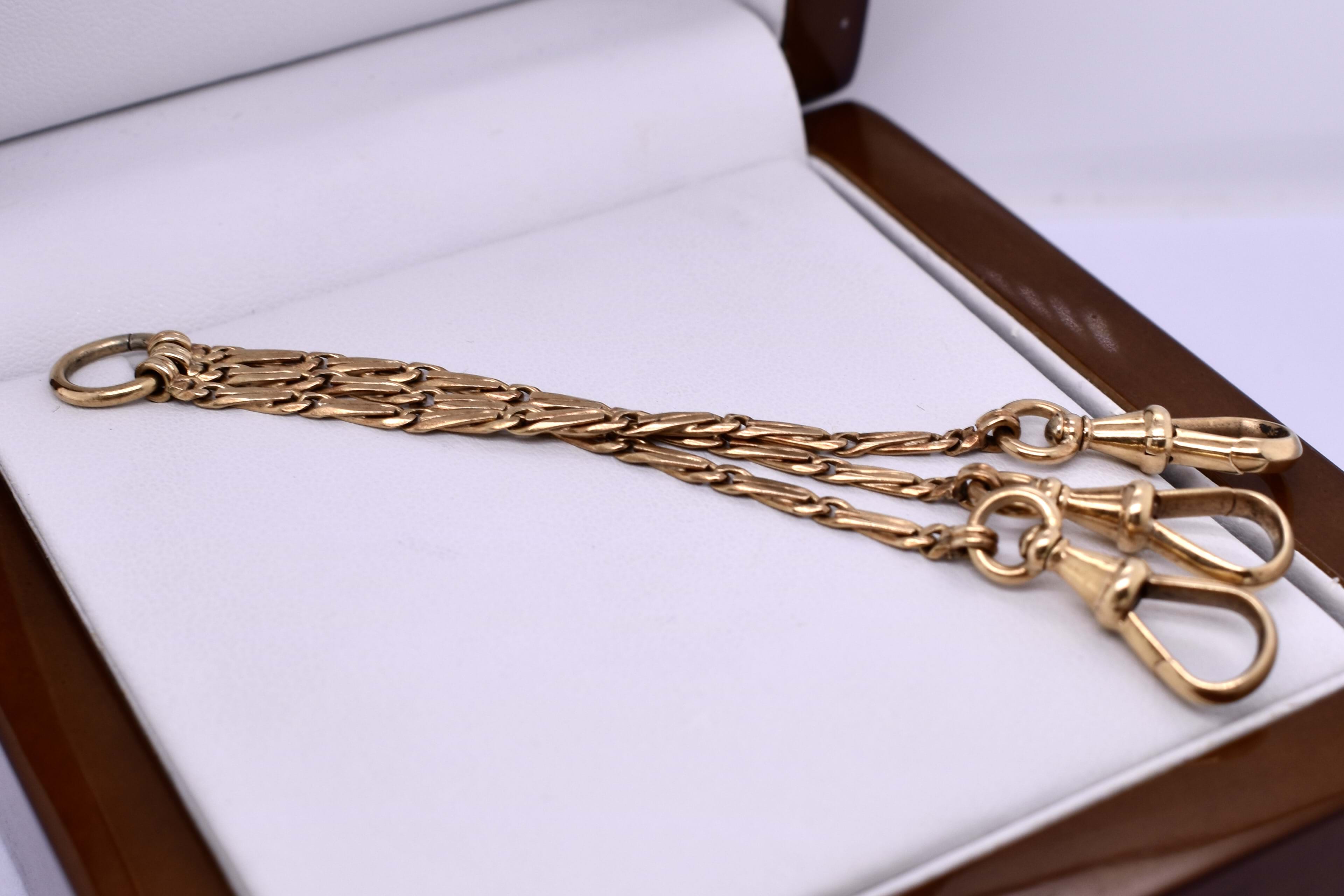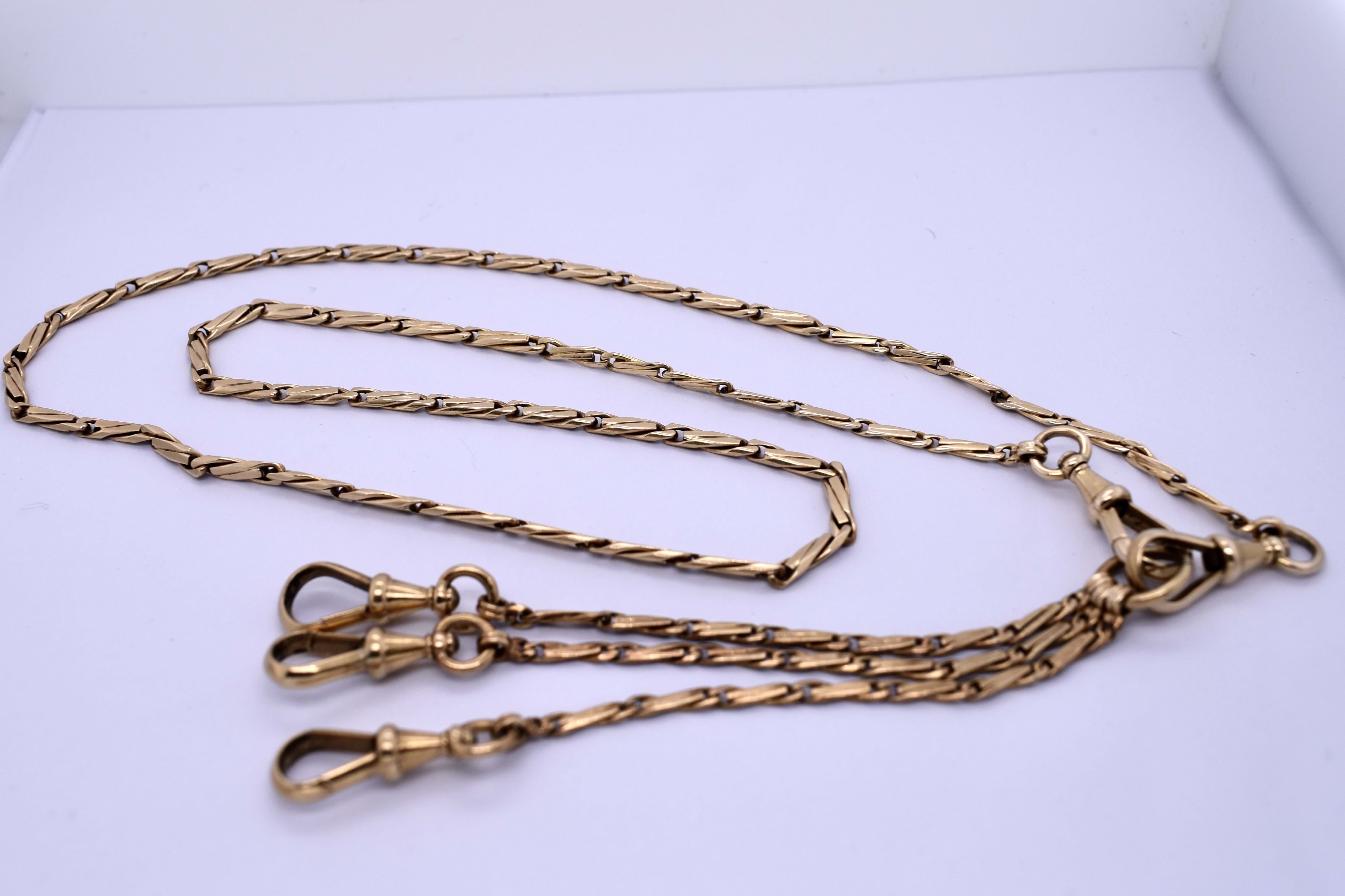 This magnificent antique chatelaine chain is crafted in 18ct yellow gold, in a flat twisted link, measuring 56cm with a double swivel clasp. Attached are three 9cm drops, each with a swivel clasp at each end. The chain has French hallmarks and is dated circa 1800s. Weighing 32.97 grams. Independent Valuation Supplied.