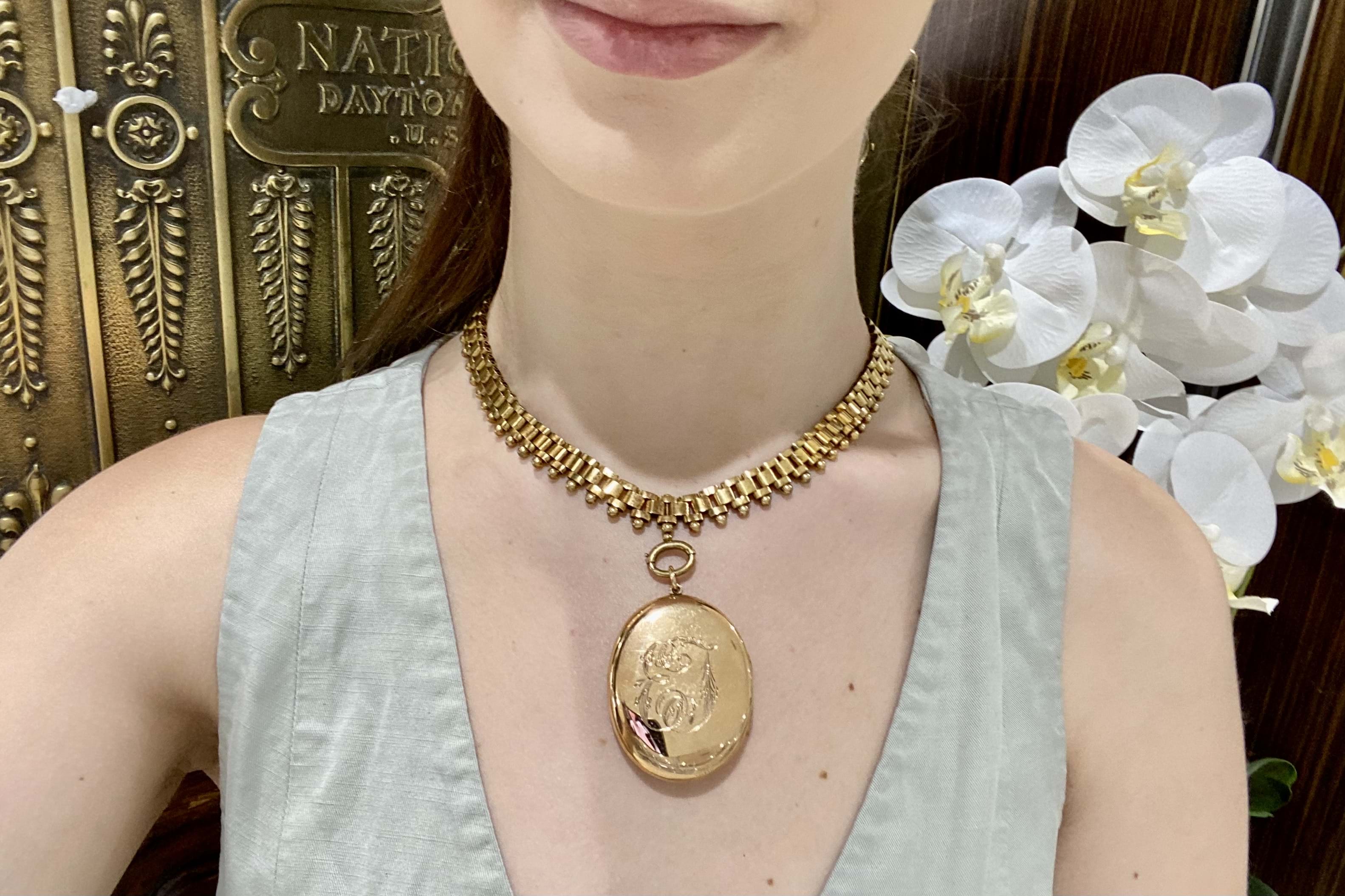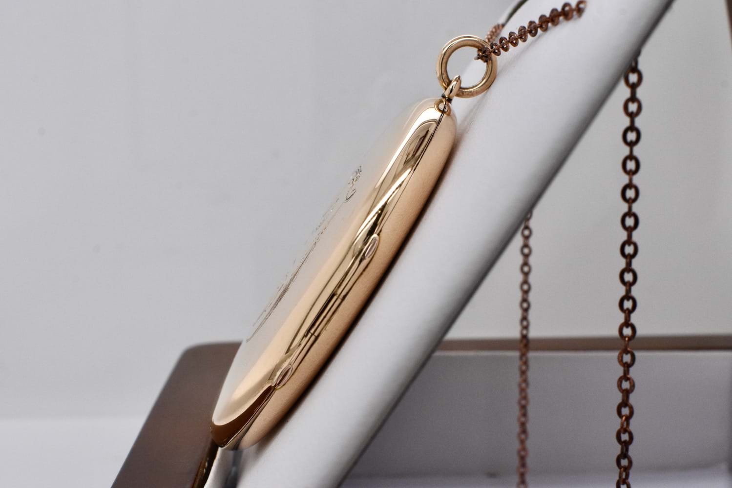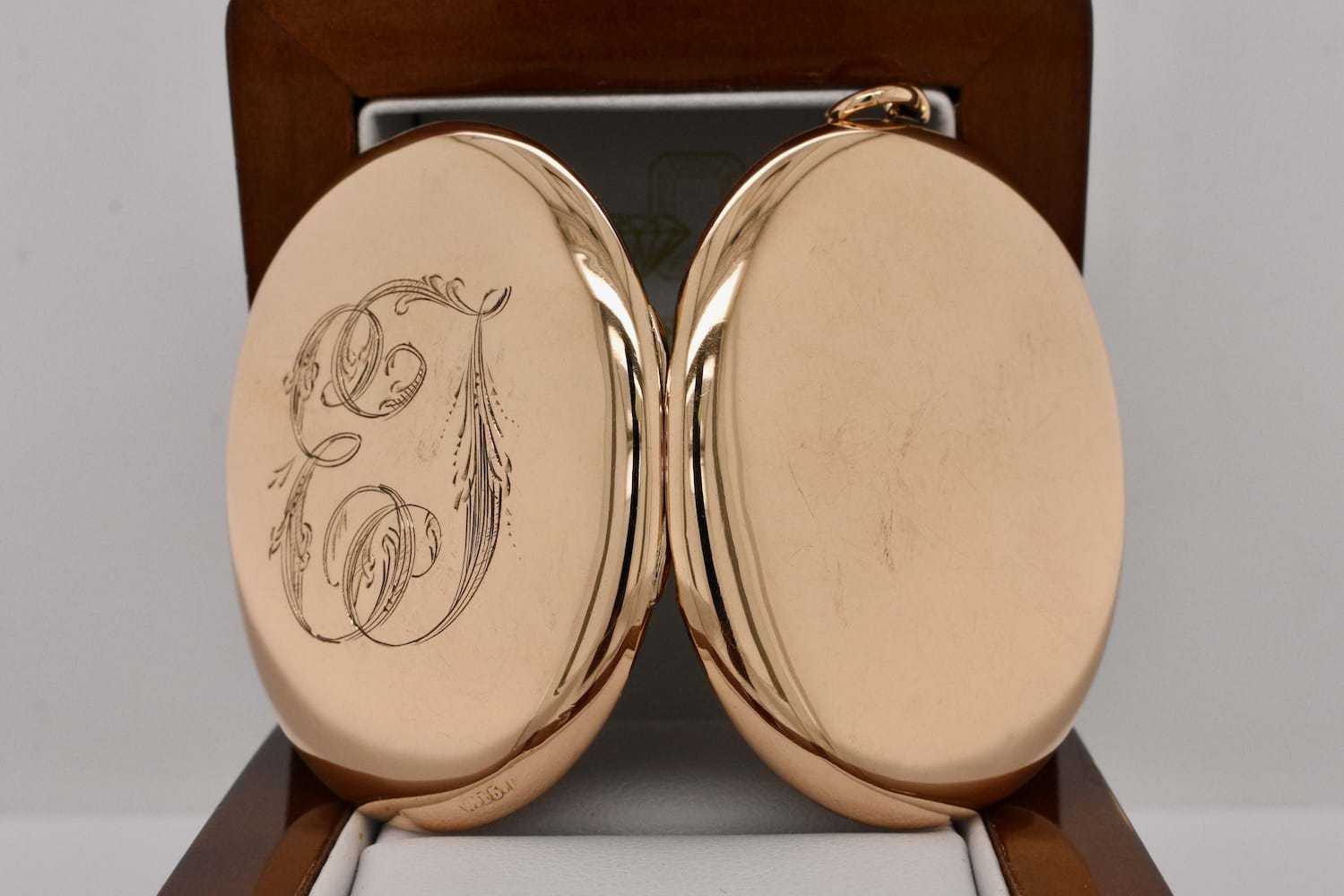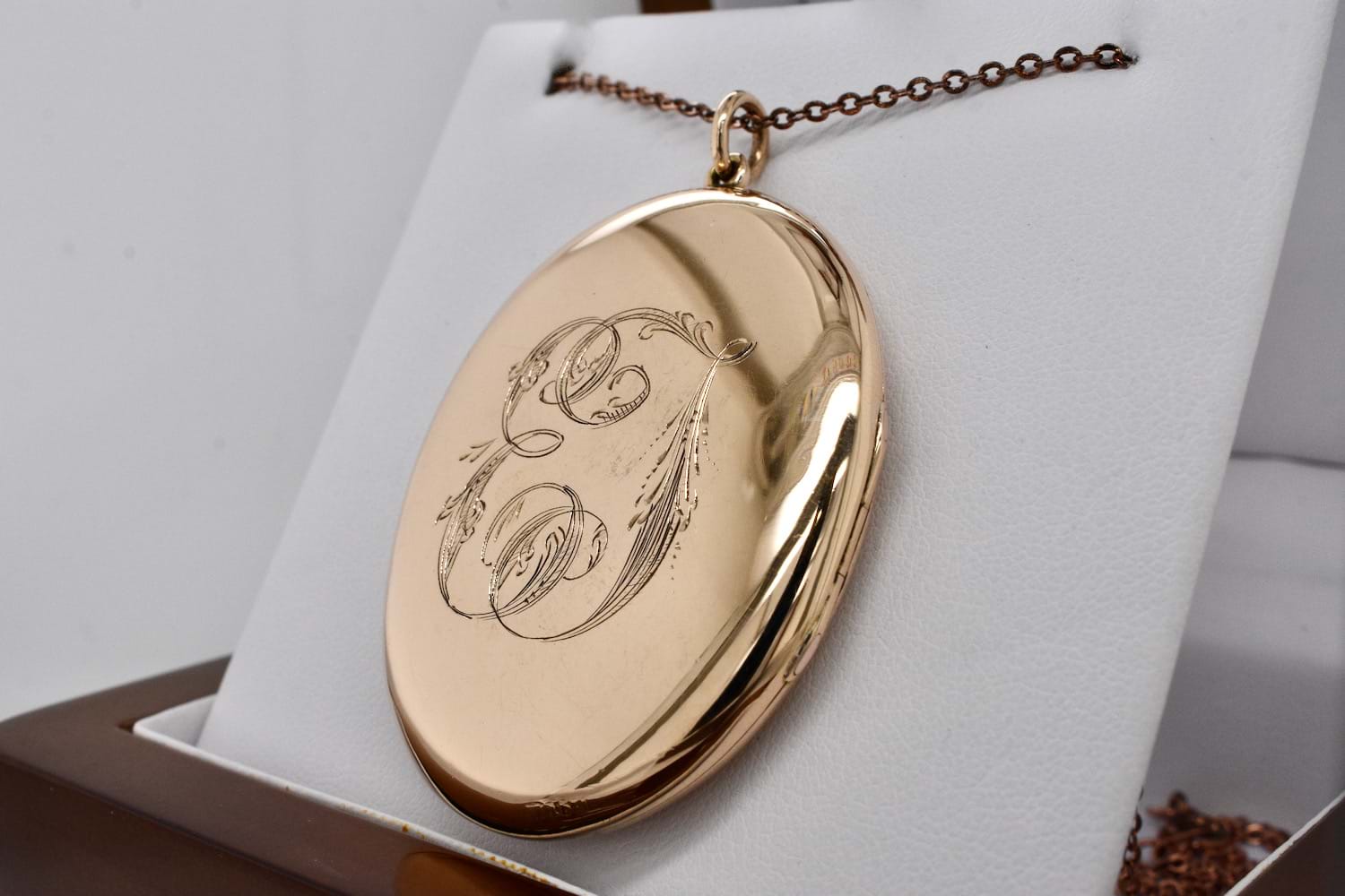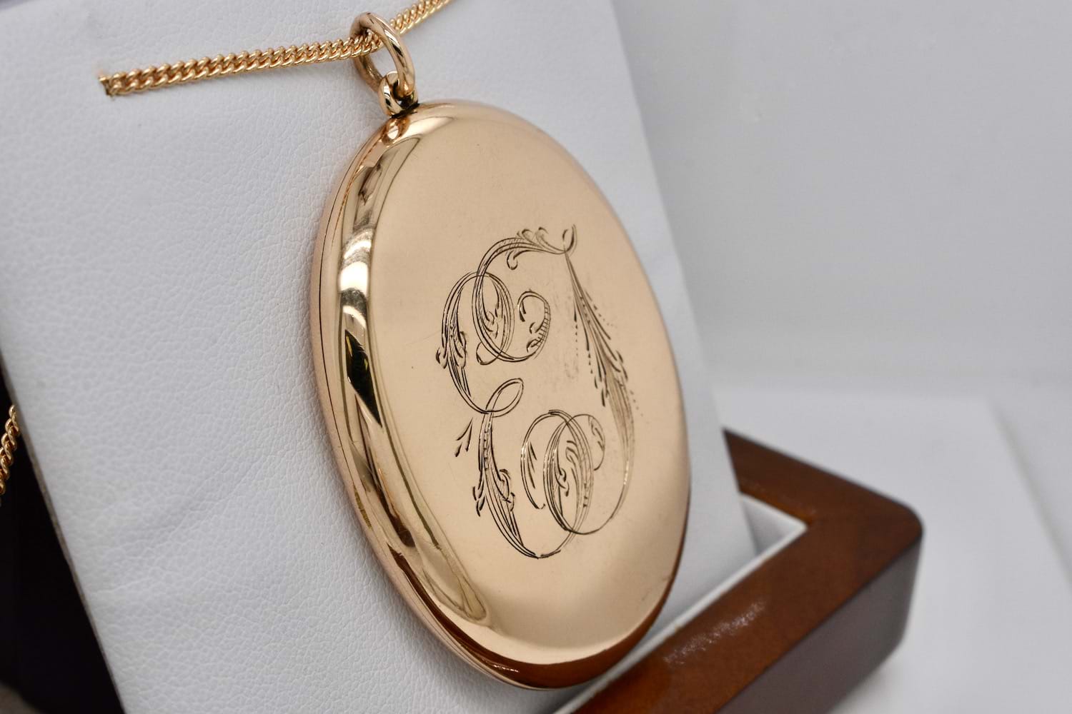 This stunning large polished oval locket has been crafted in 18ct yellow gold and has the initials EJ elaborately engraved on the front, with a plain back. Dated circa 1915, the piece is in excellent condition and measures 48x38mm. Chains are available for separate purchase. Independent Valuation Supplied