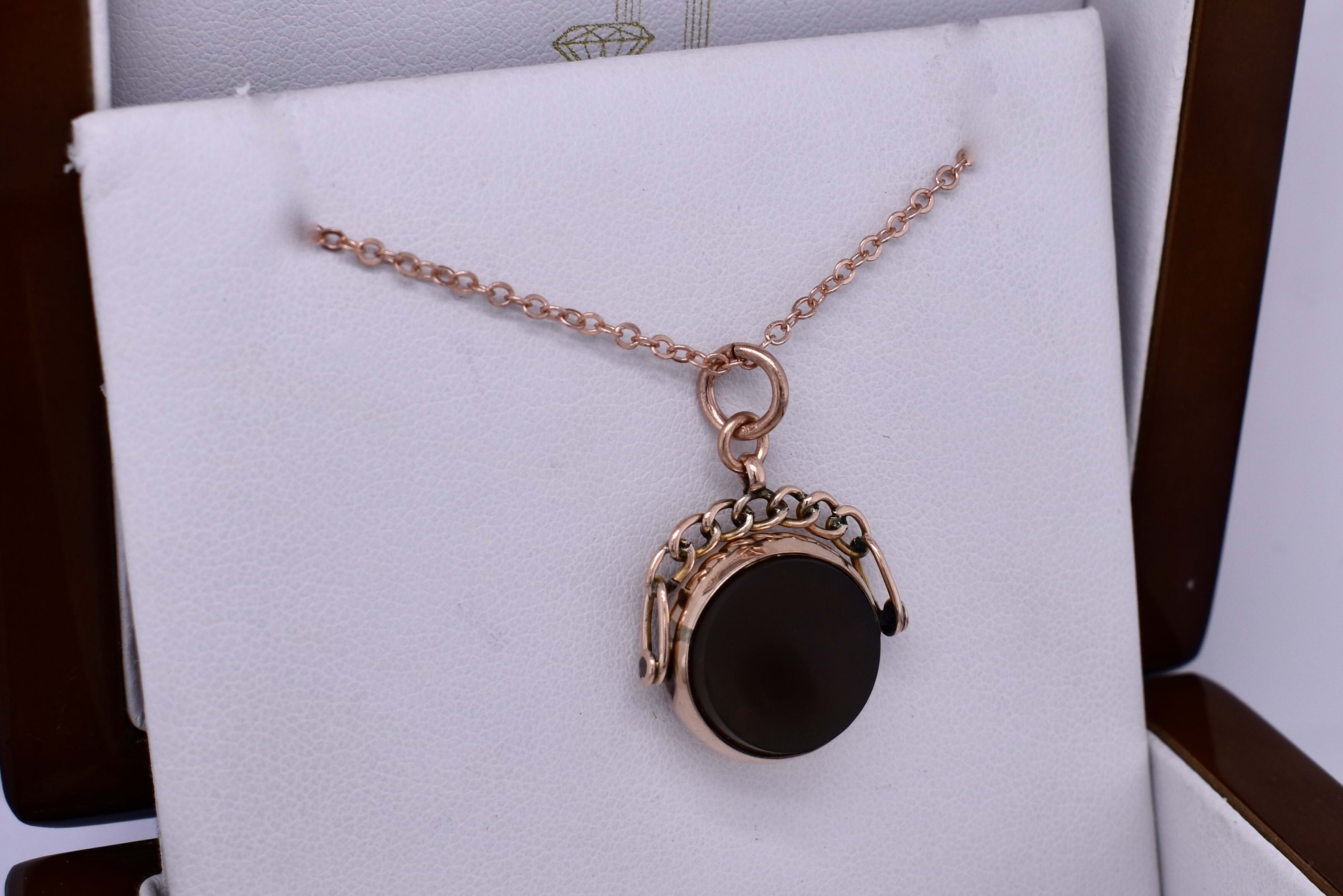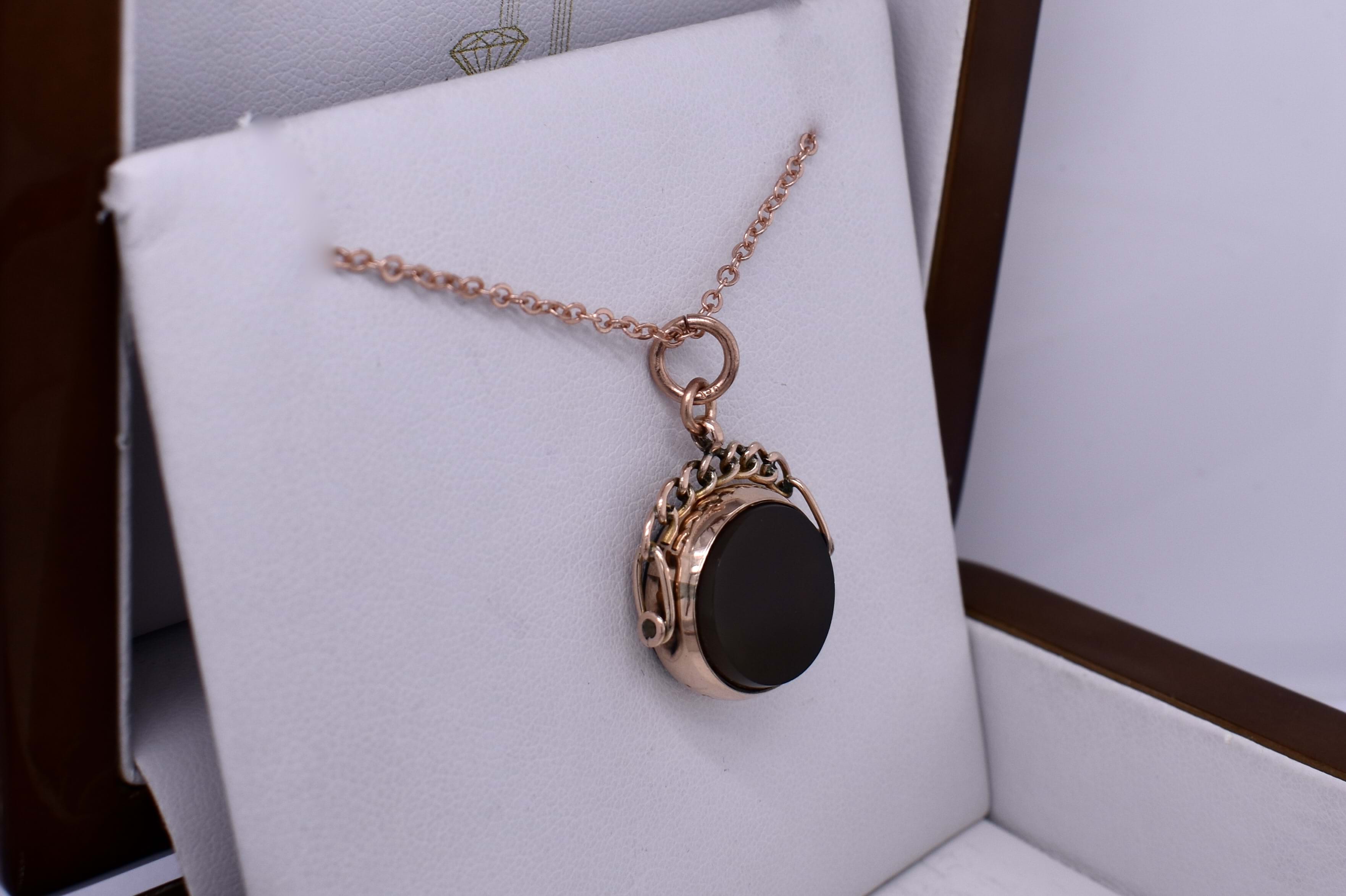 Lovely 9ct rose gold antique spinner containing an oval bloodstone and green chalcedony with a curb link chain top. The stones measure 14x14mm and entire spinner measure4s 24mm long, including the jump ring bale. Dated 1908, stamped Chester. Chains are available for separate purchase. Independent Valuation Supplied.