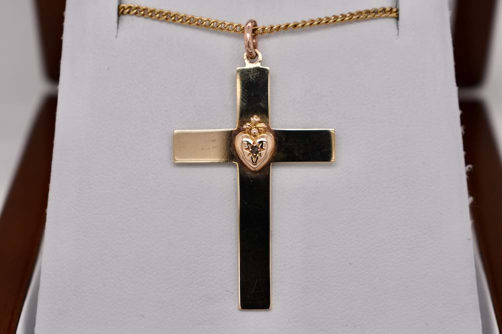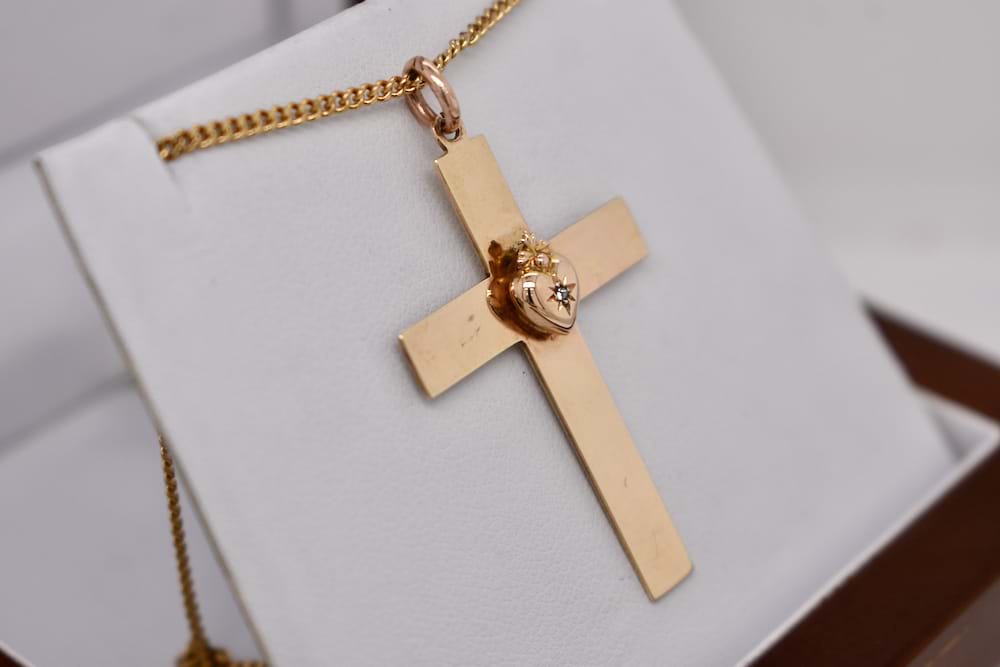 SOLD Antique 9ct Yellow Gold Cross with Heart & Diamond Pendant