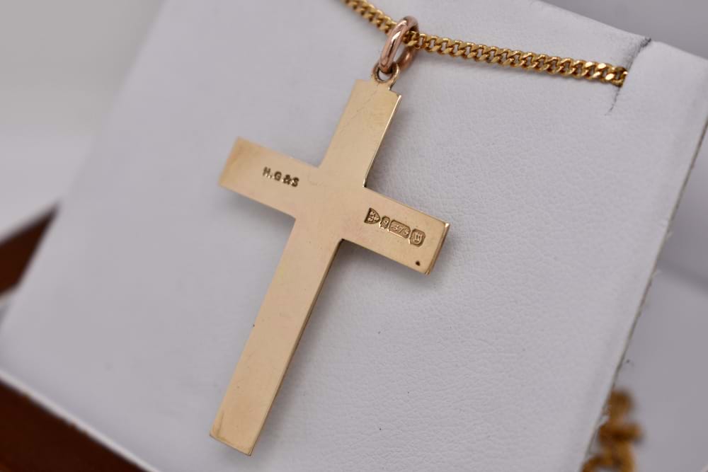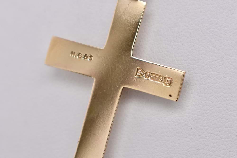 An antique 9ct yellow gold cross measuring 37x25mm with a puff heart in the centre and a small diamond inset. Hallmarked Chester 1937. Independent Valuation Supplied. Chains are available for separate purchase