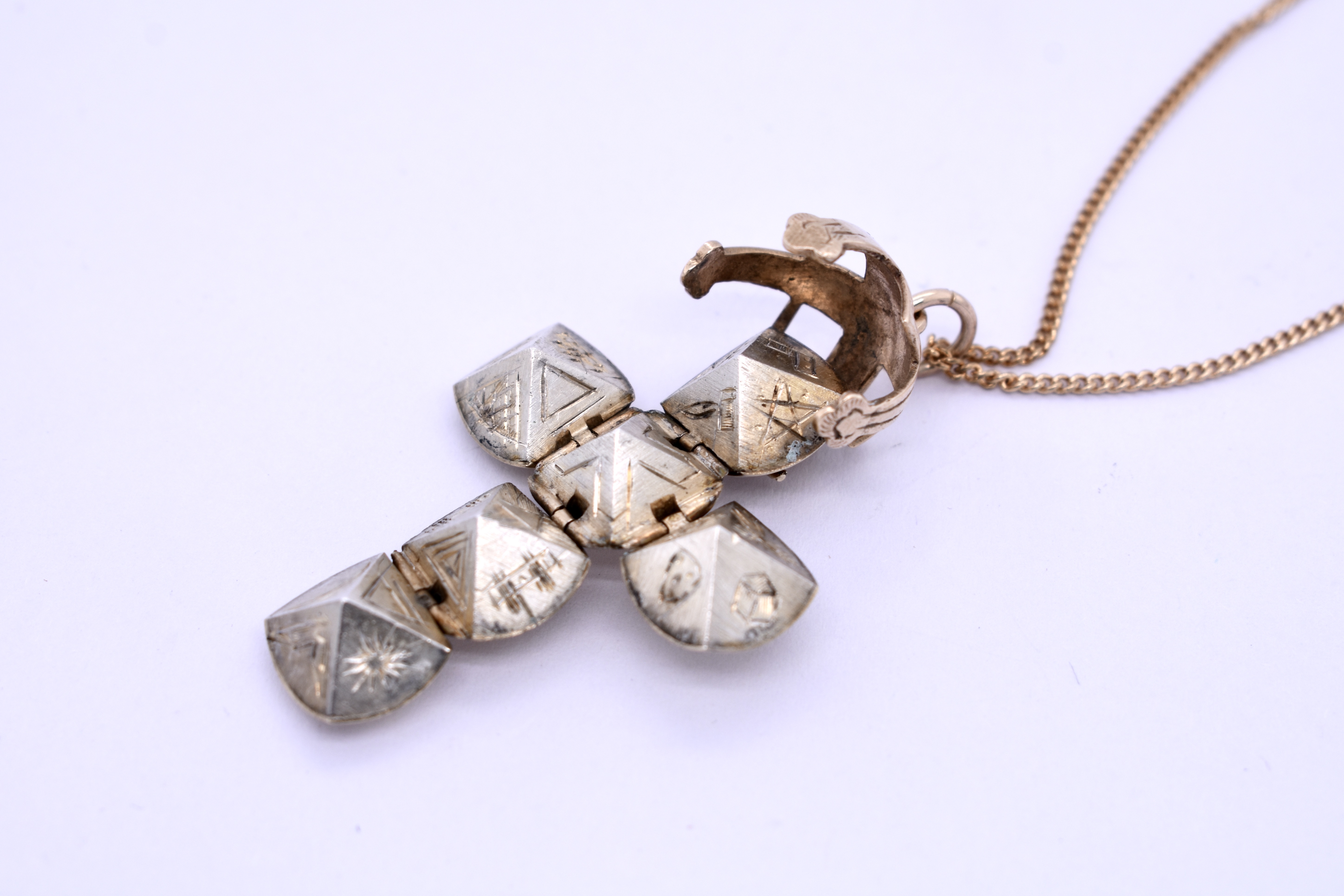 Crafted in 9ct yellow gold, this masonic orb pendant measures 19mm round and has a silver lined inside which opens out with masonic symbols on the pyramids. When opened this pendant measures 50x33mm. Dated Circa 1910. Chains available for separate purchase.