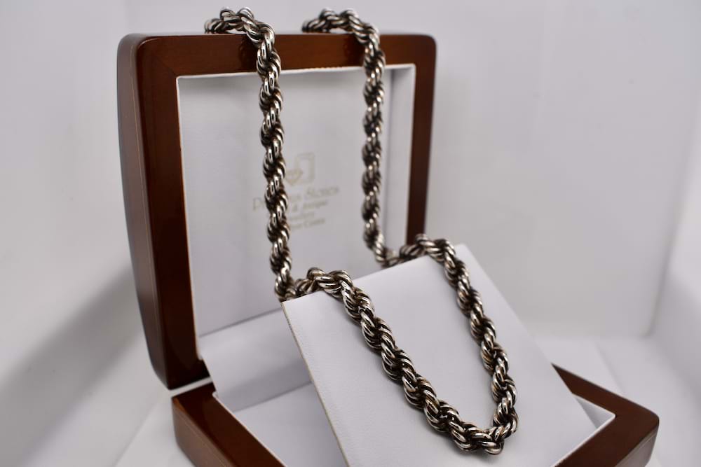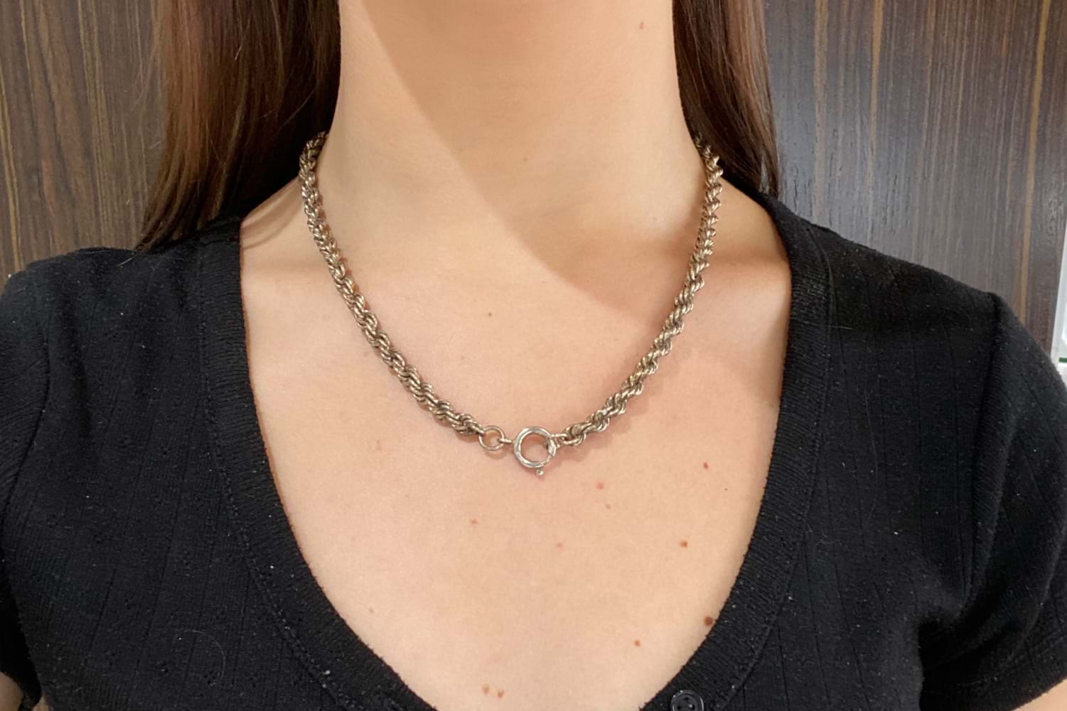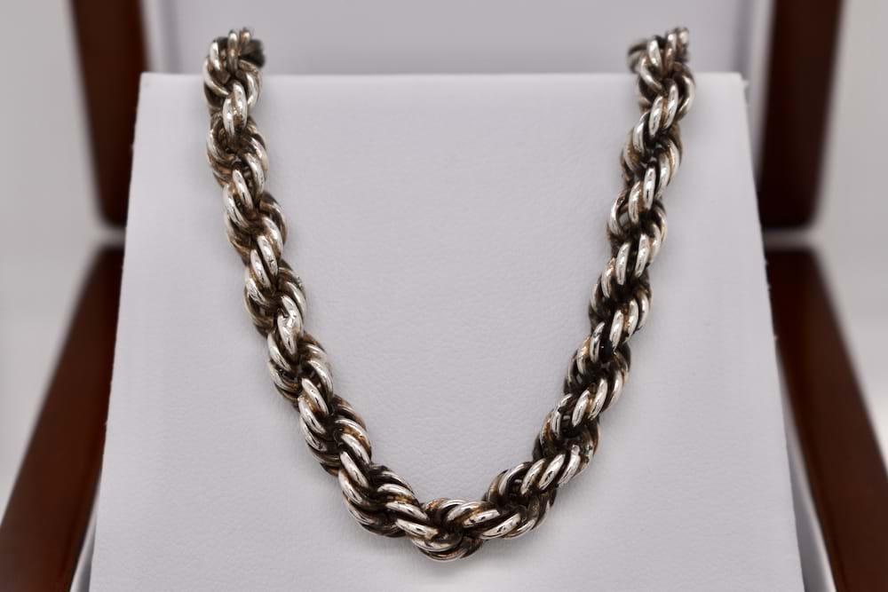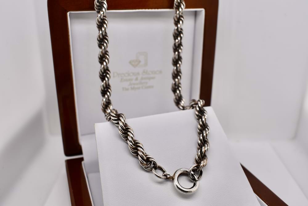 This lovely antique sterling silver chain features beautiful twisted rope detail. The chain measures 50cm in length and includes a bolt ring clasp