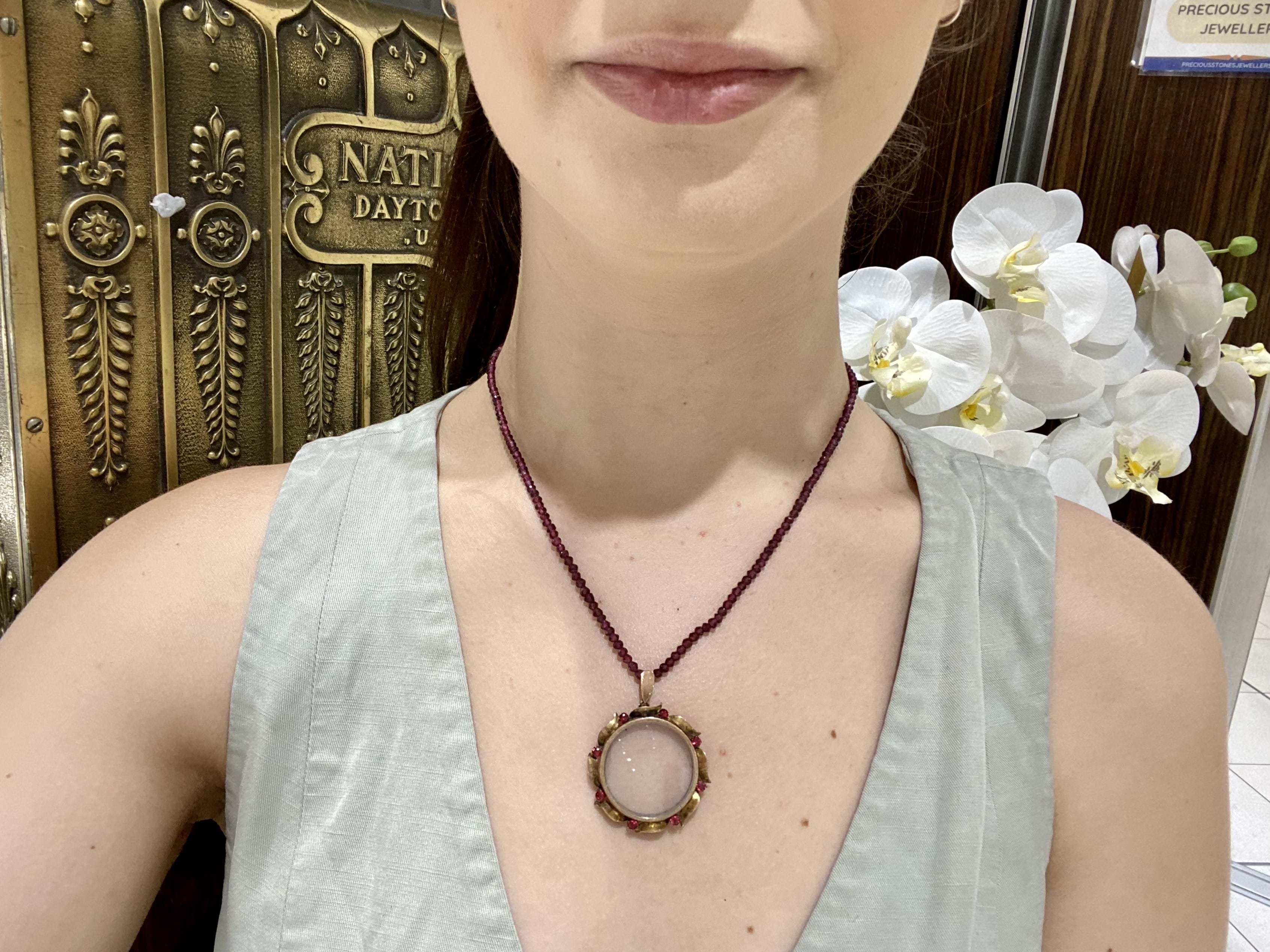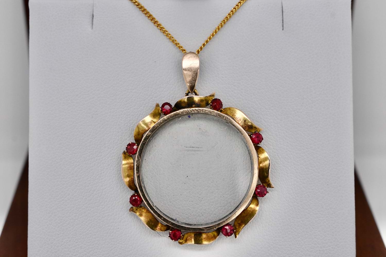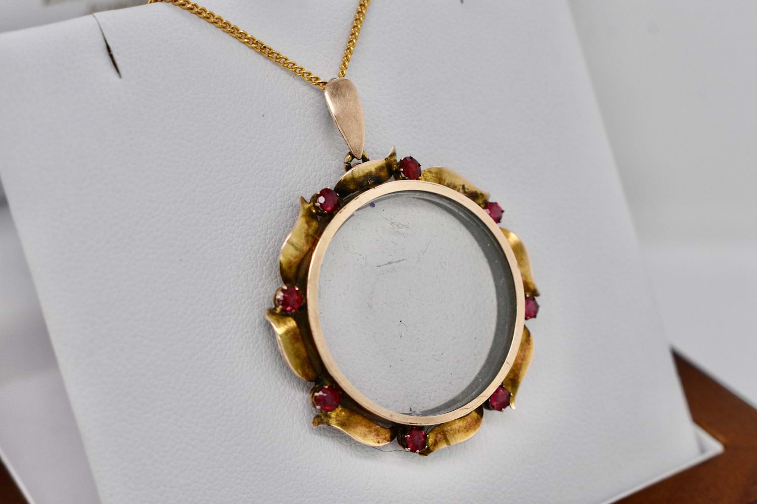 Gorgeous photo frame pendant crafted in 9ct yellow gold with a leaf style surround and seven red garnet topped doublets set alternately. The locket is dated circa 1900's - Edwardian and is 25mm diameter. Chains are available for separate purchase. Independent Valuation Supplied