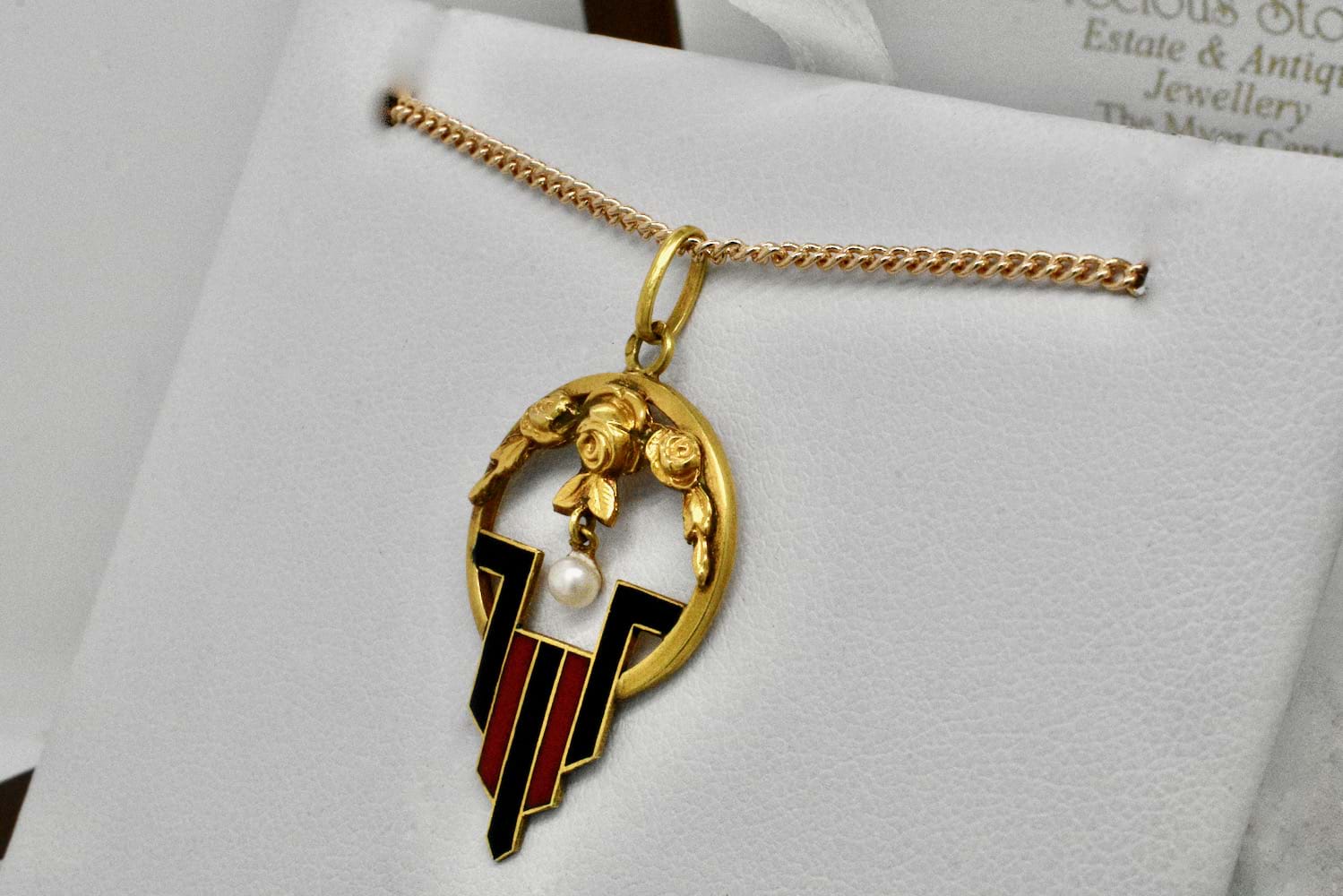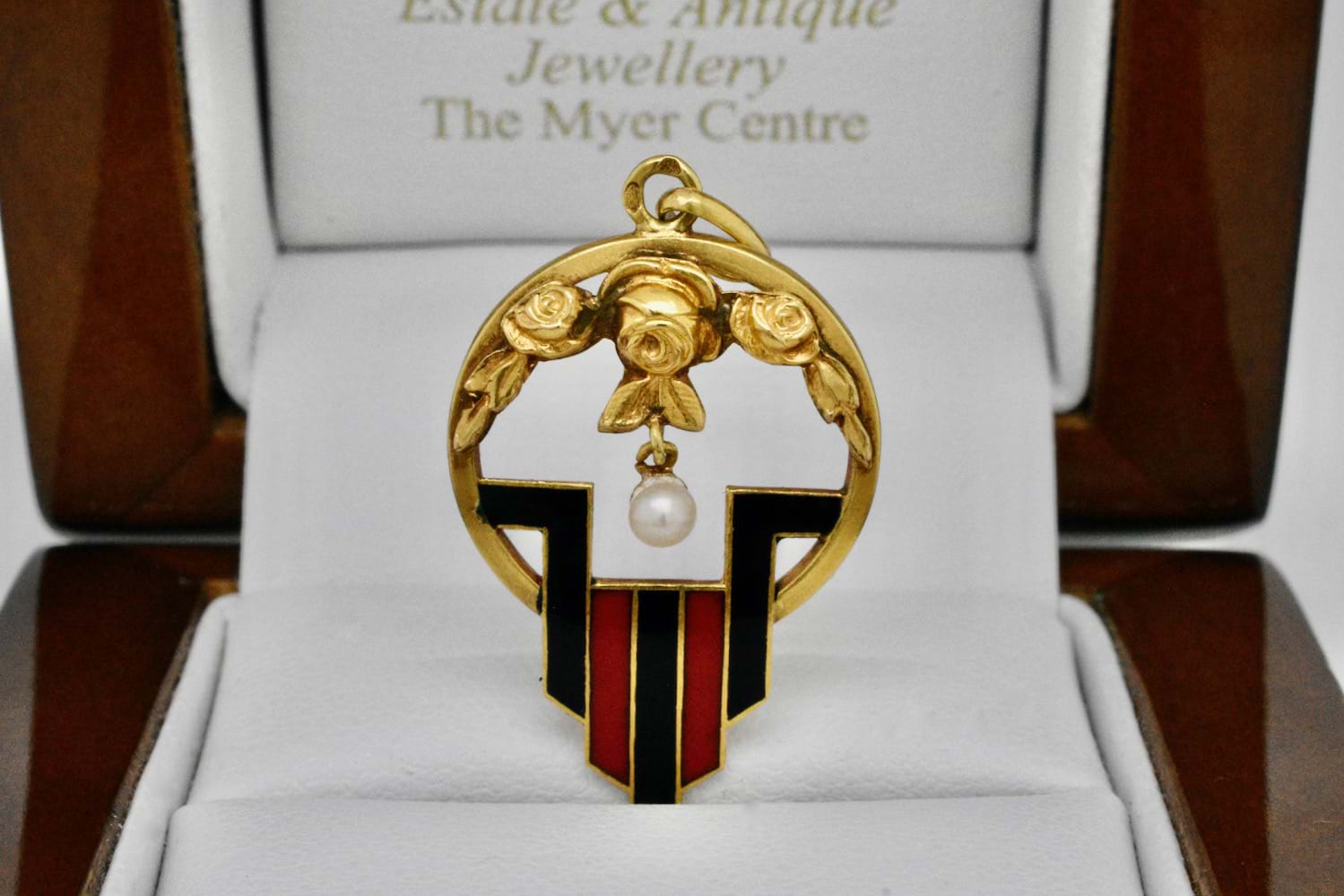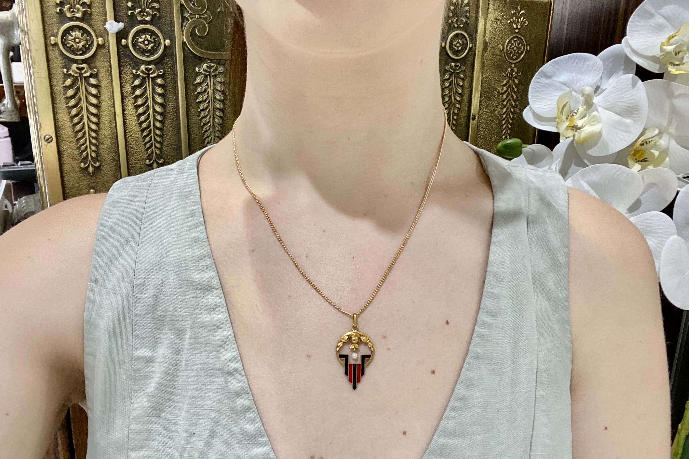 French 18ct yellow gold Art Nouveau pendant with geometric black & red enamel pattern, rose embossed top and a 2.85mm pearl suspended in the middle. Circa 1900. Independent Valuation Supplied