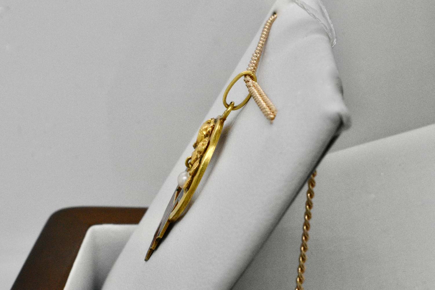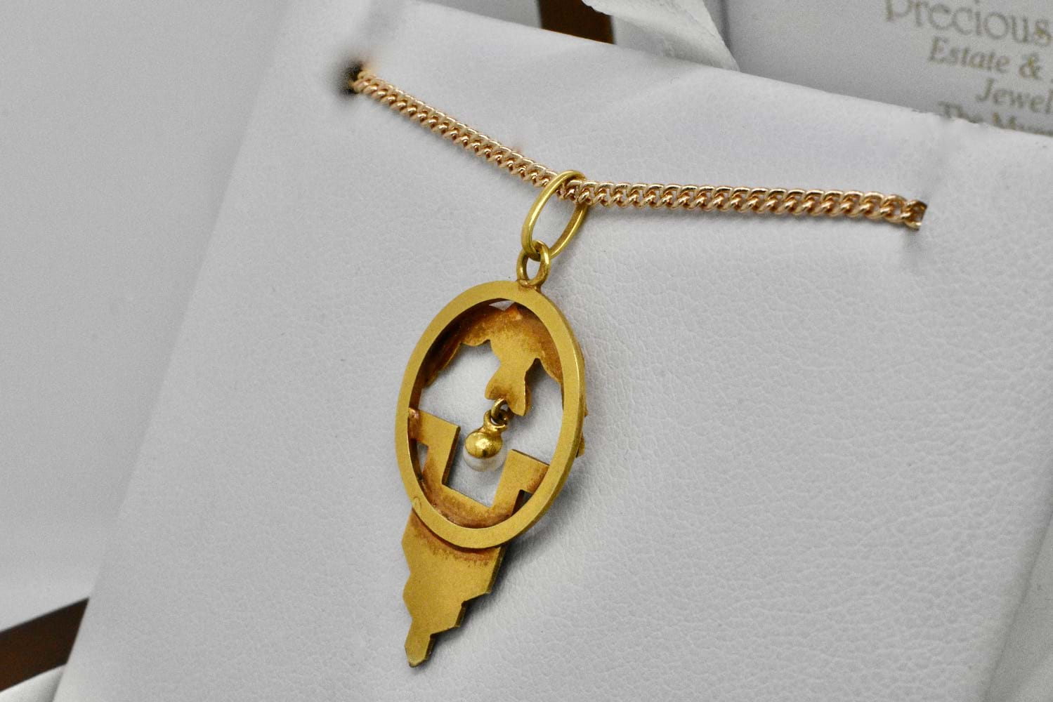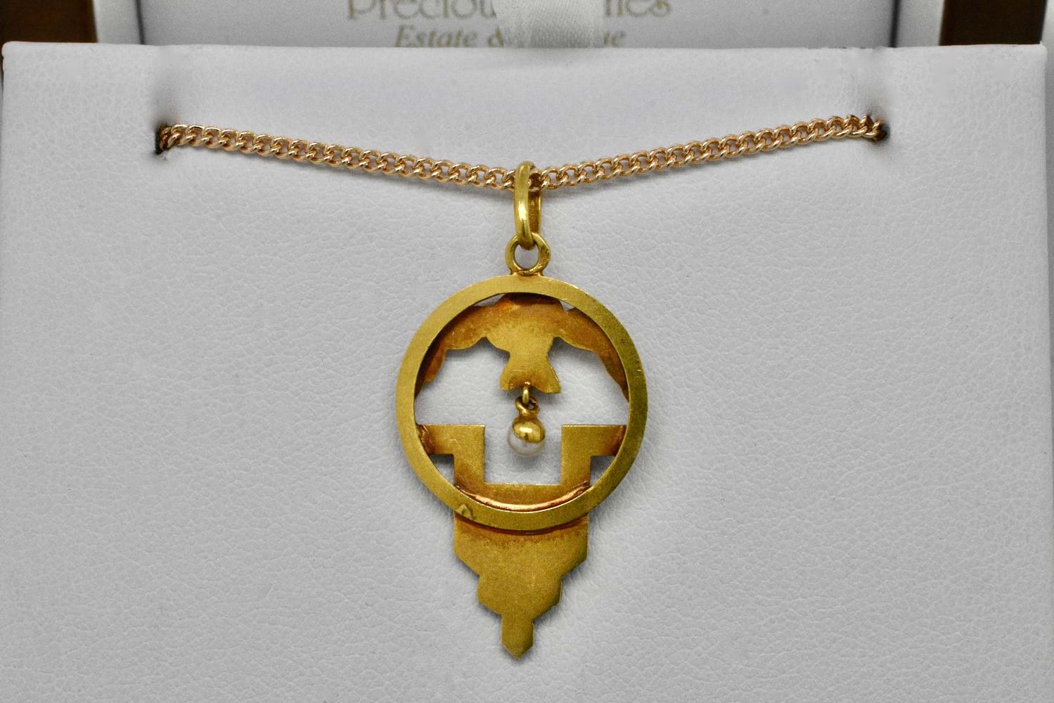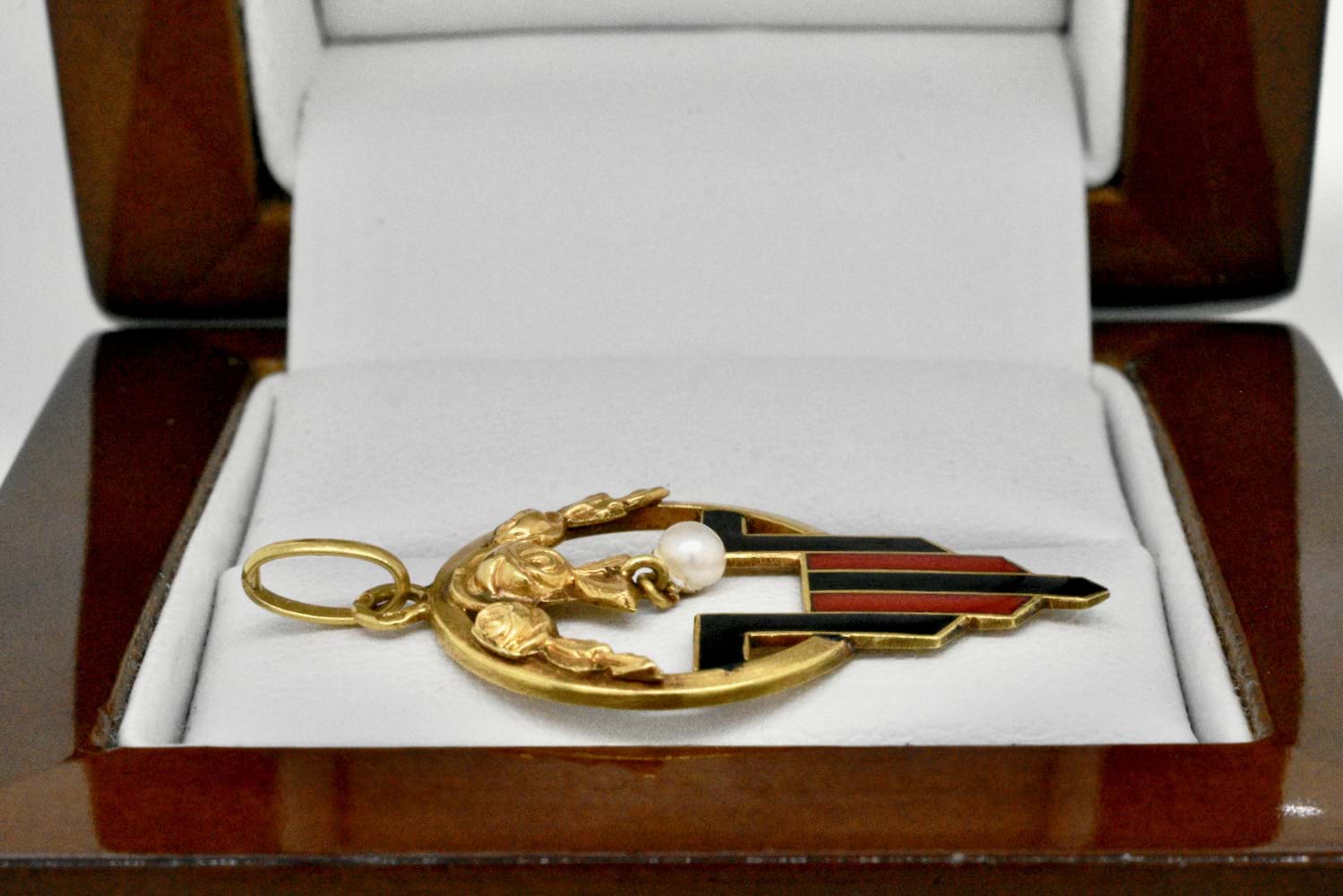French 18ct yellow gold Art Nouveau pendant with geometric black & red enamel pattern, rose embossed top and a 2.85mm pearl suspended in the middle. Circa 1900. Independent Valuation Supplied
