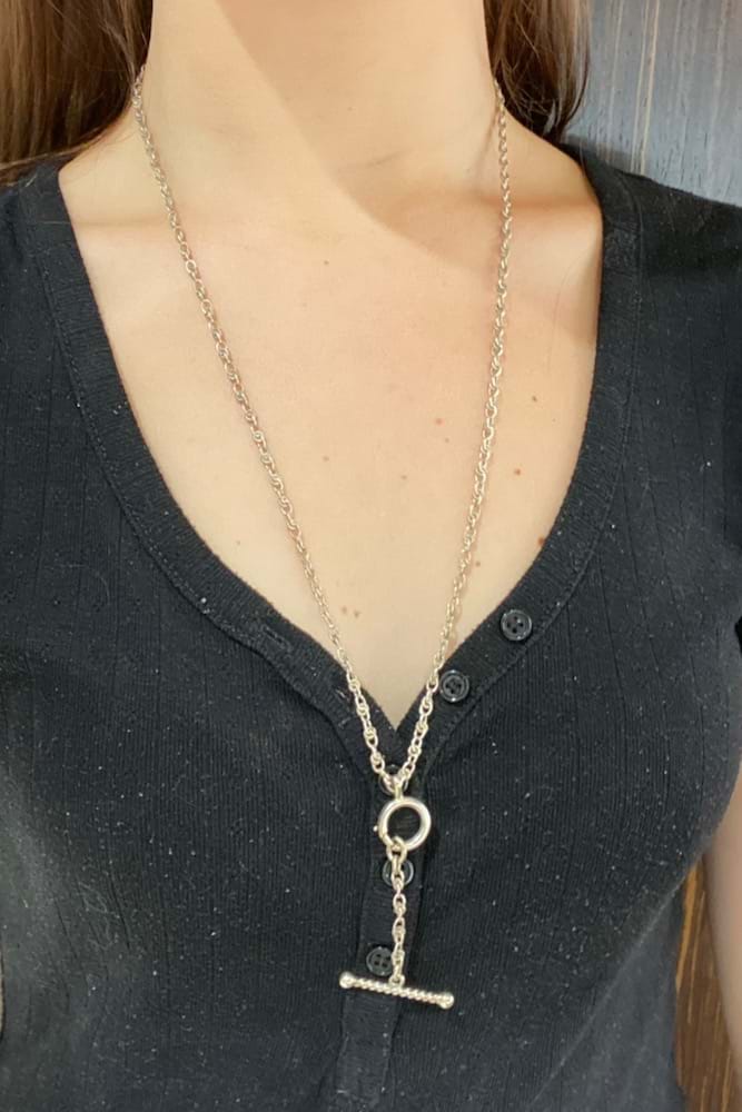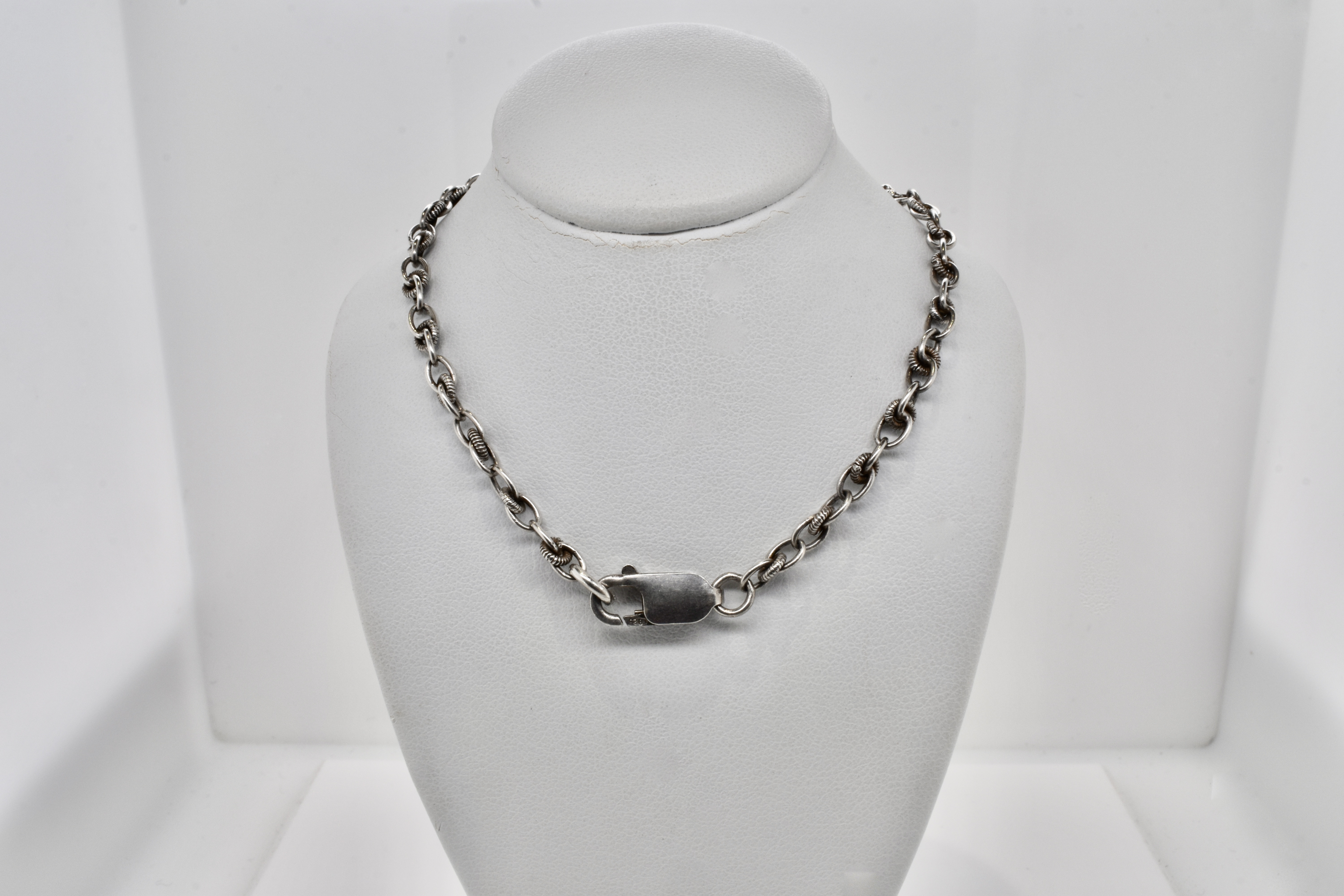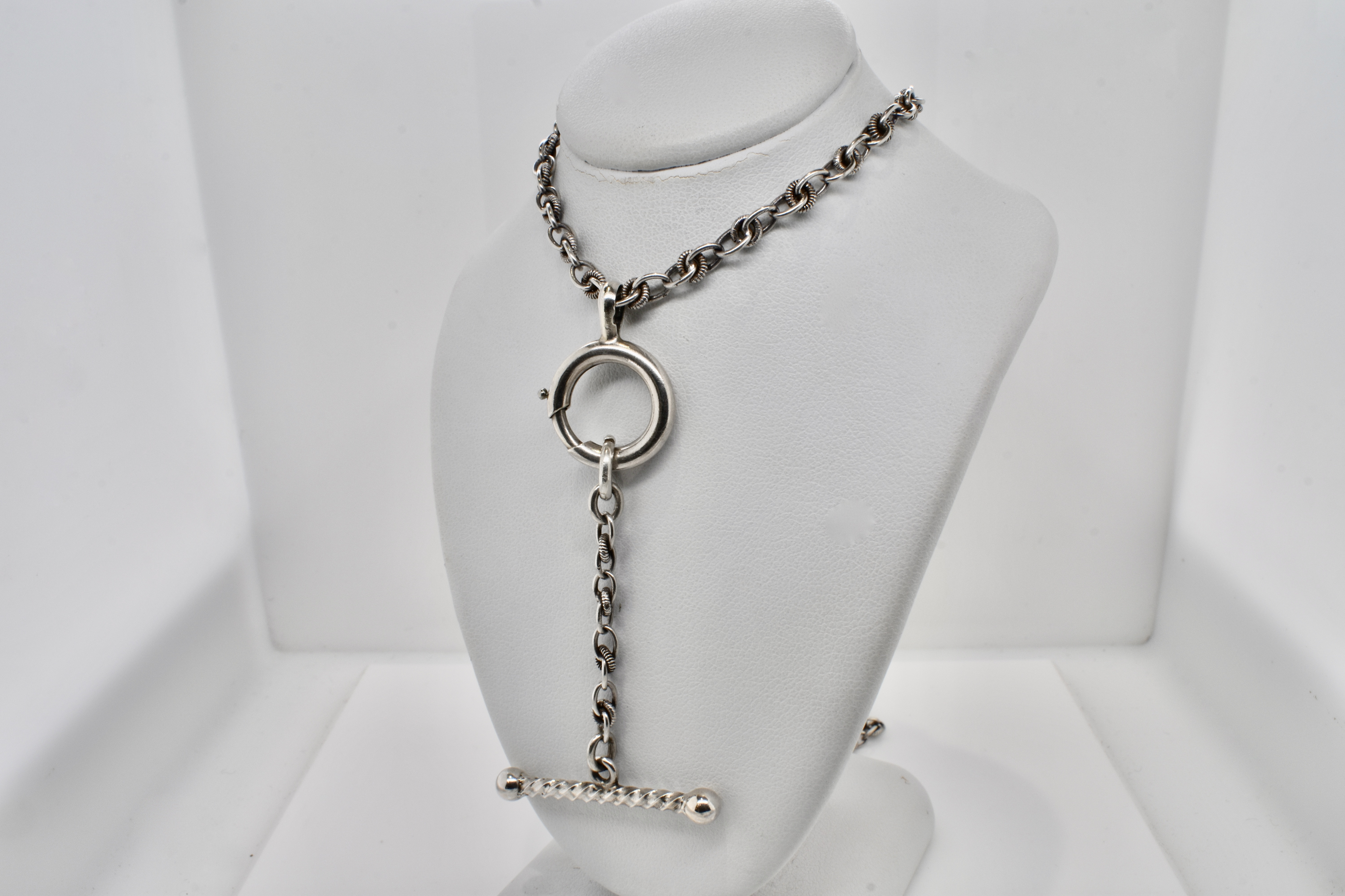 This lovely antique half muff chain is a fancy twist link with an original antique boltring in silver and a removable drop of chain with a pretty twist/ball T-bar pendant, it also has a modern parrot clasp at the back. The chain measures 66cm. Independent Valuation Supplied
