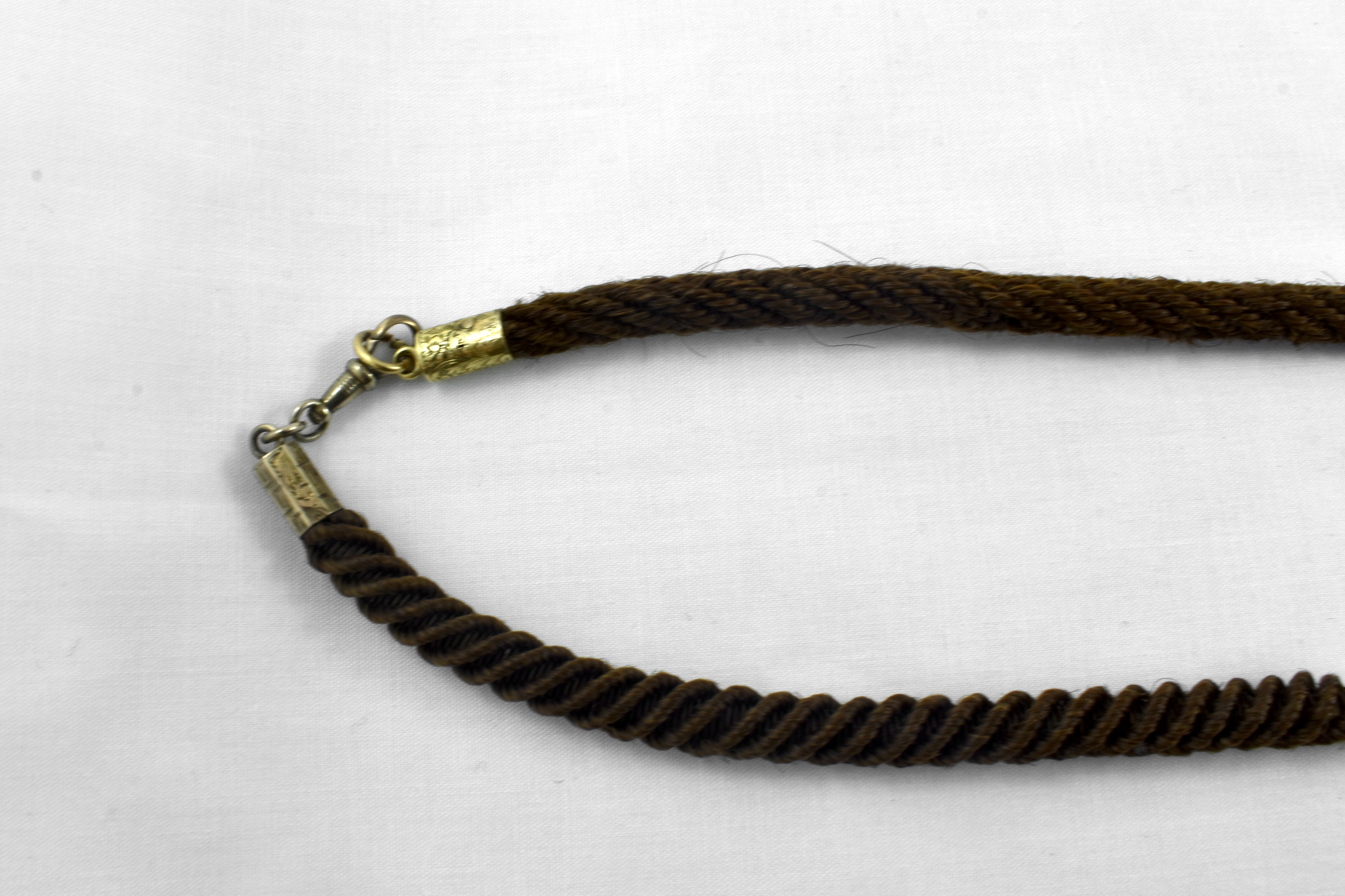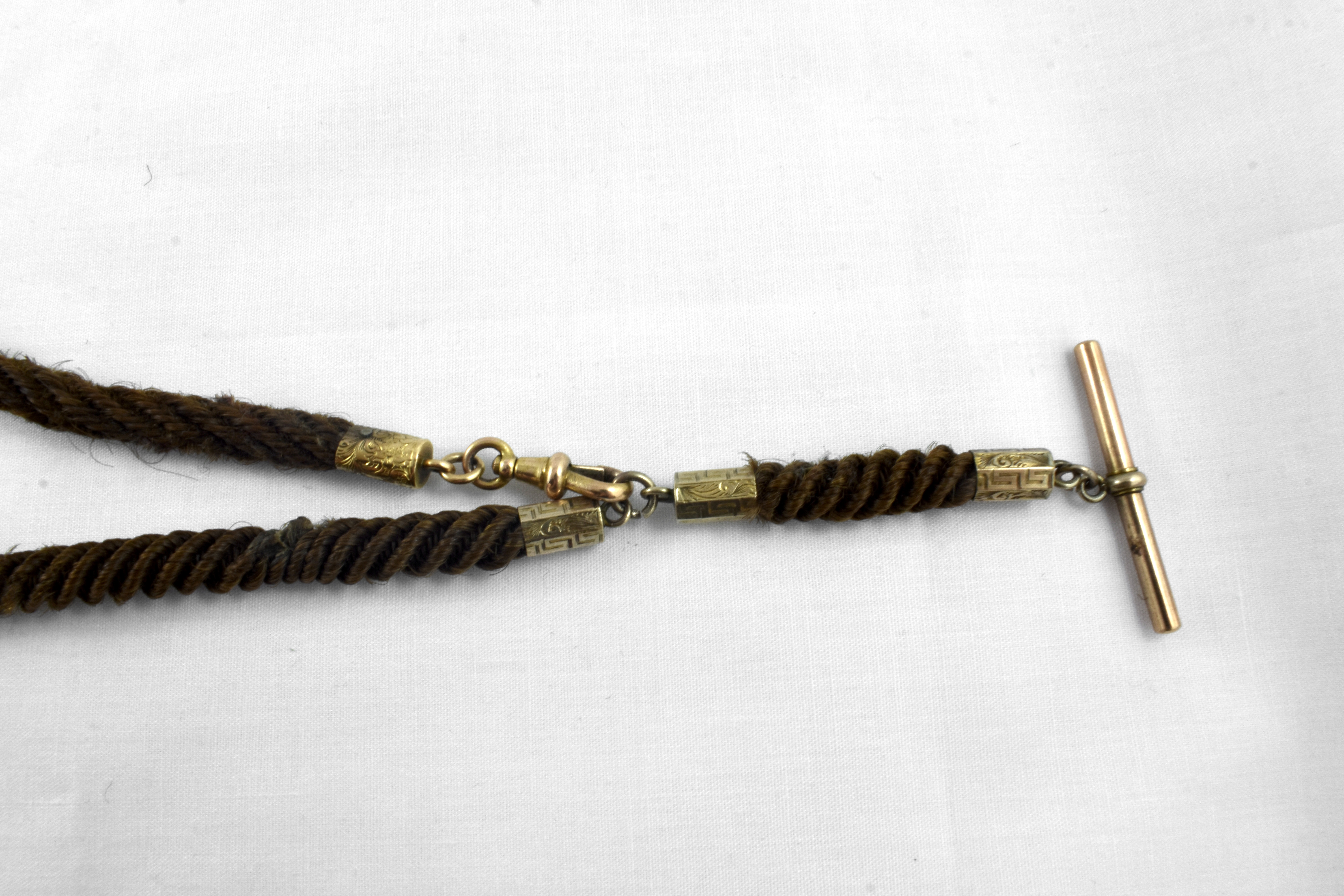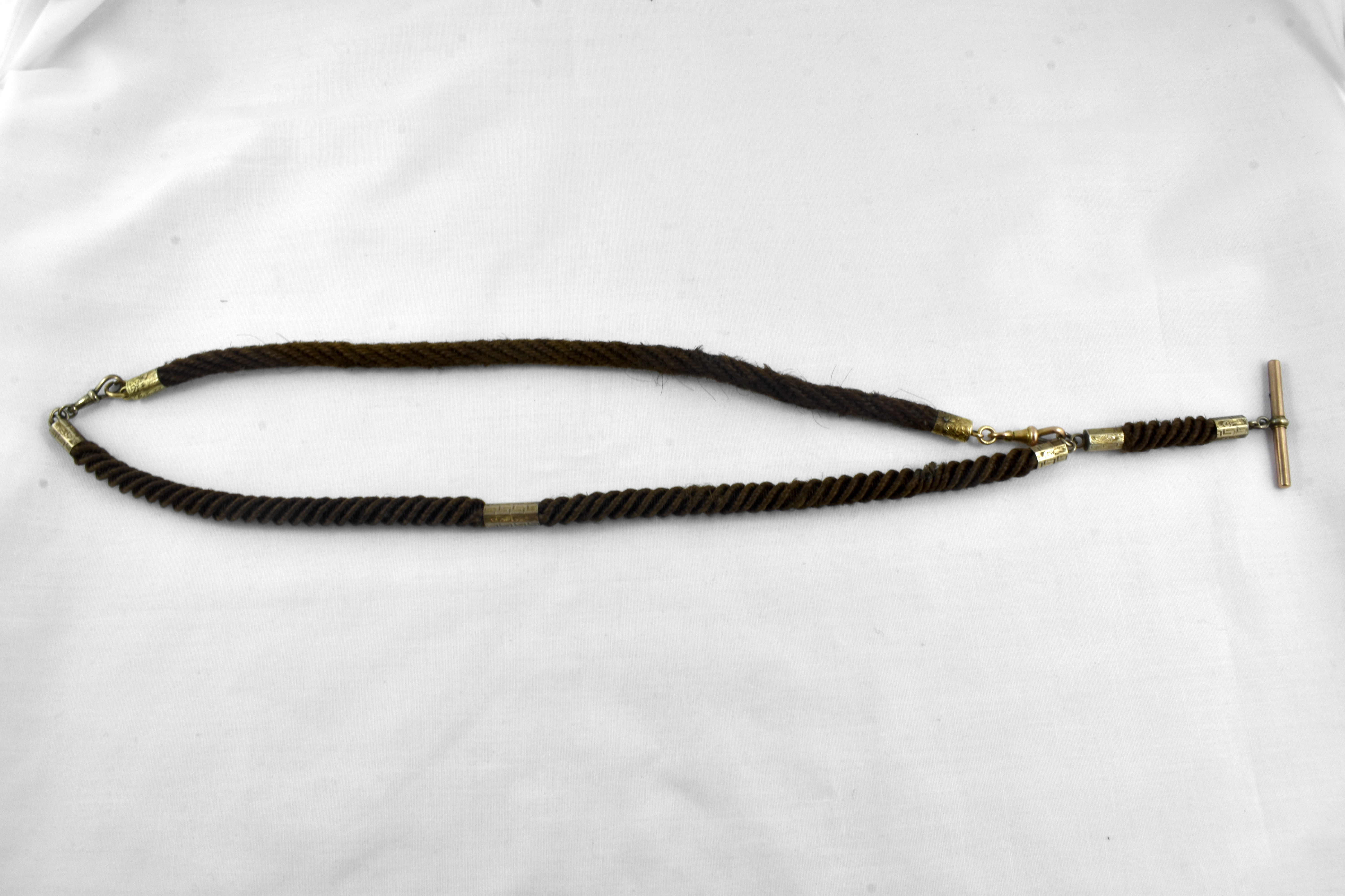 An interestingly crafted piece made from plaited and twisted dark brown hair, with elements of gold coloured metal with a T-bar and two swivels, 61cm in length