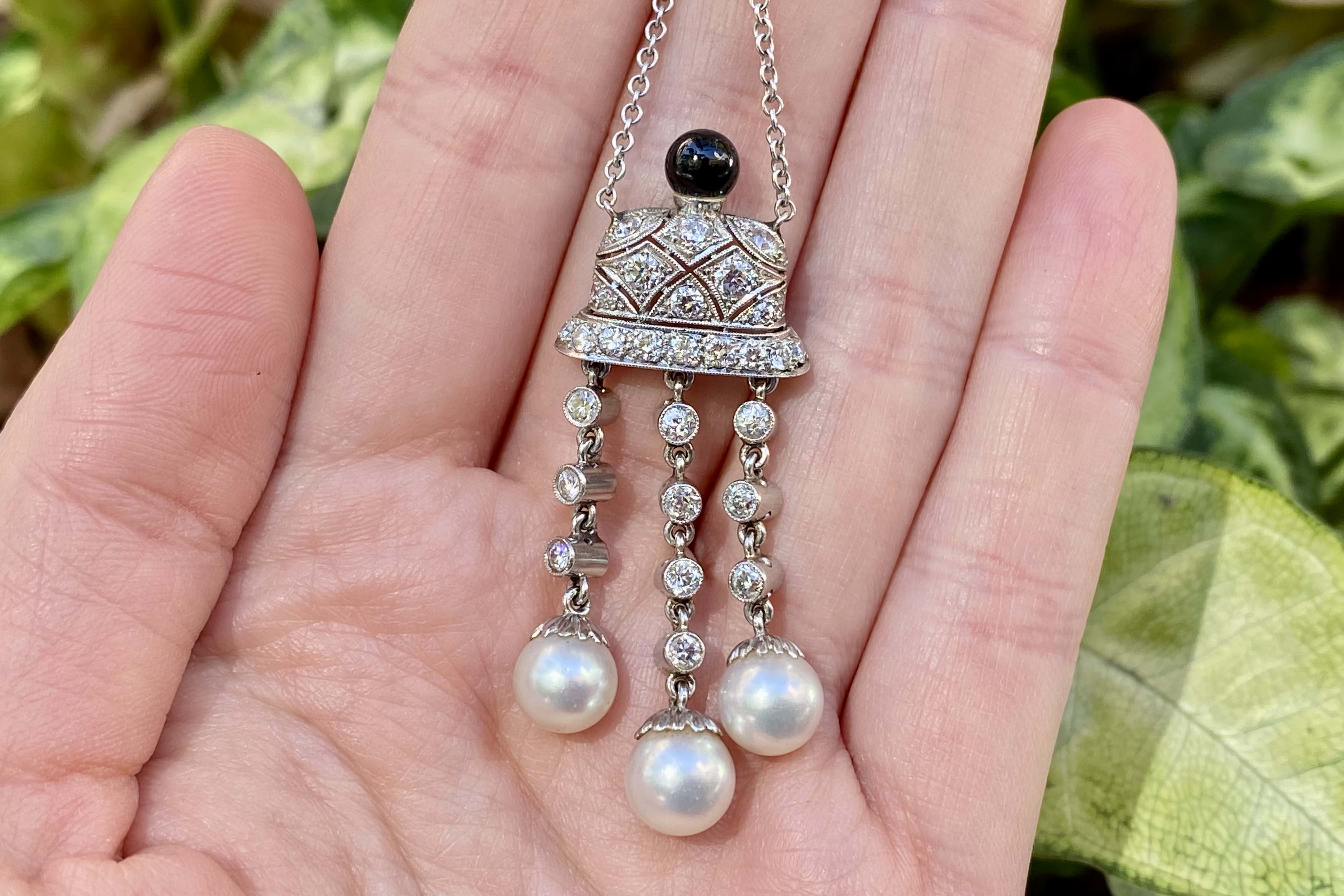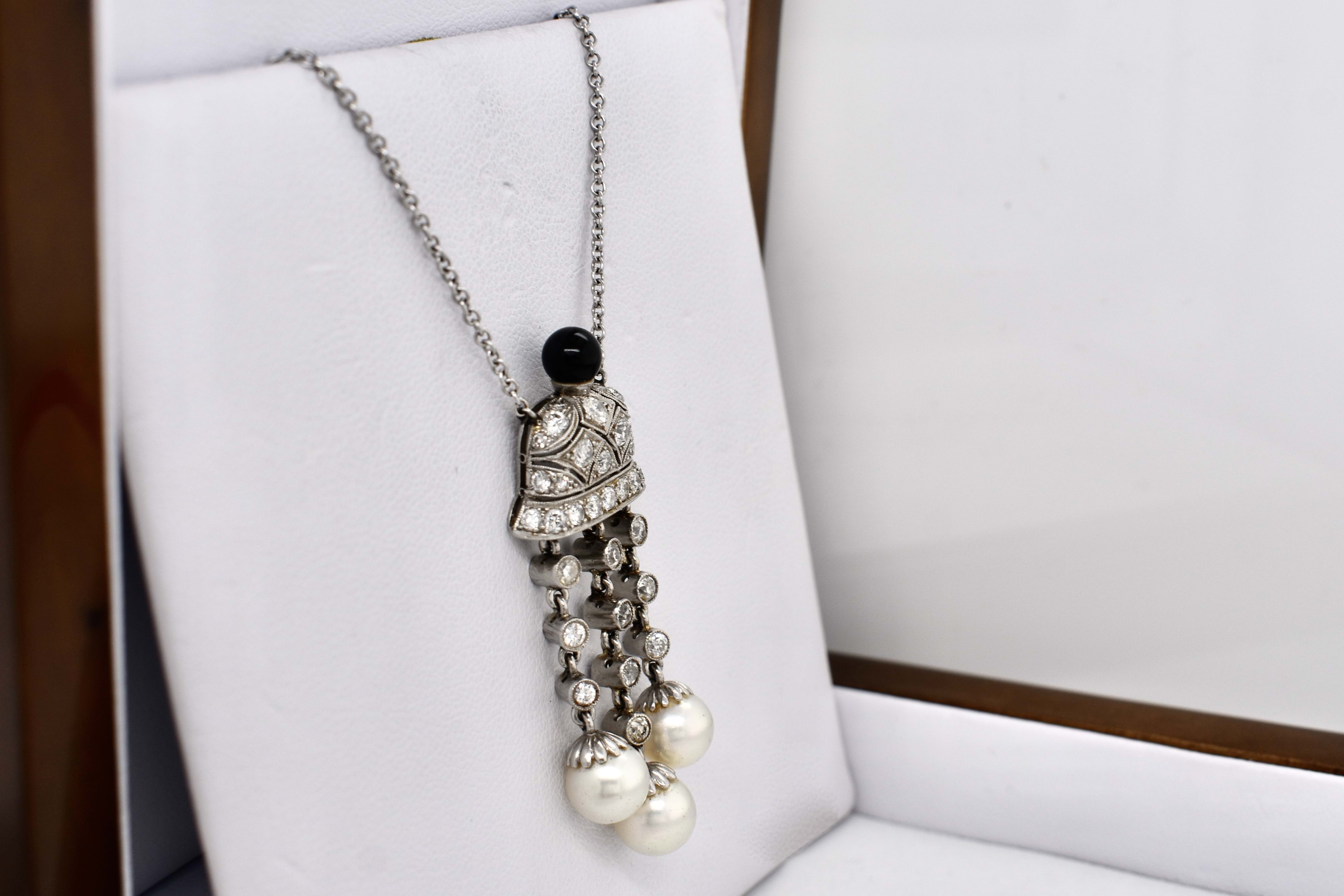 This extraordinary handmade antique lavaliere necklet is dated circa 1930s and crafted in platinum. It features a bell shaped top with a 5.3mm round black onyx ball above it. The bell has a geometric cut out pattern with diamonds throughout. Suspended from the bell are three tassels/drops set with a further 10 diamonds and 7.70-7.40mm Akoya pearls at the bottom. Containing a total of 33 semi modern diamonds, measuring 2.85-1.50mm, totalling 1.35ct FG VS-SI. Attached each side of the beautiful pendant is a 42cm long trace link chain, completed with small bolt ring ends. Independent Valuation Supplied.