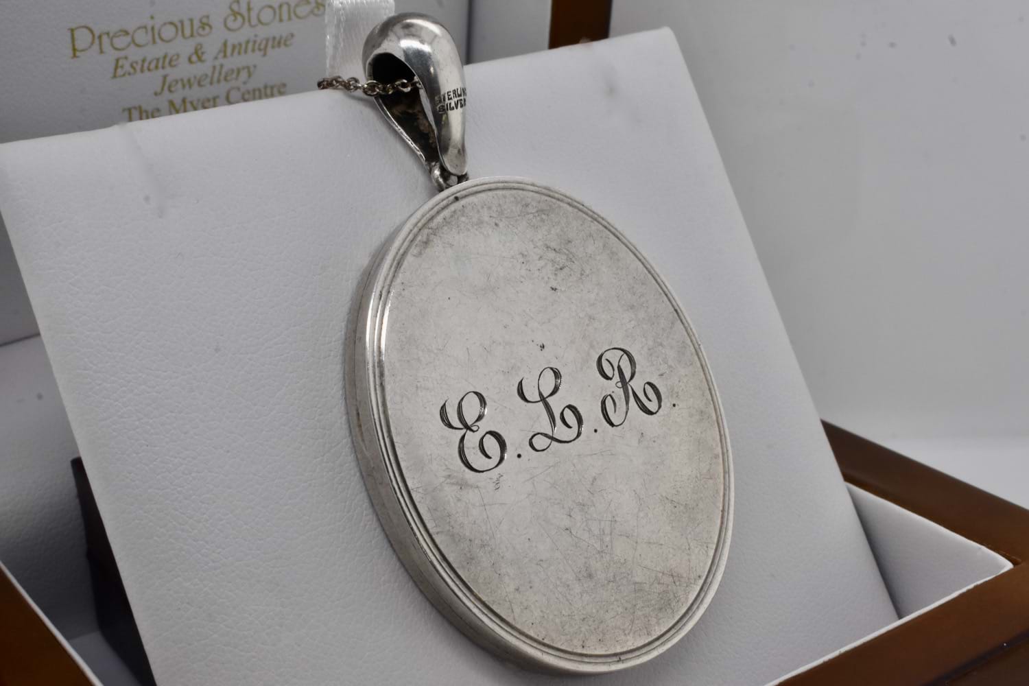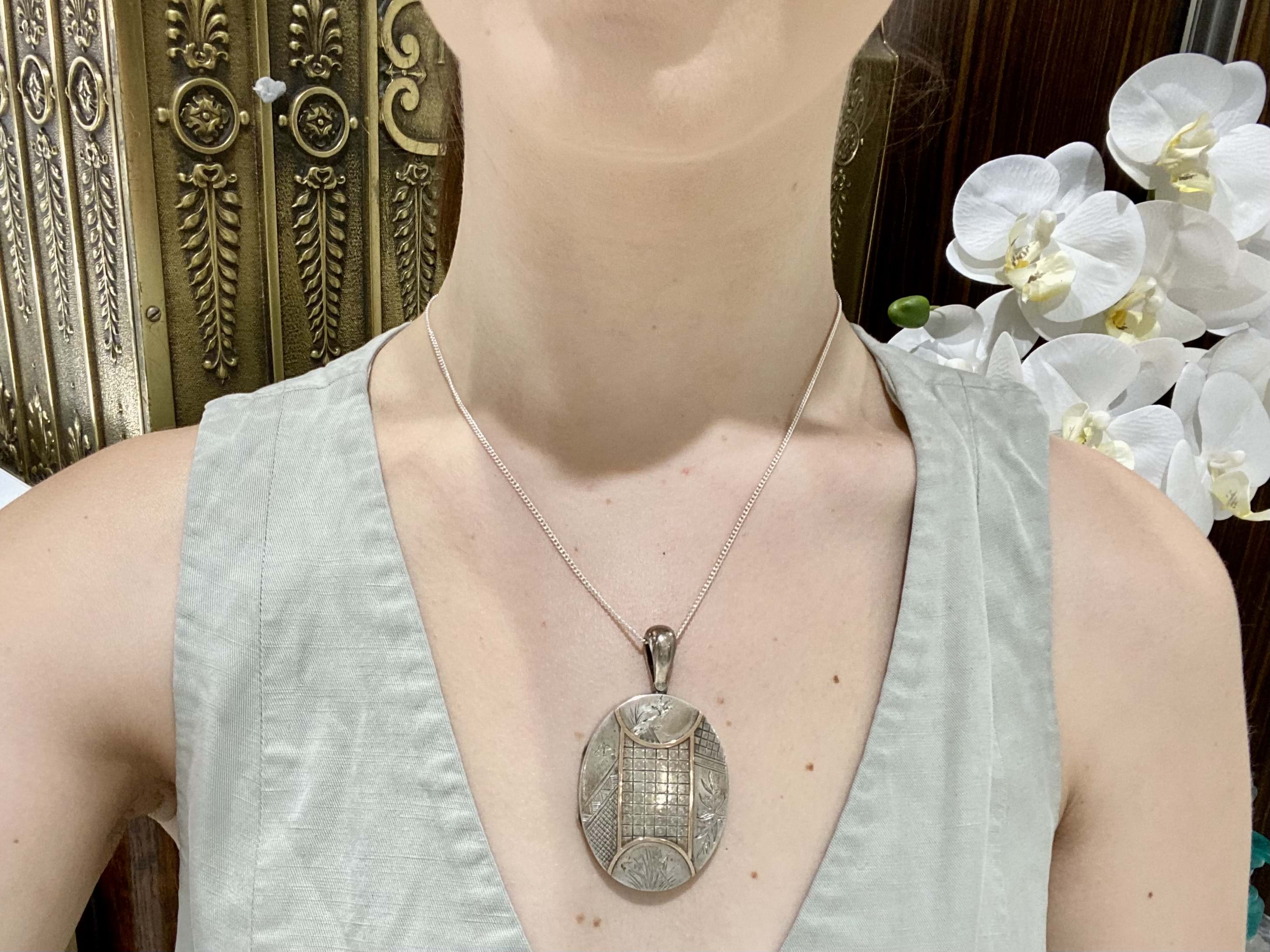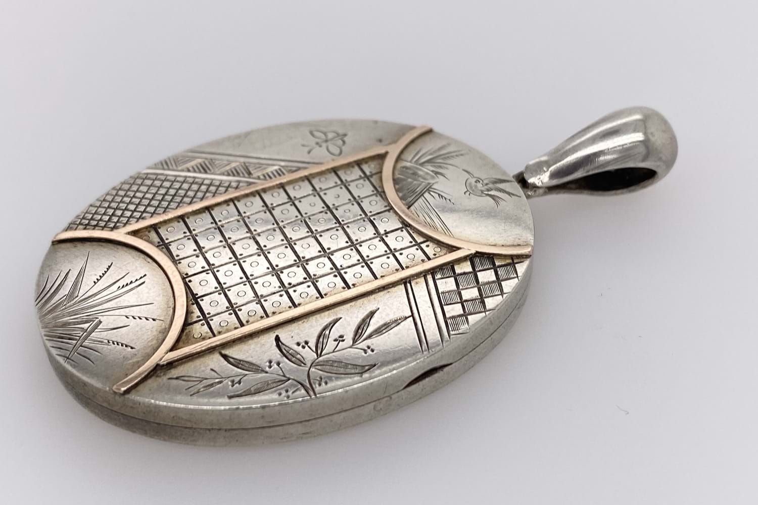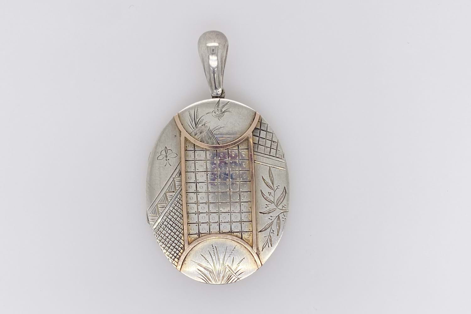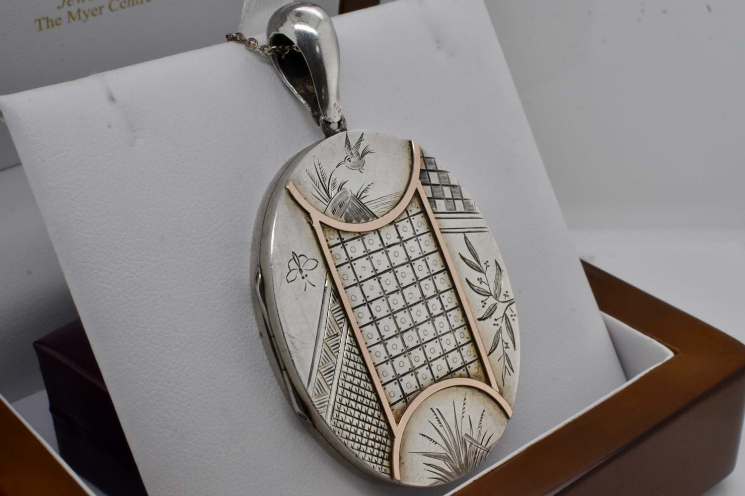 Dated circa 1890's this gorgeous, large, sterling silver locket features a geometric 9ct rose gold wire overlay and a combination of floral and geometric engraving. The locket measures 50x45mm and the back has the initials E.L.R engraved. Independent Valuation Supplied