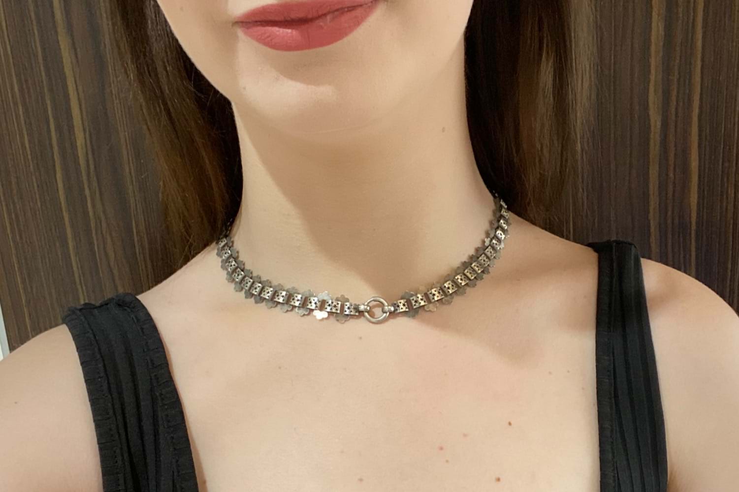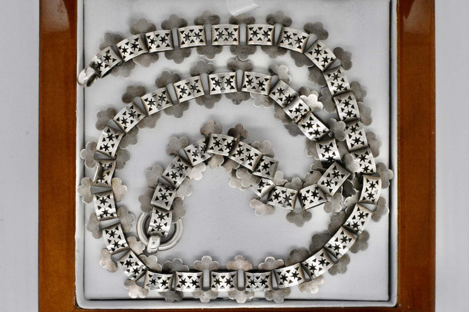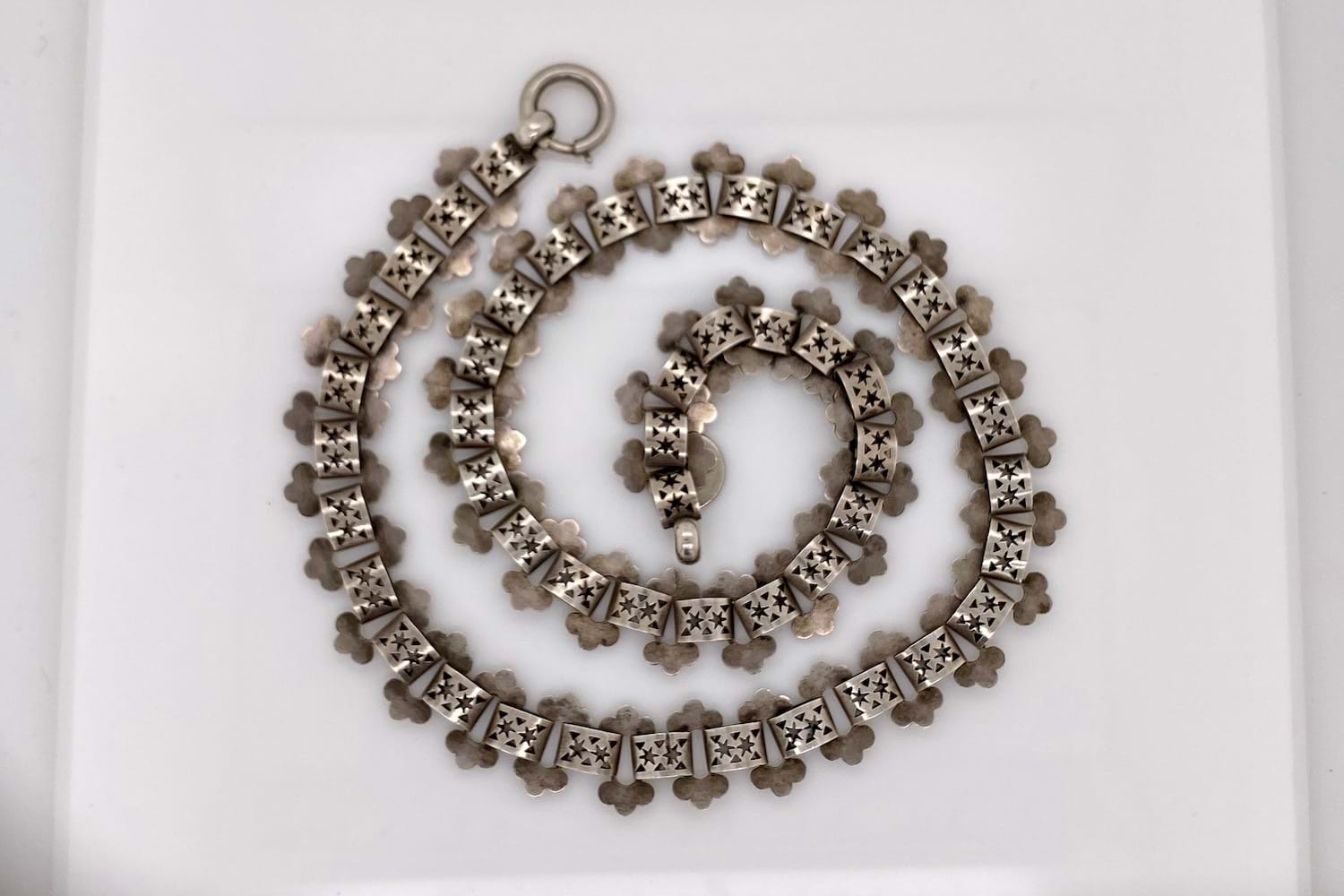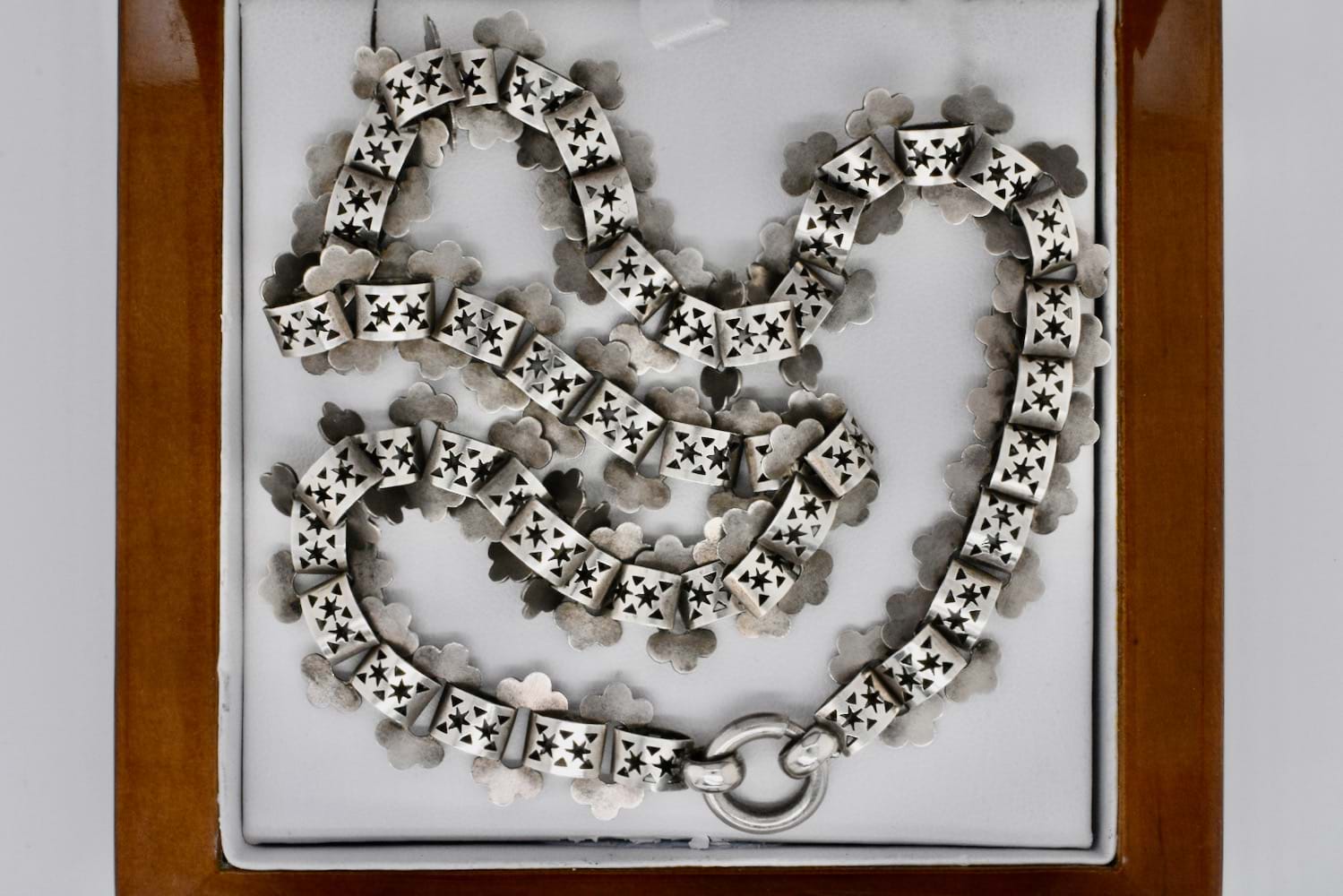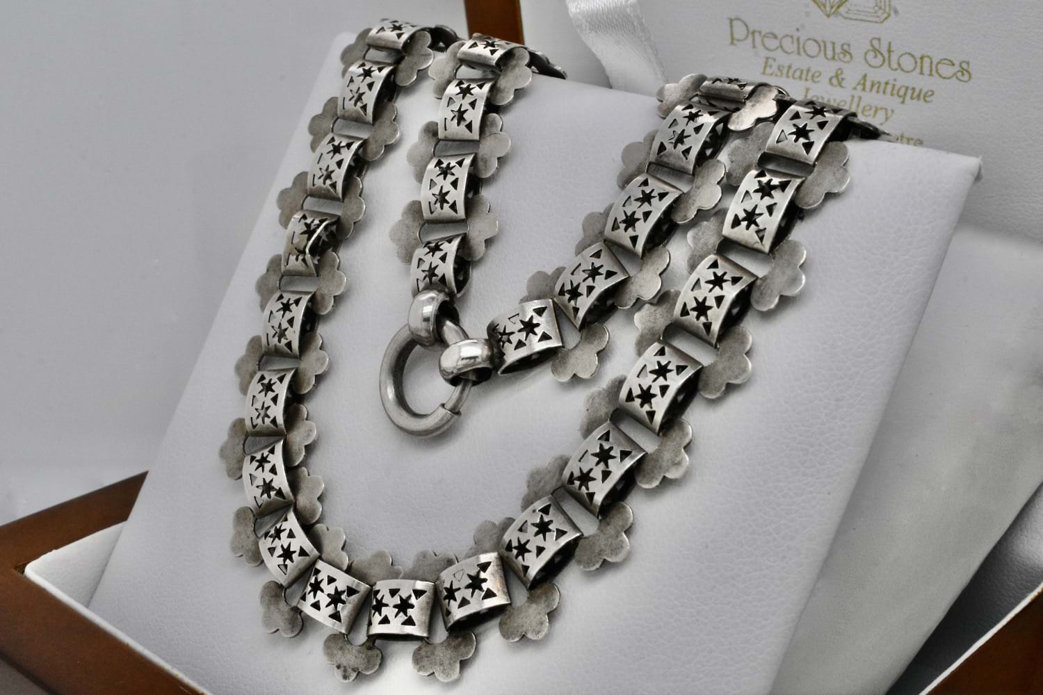 Striking Victorian collar crafted in sterling silver with pierced out star & triangular shapes with scalloped alternate links and a boltring clasp. Length: 43cm Dated circa 1880. Independent Valuation Supplied