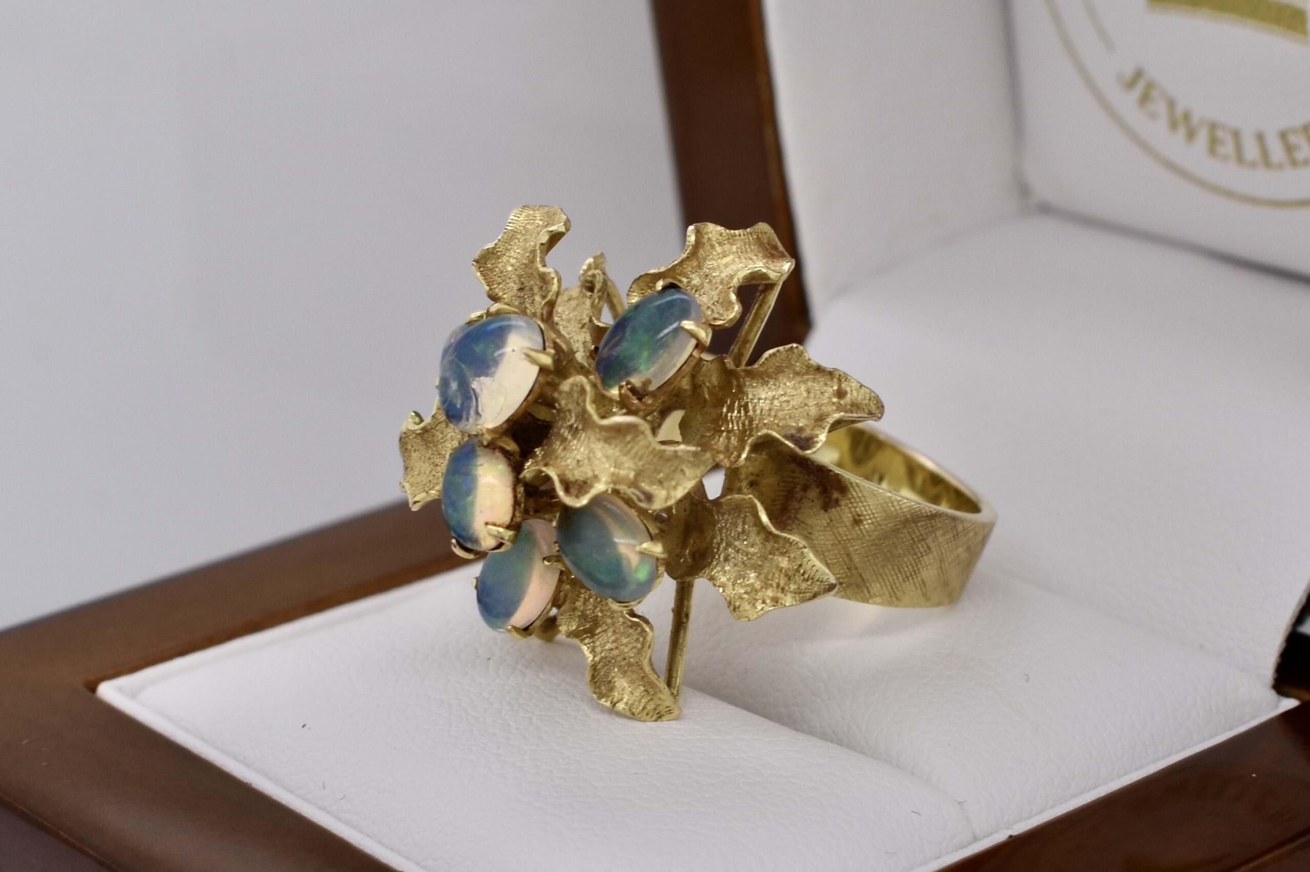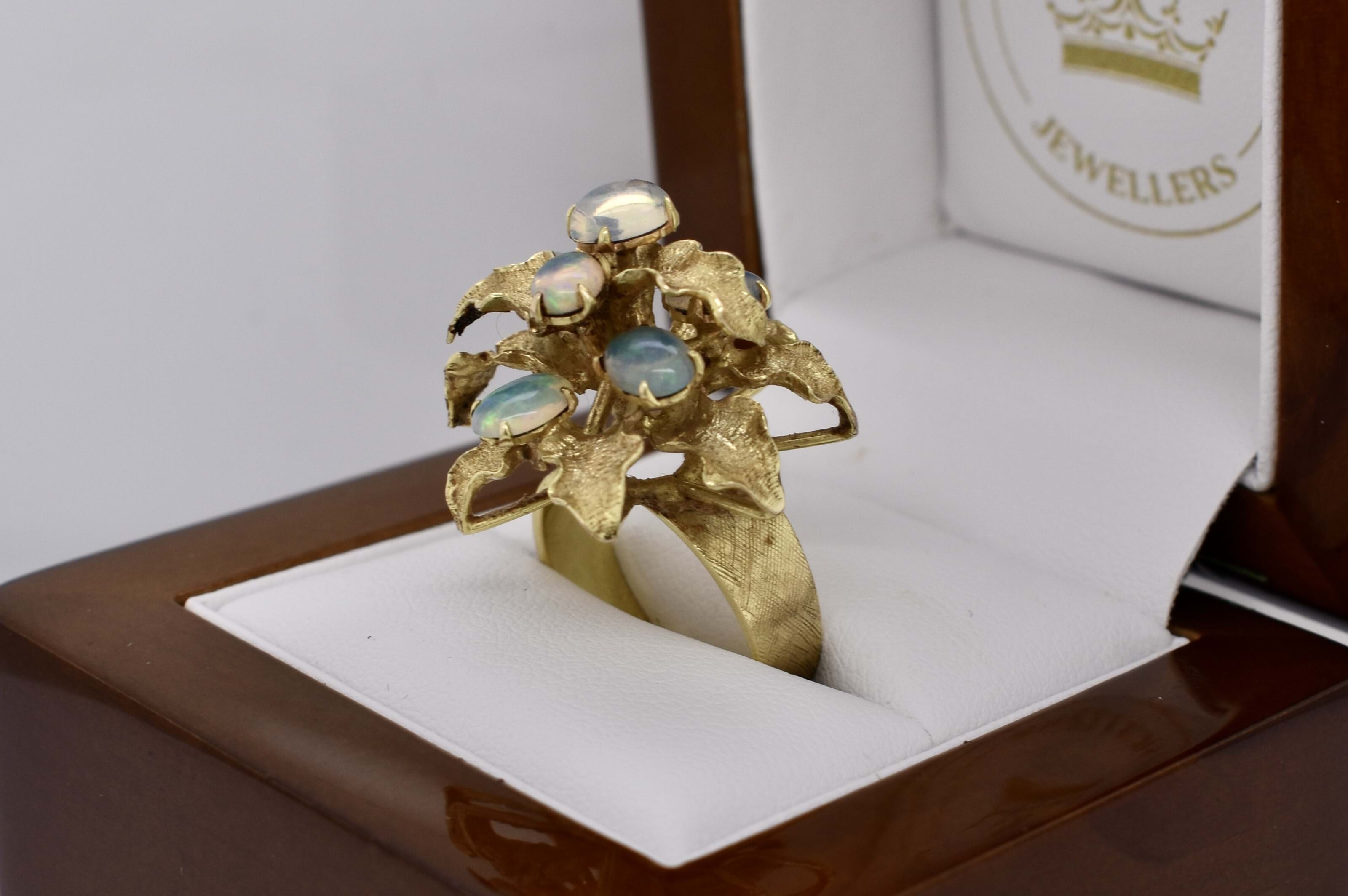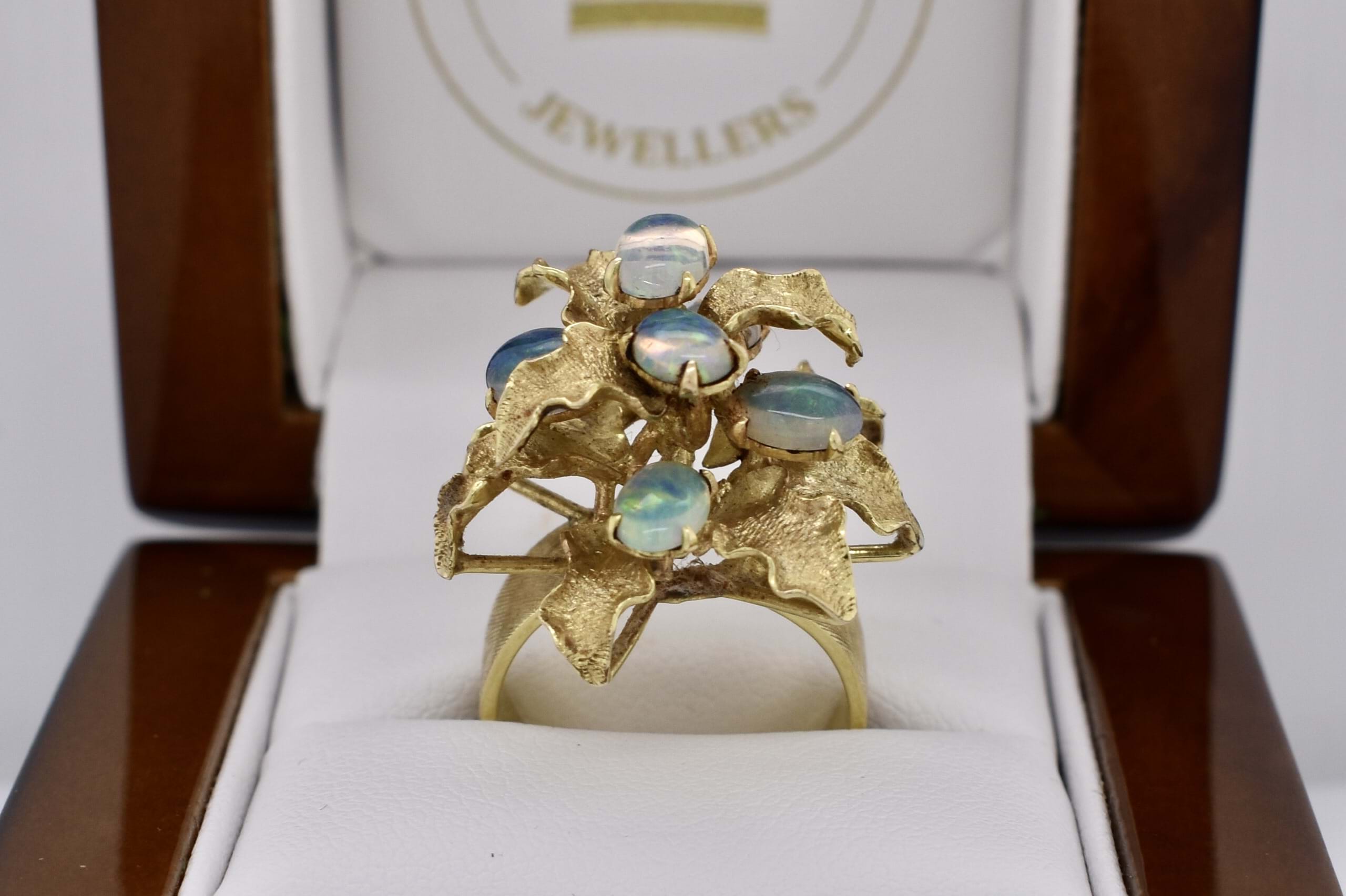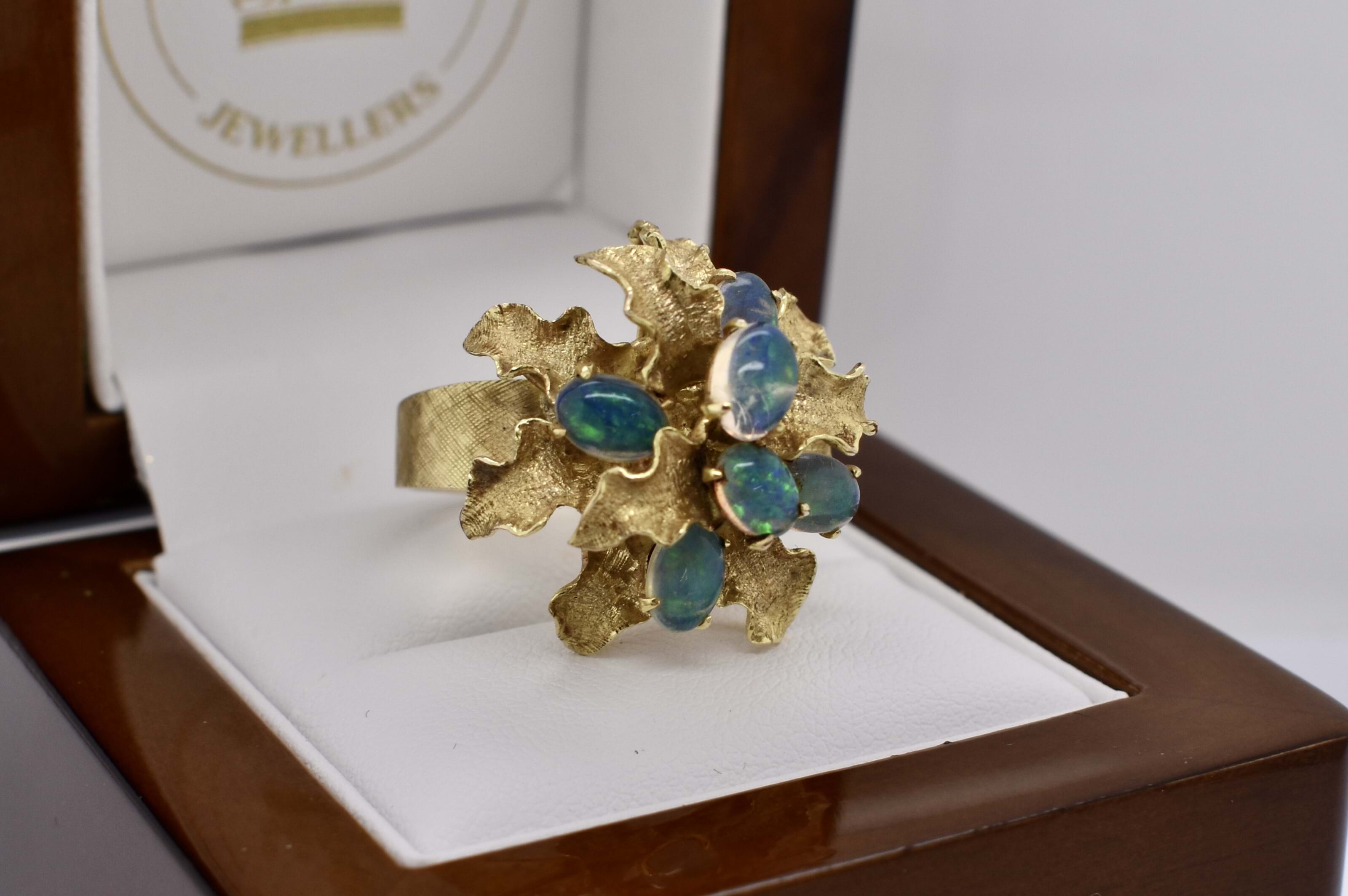 Fun and unique, this gorgeous vintage ring is set in 14ct yellow gold and features 6 cabochon opals, white with blue and green flashes throughout, totalling 1.70ct. The opals measure 6.00x4.15x2.35 - 5.05x3.90x1.85mm and one has a chip. The facsinating ring is sure to stand out with its scalloped textured leaf design surround on a florentine textured 4.17mm tapered band. Finger size M. Independent Valuation Supplied.