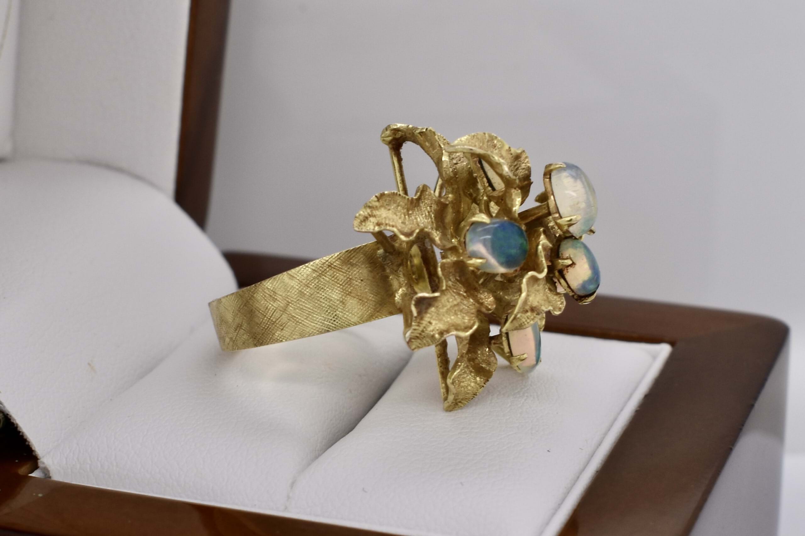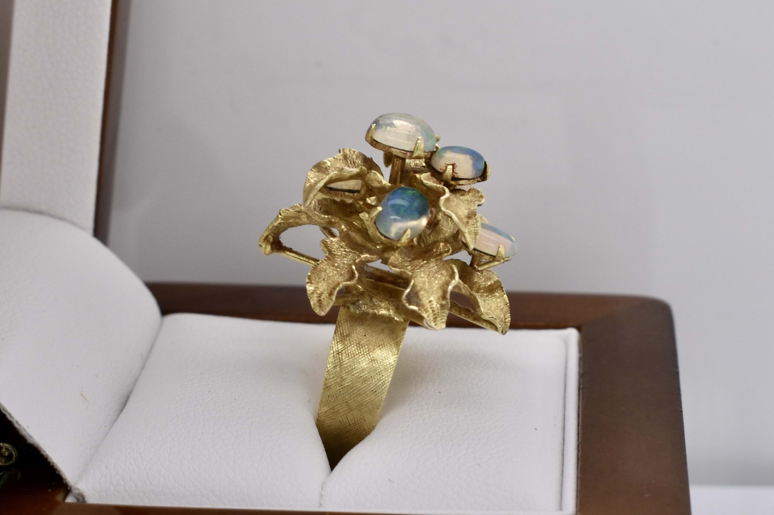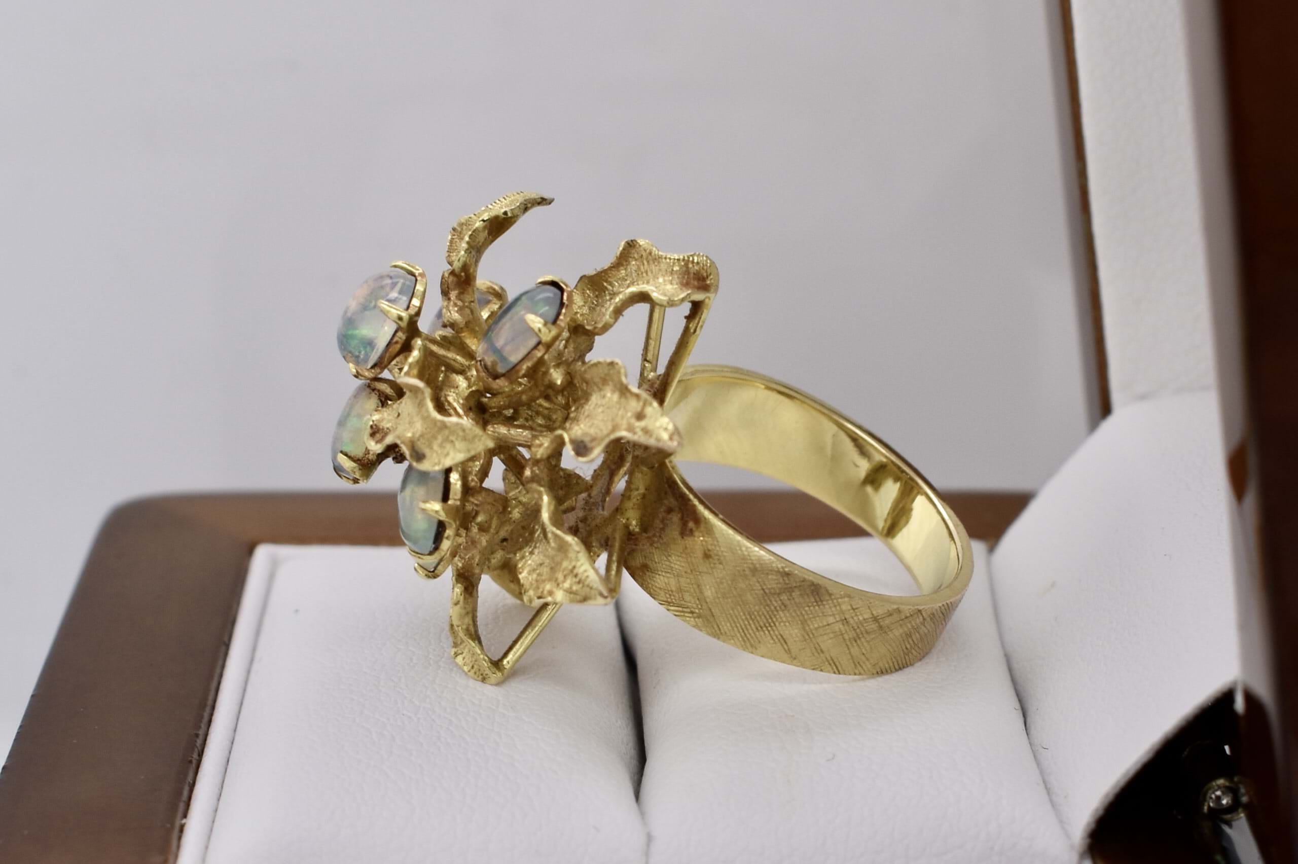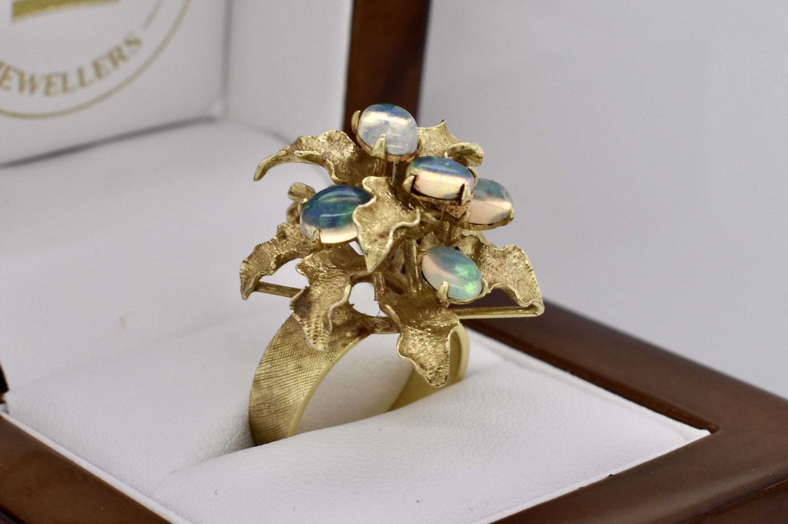 Fun and unique, this gorgeous vintage ring is set in 14ct yellow gold and features 6 cabochon opals, white with blue and green flashes throughout, totalling 1.70ct. The opals measure 6.00x4.15x2.35 - 5.05x3.90x1.85mm and one has a chip. The facsinating ring is sure to stand out with its scalloped textured leaf design surround on a florentine textured 4.17mm tapered band. Finger size M. Independent Valuation Supplied.