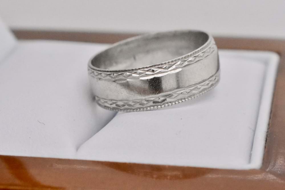 Featuring a pretty etched border this wide, 6mm, 18ct white gold band is hallmarked London 1978. Finger size L+