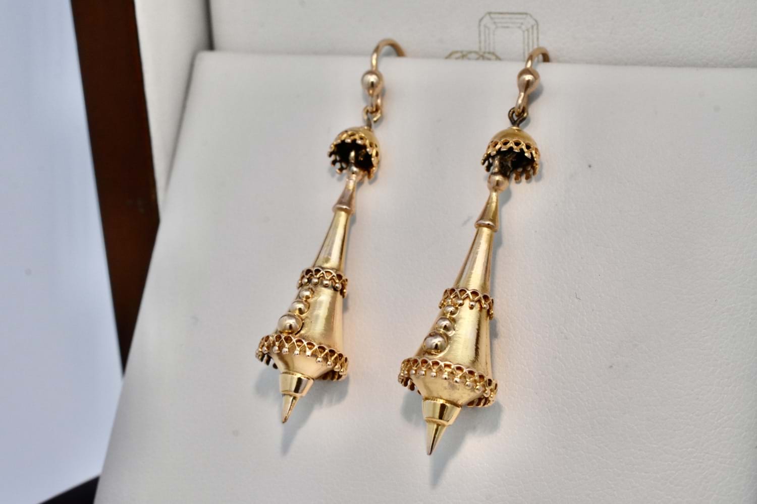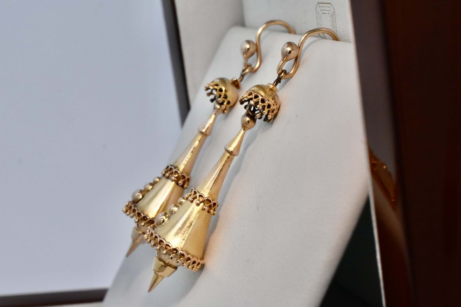 Striking antique earrings crafted in 15ct yellow gold with intricate wire and beading work in a long Etruscan style drop, dated circa 1880's. Length 5cm (including hook). Independent Valuation Supplied