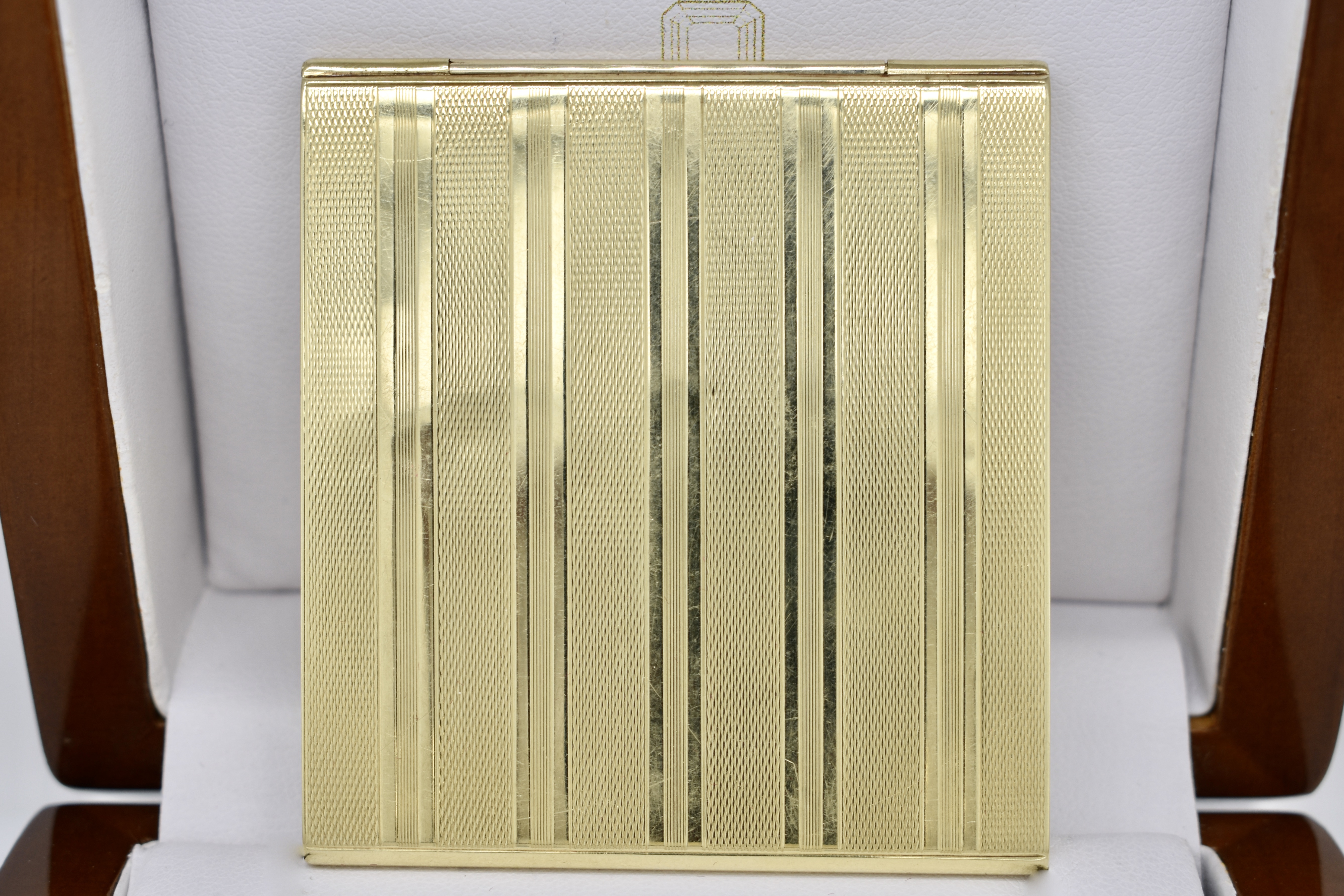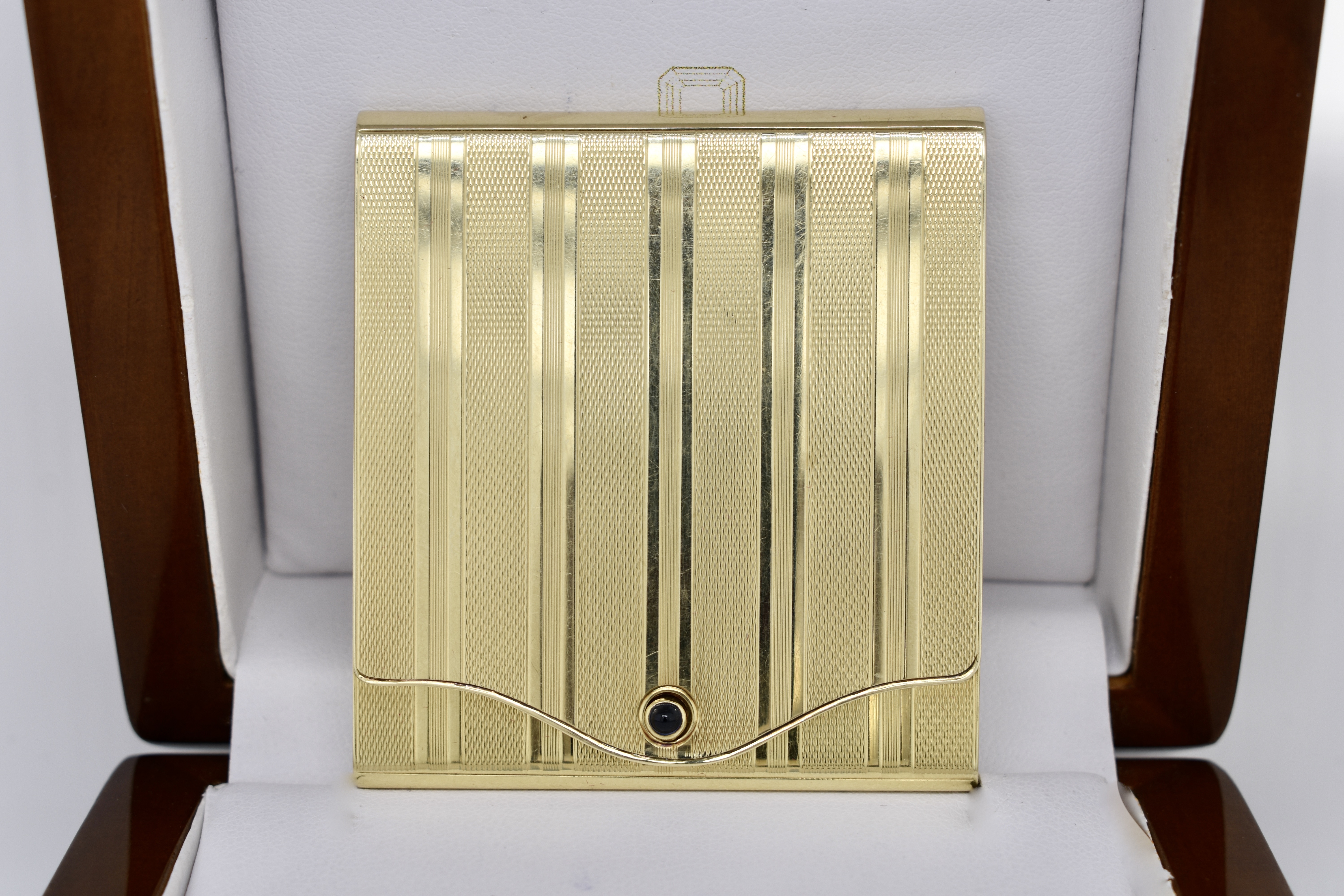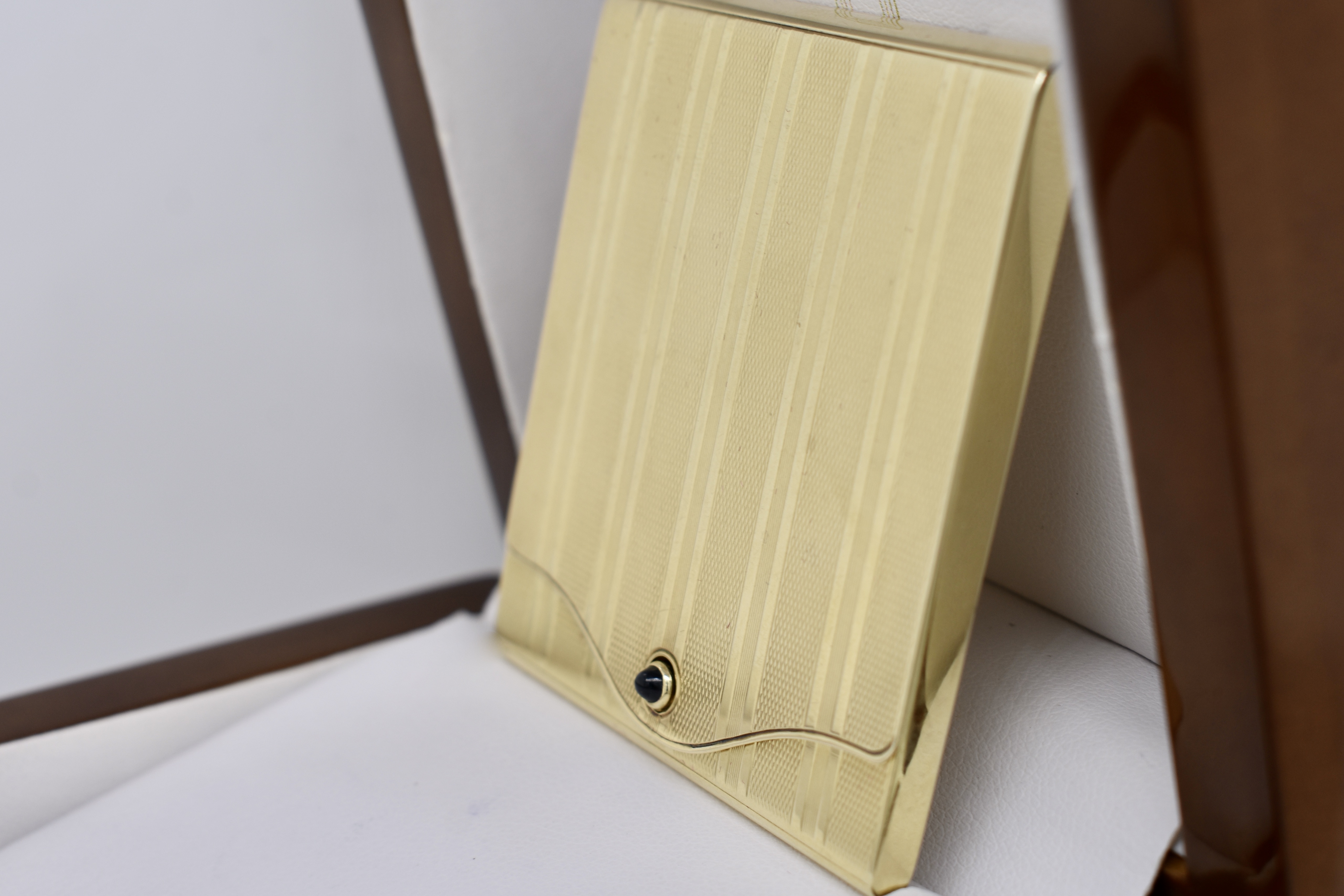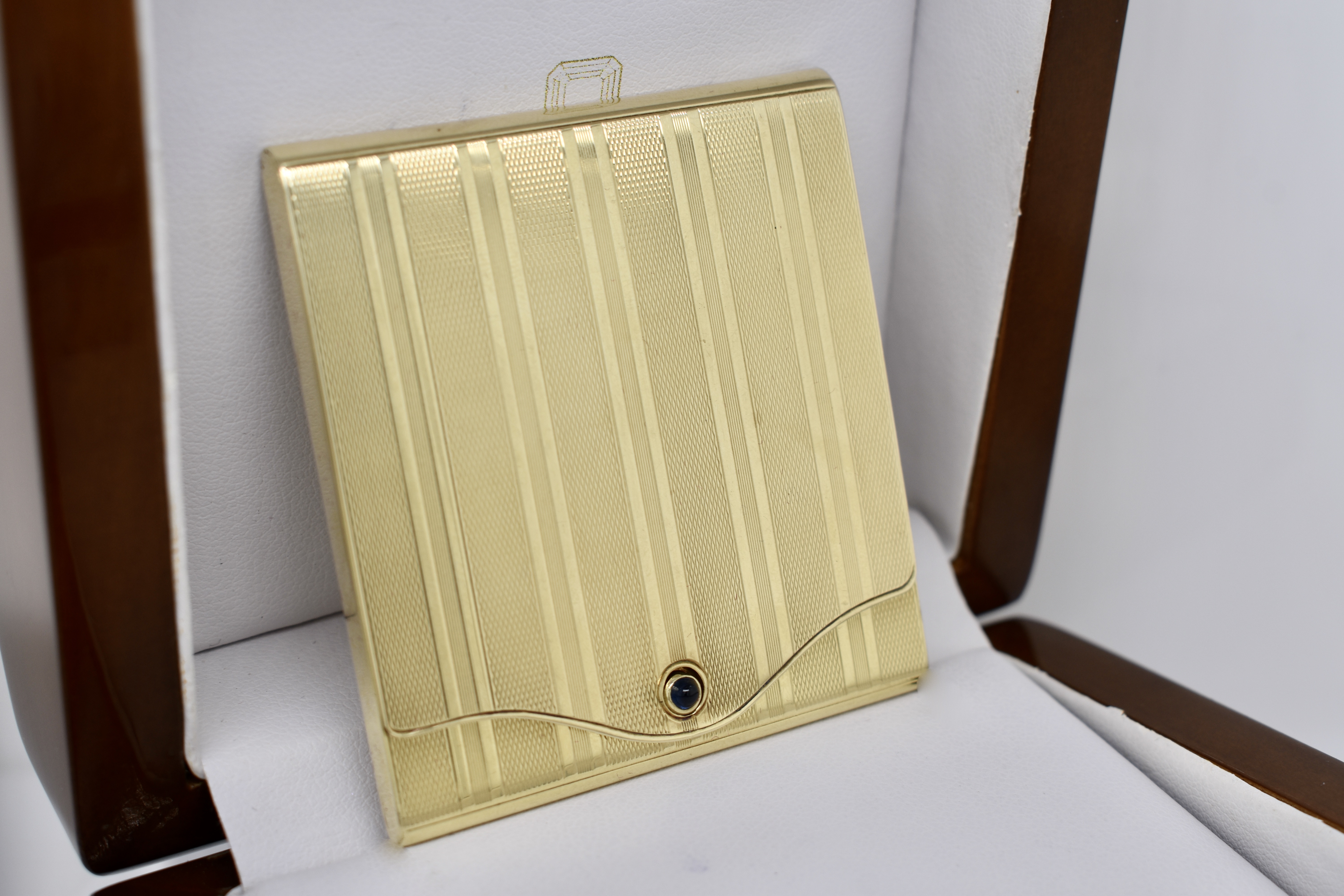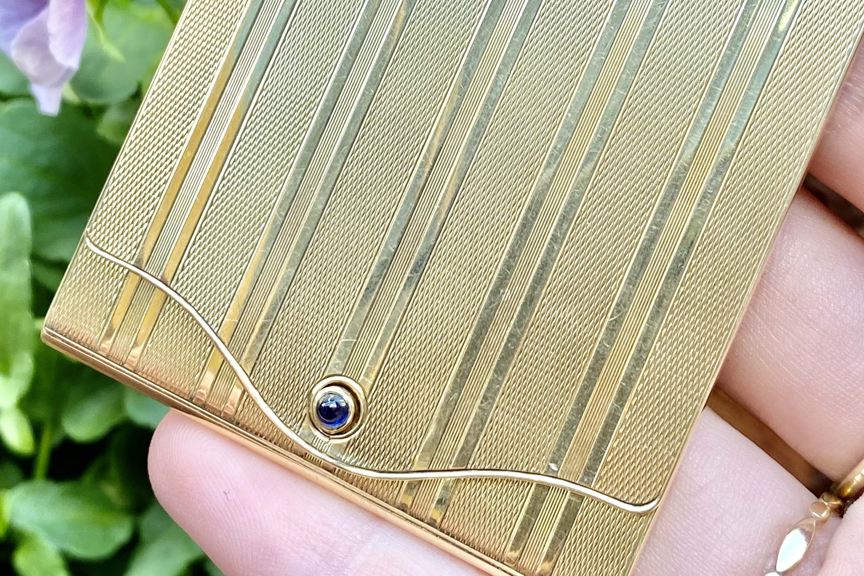 Elegant and stunning engine turned 14ct yellow gold antique calling card case with a pin stripe pattern and a round cabochon 0.18ct dark blue sapphire. This antique calling card case is dated circa 1915 and measures 58x53.5mm. Independent Valuation Supplied