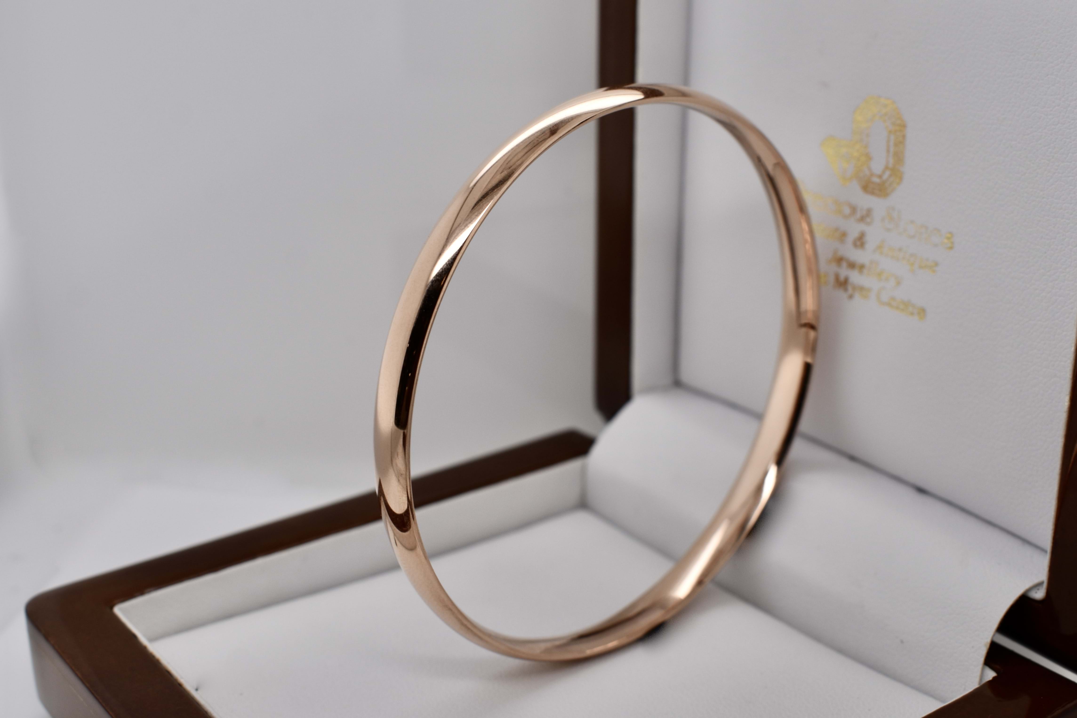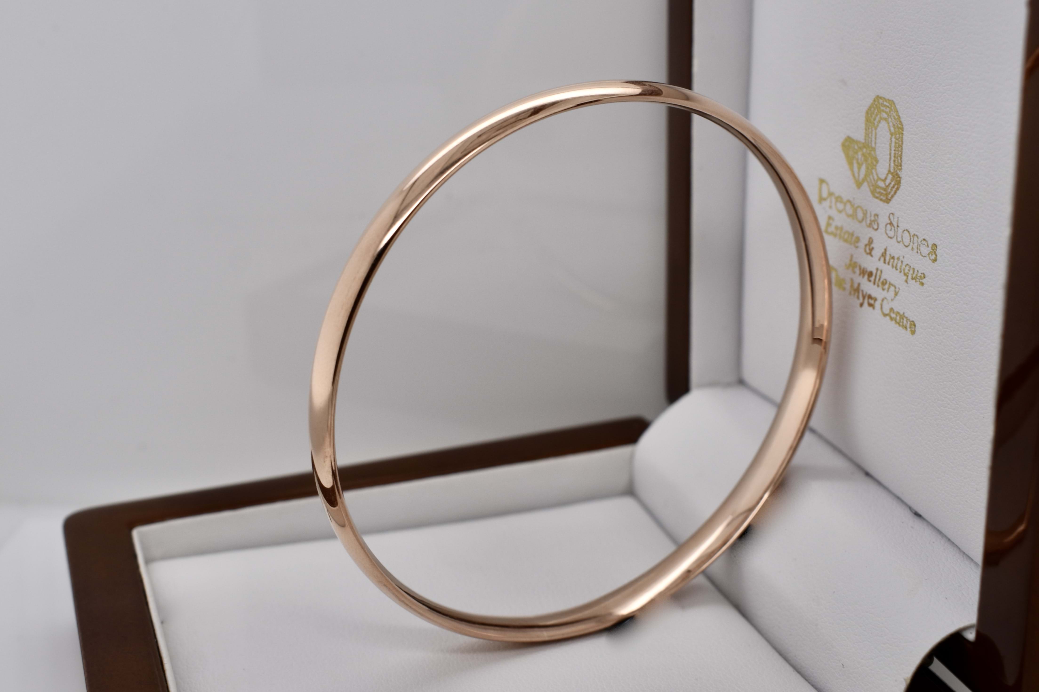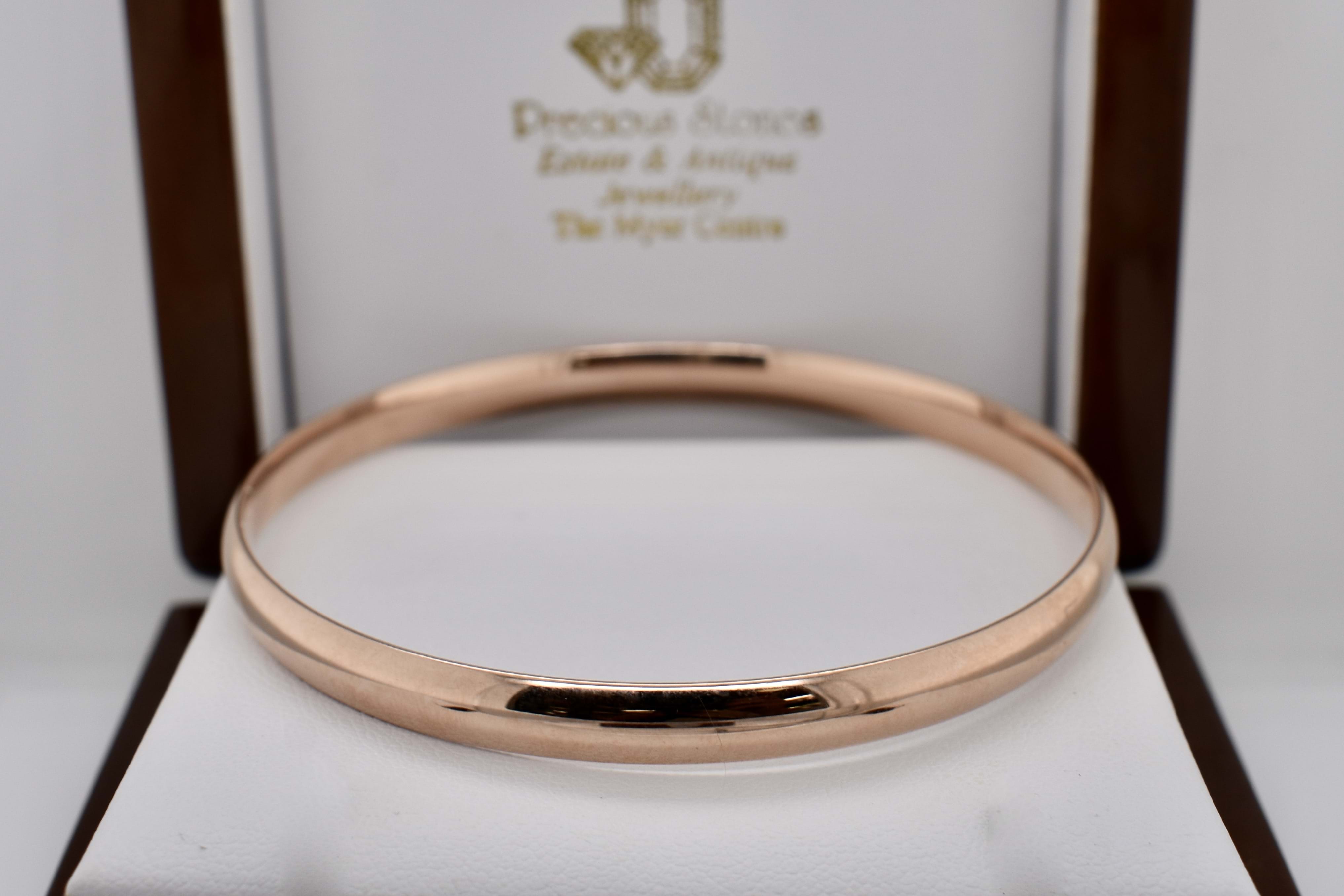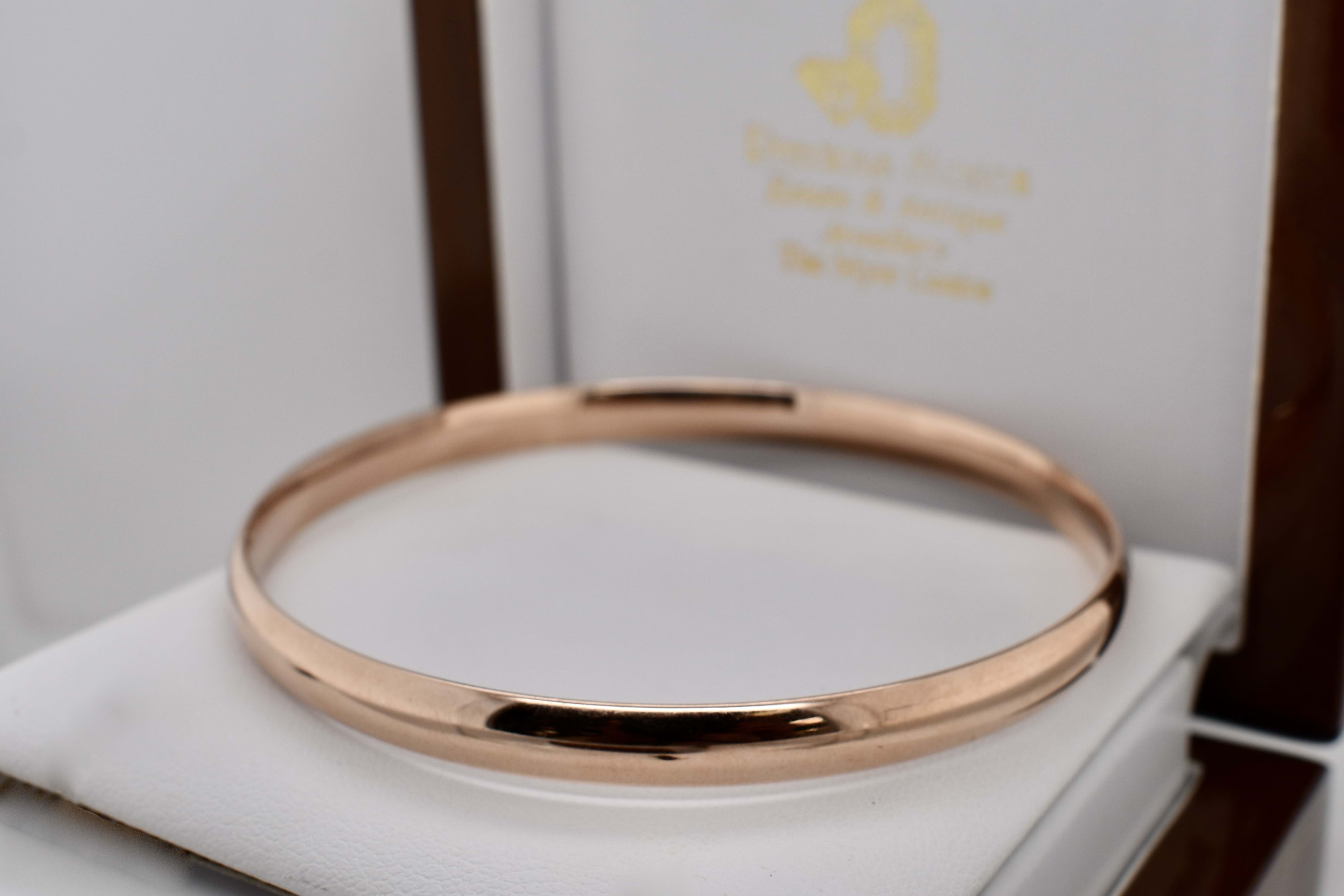 A classic and timeless jewellery collection staple, this solid round bangle has been crafted in 9ct rose gold with a comfort profile and depth of 2.25mm. Bangle is hand size 65mm and 5.7mm wide with a weight of 24.93grams.