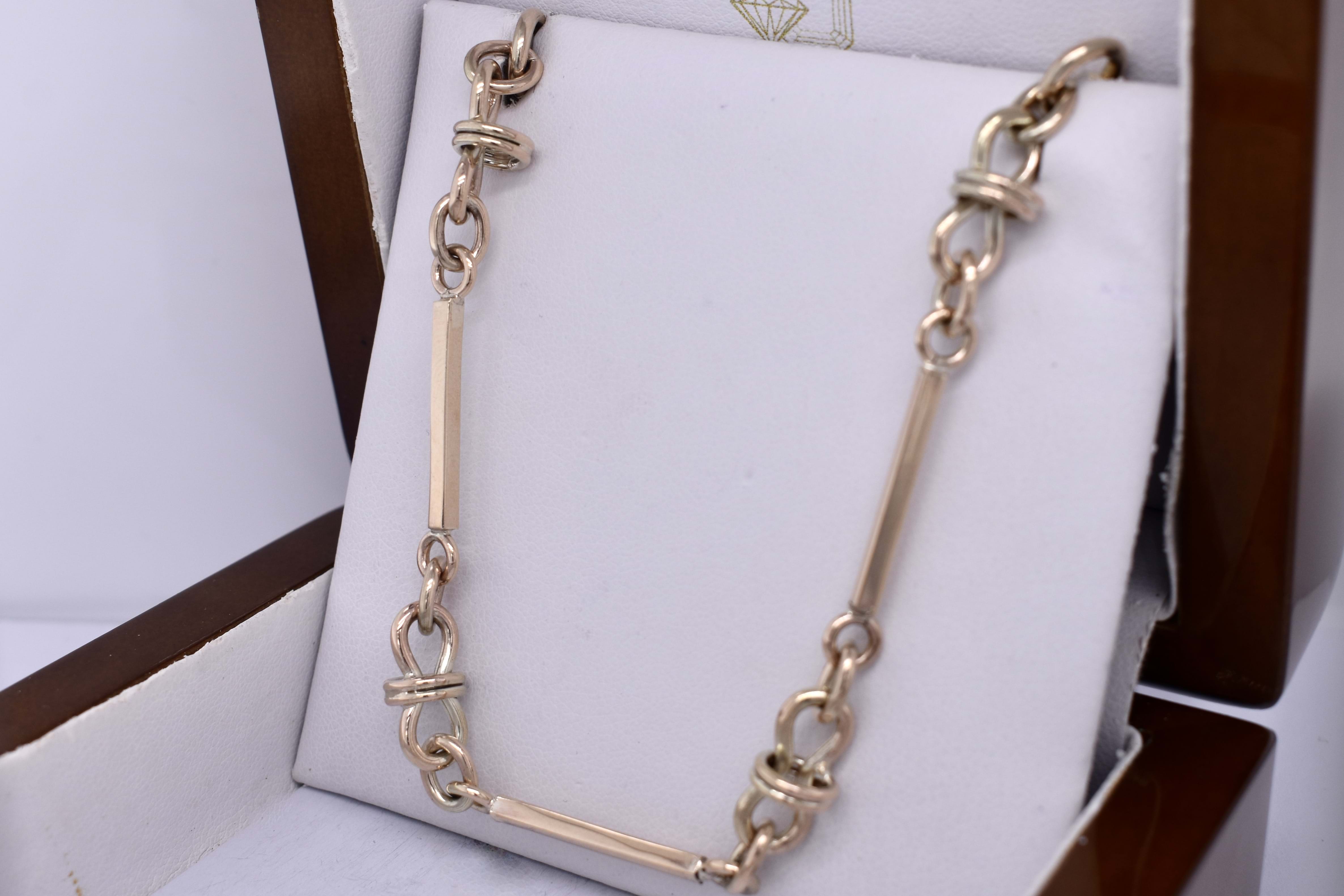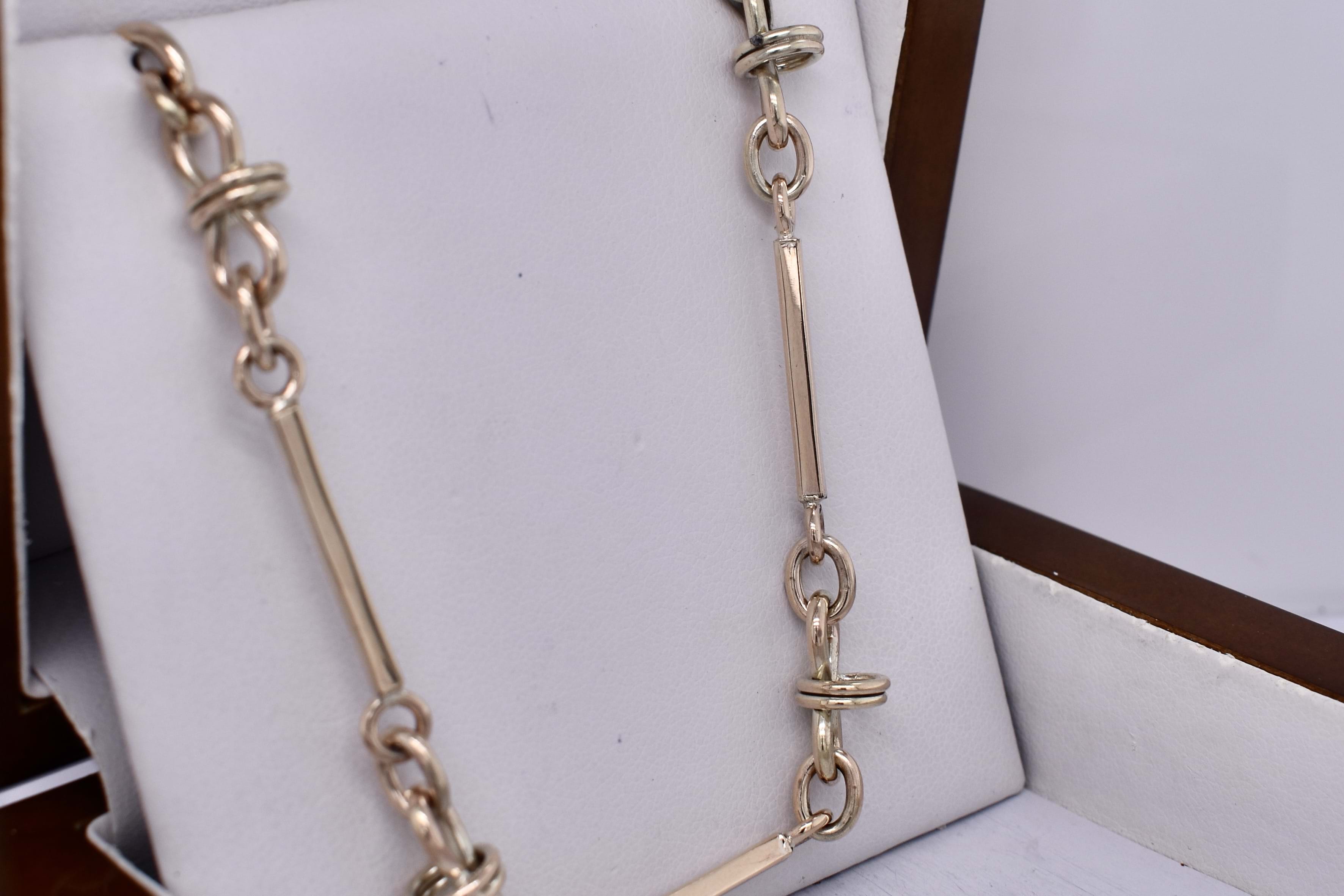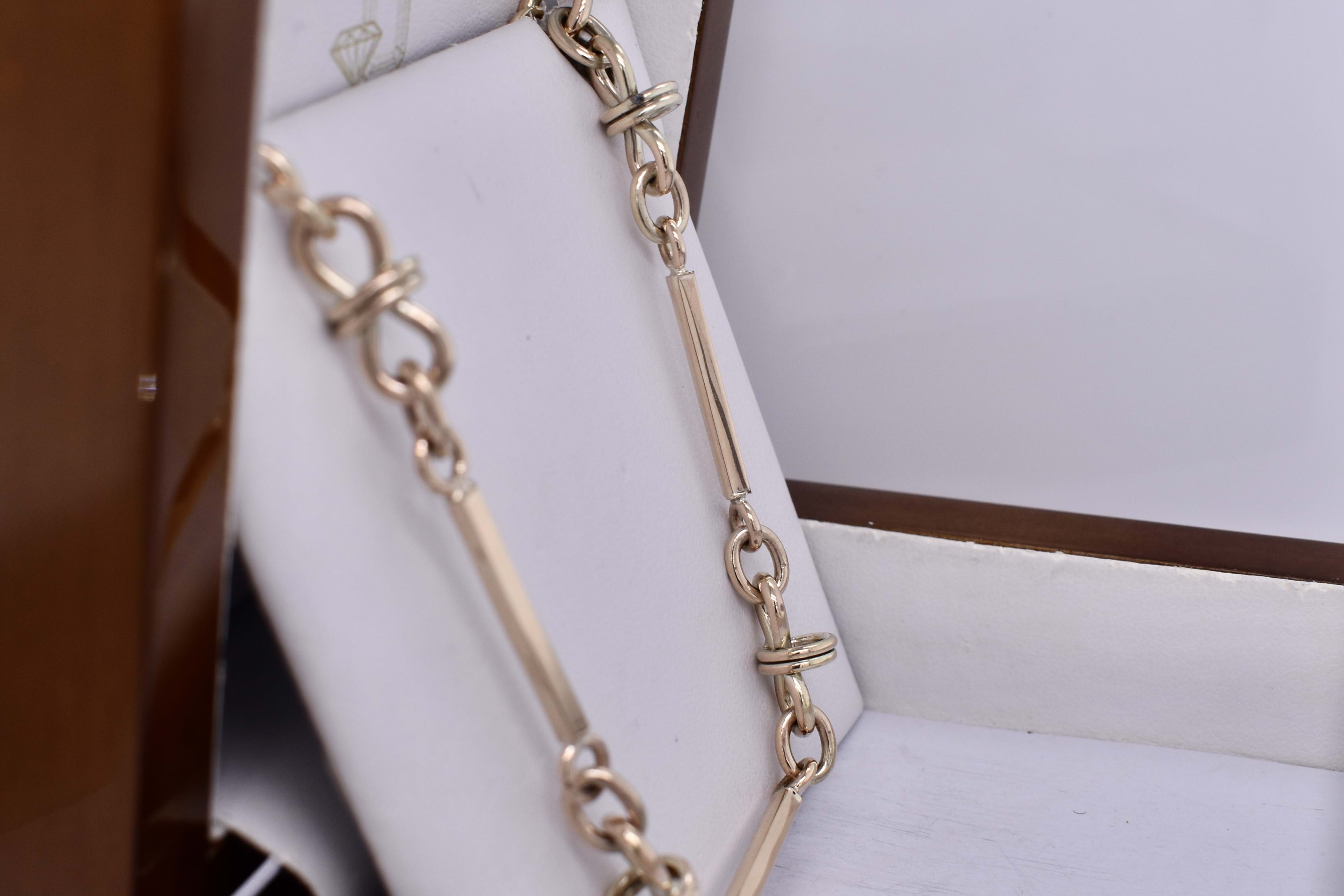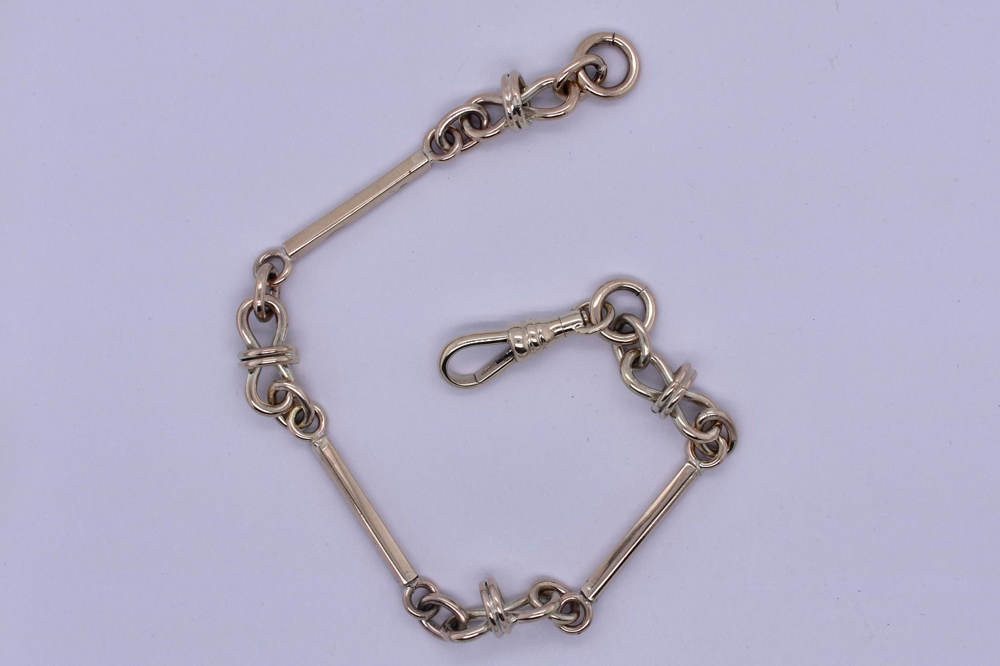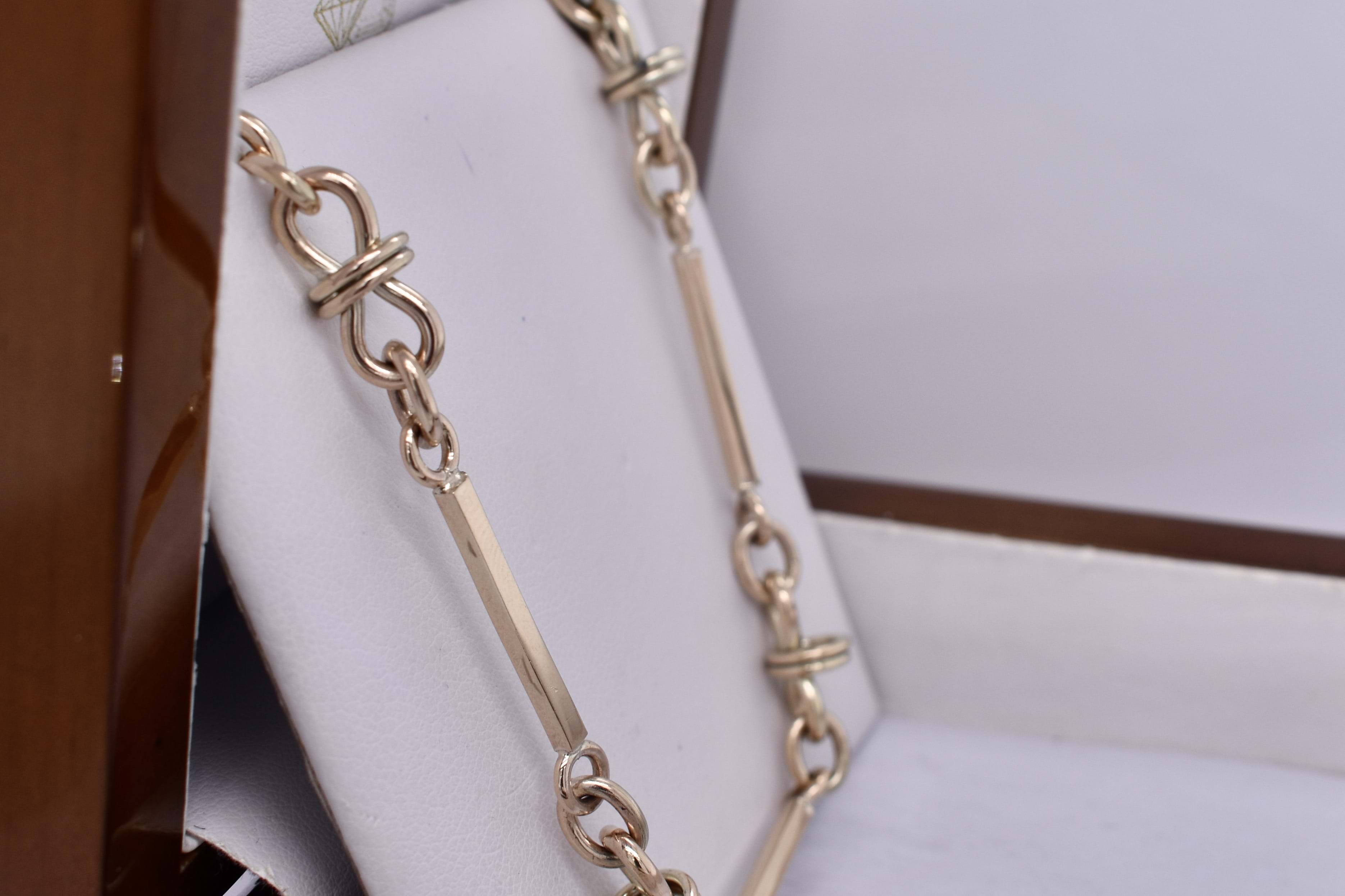 This lovely handmade bracelet is crafted by our goldsmith in 9ct yellow gold, in a chatelaine style link, measuring 20cm long. Finished with a swivel clasp, can be worn alone or attached as an extension to the chatelain chain: 20380045. 14.57 grams.