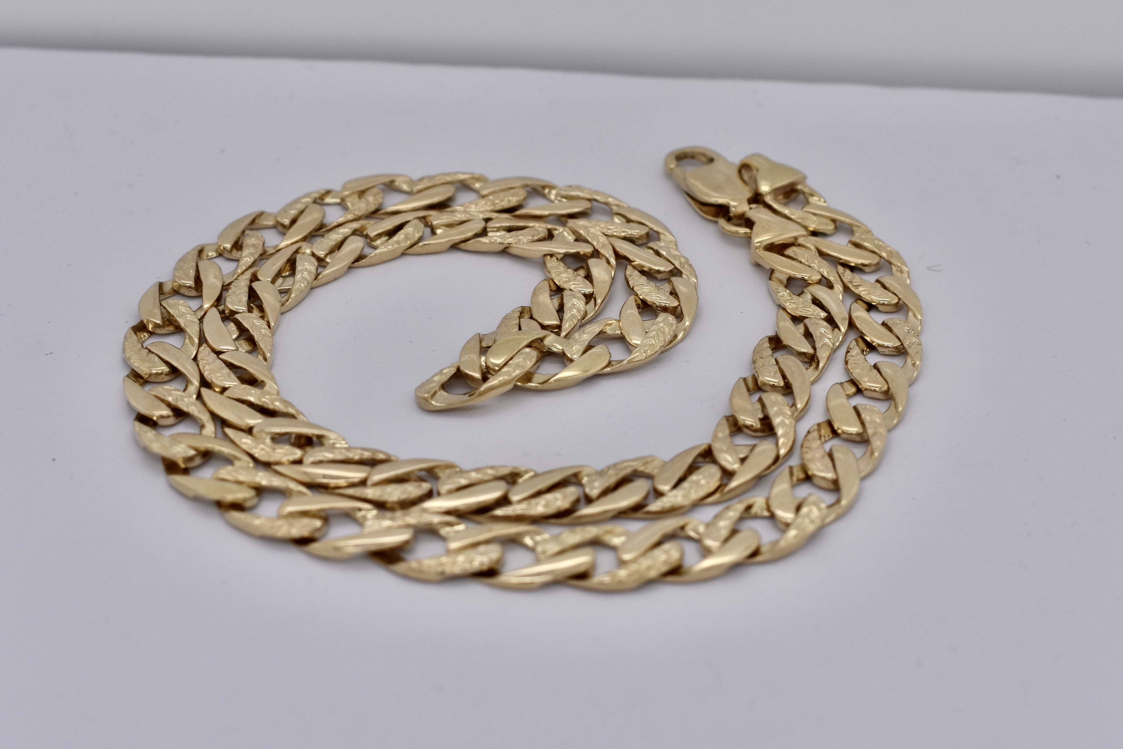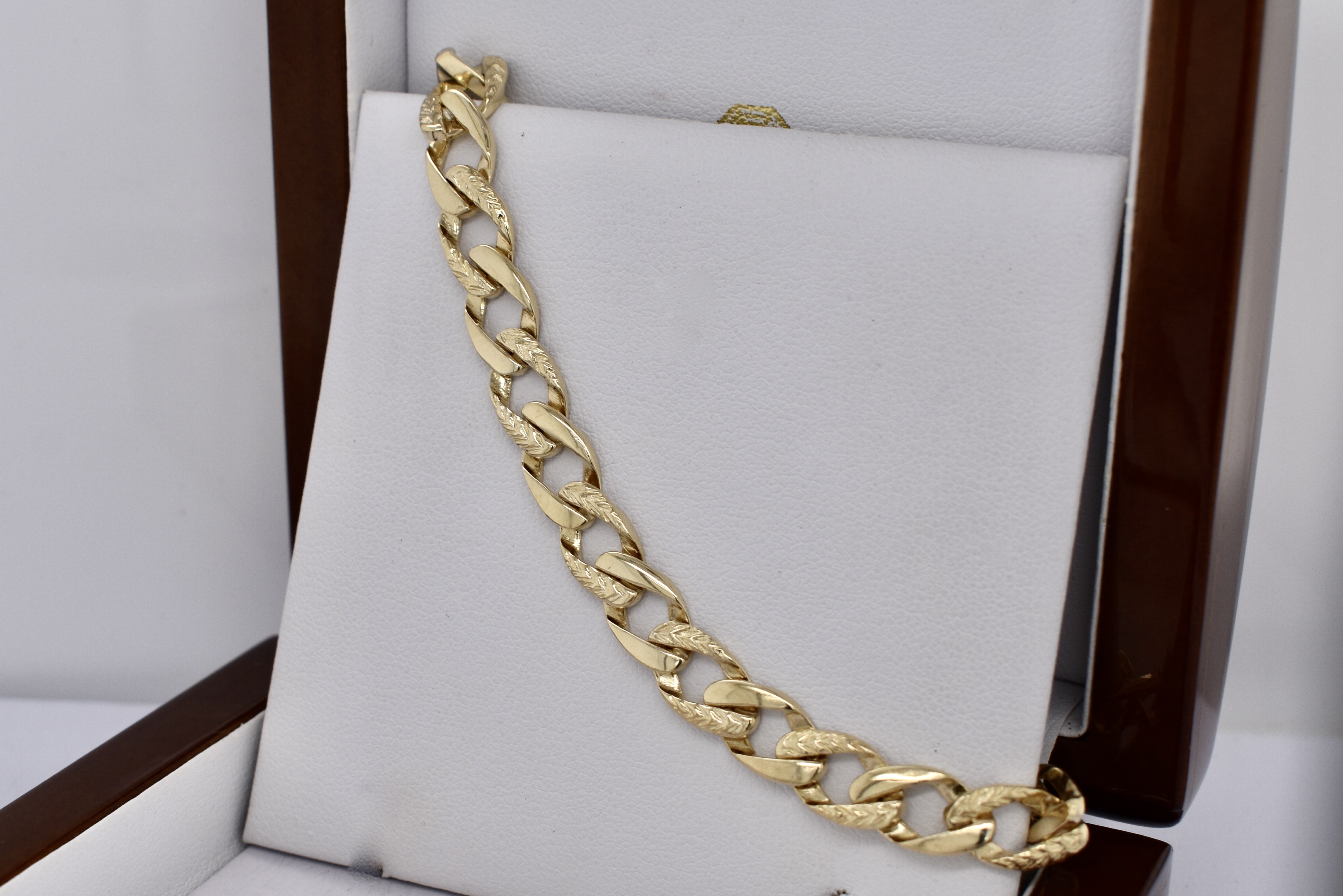 A classic flat curb link bracelet with a point of difference in the day/night style (alternate pattern links) crafted in 9ct yellow gold and measuring 19.5cm. The bracelet is 8mm wide and weighs 11.91g.