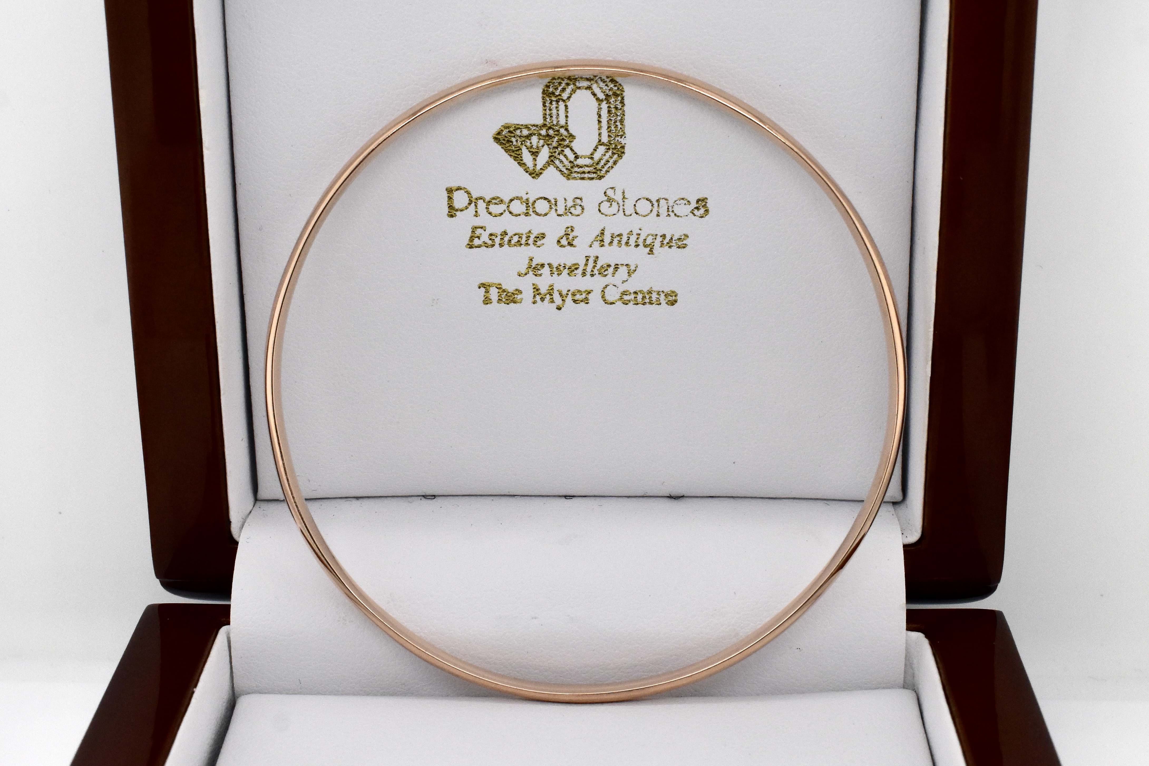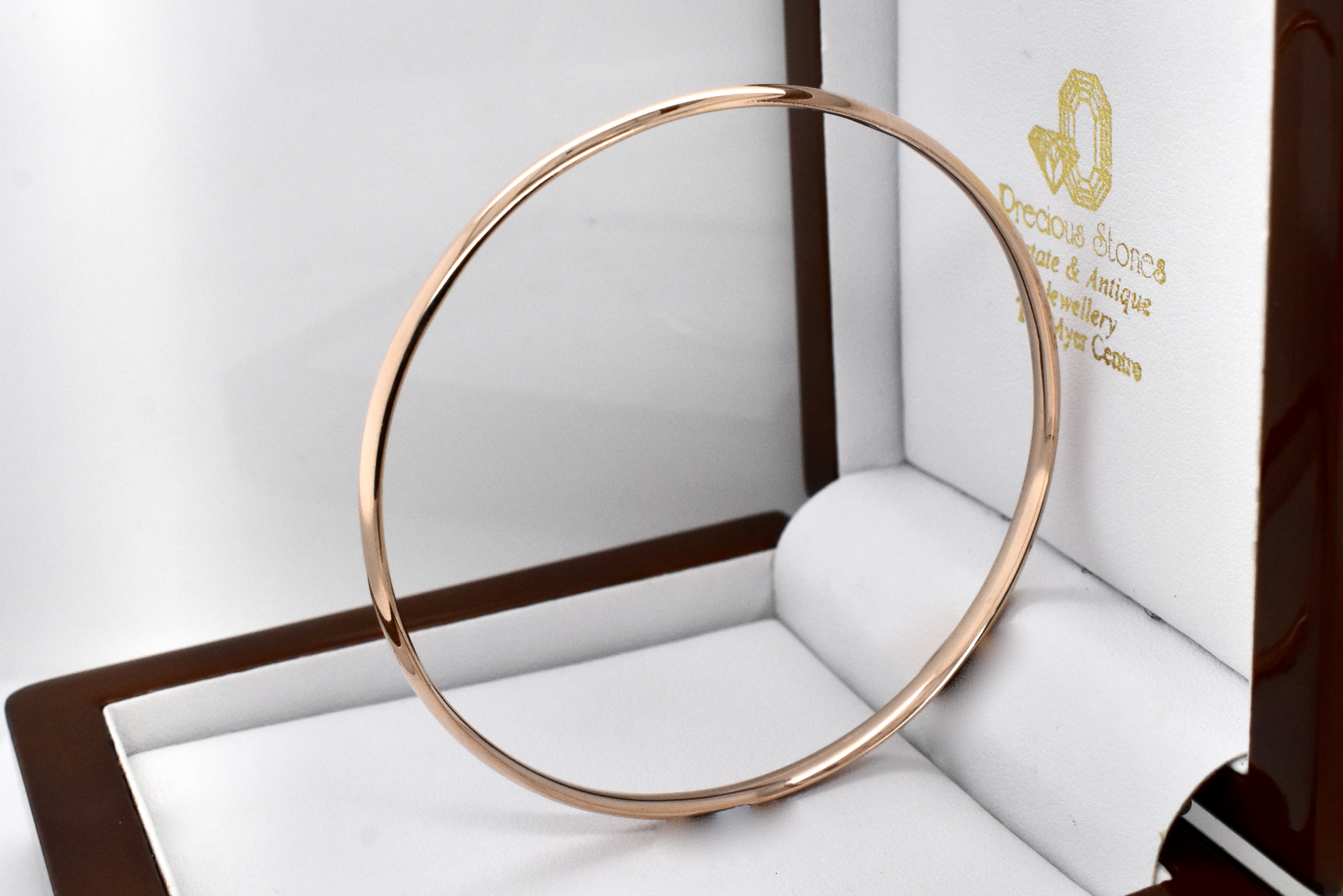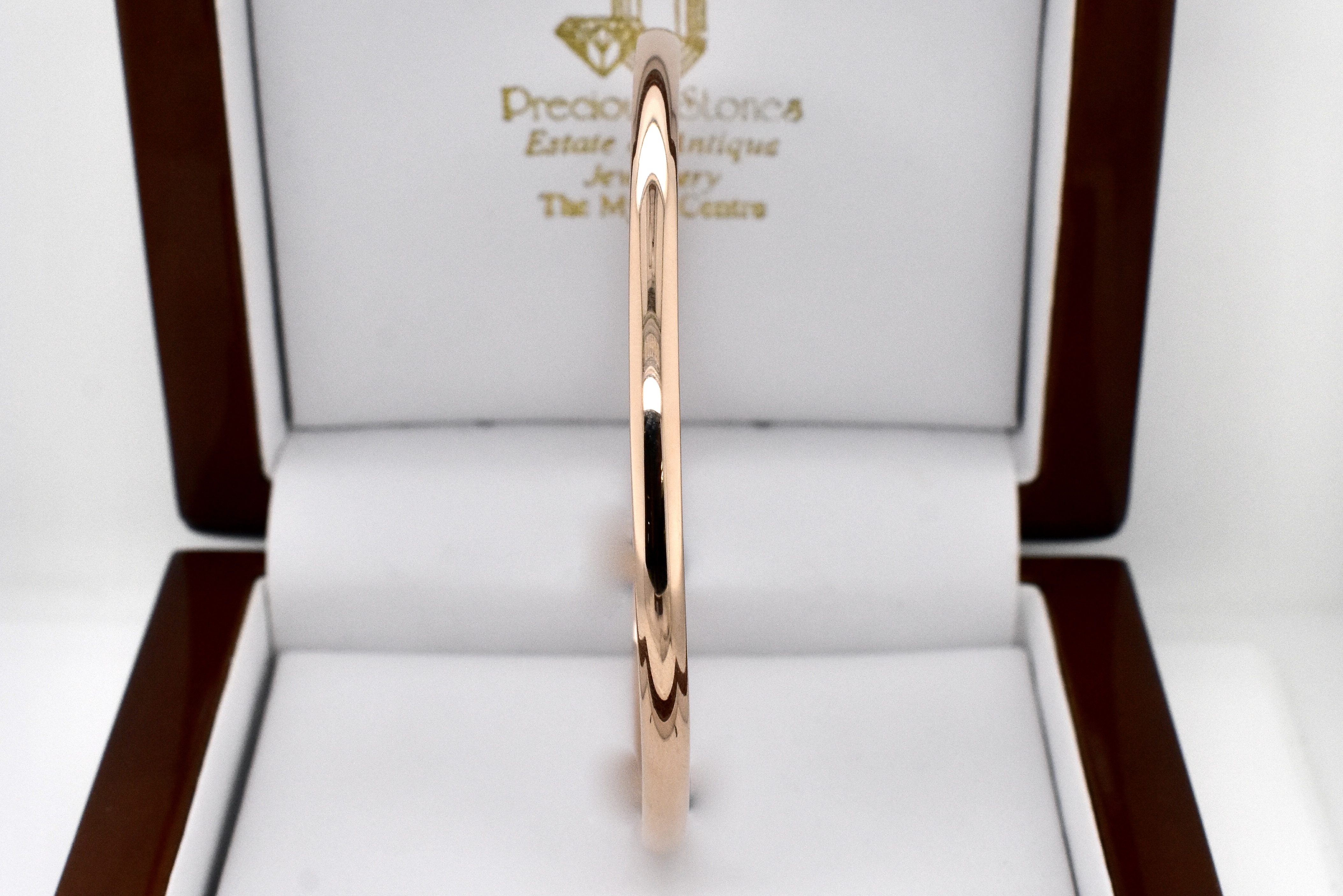 A classic and timeless jewellery collection staple, this handmade solid, round bangle has been crafted in 9ct rose gold with a high dome profile and comfort fit to the inside. Bangle is hand size 64mm and 3.5mm wide, with a depth of 1.85mm. Weighing 11.2grams.