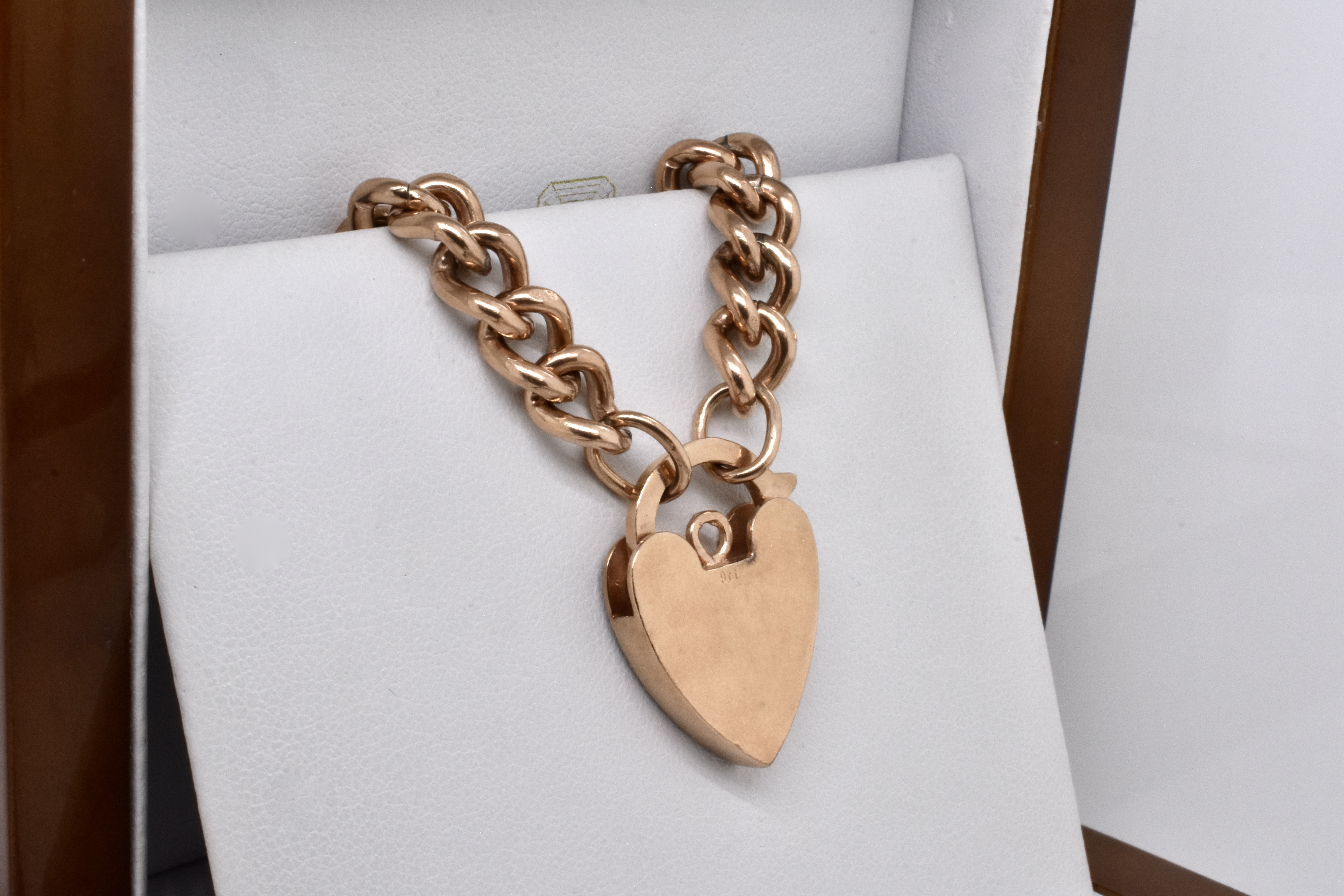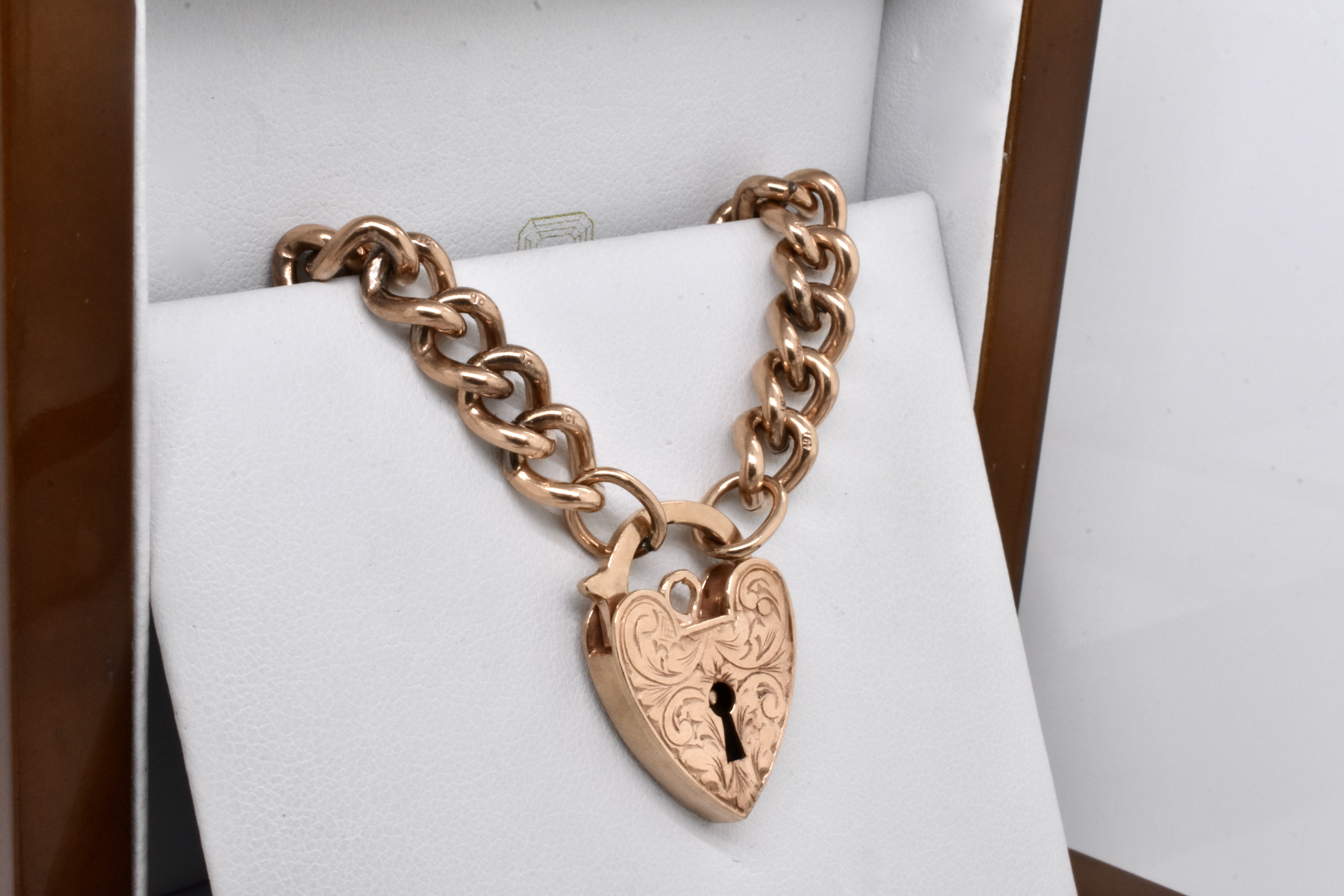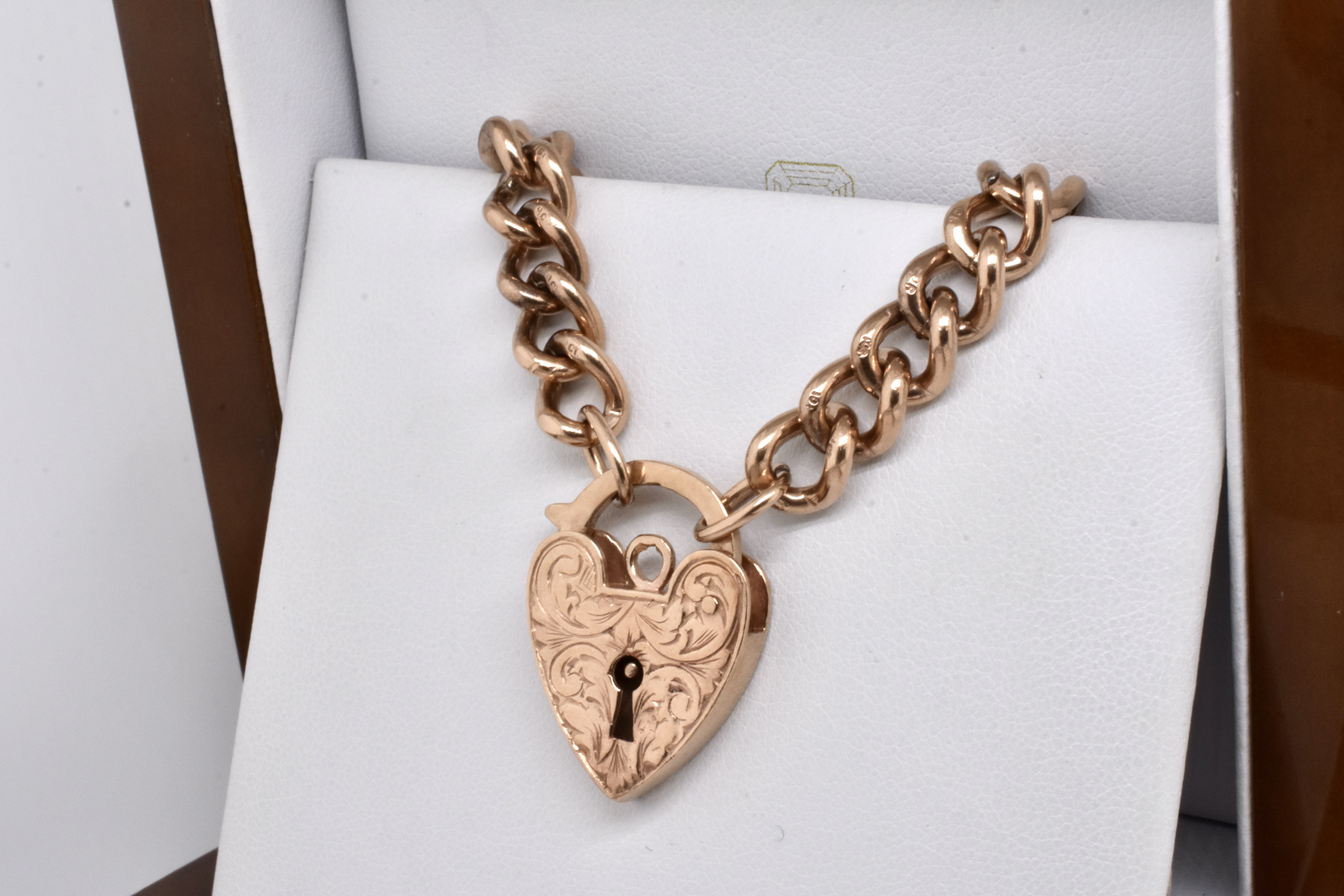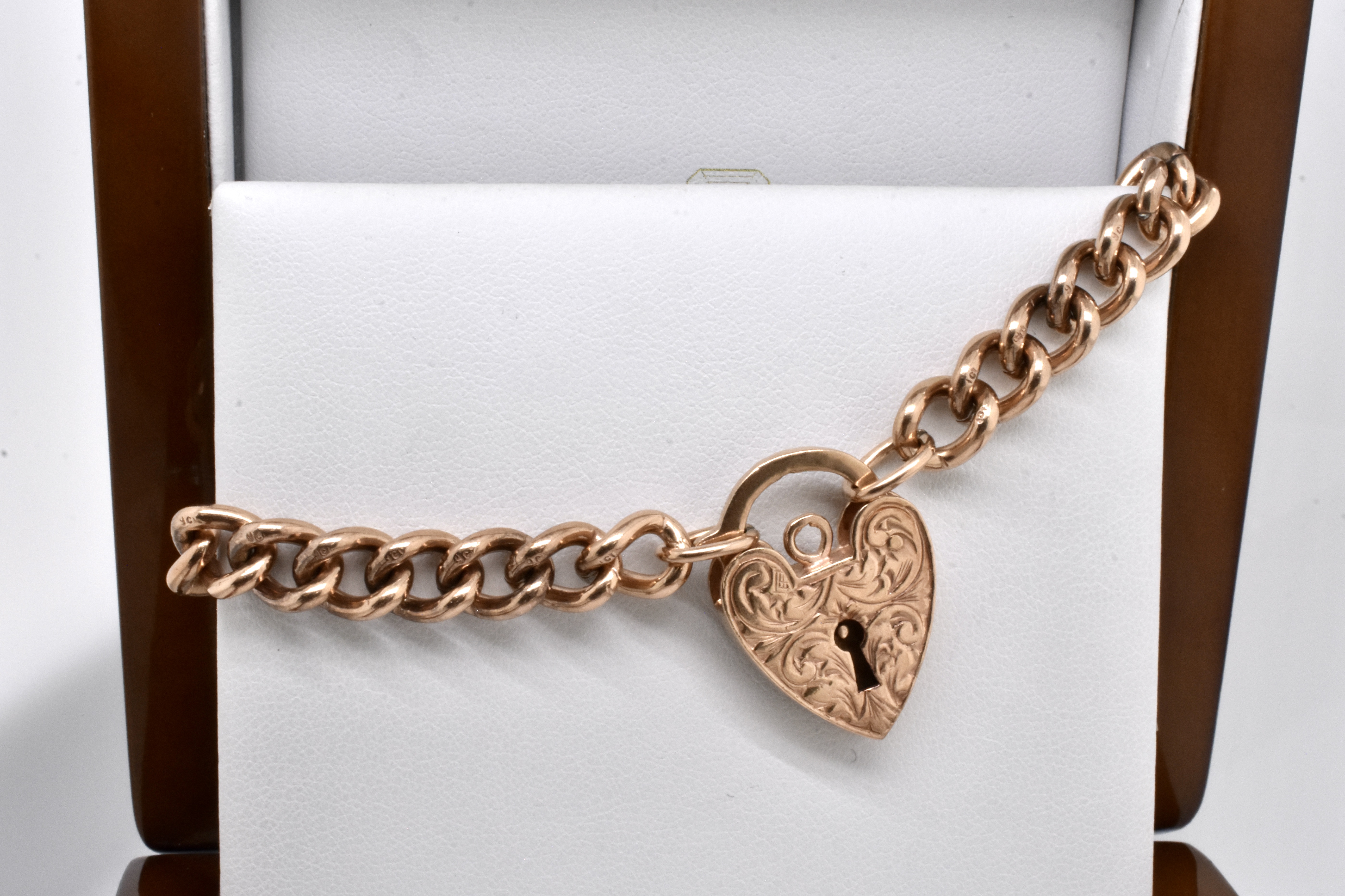 A classic and timeless piece, this 9ct rose gold bracelet features individually stamped curb links, with an ornamentally engraved heart padlock. Bracelet weighs 29.41 grams and is 19cm long